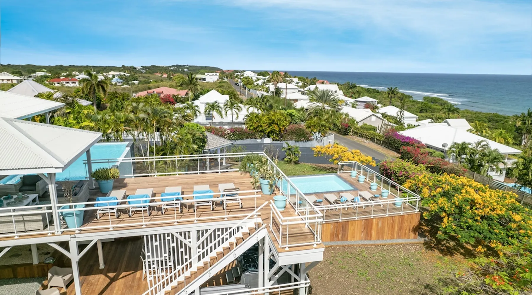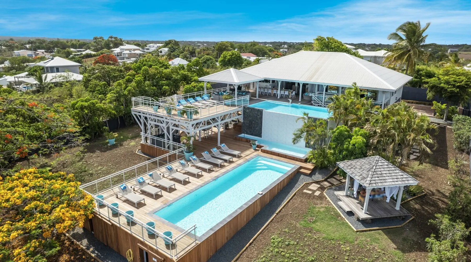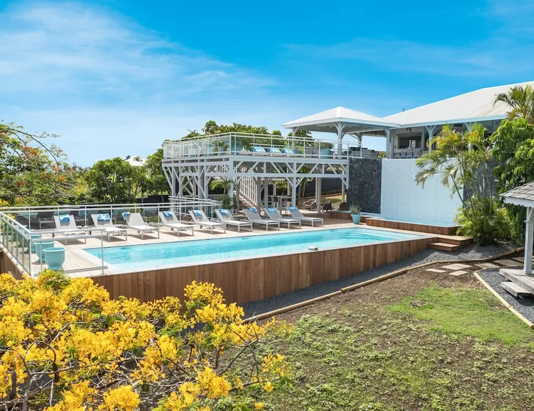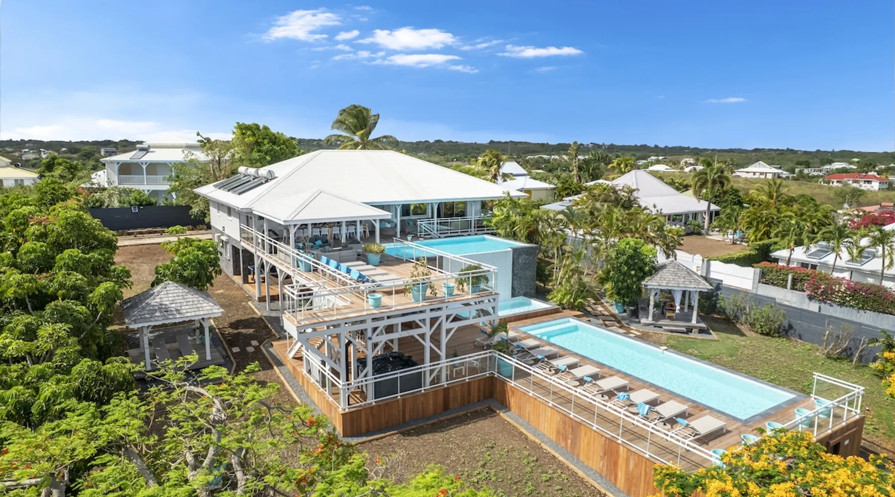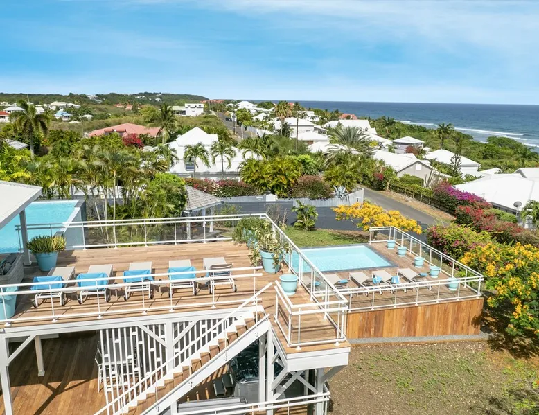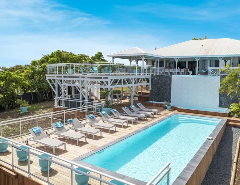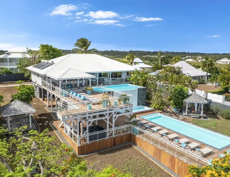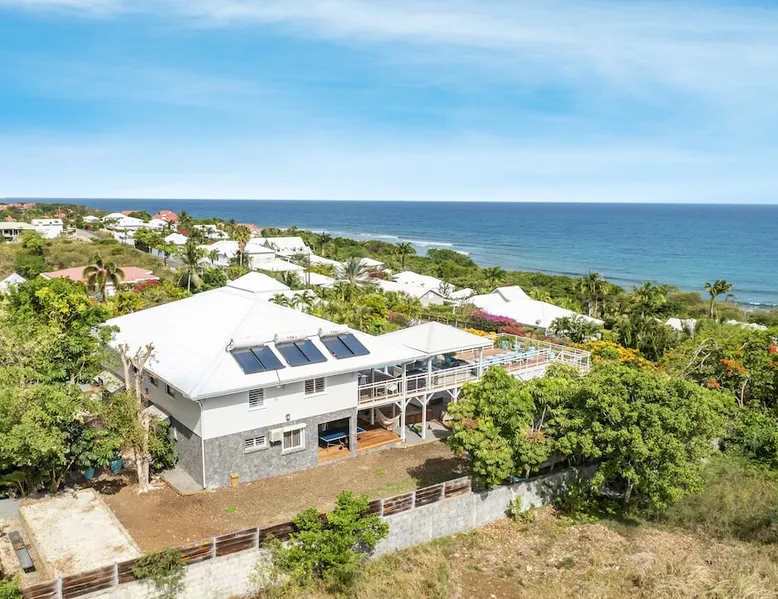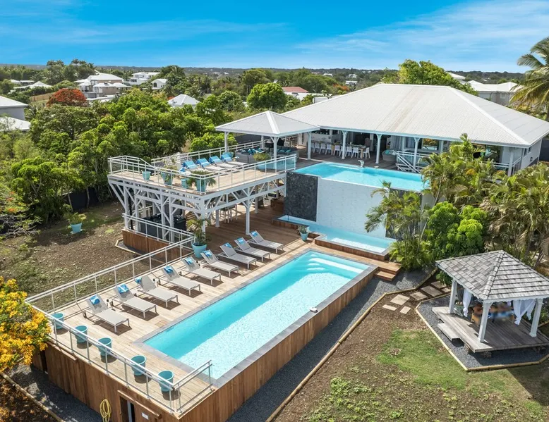 La villa compte 6 suites avec salle-de-bain ainsi qu’un dortoir enfants/adolescents avec 4 lits superposés pouvant accueillir 8 personnes. Ces lits superposés en 190x90 peuvent également accueillir des adultes. Au total l villa dispose de 20 COUCHAGES. Chaque suite peut également accueillir des lits bébé. Les terrasses ombragées mesures 300 m². La villa possède 3 piscines , un jacuzzi, panier de basket et terrain de petanque Parking 6 places MAIS SURTOUT UNE VUE MER A 180° La villa possède 3 piscines: une au 1er niveau(5mX9m), un bassin de débordement avec en contre-bas servant de piscines pour les petits et enfin une 3ème piscine au Rdc (4mx12m). La villa mesure 300m2 mais surtout comme nous sommes en Guadeloupe nous vivons a l'extérieur toute l année donc 300m2 également de terrasses ombragées et ventilées Une conciergerie gère le bien sur place. La remise des clefs ainsi qu'un tour complet de la maison sont effectués à l'arrivée des voyageurs. Une conciergerie sur place gère le logement. Vue sur mer et située à 500m d'une plage de sable Il est conseillé de louer un véhicule lors de votre arrivée sur l'île. Nous contacter pour de plus amples renseignements. La piscine est équipée d'une alarme qui permet de détecter les chutes dans l'eau. Il n'y a pas de volet de piscine. Merci d'avance.