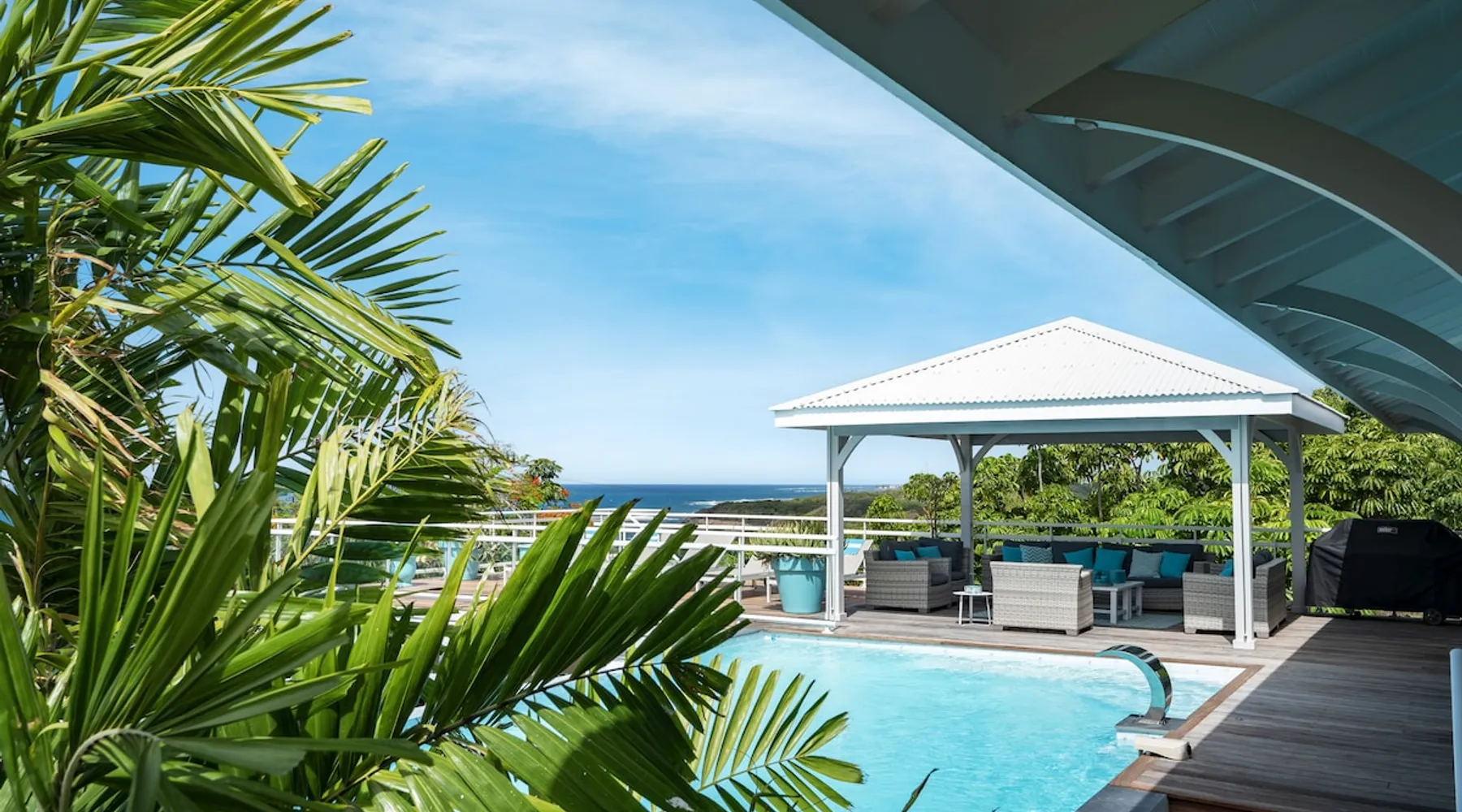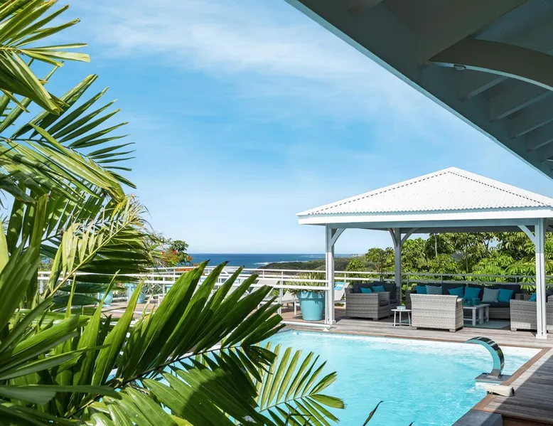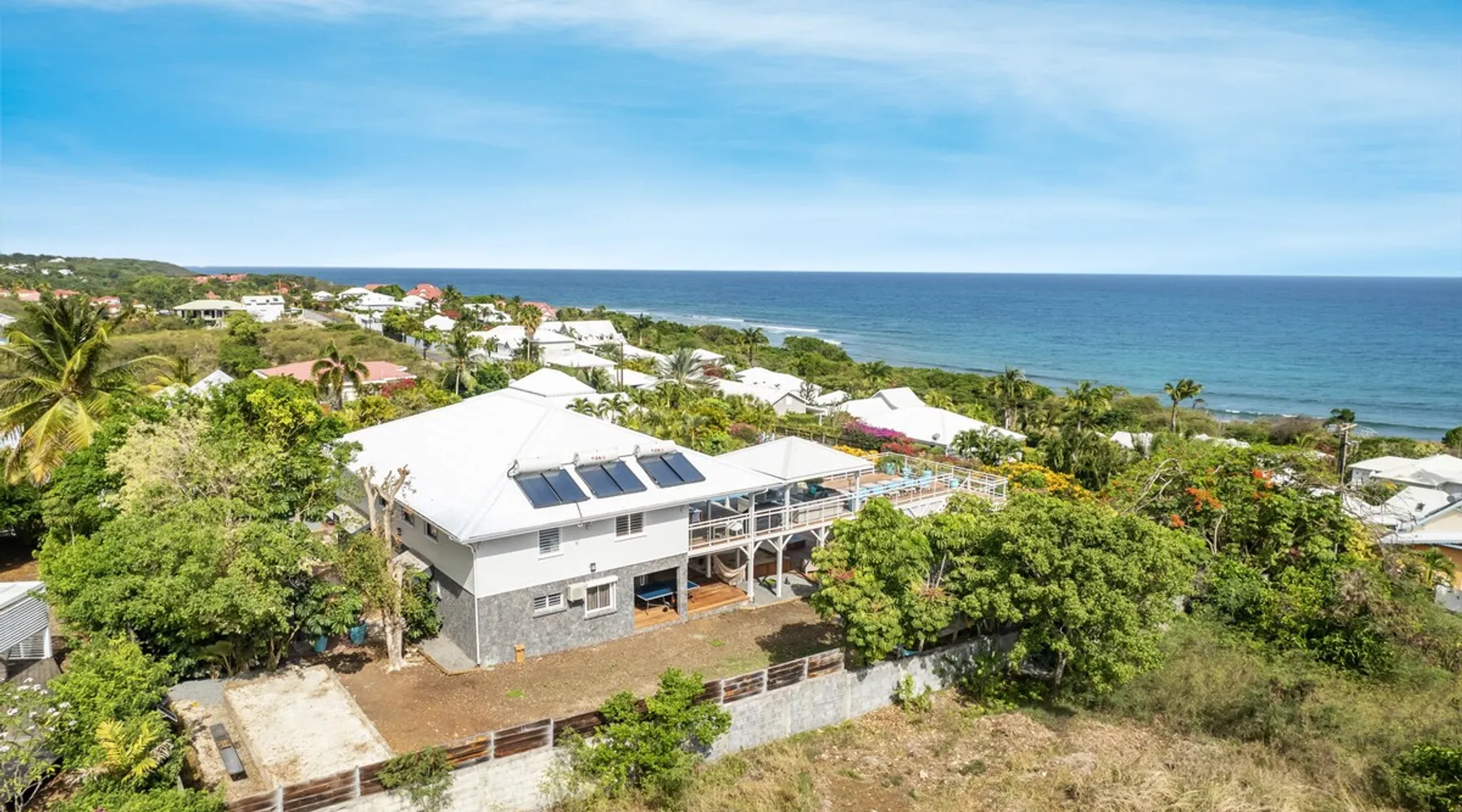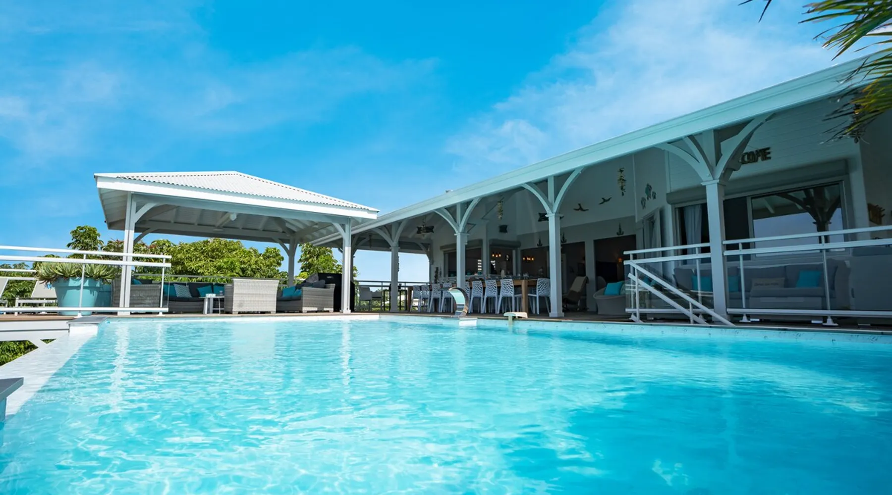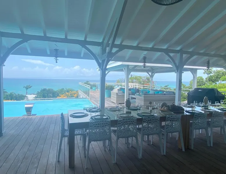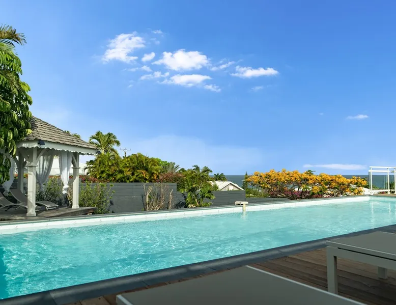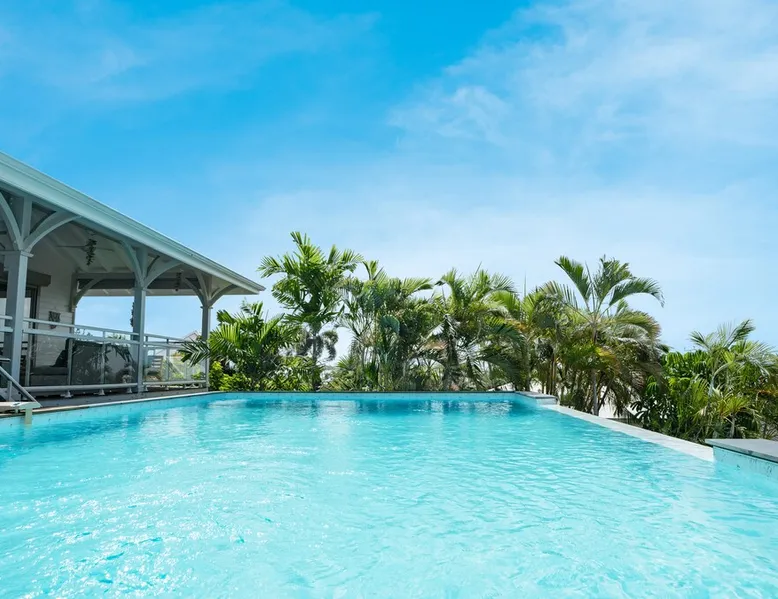 La villa compte 6 suites avec salle-de-bain ainsi qu’un dortoir enfants/adolescents avec 4 lits superposés pouvant accueillir 8 personnes. Ces lits superposés en 190x90 peuvent également accueillir des adultes. Au total l villa dispose de 20 COUCHAGES. Chaque suite peut également accueillir des lits bébé. Les terrasses ombragées mesures 300 m². La villa possède 3 piscines , un jacuzzi, panier de basket et terrain de petanque Parking 6 places MAIS SURTOUT UNE VUE MER A 180° La villa possède 3 piscines: une au 1er niveau(5mX9m), un bassin de débordement avec en contre-bas servant de piscines pour les petits et enfin une 3ème piscine au Rdc (4mx12m). La villa mesure 300m2 mais surtout comme nous sommes en Guadeloupe nous vivons a l'extérieur toute l année donc 300m2 également de terrasses ombragées et ventilées Une conciergerie gère le bien sur place. La remise des clefs ainsi qu'un tour complet de la maison sont effectués à l'arrivée des voyageurs. Une conciergerie sur place gère le logement. Vue sur mer et située à 500m d'une plage de sable Il est conseillé de louer un véhicule lors de votre arrivée sur l'île. Nous contacter pour de plus amples renseignements. La piscine est équipée d'une alarme qui permet de détecter les chutes dans l'eau. Il n'y a pas de volet de piscine. Merci d'avance.