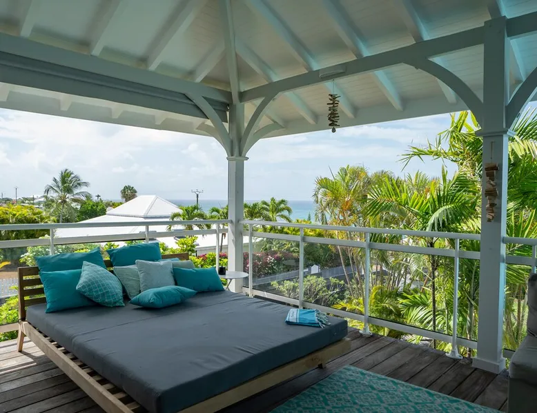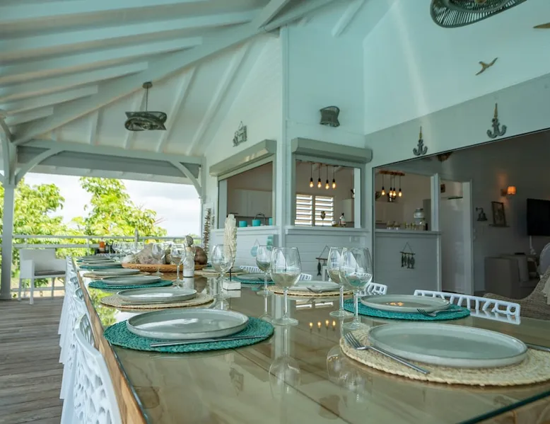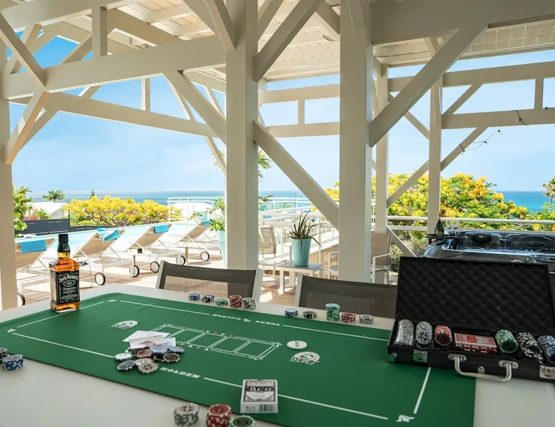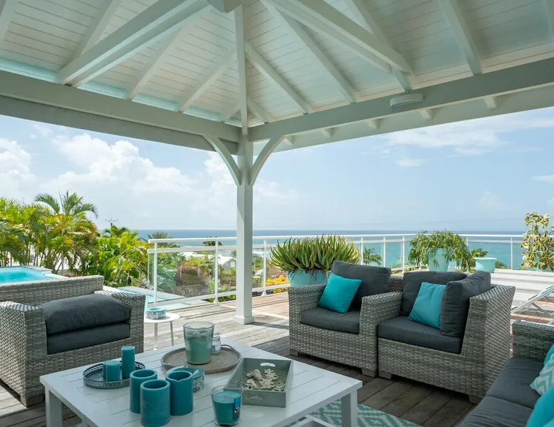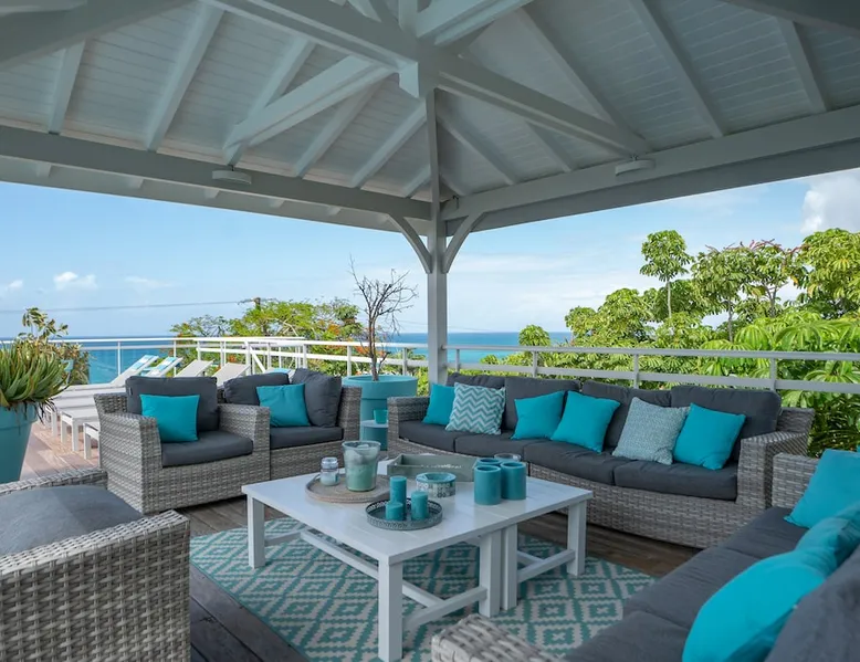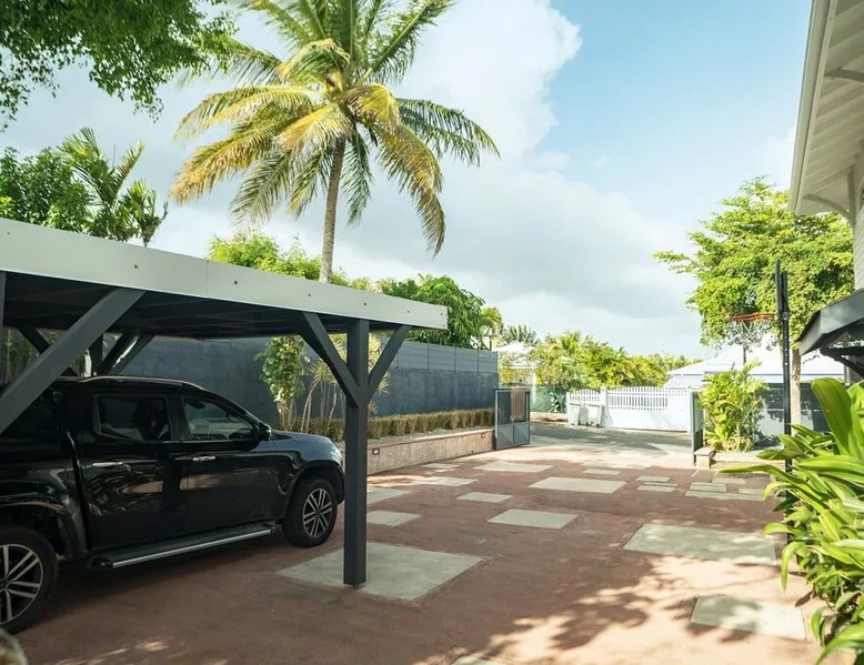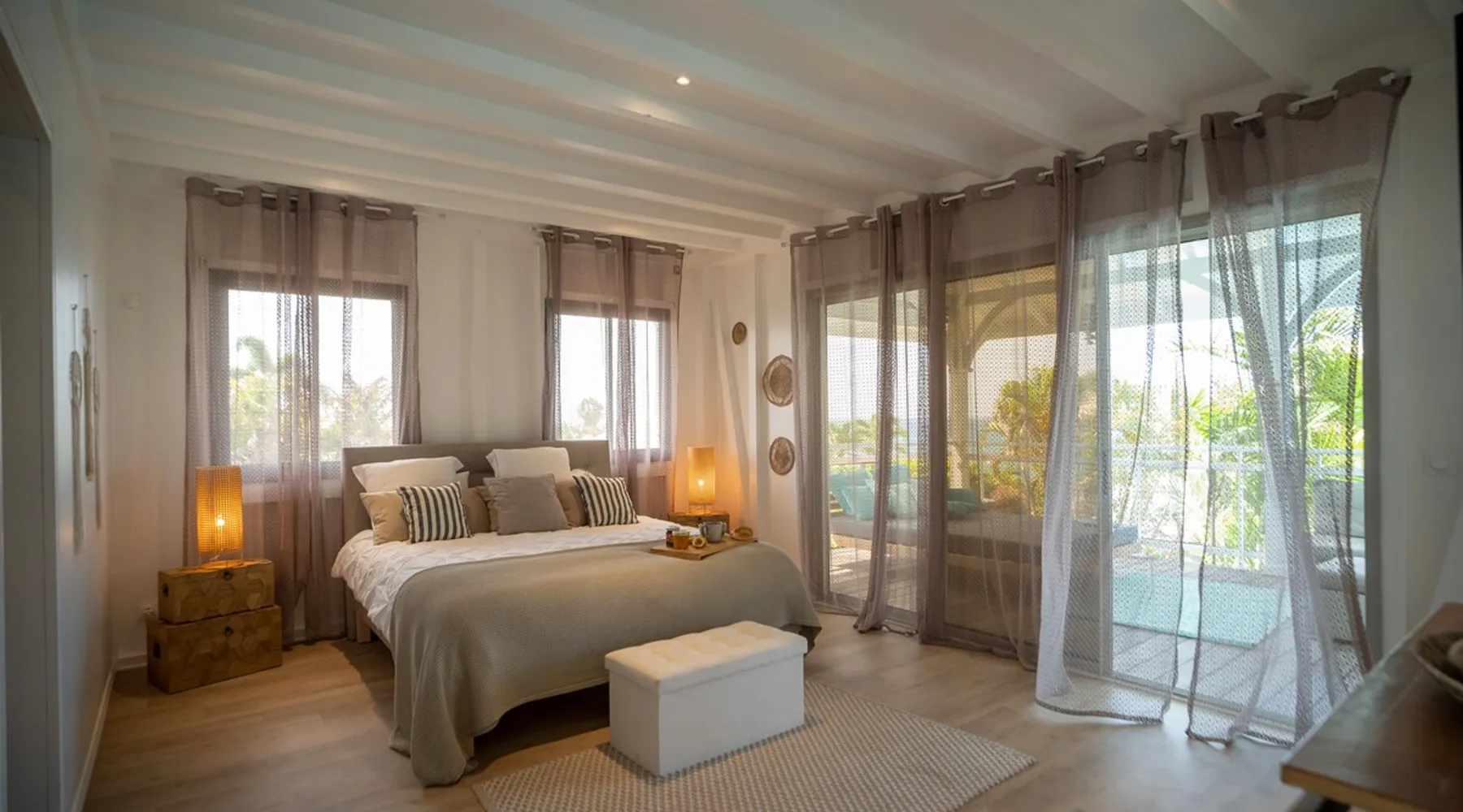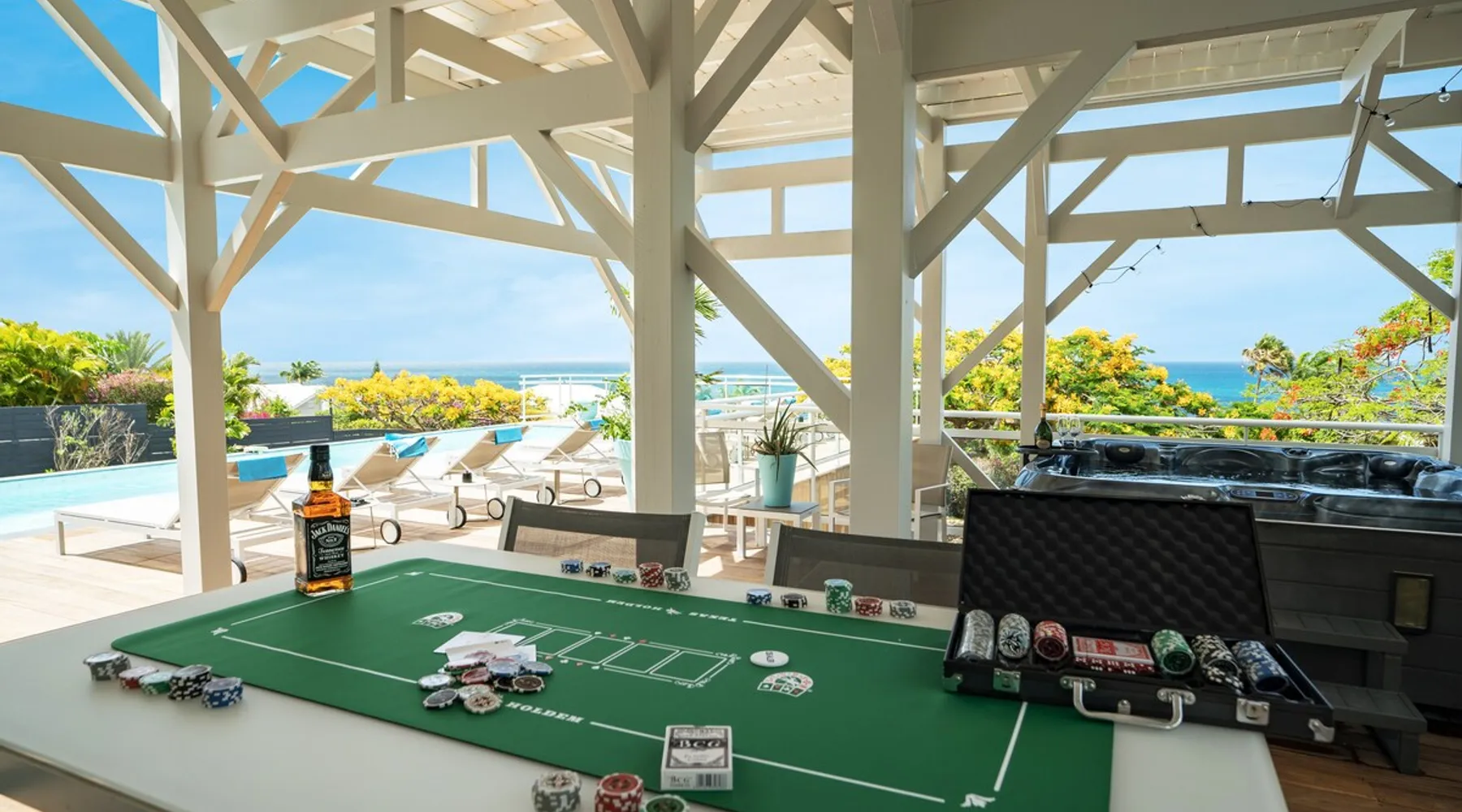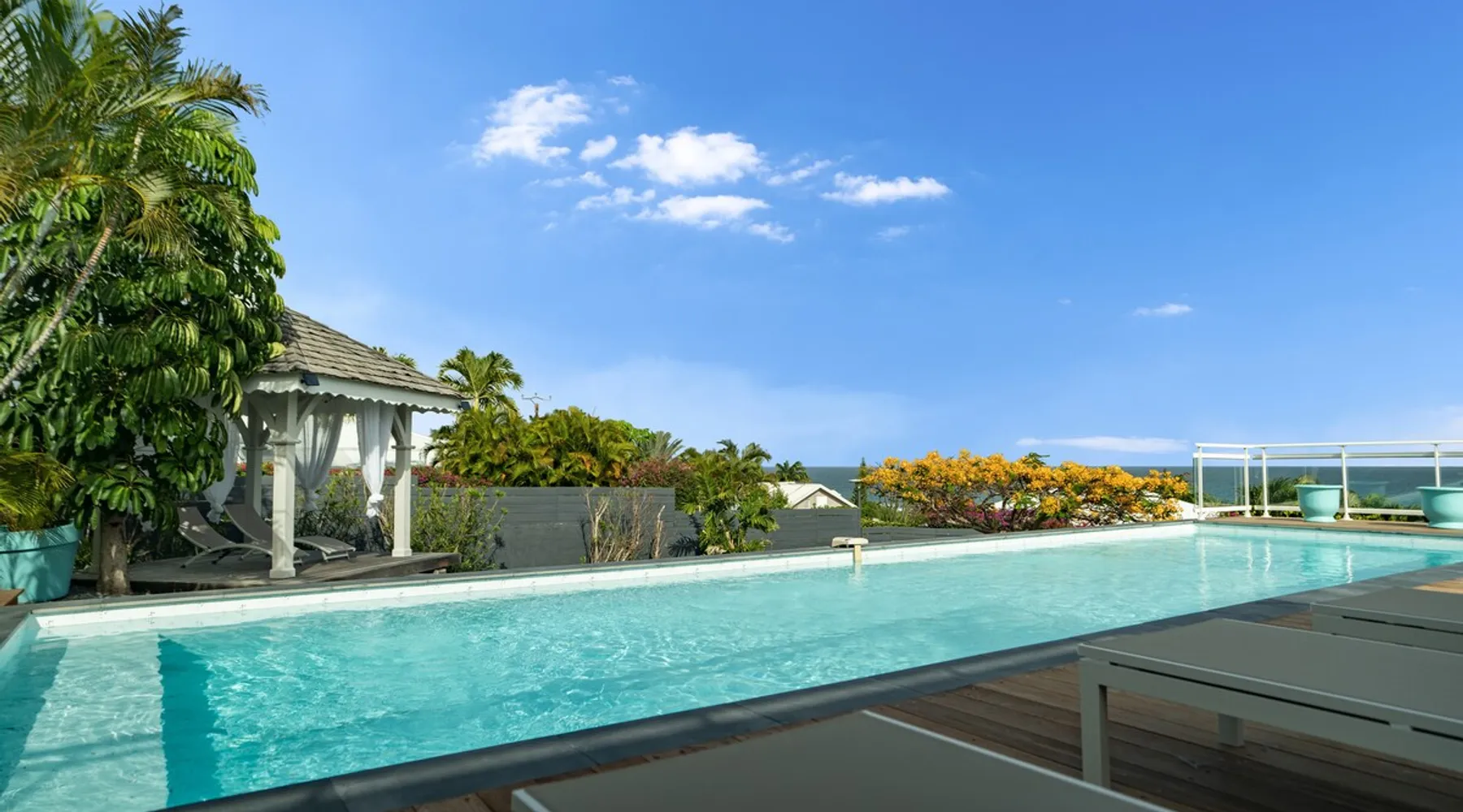 La villa compte 6 suites avec salle-de-bain ainsi qu’un dortoir enfants/adolescents avec 4 lits superposés pouvant accueillir 8 personnes. Ces lits superposés en 190x90 peuvent également accueillir des adultes. Au total l villa dispose de 20 COUCHAGES. Chaque suite peut également accueillir des lits bébé. Les terrasses ombragées mesures 300 m². La villa possède 3 piscines , un jacuzzi, panier de basket et terrain de petanque Parking 6 places MAIS SURTOUT UNE VUE MER A 180° La villa possède 3 piscines: une au 1er niveau(5mX9m), un bassin de débordement avec en contre-bas servant de piscines pour les petits et enfin une 3ème piscine au Rdc (4mx12m). La villa mesure 300m2 mais surtout comme nous sommes en Guadeloupe nous vivons a l'extérieur toute l année donc 300m2 également de terrasses ombragées et ventilées Une conciergerie gère le bien sur place. La remise des clefs ainsi qu'un tour complet de la maison sont effectués à l'arrivée des voyageurs. Une conciergerie sur place gère le logement. Vue sur mer et située à 500m d'une plage de sable Il est conseillé de louer un véhicule lors de votre arrivée sur l'île. Nous contacter pour de plus amples renseignements. La piscine est équipée d'une alarme qui permet de détecter les chutes dans l'eau. Il n'y a pas de volet de piscine. Merci d'avance.