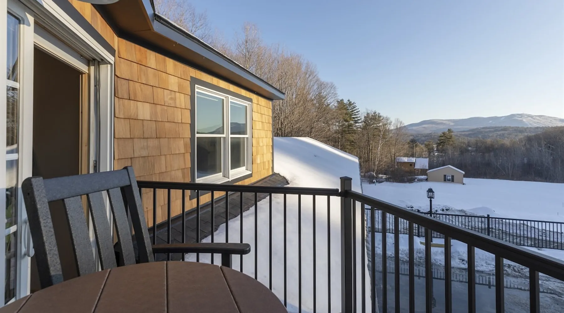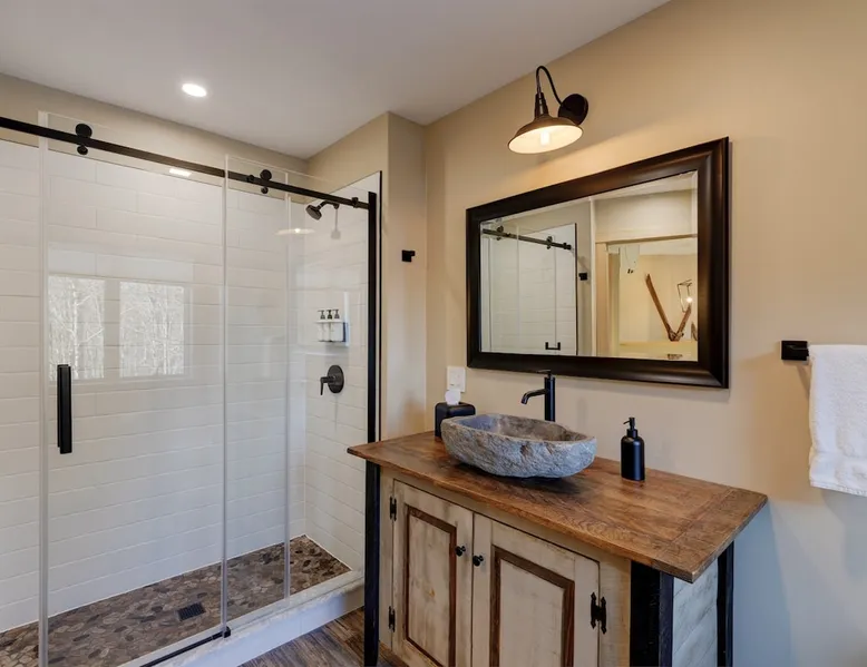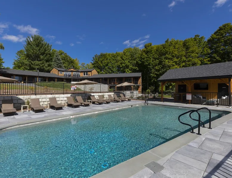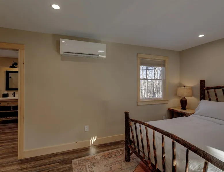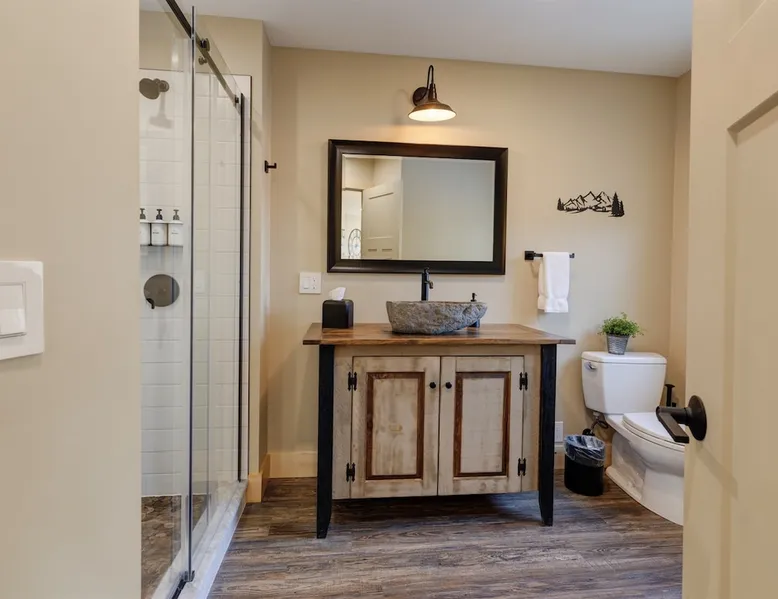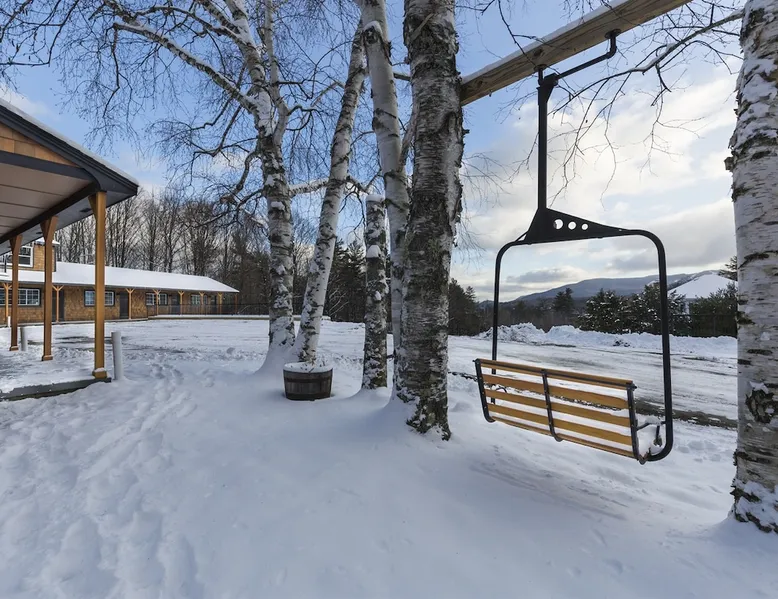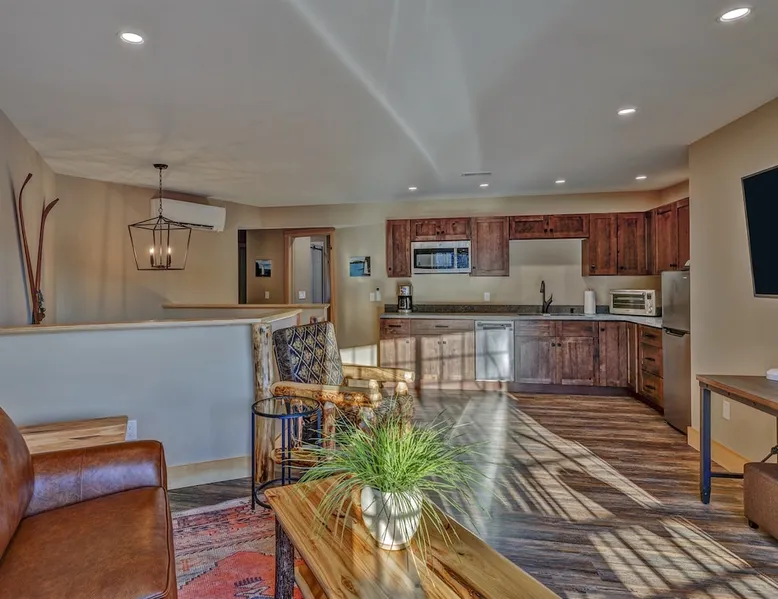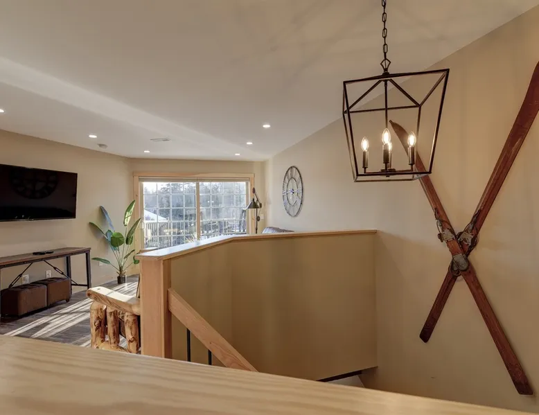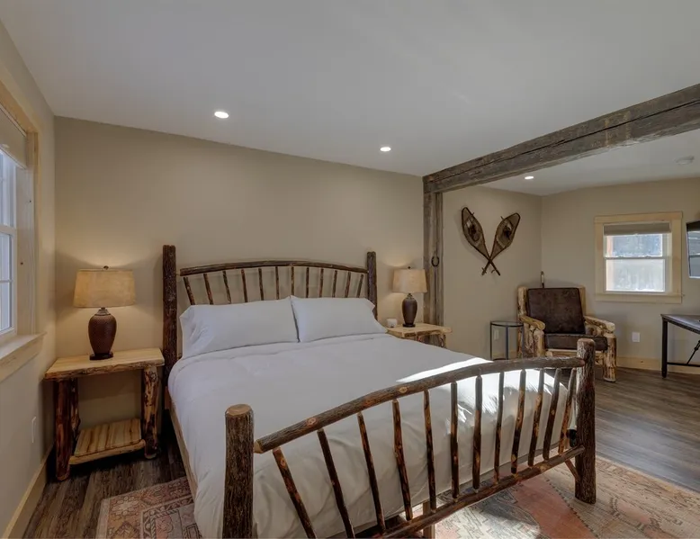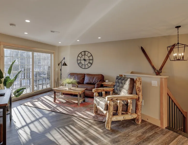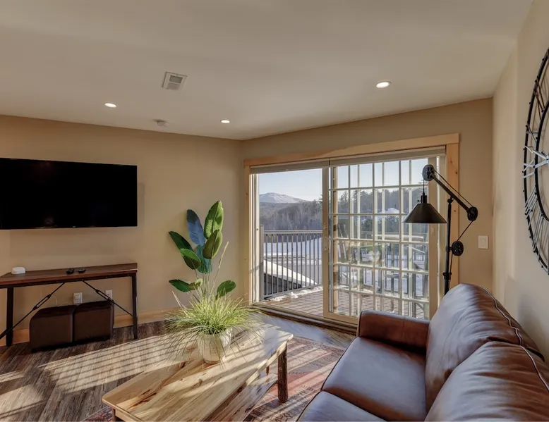 One of eleven suites at The Lodge by Sunapee Stays, located in the picturesque town of Sunapee, with stunning views of Mount Sunapee just outside your door. As the largest suite available, this spacious 1-bedroom, 2-bath unit features both front and back decks, a washer and dryer, and an outdoor table and grill for your convenience. Just minutes from Sunapee Harbor and less than a 10-minute drive to the renowned Mount Sunapee, it’s the perfect retreat for relaxation and adventure! The space This modern rustic two level suite features one bedroom, 2 bathrooms and a sofa bed. The hickory log furniture, shiplap vaulted ceilings and plush Adirondack style furnishings evoke relaxation after your day of adventures. The bathrooms boasts a sanctuary of their own with pebble stone shower surrounded by subway tiles and your very own bidet toilet! On the first floor, this suite offers one bedroom with king bed, smart TV and ensuite bathroom with washer and dryer. On the second floor you'll find a living area with memory foam sofa bed and smart TV, second full bathroom and kitchenette with all the amenities to eat in. Outside you'll find a private back deck with dining table and grill and a semi-private front deck with views of Mount Sunapee. Guests can enjoy the two-floor game room, featuring a comfortable lounge area with classic and contemporary family games and a TV. The outdoor heated pool is open seasonally from Memorial Day through Columbus Day and is complemented by a community fire pit, grill, and cabana with a TV and outdoor seating, perfect for relaxing or gathering with family and friends after a day of adventure! In Room Amenities: King Bed Full Size Sleeper Sofa Kitchenette Microwave Refrigerator Flat Screen Smart TV (2) Complimentary High Speed Internet Cuisinart Double Induction Electric Cooktop Coffee Pot with Coffee Toaster Oven Plates, Glasses, Silverware, Cookware Hair Dryer Premium Bath amenities Private heating/air conditioning unit Washer/Dryer in unit Access to iron/iron board Guest access This is a 1 bed/2 bath suite and one of eleven suites at The Lodge by Sunapee Stays, each featuring a private entrance and keyless self check-in for your convenience. Your personalized check-in code will be provided seven days prior to your arrival.