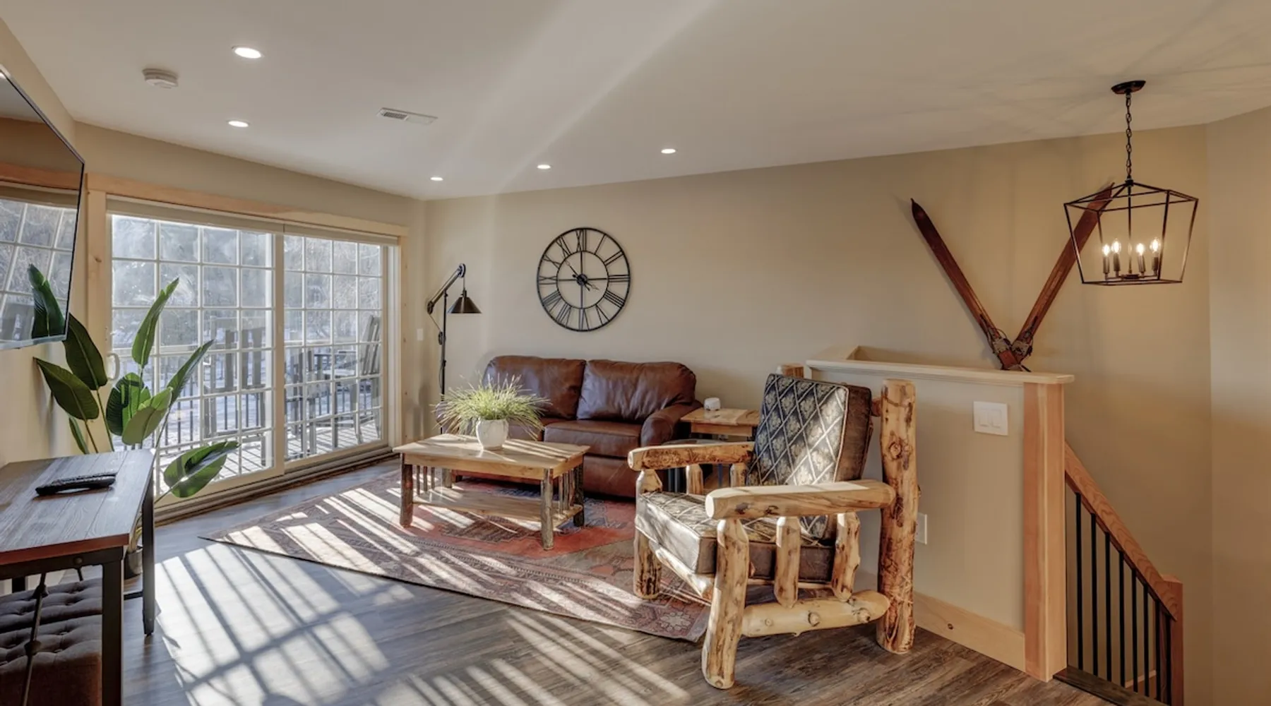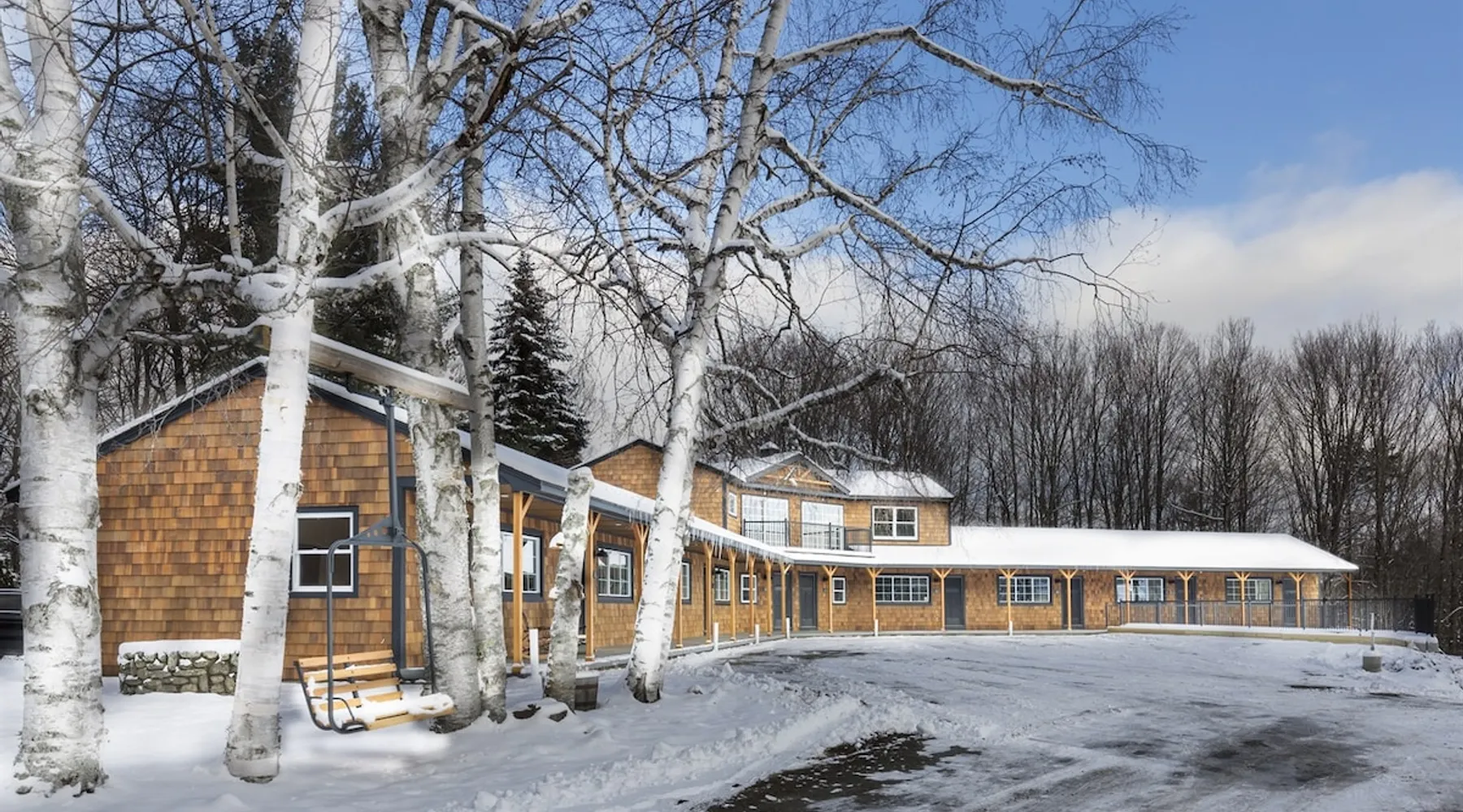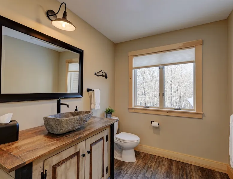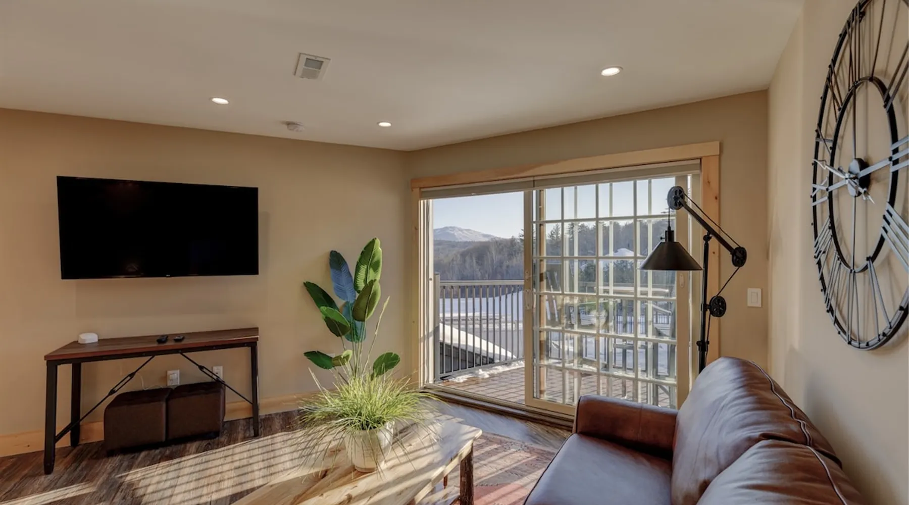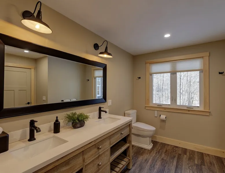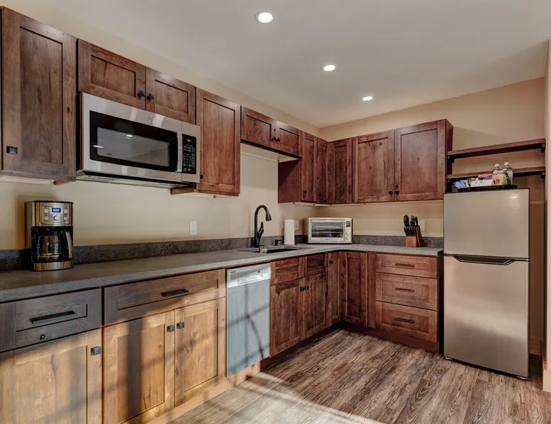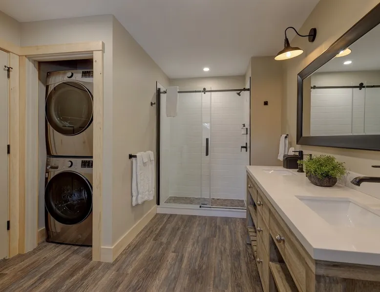 One of eleven suites at The Lodge by Sunapee Stays, located in the picturesque town of Sunapee, with stunning views of Mount Sunapee just outside your door. As the largest suite available, this spacious 1-bedroom, 2-bath unit features both front and back decks, a washer and dryer, and an outdoor table and grill for your convenience. Just minutes from Sunapee Harbor and less than a 10-minute drive to the renowned Mount Sunapee, it’s the perfect retreat for relaxation and adventure! The space This modern rustic two level suite features one bedroom, 2 bathrooms and a sofa bed. The hickory log furniture, shiplap vaulted ceilings and plush Adirondack style furnishings evoke relaxation after your day of adventures. The bathrooms boasts a sanctuary of their own with pebble stone shower surrounded by subway tiles and your very own bidet toilet! On the first floor, this suite offers one bedroom with king bed, smart TV and ensuite bathroom with washer and dryer. On the second floor you'll find a living area with memory foam sofa bed and smart TV, second full bathroom and kitchenette with all the amenities to eat in. Outside you'll find a private back deck with dining table and grill and a semi-private front deck with views of Mount Sunapee. Guests can enjoy the two-floor game room, featuring a comfortable lounge area with classic and contemporary family games and a TV. The outdoor heated pool is open seasonally from Memorial Day through Columbus Day and is complemented by a community fire pit, grill, and cabana with a TV and outdoor seating, perfect for relaxing or gathering with family and friends after a day of adventure! In Room Amenities: King Bed Full Size Sleeper Sofa Kitchenette Microwave Refrigerator Flat Screen Smart TV (2) Complimentary High Speed Internet Cuisinart Double Induction Electric Cooktop Coffee Pot with Coffee Toaster Oven Plates, Glasses, Silverware, Cookware Hair Dryer Premium Bath amenities Private heating/air conditioning unit Washer/Dryer in unit Access to iron/iron board Guest access This is a 1 bed/2 bath suite and one of eleven suites at The Lodge by Sunapee Stays, each featuring a private entrance and keyless self check-in for your convenience. Your personalized check-in code will be provided seven days prior to your arrival.