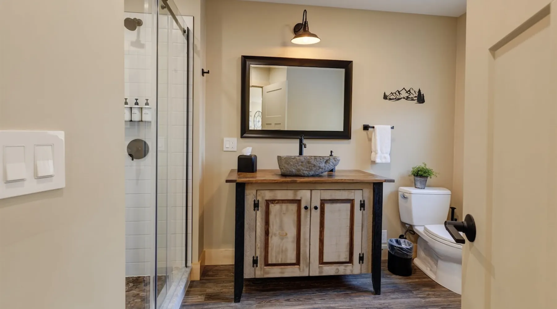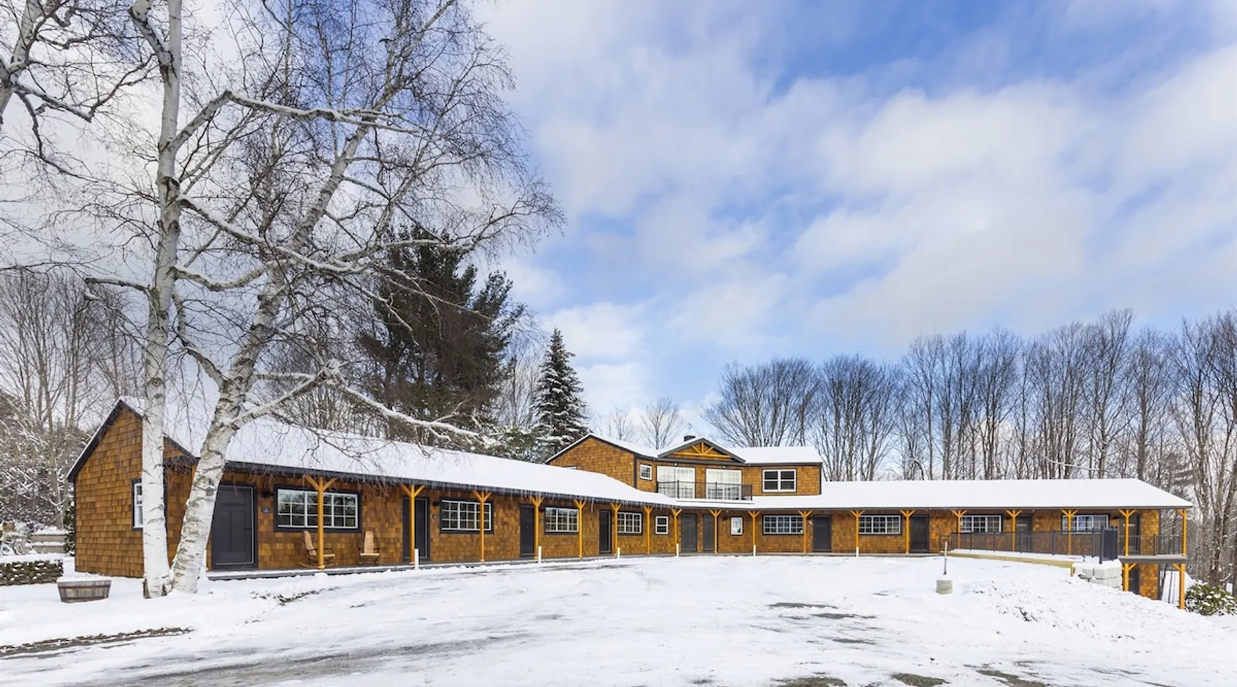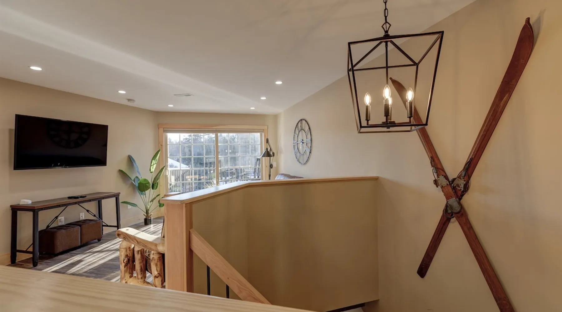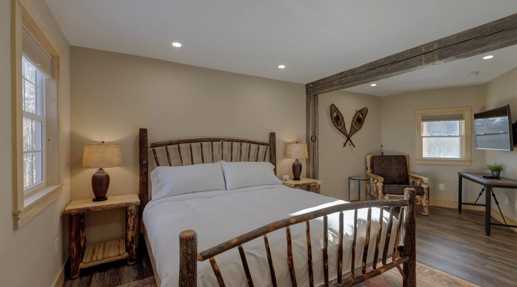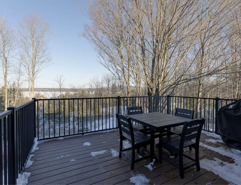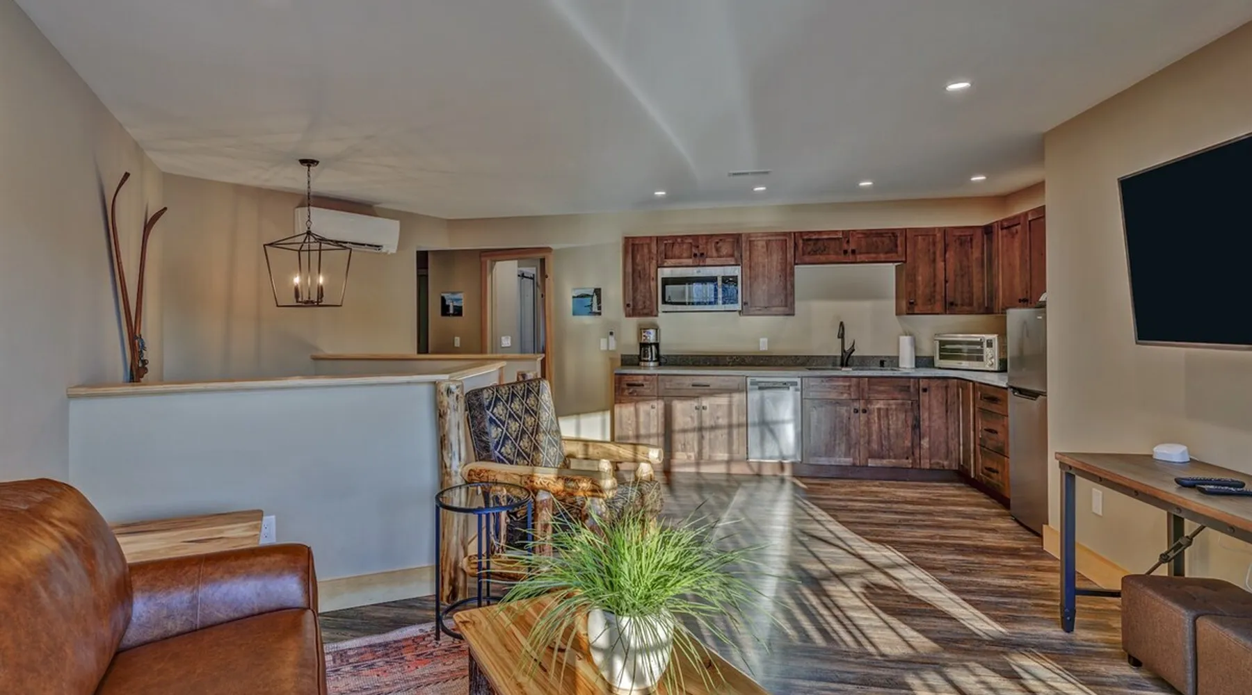 One of eleven suites at The Lodge by Sunapee Stays, located in the picturesque town of Sunapee, with stunning views of Mount Sunapee just outside your door. As the largest suite available, this spacious 1-bedroom, 2-bath unit features both front and back decks, a washer and dryer, and an outdoor table and grill for your convenience. Just minutes from Sunapee Harbor and less than a 10-minute drive to the renowned Mount Sunapee, it’s the perfect retreat for relaxation and adventure! The space This modern rustic two level suite features one bedroom, 2 bathrooms and a sofa bed. The hickory log furniture, shiplap vaulted ceilings and plush Adirondack style furnishings evoke relaxation after your day of adventures. The bathrooms boasts a sanctuary of their own with pebble stone shower surrounded by subway tiles and your very own bidet toilet! On the first floor, this suite offers one bedroom with king bed, smart TV and ensuite bathroom with washer and dryer. On the second floor you'll find a living area with memory foam sofa bed and smart TV, second full bathroom and kitchenette with all the amenities to eat in. Outside you'll find a private back deck with dining table and grill and a semi-private front deck with views of Mount Sunapee. Guests can enjoy the two-floor game room, featuring a comfortable lounge area with classic and contemporary family games and a TV. The outdoor heated pool is open seasonally from Memorial Day through Columbus Day and is complemented by a community fire pit, grill, and cabana with a TV and outdoor seating, perfect for relaxing or gathering with family and friends after a day of adventure! In Room Amenities: King Bed Full Size Sleeper Sofa Kitchenette Microwave Refrigerator Flat Screen Smart TV (2) Complimentary High Speed Internet Cuisinart Double Induction Electric Cooktop Coffee Pot with Coffee Toaster Oven Plates, Glasses, Silverware, Cookware Hair Dryer Premium Bath amenities Private heating/air conditioning unit Washer/Dryer in unit Access to iron/iron board Guest access This is a 1 bed/2 bath suite and one of eleven suites at The Lodge by Sunapee Stays, each featuring a private entrance and keyless self check-in for your convenience. Your personalized check-in code will be provided seven days prior to your arrival.