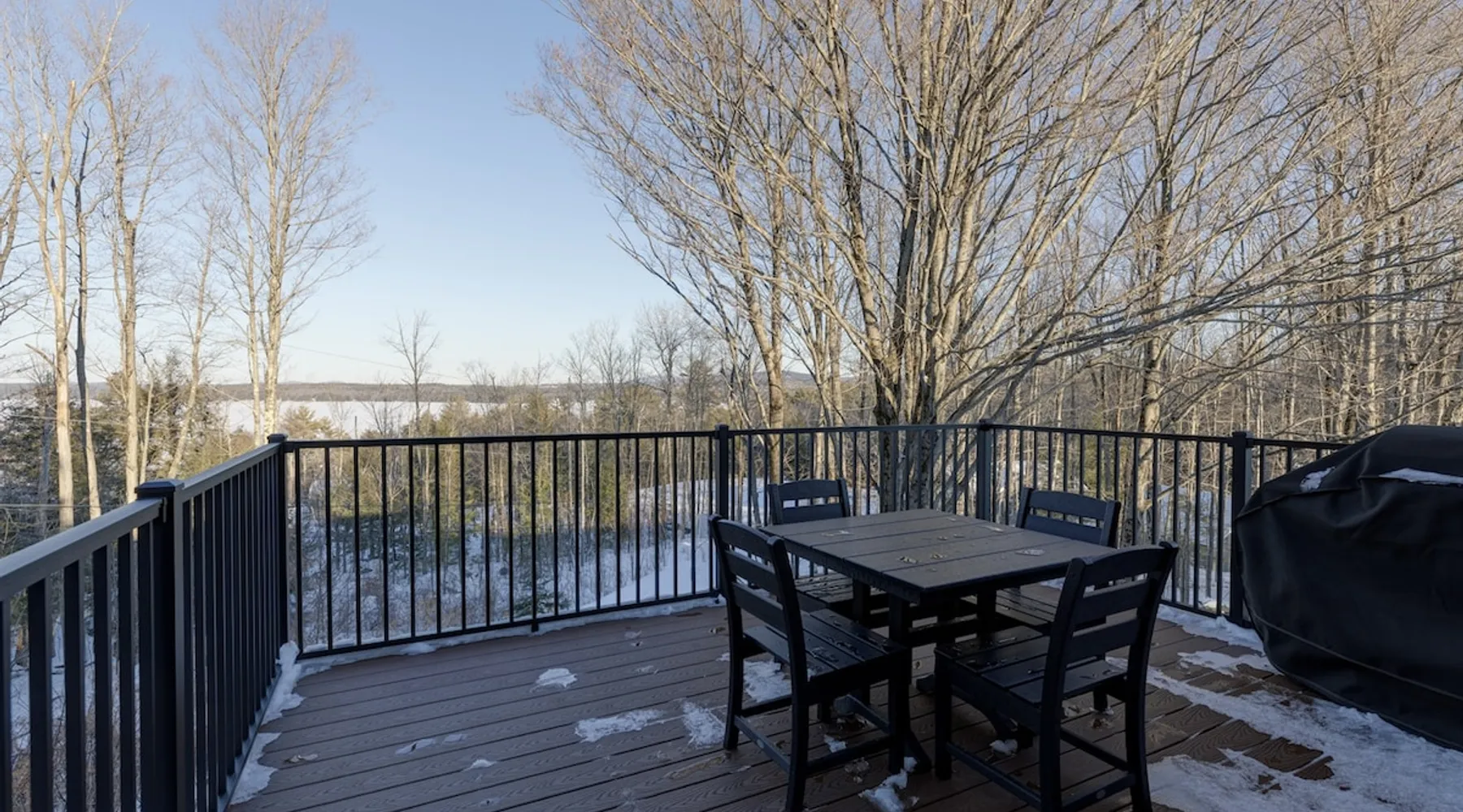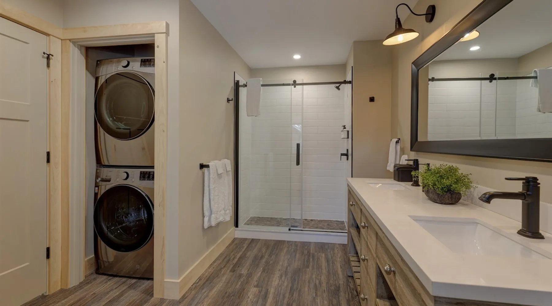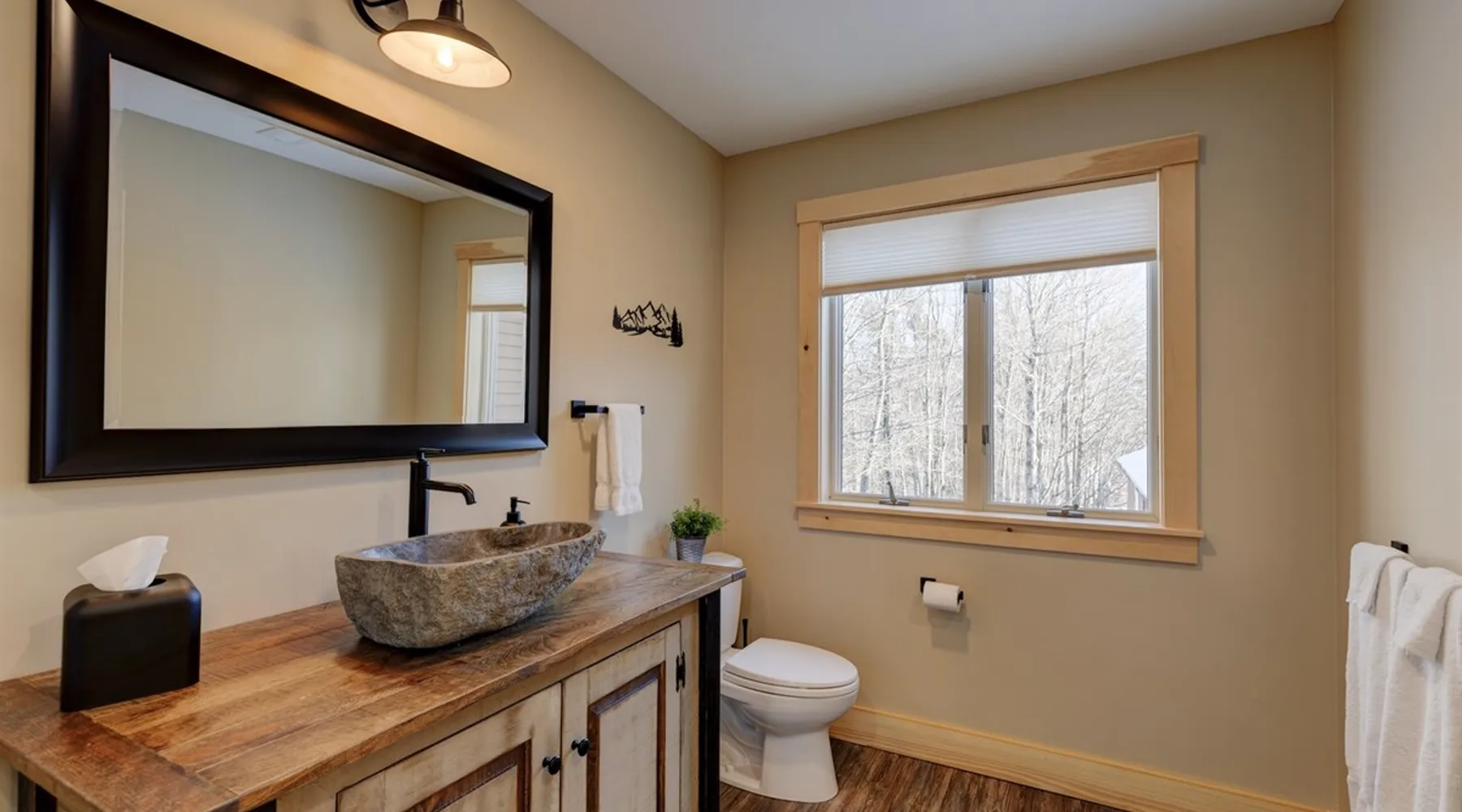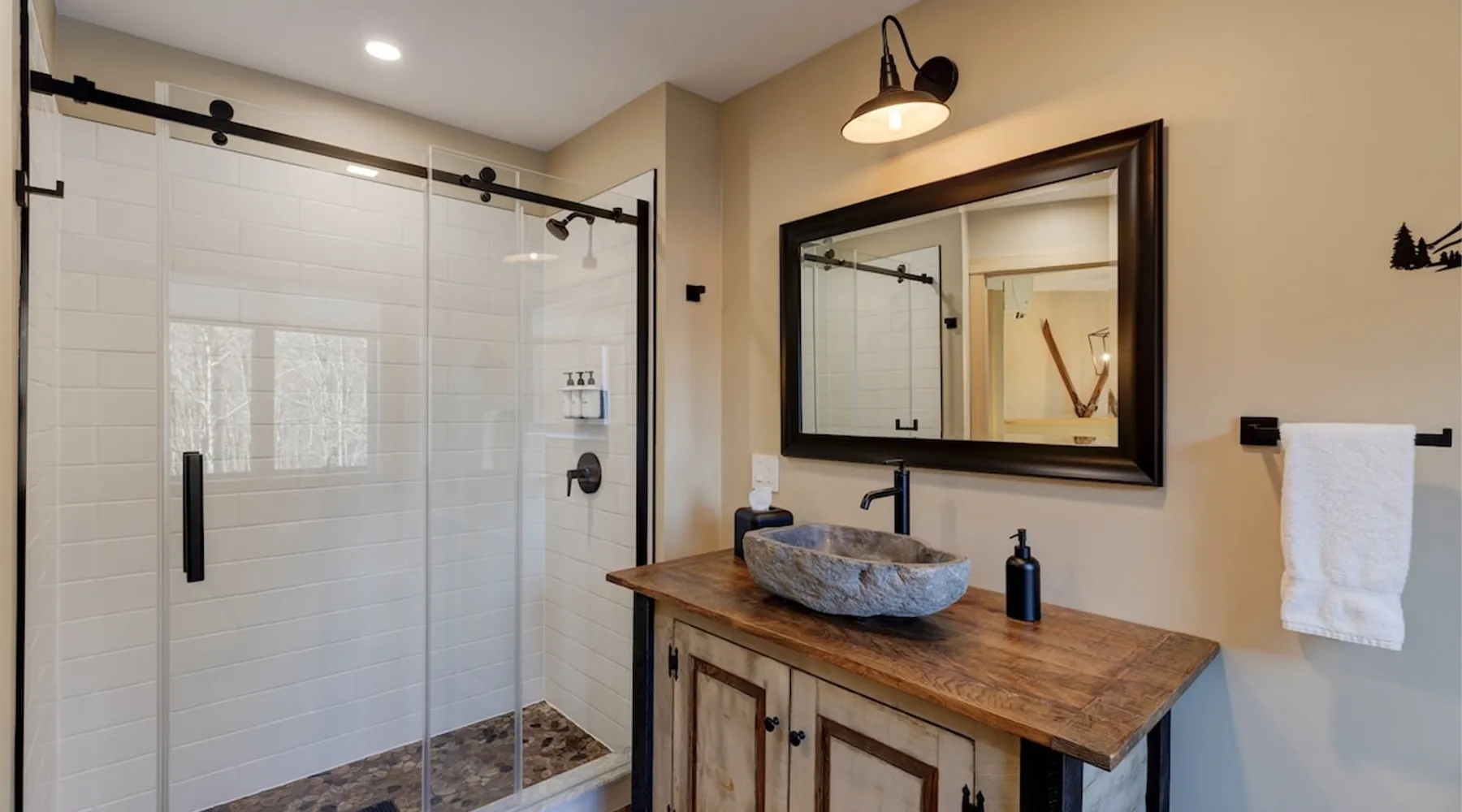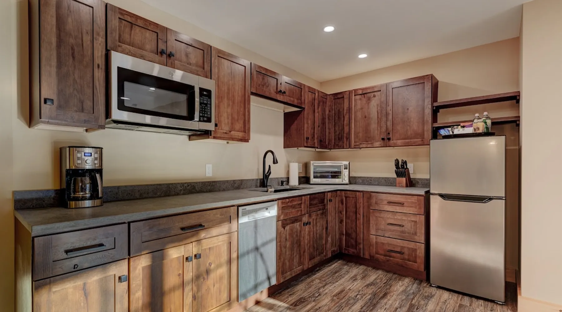 One of eleven suites at The Lodge by Sunapee Stays, located in the picturesque town of Sunapee, with stunning views of Mount Sunapee just outside your door. As the largest suite available, this spacious 1-bedroom, 2-bath unit features both front and back decks, a washer and dryer, and an outdoor table and grill for your convenience. Just minutes from Sunapee Harbor and less than a 10-minute drive to the renowned Mount Sunapee, it’s the perfect retreat for relaxation and adventure! The space This modern rustic two level suite features one bedroom, 2 bathrooms and a sofa bed. The hickory log furniture, shiplap vaulted ceilings and plush Adirondack style furnishings evoke relaxation after your day of adventures. The bathrooms boasts a sanctuary of their own with pebble stone shower surrounded by subway tiles and your very own bidet toilet! On the first floor, this suite offers one bedroom with king bed, smart TV and ensuite bathroom with washer and dryer. On the second floor you'll find a living area with memory foam sofa bed and smart TV, second full bathroom and kitchenette with all the amenities to eat in. Outside you'll find a private back deck with dining table and grill and a semi-private front deck with views of Mount Sunapee. Guests can enjoy the two-floor game room, featuring a comfortable lounge area with classic and contemporary family games and a TV. The outdoor heated pool is open seasonally from Memorial Day through Columbus Day and is complemented by a community fire pit, grill, and cabana with a TV and outdoor seating, perfect for relaxing or gathering with family and friends after a day of adventure! In Room Amenities: King Bed Full Size Sleeper Sofa Kitchenette Microwave Refrigerator Flat Screen Smart TV (2) Complimentary High Speed Internet Cuisinart Double Induction Electric Cooktop Coffee Pot with Coffee Toaster Oven Plates, Glasses, Silverware, Cookware Hair Dryer Premium Bath amenities Private heating/air conditioning unit Washer/Dryer in unit Access to iron/iron board Guest access This is a 1 bed/2 bath suite and one of eleven suites at The Lodge by Sunapee Stays, each featuring a private entrance and keyless self check-in for your convenience. Your personalized check-in code will be provided seven days prior to your arrival.