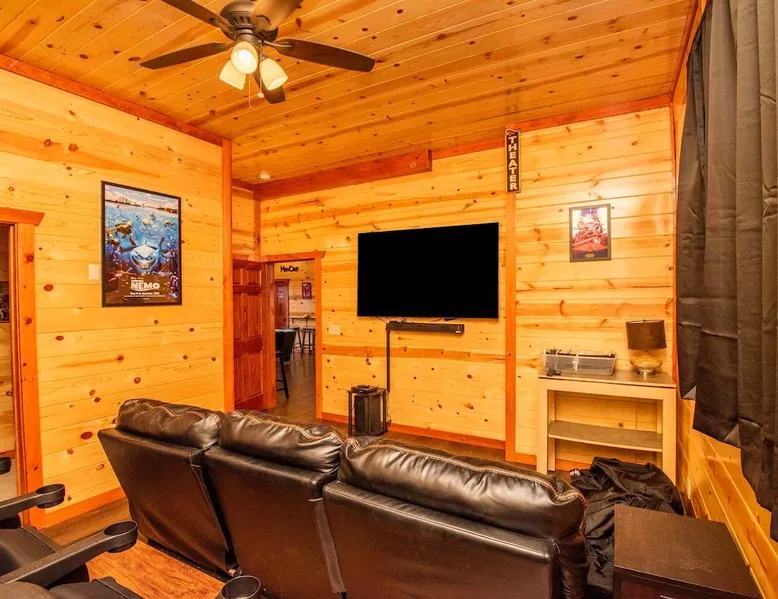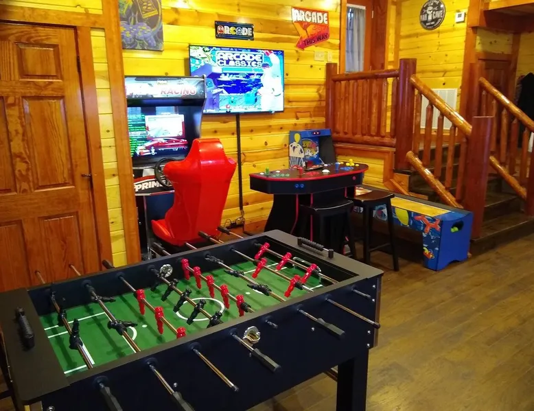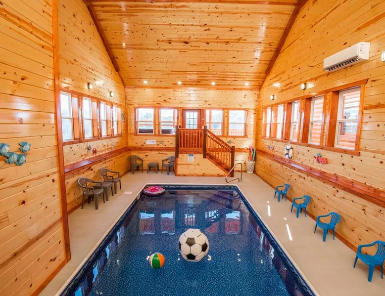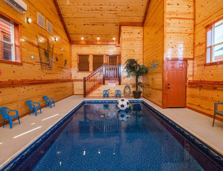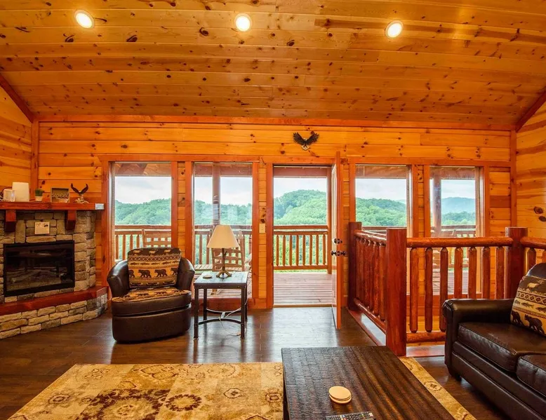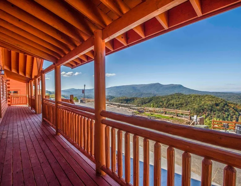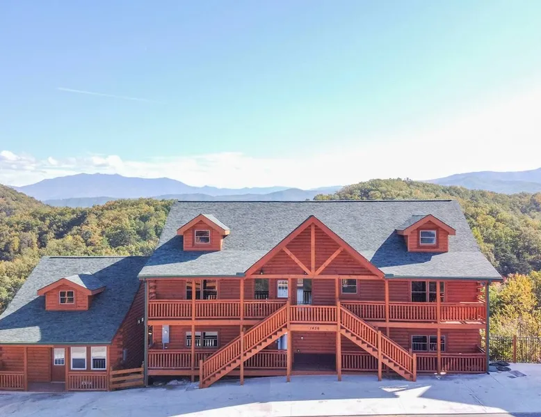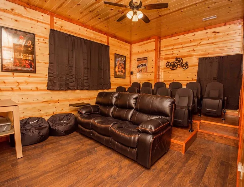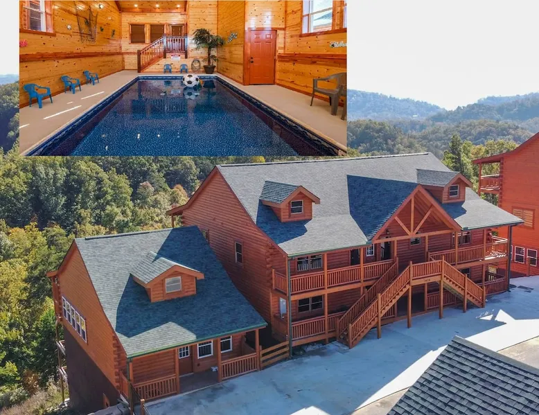 Brand new almost 6000 sqft 7BR built in 2020 + Heated private indoor pool + Theater + Game room, 10 BA sleeps 32 in beds (Maximum of 40 humans allowed and 4 dogs under 20 lb. each ... larger dogs allowed with proof they are for therapy), at the top of the mountain for spectacular 360 degree views (for gorgeous sunrises and sunsets) mountain and valley views with two private back decks facing woods and ridge tops. It has a huge heated swimming pool, in an entirely separate building (aka “The Bir The space It has a full eat-in-kitchen that seats 30, laundry, huge game room/arcade that can’t be beat, WiFi, hot tub, an electric fireplace in the great room, charcoal grills outside, with a neighborhood wedding chapel and reception facility. Eagles’ Spread Lodge is a newly constructed beautiful 7 bedroom (each with a private bathroom) log cabin that’s perched on a hill providing spectacular views of the valley below as well as the surrounding mountains and rolling forest lands. It’s secluded from the noise and traffic in probably the most desirable destination neighborhood in the area, yet a very short drive away from everything you could ever want to do in this area. It has 4 large private balconies. The 2 in the back give everyone plenty of space to enjoy the serenity of this private wooded and mountainous setting, complete with 3 double swings and 12 rocking chairs for your relaxation, and 2 picnic tables for outside dining. The 2 front decks feature 2 more double swings and 2 benches to enjoy the gorgeous views and sunsets in that direction. In fact EVERY ROOM in this magnificent cabin has an incredible view! The first floor has a 14 seat theater (with a full bathroom) complete with a theater-like Surround sound system, and Blu-ray DVD player; and a huge game room (with a half bathroom) with all championship quality games of 8′ slate billiards table, 8′ air hockey table, 9′ shuffleboard table, foosball, Nascar game race driving game*, a 4-player thousand game multi-arcade system, and it also has flippers to play 306 virtual pinball games, and a pub/card table for tons of family fun and laughs together. Outside has 2 charcoal grills, and a hot tub as well. The cabin has a large flat screen TV in each room. Every TV in this lodge is a 4K Ultra HD (2160p) HDR Roku/Smart TV! *May be out of order during your stay. Next door is the incredible pool house with a heated 12'x24' pool( and a half bathroom)! Just outside the pool house is the large 7-person hot tub with privacy screen on the back deck over-looking the mountains. While the kids are having their own fun in the pool house, the guys can be enjoying the game-room/man-cave in complete peace and quiet, without the humidity, noise, and even musty smells associated with so many pools built in cabin basements. This game list includes all your favorites such as '80s & '90s arcade games and many sports & adventure games as well … all on a 55″ screen! There are few cabins in front or behind this cabin (to provide an unobstructed view of the mountains with no other cabins obstructing). It’s just you and Mother Nature here … yet you are close to everything! We are on a community water and sewer system, so no worries there. This cabin is located just a few miles off the main parkway of Pigeon Forge, within short driving distance to many shows and restaurants, and only minutes from Dollywood, Gatlinburg, and all the fun that Pigeon Forge and The Smokies has to offer. While this location provides privacy and seclusion, it also has the benefit of providing multiple short driving routes to all area attractions, which is helpful to avoid high traffic areas. This property has everything you could want for your relaxation and entertainment, so you really might not ever want to leave. There is parking space (for trucks, RVs, vans, buses, … at least 11 cars), so why not your friends and relatives meet here for some good times together? LAYOUT ... This 2-story cabin has 4 ensuite bedrooms (#1-4), a great room, and eat-in kitchen upstairs, with a front and back deck. It has 3 ensuite bedrooms (#5-7), a theater room with full bathroom, game room with half bathroom downstairs, and a front and back deck. The downstairs deck has access to the hot tub, and the pool house with half bathroom next door. ESL Bedding upstairs: Ensuite 1- 1 King / Ensuite 2- 1 King, 1 futon** / Ensuite 3- 1 Queen, 1 Queen/Queen bunk bed / Ensuite 4- 1 Queen, 1 Queen/Queen bunk bed ESL Bedding downstairs: Ensuite 5- 1 King / Ensuite 6-King, 1 futon** / Ensuite 7- 2 Queen/Queen bunk beds * We recommend guests bring an air mattress if planning to use the futon. The cushions do not provide a very flat sleeping surface. * Bring your own sheets for the Pack n' Play, which MAY BE available, but is not guaranteed. Guest access -A limited supply of Towels, bed sheets, soap, toilet paper, and pillows are provided -For your safety, the outside of the cabin is monitored by video/audio recording equipment. Other things to note - We HAVE 3-NIGHT MINIMUMS DURING THE SPRING, SUMMER, AND HOLIDAYS, and 2-night minimums otherwise. - A limited supply of towels, bed sheets, soap, toilet paper, and pillows are provided - Must submit Driver's license and rental agreement to manager within 24 hours of booking. - The HOA rules allow 4 inside dogs up to 20 lbs.. They do NOT grant any waivers. Signed pet agreement and $20 + tax/night per pet required. - Must be at least 30 to rent. - Smoking allowed outside only. - Guests must take out all trash and wash all dishes (or leave in running dishwasher) prior to checkout. - For your safety, the outside of the cabin is monitored by video/audio recording equipment. *Guest must submit a $500 off-platform security hold that will be collected upon signing rental agreement but it will not be placed until 12 days prior to arrival and released 7 days after departure, if no damages are reported. Please note we are API Connected to a hotel-style software c