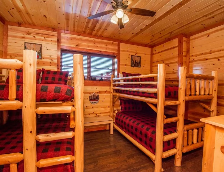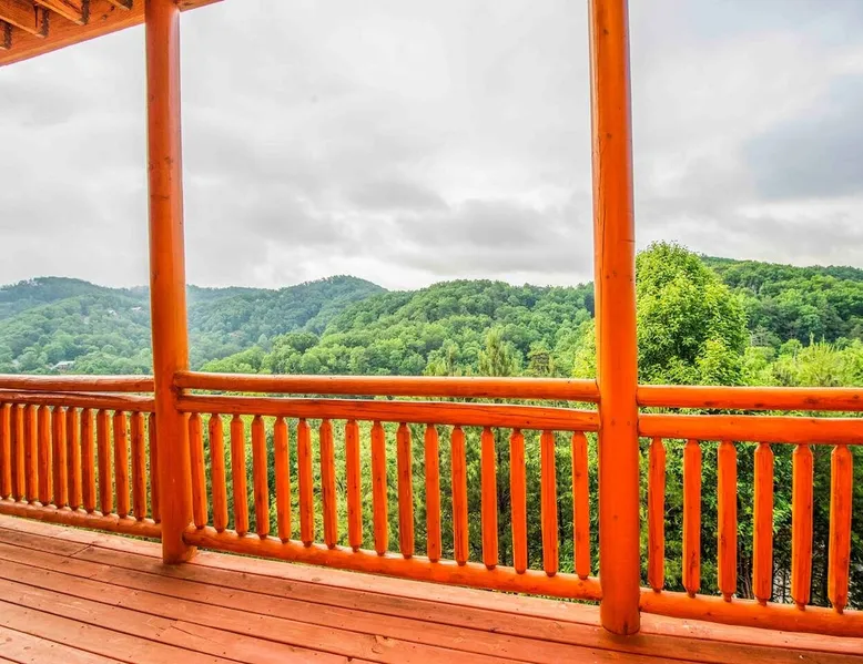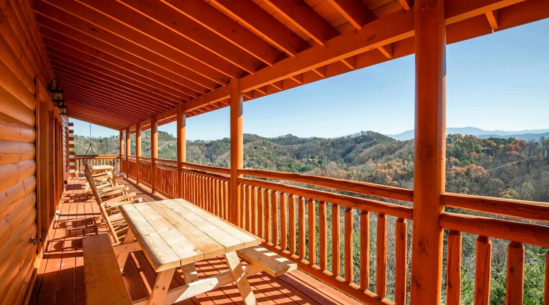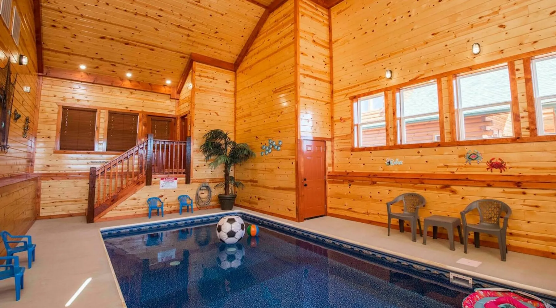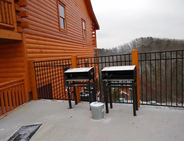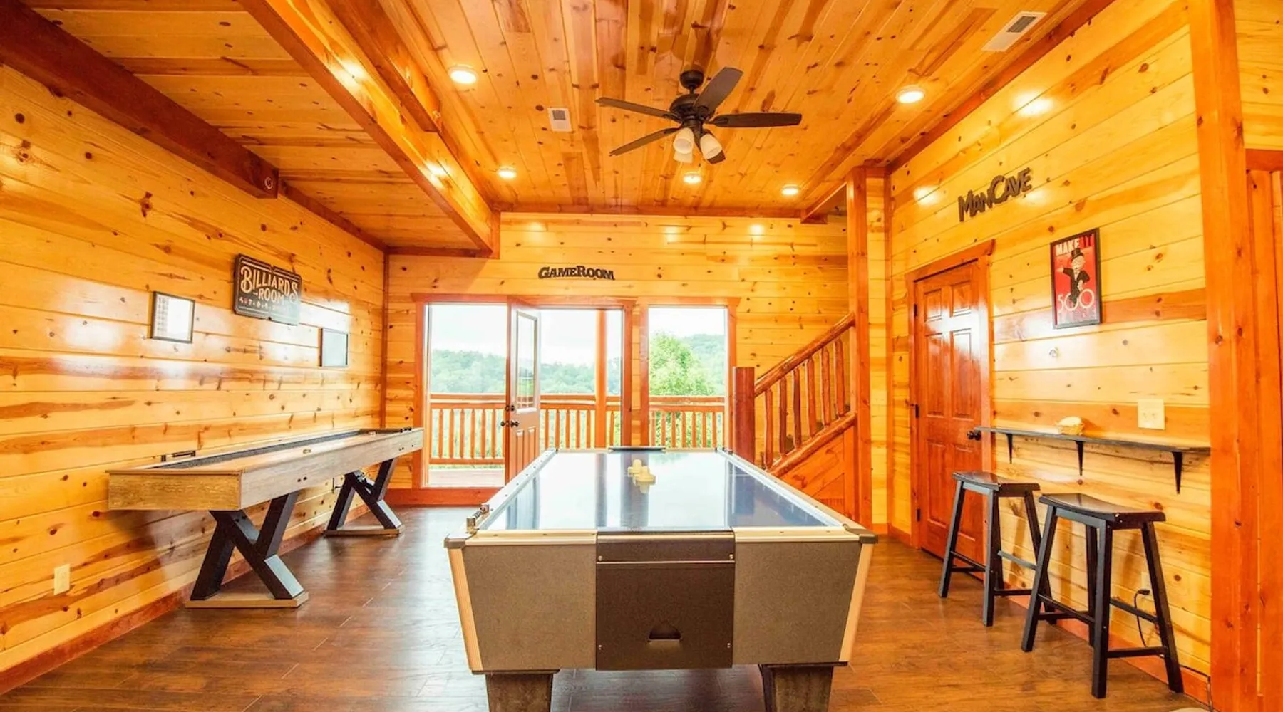Brand new almost 6000 sqft 7BR built in 2020 + Heated private indoor pool + Theater + Game room, 10 BA sleeps 32 in beds (Maximum of 40 humans allowed and 4 dogs under 20 lb. each ... larger dogs allowed with proof they are for therapy), at the top of the mountain for spectacular 360 degree views (for gorgeous sunrises and sunsets) mountain and valley views with two private back decks facing woods and ridge tops. It has a huge heated swimming pool, in an entirely separate building (aka “The Bir The space It has a full eat-in-kitchen that seats 30, laundry, huge game room/arcade that can’t be beat, WiFi, hot tub, an electric fireplace in the great room, charcoal grills outside, with a neighborhood wedding chapel and reception facility. Eagles’ Spread Lodge is a newly constructed beautiful 7 bedroom (each with a private bathroom) log cabin that’s perched on a hill providing spectacular views of the valley below as well as the surrounding mountains and rolling forest lands. It’s secluded from the noise and traffic in probably the most desirable destination neighborhood in the area, yet a very short drive away from everything you could ever want to do in this area. It has 4 large private balconies. The 2 in the back give everyone plenty of space to enjoy the serenity of this private wooded and mountainous setting, complete with 3 double swings and 12 rocking chairs for your relaxation, and 2 picnic tables for outside dining. The 2 front decks feature 2 more double swings and 2 benches to enjoy the gorgeous views and sunsets in that direction. In fact EVERY ROOM in this magnificent cabin has an incredible view! The first floor has a 14 seat theater (with a full bathroom) complete with a theater-like Surround sound system, and Blu-ray DVD player; and a huge game room (with a half bathroom) with all championship quality games of 8′ slate billiards table, 8′ air hockey table, 9′ shuffleboard table, foosball, Nascar game race driving game*, a 4-player thousand game multi-arcade system, and it also has flippers to play 306 virtual pinball games, and a pub/card table for tons of family fun and laughs together. Outside has 2 charcoal grills, and a hot tub as well. The cabin has a large flat screen TV in each room. Every TV in this lodge is a 4K Ultra HD (2160p) HDR Roku/Smart TV! *May be out of order during your stay. Next door is the incredible pool house with a heated 12'x24' pool( and a half bathroom)! Just outside the pool house is the large 7-person hot tub with privacy screen on the back deck over-looking the mountains. While the kids are having their own fun in the pool house, the guys can be enjoying the game-room/man-cave in complete peace and quiet, without the humidity, noise, and even musty smells associated with so many pools built in cabin basements. This game list includes all your favorites such as '80s & '90s arcade games and many sports & adventure games as well … all on a 55″ screen! There are few cabins in front or behind this cabin (to provide an unobstructed view of the mountains with no other cabins obstructing). It’s just you and Mother Nature here … yet you are close to everything! We are on a community water and sewer system, so no worries there. This cabin is located just a few miles off the main parkway of Pigeon Forge, within short driving distance to many shows and restaurants, and only minutes from Dollywood, Gatlinburg, and all the fun that Pigeon Forge and The Smokies has to offer. While this location provides privacy and seclusion, it also has the benefit of providing multiple short driving routes to all area attractions, which is helpful to avoid high traffic areas. This property has everything you could want for your relaxation and entertainment, so you really might not ever want to leave. There is parking space (for trucks, RVs, vans, buses, … at least 11 cars), so why not your friends and relatives meet here for some good times together? LAYOUT ... This 2-story cabin has 4 ensuite bedrooms (#1-4), a great room, and eat-in kitchen upstairs, with a front and back deck. It has 3 ensuite bedrooms (#5-7), a theater room with full bathroom, game room with half bathroom downstairs, and a front and back deck. The downstairs deck has access to the hot tub, and the pool house with half bathroom next door. ESL Bedding upstairs: Ensuite 1- 1 King / Ensuite 2- 1 King, 1 futon** / Ensuite 3- 1 Queen, 1 Queen/Queen bunk bed / Ensuite 4- 1 Queen, 1 Queen/Queen bunk bed ESL Bedding downstairs: Ensuite 5- 1 King / Ensuite 6-King, 1 futon** / Ensuite 7- 2 Queen/Queen bunk beds * We recommend guests bring an air mattress if planning to use the futon. The cushions do not provide a very flat sleeping surface. * Bring your own sheets for the Pack n' Play, which MAY BE available, but is not guaranteed. Guest access -A limited supply of Towels, bed sheets, soap, toilet paper, and pillows are provided -For your safety, the outside of the cabin is monitored by video/audio recording equipment. Other things to note - We HAVE 3-NIGHT MINIMUMS DURING THE SPRING, SUMMER, AND HOLIDAYS, and 2-night minimums otherwise. - A limited supply of towels, bed sheets, soap, toilet paper, and pillows are provided - Must submit Driver's license and rental agreement to manager within 24 hours of booking. - The HOA rules allow 4 inside dogs up to 20 lbs.. They do NOT grant any waivers. Signed pet agreement and $20 + tax/night per pet required. - Must be at least 30 to rent. - Smoking allowed outside only. - Guests must take out all trash and wash all dishes (or leave in running dishwasher) prior to checkout. - For your safety, the outside of the cabin is monitored by video/audio recording equipment. *Guest must submit a $500 off-platform security hold that will be collected upon signing rental agreement but it will not be placed until 12 days prior to arrival and released 7 days after departure, if no damages are reported. Please note we are API Connected to a hotel-style software c