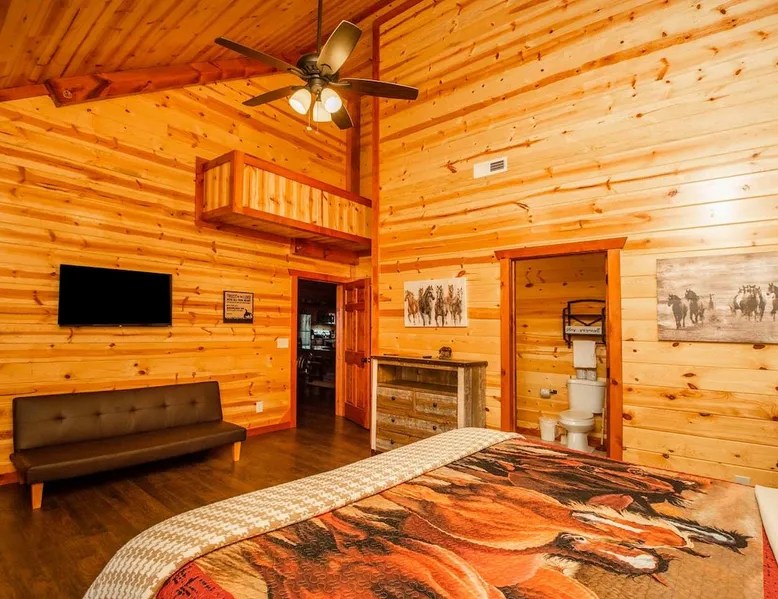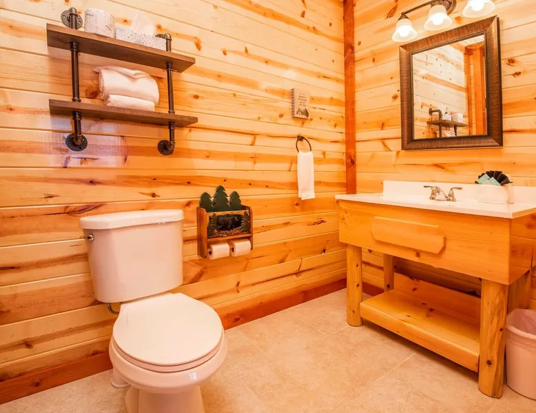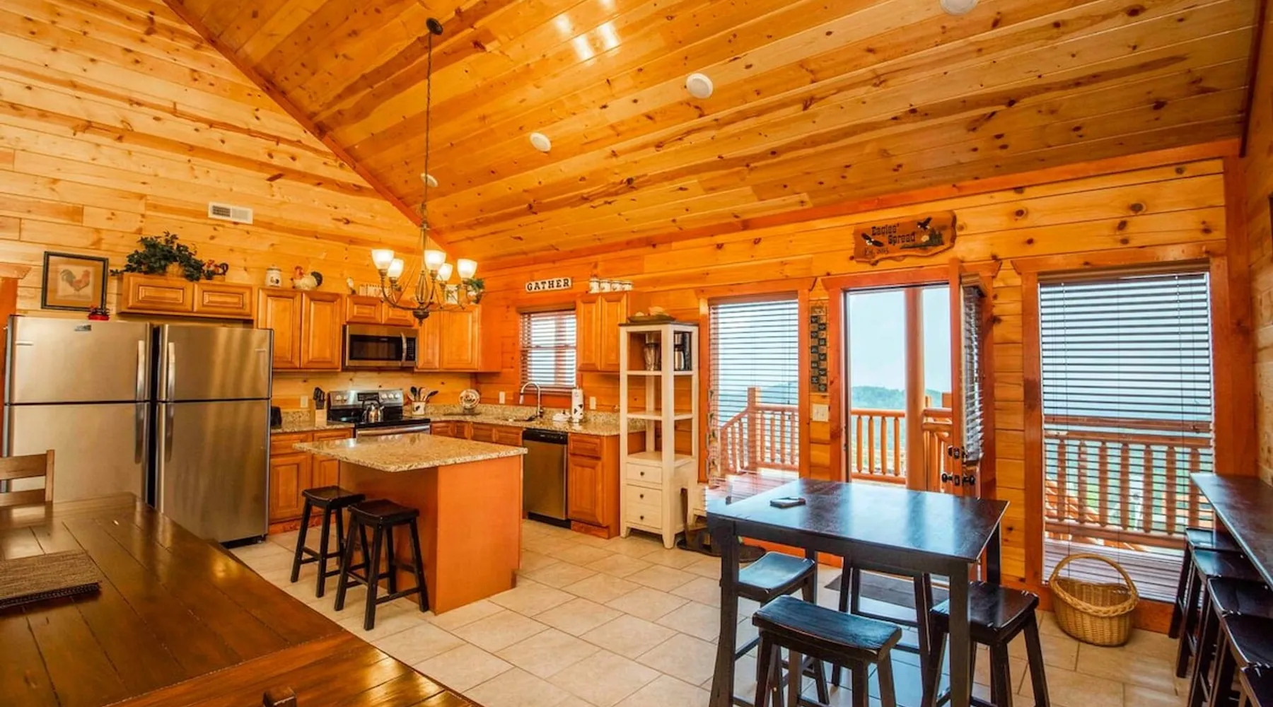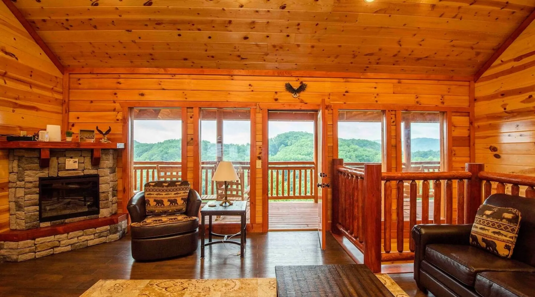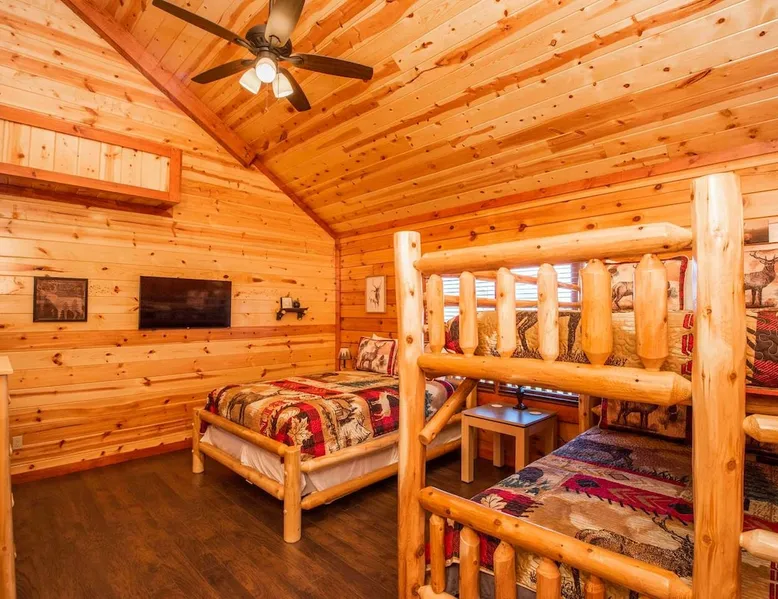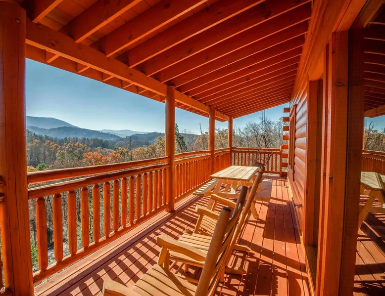 Brand new almost 6000 sqft 7BR built in 2020 + Heated private indoor pool + Theater + Game room, 10 BA sleeps 32 in beds (Maximum of 40 humans allowed and 4 dogs under 20 lb. each ... larger dogs allowed with proof they are for therapy), at the top of the mountain for spectacular 360 degree views (for gorgeous sunrises and sunsets) mountain and valley views with two private back decks facing woods and ridge tops. It has a huge heated swimming pool, in an entirely separate building (aka “The Bir The space It has a full eat-in-kitchen that seats 30, laundry, huge game room/arcade that can’t be beat, WiFi, hot tub, an electric fireplace in the great room, charcoal grills outside, with a neighborhood wedding chapel and reception facility. Eagles’ Spread Lodge is a newly constructed beautiful 7 bedroom (each with a private bathroom) log cabin that’s perched on a hill providing spectacular views of the valley below as well as the surrounding mountains and rolling forest lands. It’s secluded from the noise and traffic in probably the most desirable destination neighborhood in the area, yet a very short drive away from everything you could ever want to do in this area. It has 4 large private balconies. The 2 in the back give everyone plenty of space to enjoy the serenity of this private wooded and mountainous setting, complete with 3 double swings and 12 rocking chairs for your relaxation, and 2 picnic tables for outside dining. The 2 front decks feature 2 more double swings and 2 benches to enjoy the gorgeous views and sunsets in that direction. In fact EVERY ROOM in this magnificent cabin has an incredible view! The first floor has a 14 seat theater (with a full bathroom) complete with a theater-like Surround sound system, and Blu-ray DVD player; and a huge game room (with a half bathroom) with all championship quality games of 8′ slate billiards table, 8′ air hockey table, 9′ shuffleboard table, foosball, Nascar game race driving game*, a 4-player thousand game multi-arcade system, and it also has flippers to play 306 virtual pinball games, and a pub/card table for tons of family fun and laughs together. Outside has 2 charcoal grills, and a hot tub as well. The cabin has a large flat screen TV in each room. Every TV in this lodge is a 4K Ultra HD (2160p) HDR Roku/Smart TV! *May be out of order during your stay. Next door is the incredible pool house with a heated 12'x24' pool( and a half bathroom)! Just outside the pool house is the large 7-person hot tub with privacy screen on the back deck over-looking the mountains. While the kids are having their own fun in the pool house, the guys can be enjoying the game-room/man-cave in complete peace and quiet, without the humidity, noise, and even musty smells associated with so many pools built in cabin basements. This game list includes all your favorites such as '80s & '90s arcade games and many sports & adventure games as well … all on a 55″ screen! There are few cabins in front or behind this cabin (to provide an unobstructed view of the mountains with no other cabins obstructing). It’s just you and Mother Nature here … yet you are close to everything! We are on a community water and sewer system, so no worries there. This cabin is located just a few miles off the main parkway of Pigeon Forge, within short driving distance to many shows and restaurants, and only minutes from Dollywood, Gatlinburg, and all the fun that Pigeon Forge and The Smokies has to offer. While this location provides privacy and seclusion, it also has the benefit of providing multiple short driving routes to all area attractions, which is helpful to avoid high traffic areas. This property has everything you could want for your relaxation and entertainment, so you really might not ever want to leave. There is parking space (for trucks, RVs, vans, buses, … at least 11 cars), so why not your friends and relatives meet here for some good times together? LAYOUT ... This 2-story cabin has 4 ensuite bedrooms (#1-4), a great room, and eat-in kitchen upstairs, with a front and back deck. It has 3 ensuite bedrooms (#5-7), a theater room with full bathroom, game room with half bathroom downstairs, and a front and back deck. The downstairs deck has access to the hot tub, and the pool house with half bathroom next door. ESL Bedding upstairs: Ensuite 1- 1 King / Ensuite 2- 1 King, 1 futon** / Ensuite 3- 1 Queen, 1 Queen/Queen bunk bed / Ensuite 4- 1 Queen, 1 Queen/Queen bunk bed ESL Bedding downstairs: Ensuite 5- 1 King / Ensuite 6-King, 1 futon** / Ensuite 7- 2 Queen/Queen bunk beds * We recommend guests bring an air mattress if planning to use the futon. The cushions do not provide a very flat sleeping surface. * Bring your own sheets for the Pack n' Play, which MAY BE available, but is not guaranteed. Guest access -A limited supply of Towels, bed sheets, soap, toilet paper, and pillows are provided -For your safety, the outside of the cabin is monitored by video/audio recording equipment. Other things to note - We HAVE 3-NIGHT MINIMUMS DURING THE SPRING, SUMMER, AND HOLIDAYS, and 2-night minimums otherwise. - A limited supply of towels, bed sheets, soap, toilet paper, and pillows are provided - Must submit Driver's license and rental agreement to manager within 24 hours of booking. - The HOA rules allow 4 inside dogs up to 20 lbs.. They do NOT grant any waivers. Signed pet agreement and $20 + tax/night per pet required. - Must be at least 30 to rent. - Smoking allowed outside only. - Guests must take out all trash and wash all dishes (or leave in running dishwasher) prior to checkout. - For your safety, the outside of the cabin is monitored by video/audio recording equipment. *Guest must submit a $500 off-platform security hold that will be collected upon signing rental agreement but it will not be placed until 12 days prior to arrival and released 7 days after departure, if no damages are reported. Please note we are API Connected to a hotel-style software c