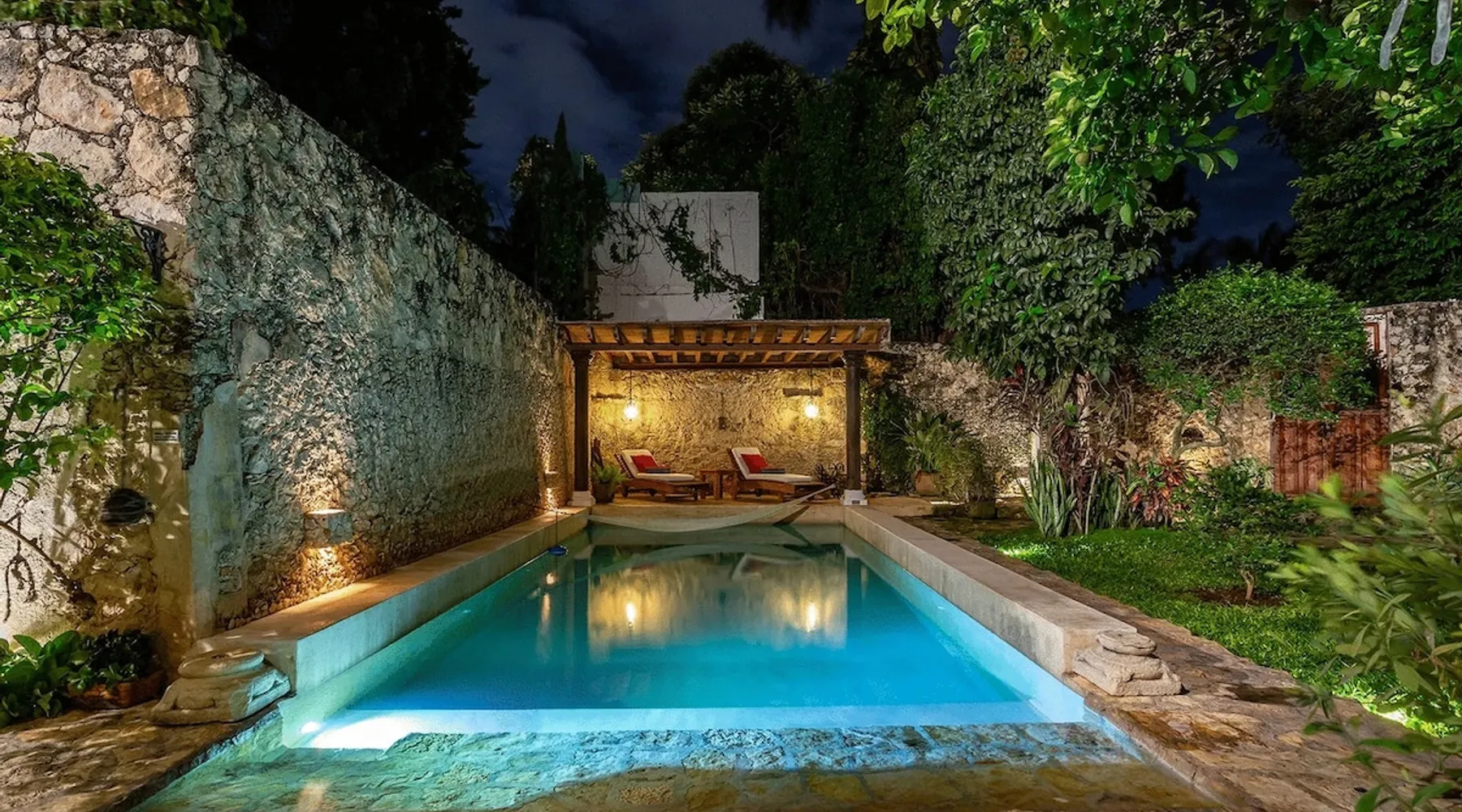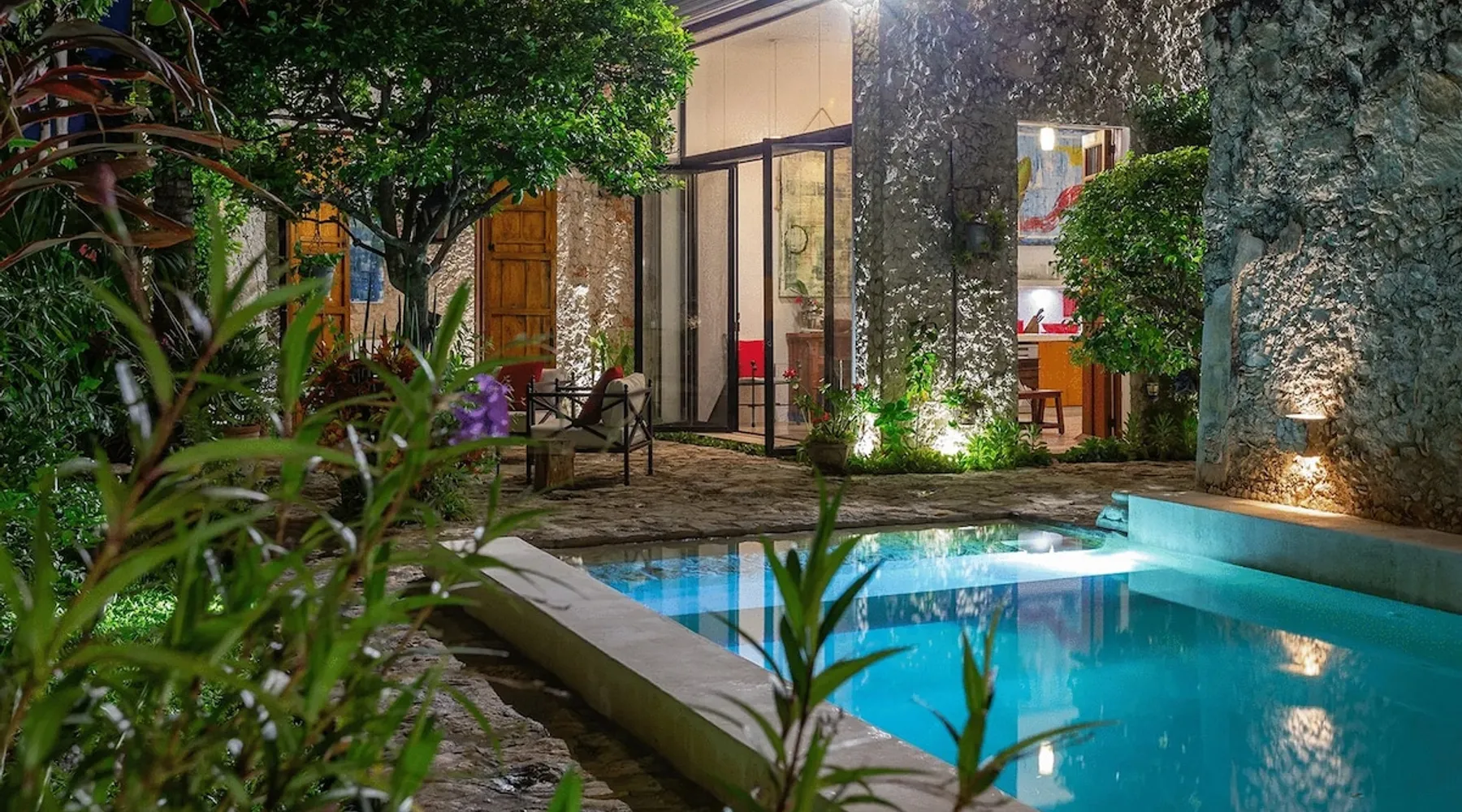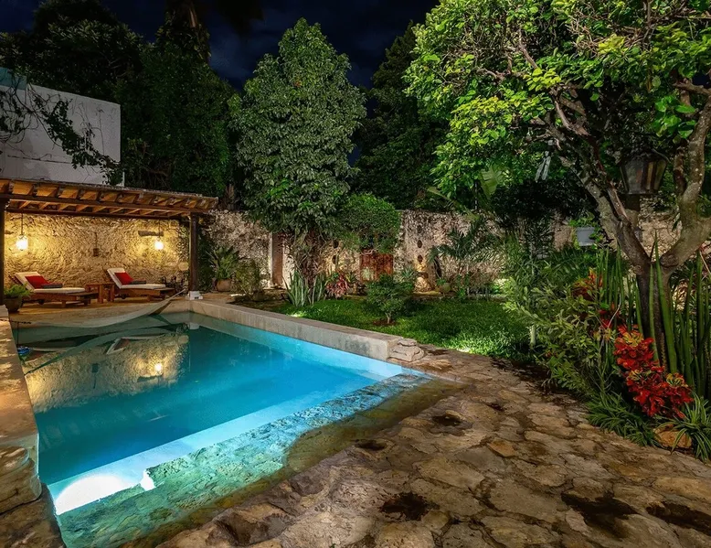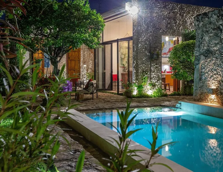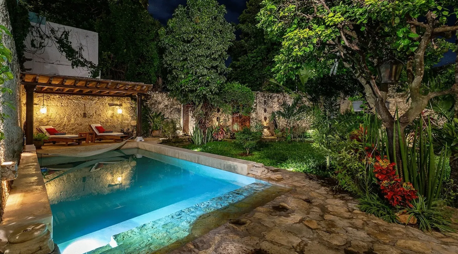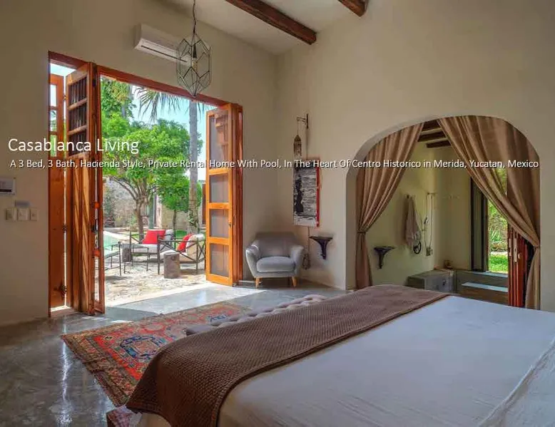 As seen on Airbnb commercial for Central and Latin America, 3 Bed, 3 Bath, Hacienda Style, Private Rental Home With Pool In Centro Historico, Merida, Yucatan, Mexico. It has a Huge Pool, Massive Garden, Fruit Trees, Palms, Cabana, 3 Bedroom, 3 Bathroom, Stainless Kitchen with All Modern Appliances, Private Theater, Luxury Amenities, and just 4 blocks from Santiago Park, Shops, Cafe's, Restaurants and Tourist Destinations. The space Complete Privacy at it's best! Guest access The Entire Property is Yours to Enjoy! Other things to note Casablanca Living is located in the Historic Center of Merida, Yucatan, Mexico. A short 4 block walk will bring you to Santiago Park, where many local restaurants and shops are available and a grocery store. Around the corner from the house is a small convenience store and a bakery and most of the local tourist attractions are a short walk or easy cab ride away.