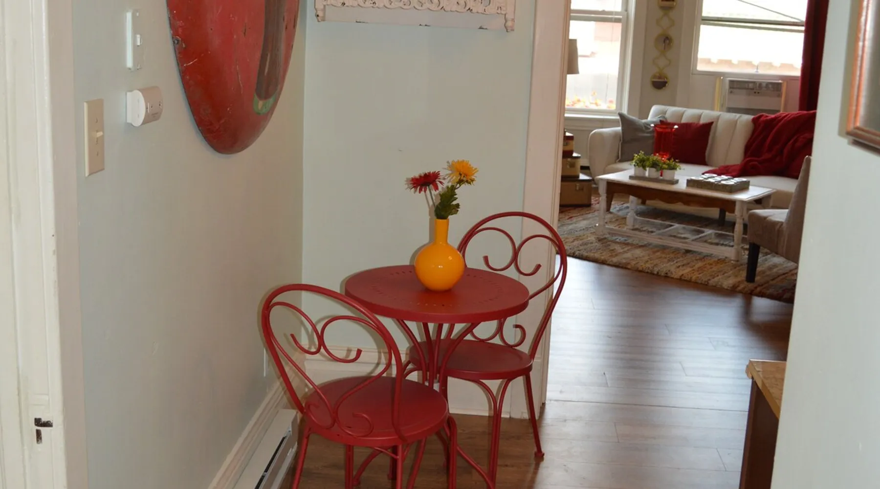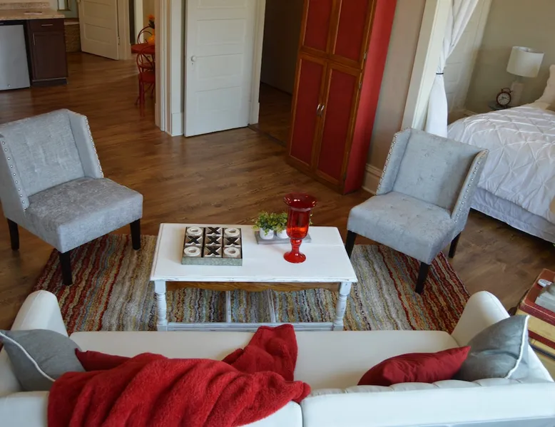 Lovely, quaint, and full of urban elegance yet all set in a charming small town setting. Amenities of a luxury boutique hotel, yet the low price of a standard room. Complete with WiFi, The kitchen does not have a stove but does host a small fridge, microwave, toaster oven, coffee maker, dishes. Separate living room with Record Player & Vintage Albums. Luxury Bed in a relaxing space. Workspace so you can conduct your business. The space The Suite is on the 2nd floor and has a full set of stairs to enter the suite, but an amazing view of downtown Rochelle is awarded. Private entrance and private space with all the luxuries of being at home. Downtown location to shopping, dining, and entertainment. Guest access Boutique located in lower level of building where you can shop for many unique household products, artwork, and unique items. Other things to note Extended Stay Quests can receive Clean Towel and Bed Service upon request for an extra charge. The Handmade soaps and other items that you find in your Suite are available for purchase in the The Artists' Garden Boutique Store below the Suite.