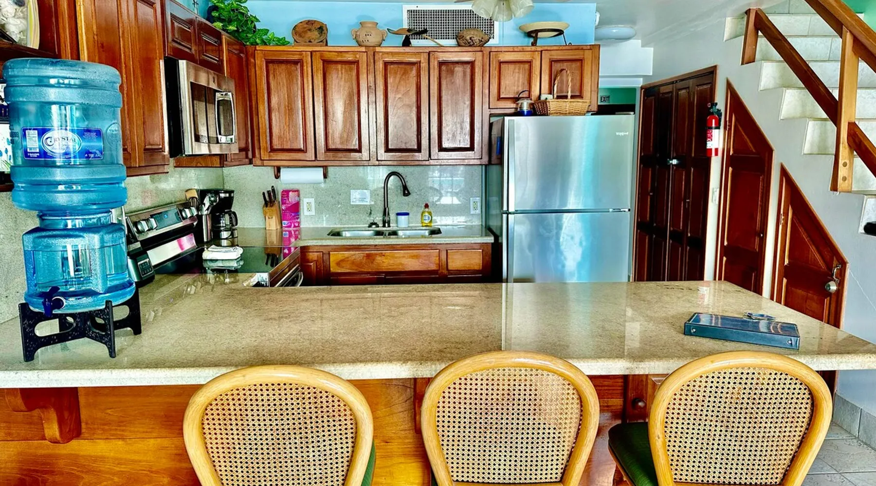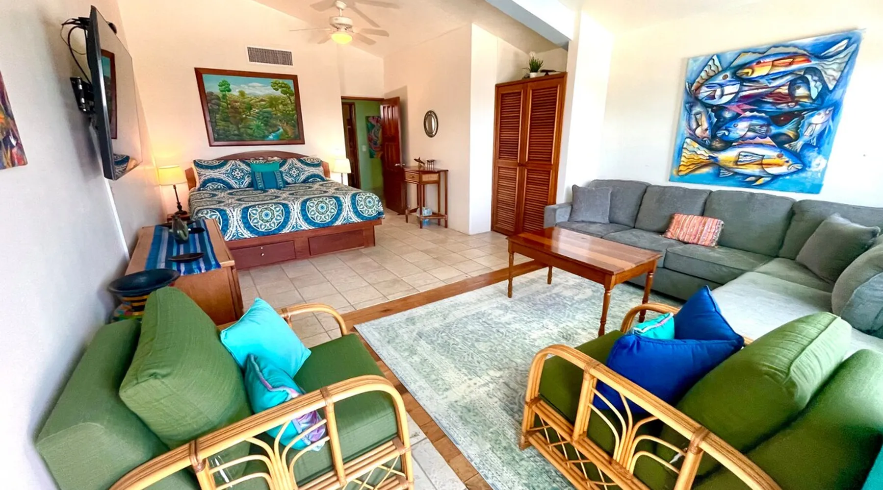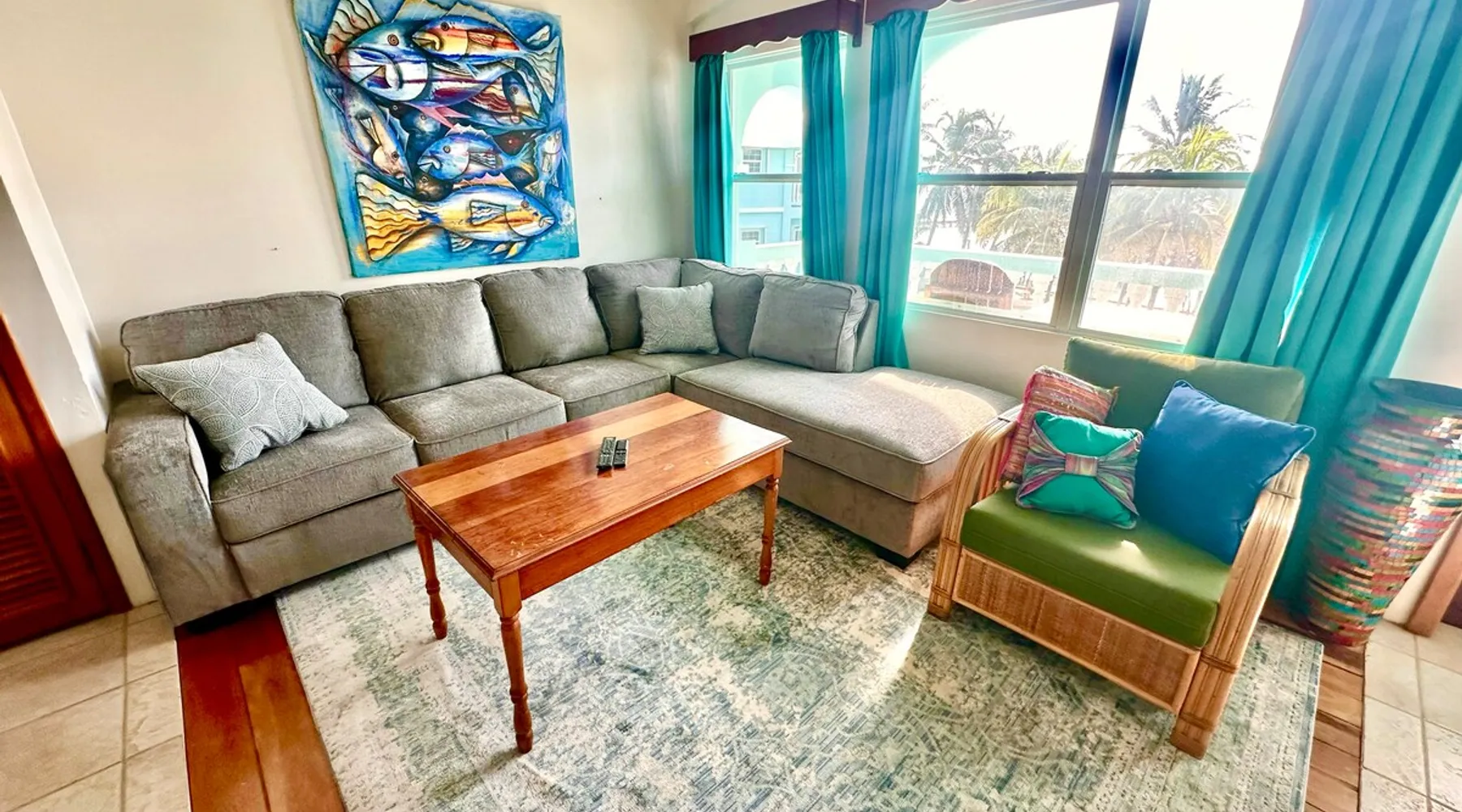 This condo is in a quiet, 13 unit beachfront complex just south of San Pedro on Ambergris Caye -- enjoy a view out to the Barrier Reef, a sandy beach, pool, pier, complimentary bikes & kayaks, & more! Perfect for a family, a group of friends, or three couples, you'll love the personalized decor and fabulous views! With a larger group? Ask about booking multiple condos! The space This condo is on the 2nd and 3rd floors of a building and overlooks the pool with the sea & beach beyond. Enter the condo through the handmade stained glass door to find a bedroom to your right with a queen bed. Continue down the hall past the full bath and you'll enter the living/dining area with queen sleeper sofa. The kitchen is on your right and straight ahead is the living/dining area with doors to the veranda where you have a fabulous view of the pool and the sea. Upstairs you’ll find a full bath and two more bedrooms: -a large bedroom with king bed, sitting area, and private veranda overlooking the pool and the sea. -a bedroom with twin beds (which can be made into a king on request). There are four flat-screen televisions so everyone can watch what they want, and the two-level configuration of the unit really lends itself to privacy within a group. Condo amenities: *Wifi (limited streaming) *Central AC *Ceiling fans *Cable TV *Bed linens *Towels: dish, hand, bath & beach *Full kitchen (no dishwasher) *Starter pack of paper goods (toilet paper, paper towels) *Iron *Hair dryer *Safe *5 gallon water jug (delivered refills US$5) Guest access Resort amenities: •200 feet of sandy beach •pier with “palapa”, swim ladder, and swim/snorkel area with small artificial reef (most tour operators will pick you up/drop you off at our pier for excursions) •fresh water pool with cool water bubbler & “bar stools” •hammocks & hardwood beach lounging furniture •outdoor grills •Covered outdoor dining area •Games such as volleyball, horseshoes, corn hole •Complimentary bikes** •Complimentary kayaks (single & double)** **first come/first served for resort guests; day use only; must sign waiver Included services: •Answer any & all questions both pre-arrival and on-site •Booking of Tropic Air island flights Recommendations/contacts for: •golf carts and excursions/tours •Local cook •Pre-arrival grocery stocking •Massage •Babysitter •Pick up/drop off laundry service Other things to note Base nightly rate is for 4 guests; US$30/night/guest fee for each additional guest up to the maximum allowed in the unit. If you enter your guest number correctly when booking, your total rate will calculate correctly including 9% tax and AirBNB fee. *One complimentary housecleaning for each 10 days booked! If you have a group, ask me about booking multiple condos—we have 1, 2 & 3 bedroom units. If this unit isn't available for the dates you want, check out other Ambergris Caye houses & condos under my profile: https://www.airbnb. com/users/1120393/listings We look forward to having you!