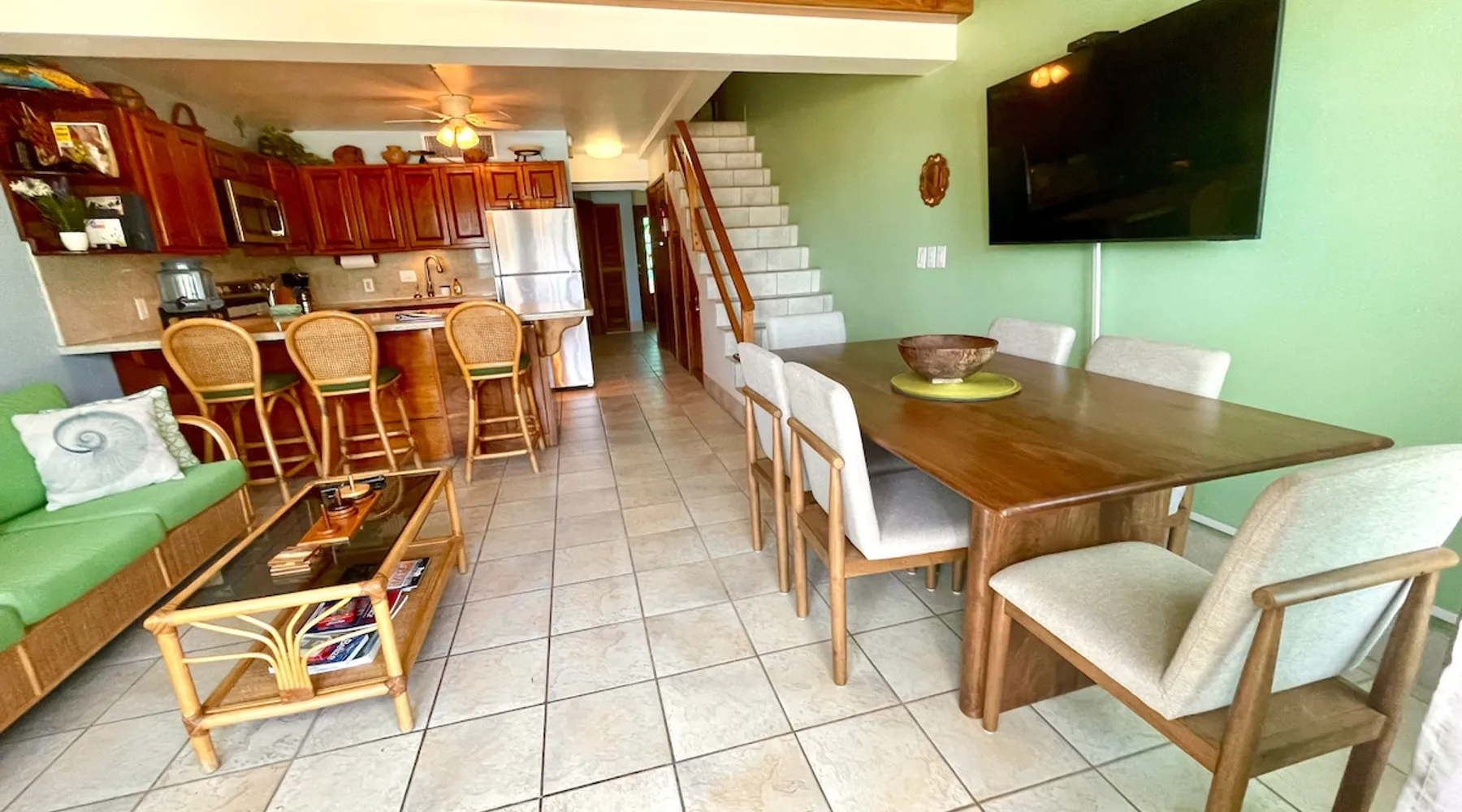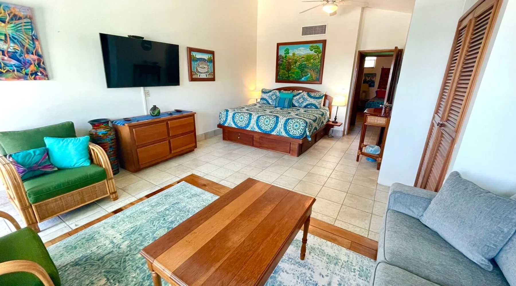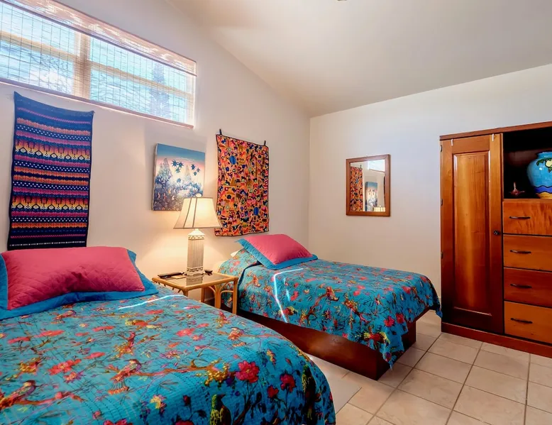 This condo is in a quiet, 13 unit beachfront complex just south of San Pedro on Ambergris Caye -- enjoy a view out to the Barrier Reef, a sandy beach, pool, pier, complimentary bikes & kayaks, & more! Perfect for a family, a group of friends, or three couples, you'll love the personalized decor and fabulous views! With a larger group? Ask about booking multiple condos! The space This condo is on the 2nd and 3rd floors of a building and overlooks the pool with the sea & beach beyond. Enter the condo through the handmade stained glass door to find a bedroom to your right with a queen bed. Continue down the hall past the full bath and you'll enter the living/dining area with queen sleeper sofa. The kitchen is on your right and straight ahead is the living/dining area with doors to the veranda where you have a fabulous view of the pool and the sea. Upstairs you’ll find a full bath and two more bedrooms: -a large bedroom with king bed, sitting area, and private veranda overlooking the pool and the sea. -a bedroom with twin beds (which can be made into a king on request). There are four flat-screen televisions so everyone can watch what they want, and the two-level configuration of the unit really lends itself to privacy within a group. Condo amenities: *Wifi (limited streaming) *Central AC *Ceiling fans *Cable TV *Bed linens *Towels: dish, hand, bath & beach *Full kitchen (no dishwasher) *Starter pack of paper goods (toilet paper, paper towels) *Iron *Hair dryer *Safe *5 gallon water jug (delivered refills US$5) Guest access Resort amenities: •200 feet of sandy beach •pier with “palapa”, swim ladder, and swim/snorkel area with small artificial reef (most tour operators will pick you up/drop you off at our pier for excursions) •fresh water pool with cool water bubbler & “bar stools” •hammocks & hardwood beach lounging furniture •outdoor grills •Covered outdoor dining area •Games such as volleyball, horseshoes, corn hole •Complimentary bikes** •Complimentary kayaks (single & double)** **first come/first served for resort guests; day use only; must sign waiver Included services: •Answer any & all questions both pre-arrival and on-site •Booking of Tropic Air island flights Recommendations/contacts for: •golf carts and excursions/tours •Local cook •Pre-arrival grocery stocking •Massage •Babysitter •Pick up/drop off laundry service Other things to note Base nightly rate is for 4 guests; US$30/night/guest fee for each additional guest up to the maximum allowed in the unit. If you enter your guest number correctly when booking, your total rate will calculate correctly including 9% tax and AirBNB fee. *One complimentary housecleaning for each 10 days booked! If you have a group, ask me about booking multiple condos—we have 1, 2 & 3 bedroom units. If this unit isn't available for the dates you want, check out other Ambergris Caye houses & condos under my profile: https://www.airbnb. com/users/1120393/listings We look forward to having you!