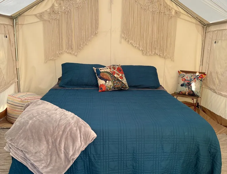 Closed for the 2023 season. Message us to join the waitlist for the total solar eclipse - April 8, 2024. All the fun of camping, without the hassle! This glamping-style tent is nestled between two dogwoods, on a 14-acre private property in the Shawnee Hills Wine Trail. Beautifully decorated with conveniences like electricity, air conditioning and a heater, this lovely tent has a queen beds and linens. The site also includes all your camping necessities to keep your packing light! The space The Garden Glamping Tent is located in a expansive field near two dogwood trees with planters of herbs and vegetables to enjoy during your stay. The twinkle lights, trellises, and abundant stars add to the magical ambiance. Don’t miss the sunset at this site! Keep your packing to a minimum… we’ve got you covered. Campers also have their own patio lounging set, a shady picnic table, fire pit with grill, lantern, fire extinguisher, a large bottle of drinking water, a lighter, a propane camp stove, water kettle, charcoal, fire starters, campfire forks, a bundle of wood, and morning coffee at their camp site. All the necessities! We even have an air conditioner, fan, and heater inside your tent to help you stay more comfortable, when you’re not enjoying the outdoors. How many camp sites can say that!!! There isn't running water to this tent, but we have a porta-potty and sink that is shared with only one other camping site. The porta-potty is extremely clean and well-lit, and it is serviced weekly, despite its limited use. A camping shower can also be made available upon request. Your site also has a dedicated, hand-washing station and trash can just for your use. The site is located not far from the parking area, but when weather is dry, you can also drive your car right up to your site. The porta-potty is also a close walk to this site. We keep it easy, but you should still be prepared to camp. Never camped before? Check the weather for your stay since part of the experience is being outside in the elements. The tents are weatherproofed, but plan to bring your additional camping equipment for the weather including hiking boots, rain gear, cooler, etc. Not sure what to bring? Feel free to ask! For guests who want to bring friends, ask us about booking both of our camp sites. Special pricing for Sunday-Wednesday Campers Guest access Parking is available for up to two cars and is a short walk from the camp site (a few hundred feet.) When weather is dry, you park right by your campsite in the adjacent field. For guests who would like to visit the wineries, but do not want to drive, Shawnee Shuttle also offers services from the property. Other things to note Our glamping experiences are lovely, but before you book, please be prepared to be in the outdoors. Bugs, inclement weather, walking, and wildlife are all part of the experience, and we know camping is not for everyone. The tents are not like staying in a hotel, and they were designed for people who like to camp and be in the outdoors but who want some of the modern comforts without the headache of packing and setup. We want your stay to be special, but we can’t control nature! ;) WiFi service is available but not strong. However cellular reception is fantastic for both ATT and Verizon with a cell tower located just off the property. There is no smoking inside the tent. An additional five percent has been added to base price of this rental to cover local taxes.