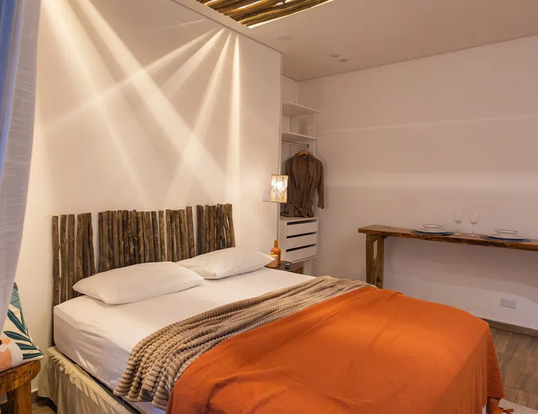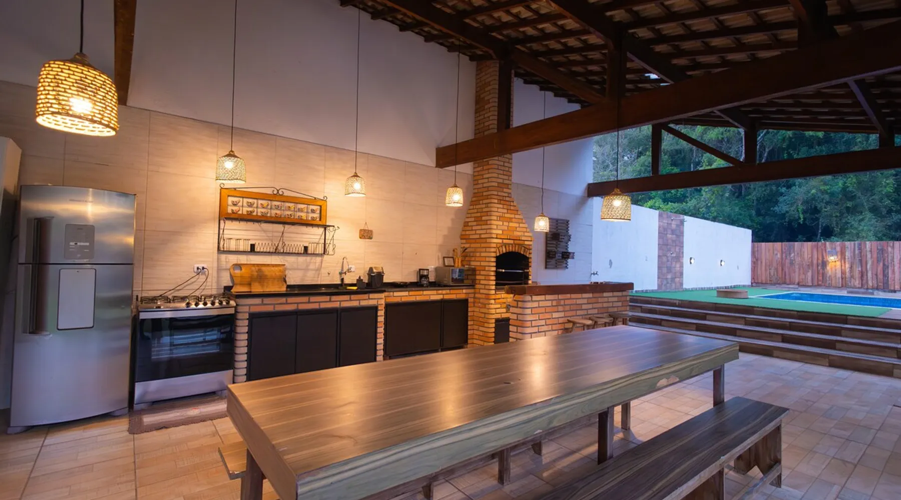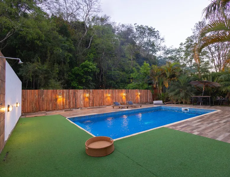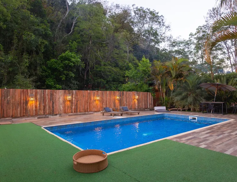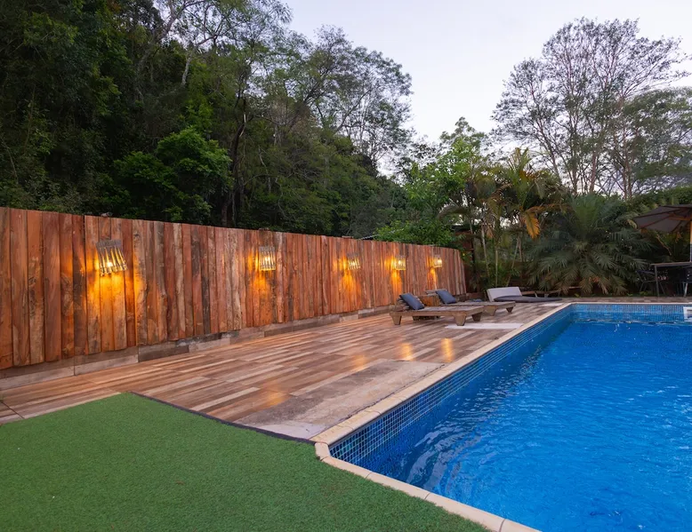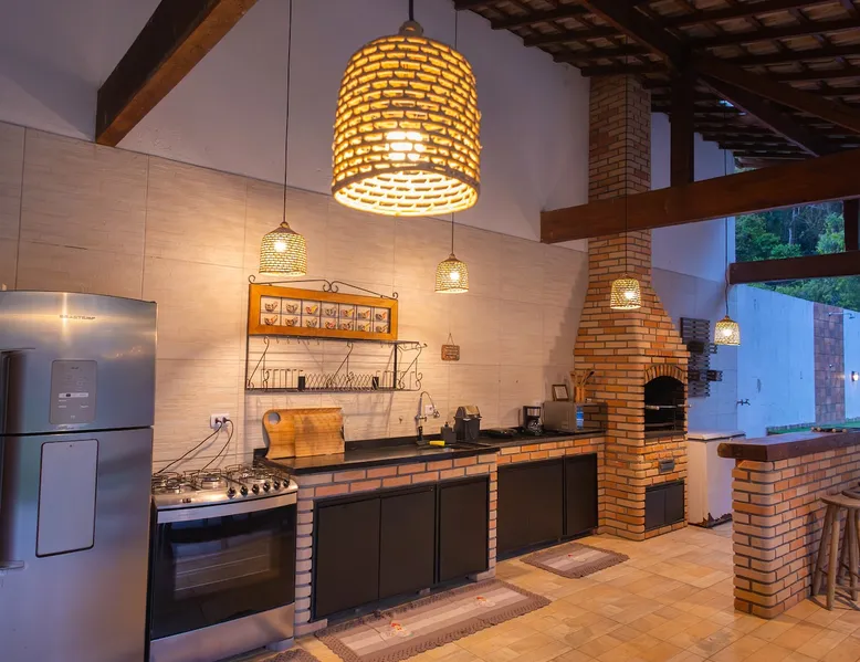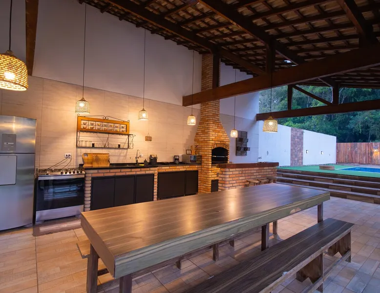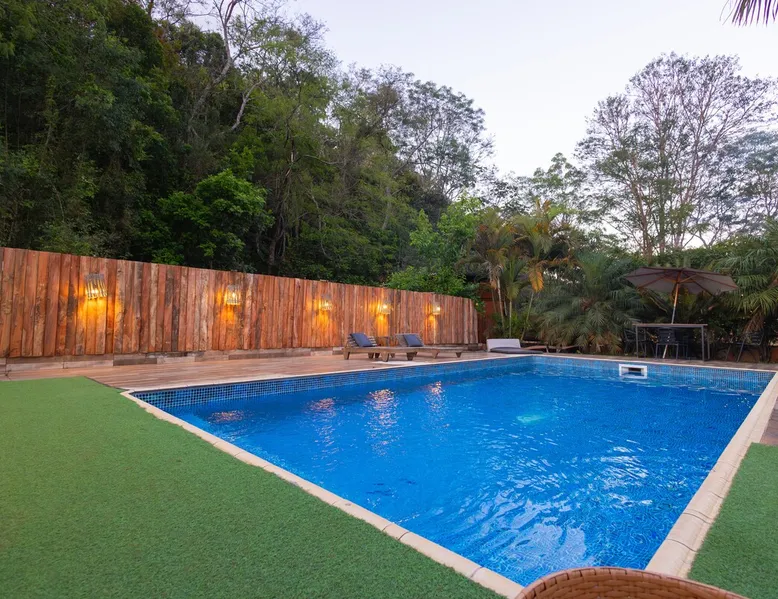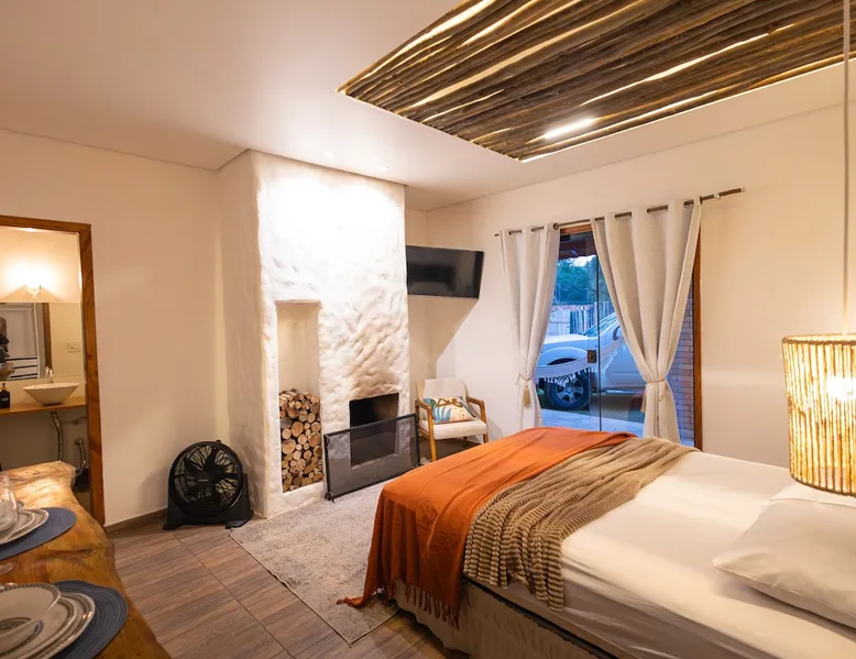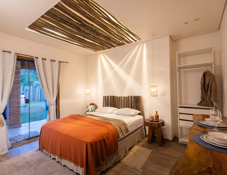 The Village Bungalow is surrounded by a lush nature and has a beautiful native forest at the back. The whole area is surrounded, ensuring privacy and solitude. The space has an exclusive swimming pool, complete gourmet area, a floor campfire and a charming outdoor cinema. Perfect for relaxing, reconnecting and living unique moments in the midst of nature. The space The Villa Bungalow is located in Vila Cabana Glass, a refuge surrounded by the exuberance of the Atlantic Forest. Each cabin and bungalow has a totally private and exclusive area, ensuring tranquility and connection with nature. Other things to note 🛏️ Services: We provide bed and bath linen (pillows, covers, towels and bathrobes) and fireplace and fireplace. ✨ Additional services: In Vila da Cabana Glass we have the Lodge Café, where we offer breakfast and fondue options, as well as a variety of snacks, pizzas, pies, desserts, soft drinks, wines, juices and teas that can be purchased and prepared for the guest on site. We also offer personalized decoration for anniversaries, dating requests, and marriage requests. For more details or special requests, send us a message and we'll share all the options.