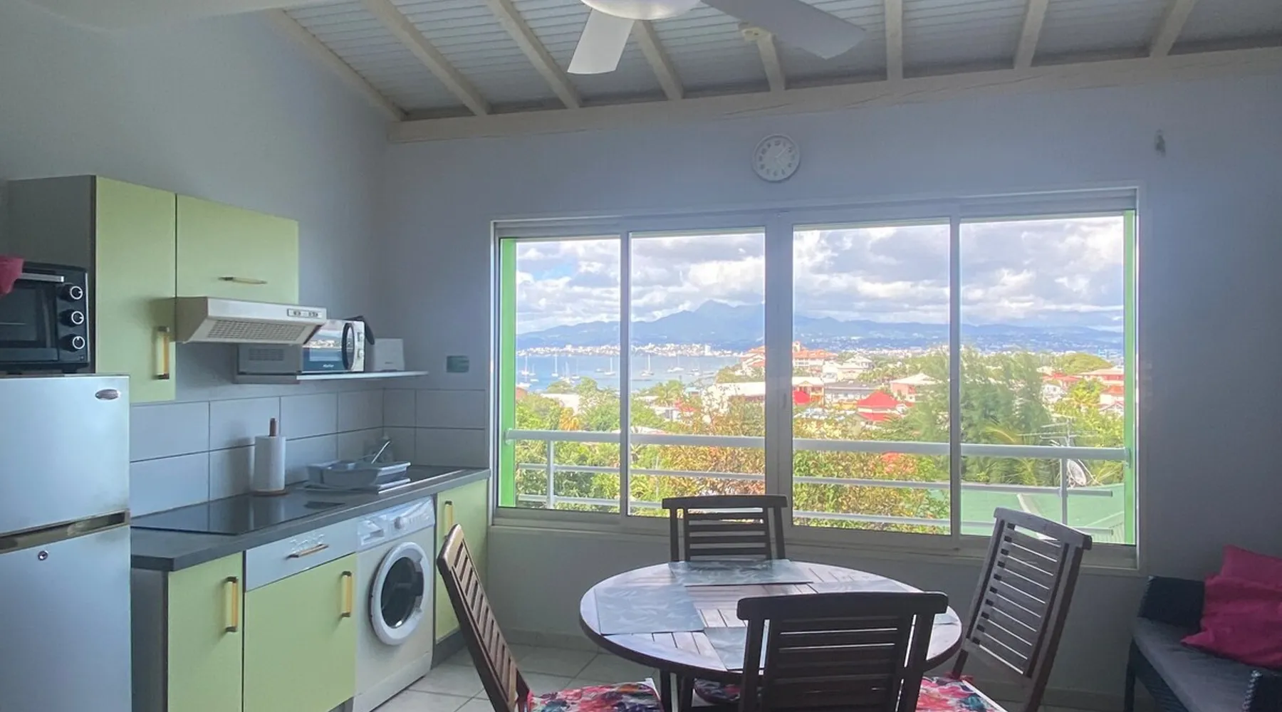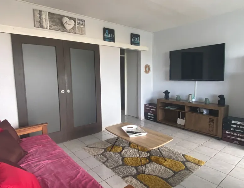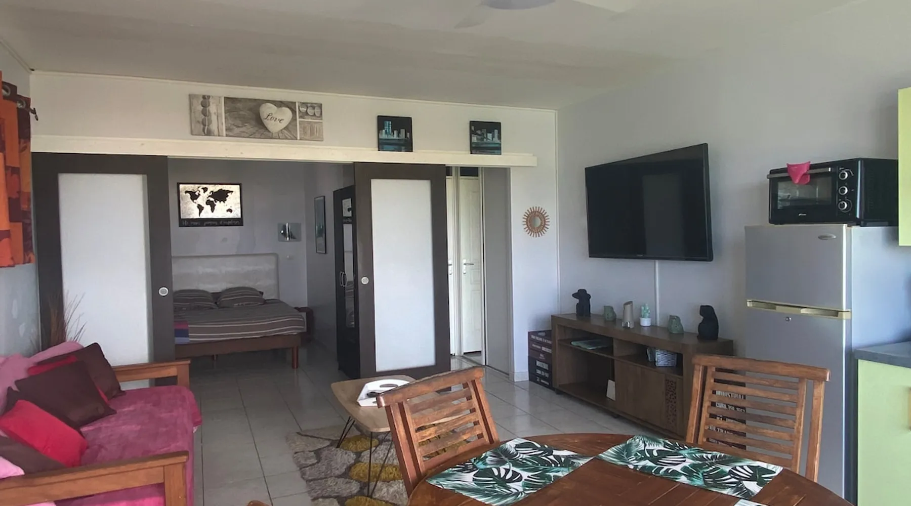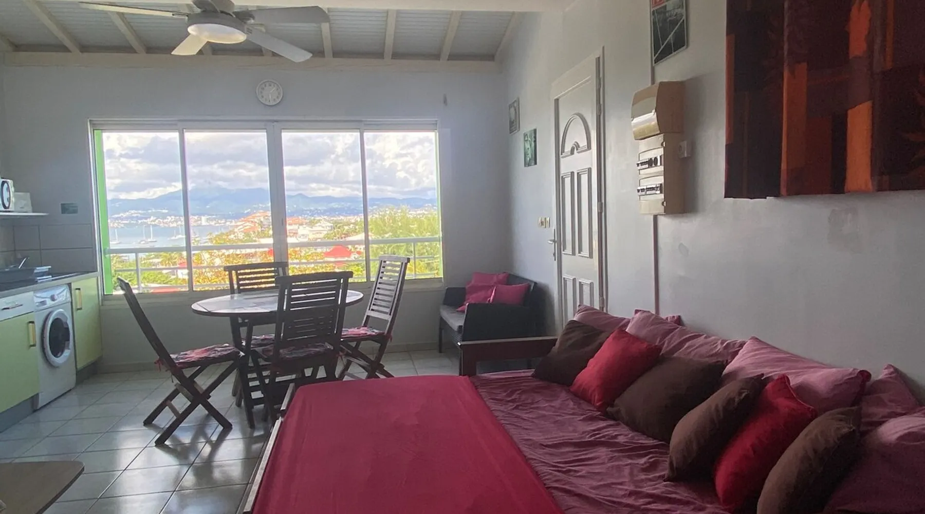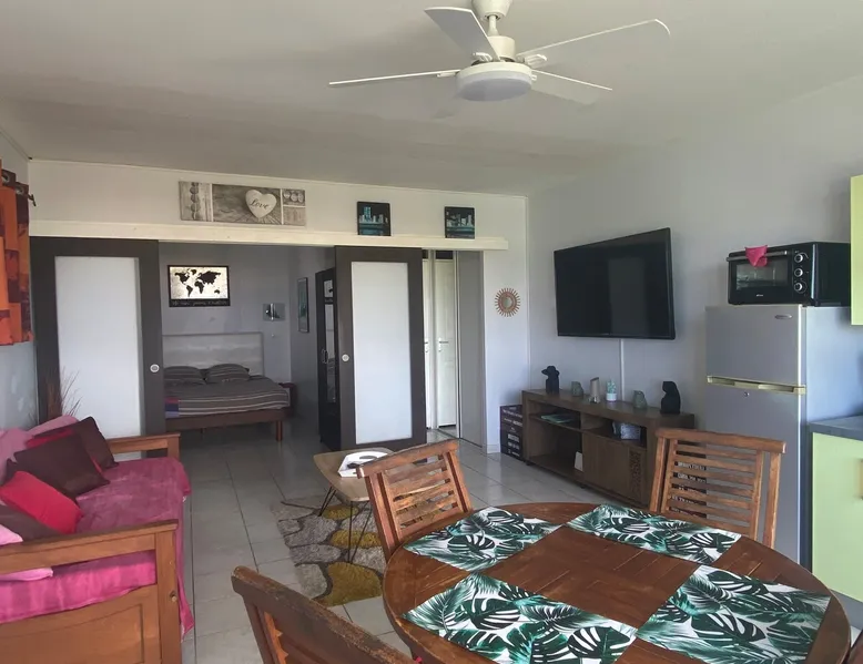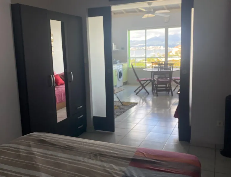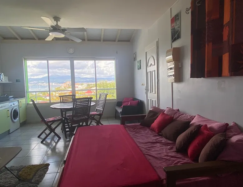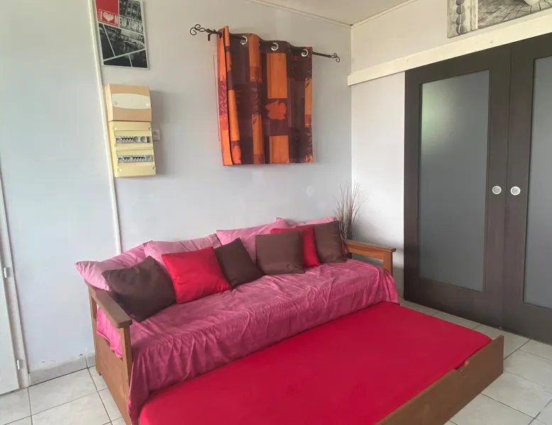2 rooms, ideally located in a residence 2 minutes walk from the beach of Anse Mitan. The apartment is composed of a large main room with its kitchen and living area, which has a sofa bed, TV and ceiling fan. A bedroom with a 160x200 bed and a bathroom with a walk-in shower, WC and a sink. In a clearance you will find a closet where is available fins, masks and snorkels (all sizes). The space Toilet towels (large, small and washcloth) and bath towels are provided