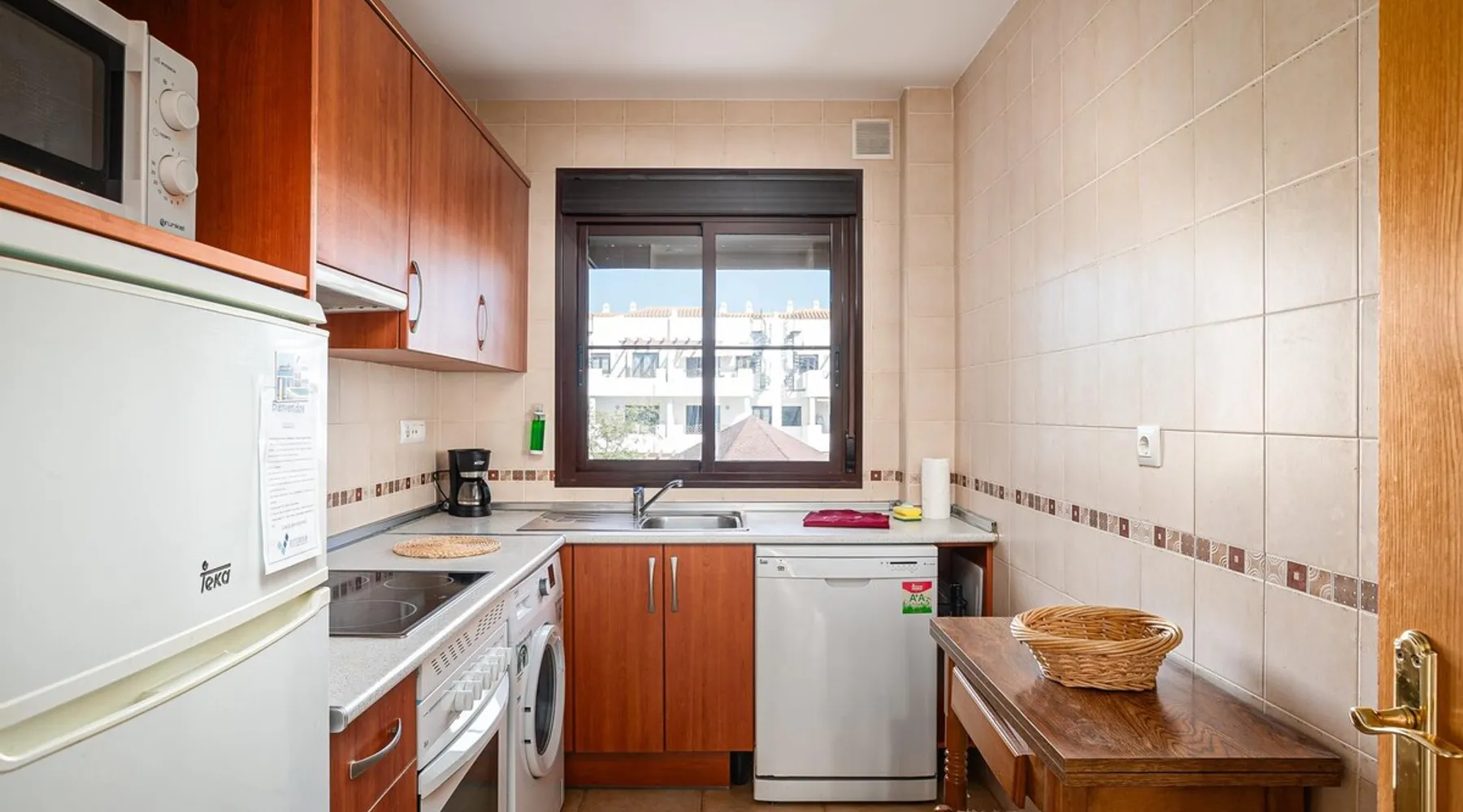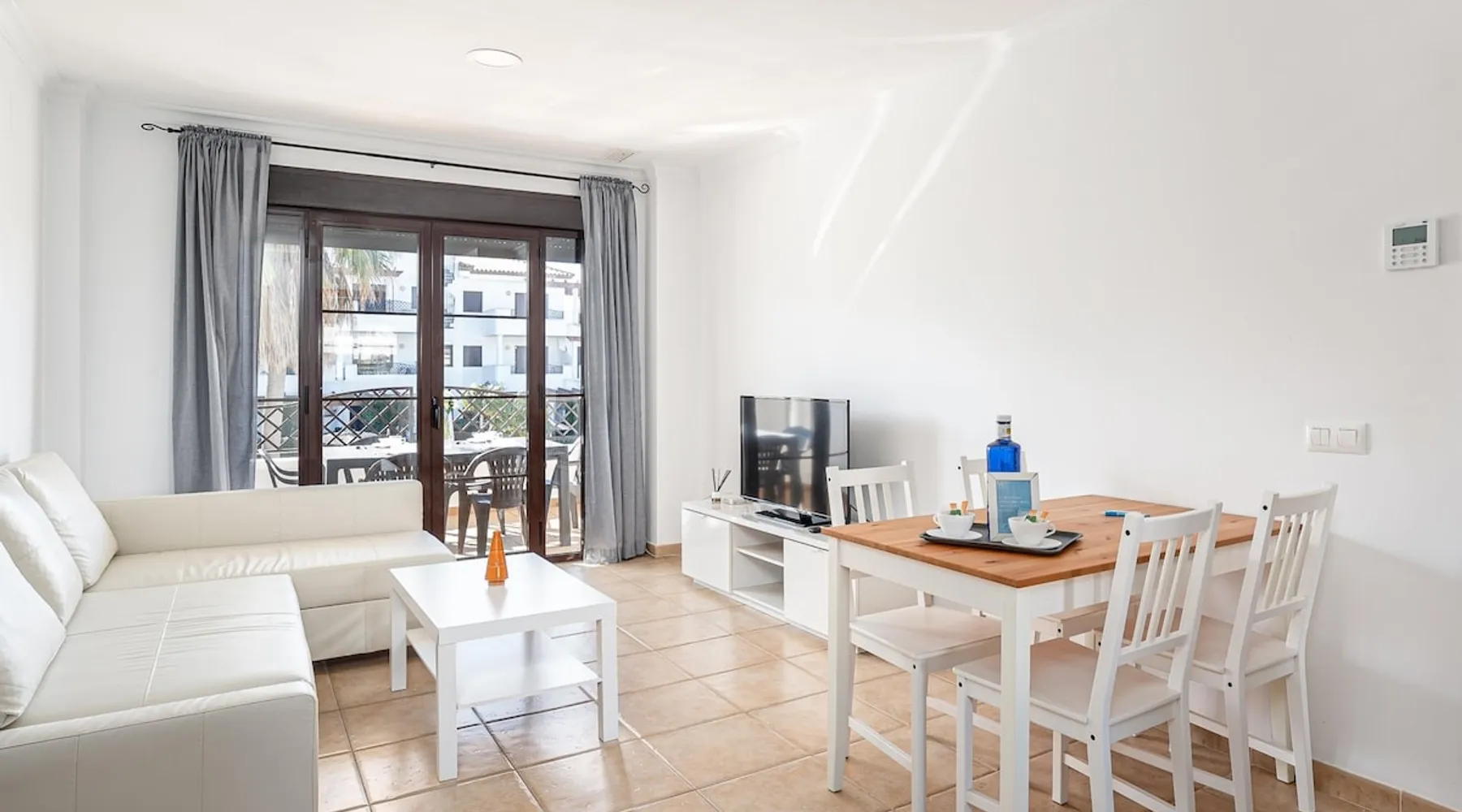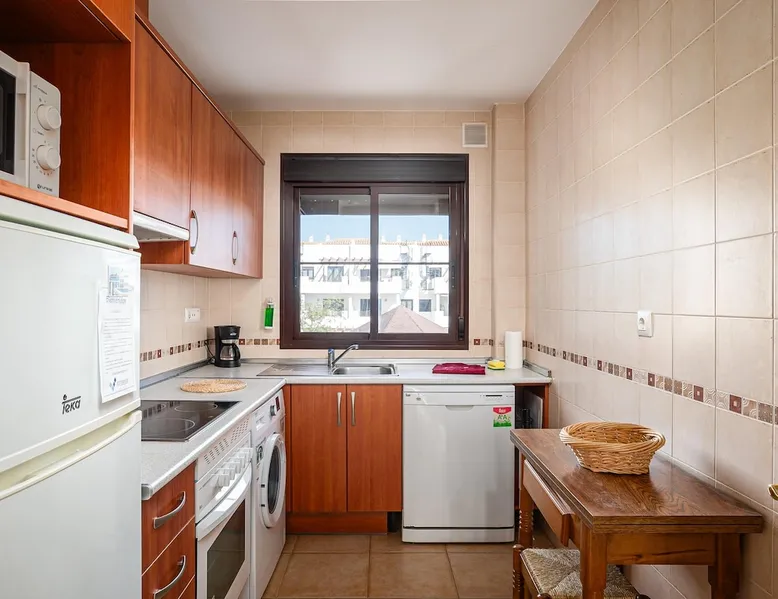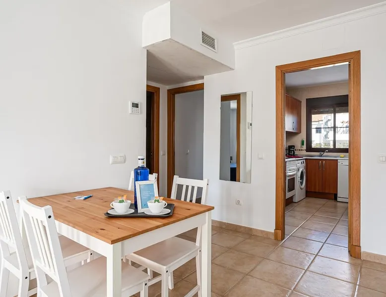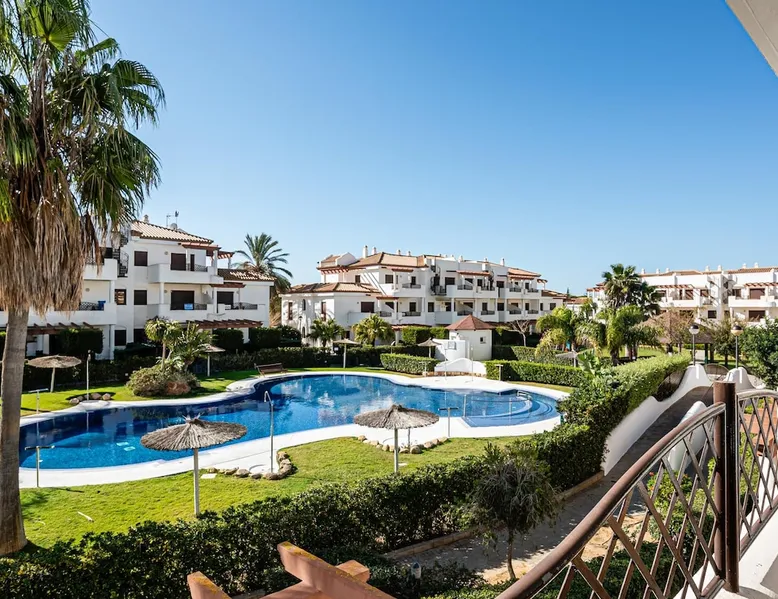 Apartment near the beach. The space This apartment, located on the first floor, offers a pleasant terrace with views from all rooms overlooking the pools and gardens of the residential complex. It has 2 comfortable bedrooms, both equipped with fitted wardrobes and high-quality viscoelastic mattresses that combine firmness and comfort. The spacious and bright living-dining room connects directly to the terrace and provides access to the upper solarium. The terrace will undoubtedly be the favorite spot for enjoying fresh air and the pleasant temperatures offered by the proximity to the sea. The independent kitchen is fully equipped and includes modern appliances such as a dishwasher. Additionally, the apartment has a complete bathroom and, exclusively, centralized air conditioning in the bedrooms and living room, ensuring comfort throughout the year. Guest access The apartment is located on the first floor, making it ideal for enjoying privacy and views, although it does not have an elevator. As part of our service, we will provide all the necessary information to ensure that access to the accommodation is comfortable and hassle-free. We are here to make your experience as pleasant as possible. Registration Details Andalucia – Regional registration number VFT/CA/08027