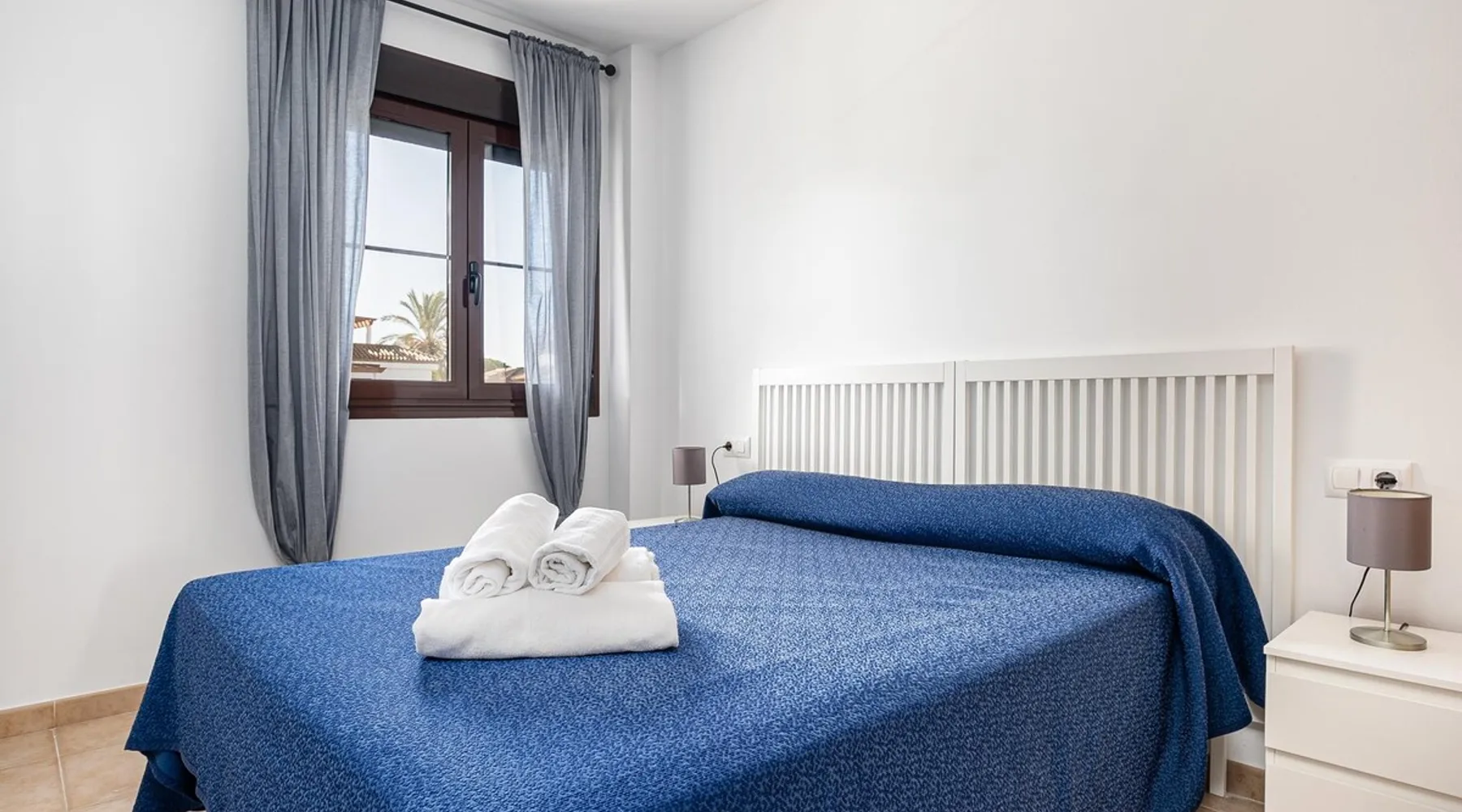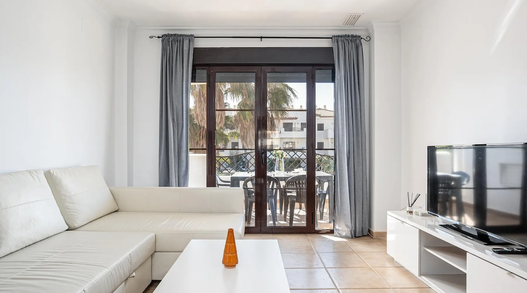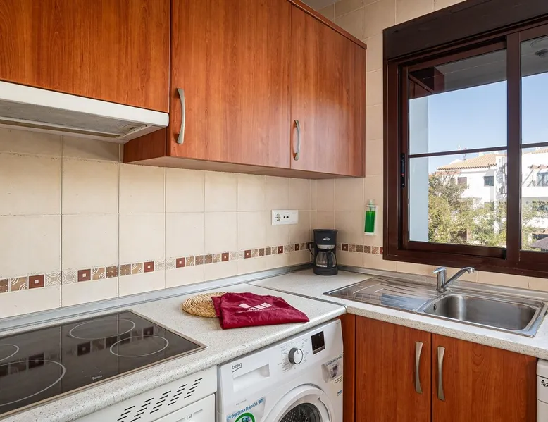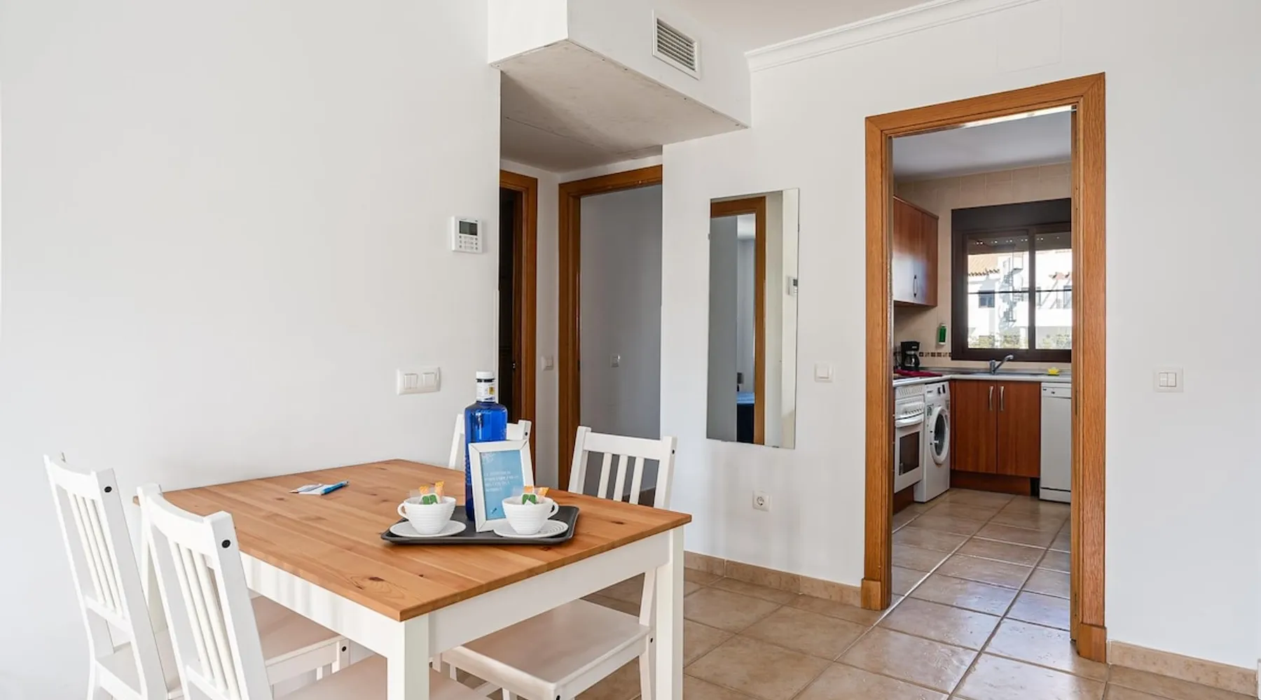 Apartment near the beach. The space This apartment, located on the first floor, offers a pleasant terrace with views from all rooms overlooking the pools and gardens of the residential complex. It has 2 comfortable bedrooms, both equipped with fitted wardrobes and high-quality viscoelastic mattresses that combine firmness and comfort. The spacious and bright living-dining room connects directly to the terrace and provides access to the upper solarium. The terrace will undoubtedly be the favorite spot for enjoying fresh air and the pleasant temperatures offered by the proximity to the sea. The independent kitchen is fully equipped and includes modern appliances such as a dishwasher. Additionally, the apartment has a complete bathroom and, exclusively, centralized air conditioning in the bedrooms and living room, ensuring comfort throughout the year. Guest access The apartment is located on the first floor, making it ideal for enjoying privacy and views, although it does not have an elevator. As part of our service, we will provide all the necessary information to ensure that access to the accommodation is comfortable and hassle-free. We are here to make your experience as pleasant as possible. Registration Details Andalucia – Regional registration number VFT/CA/08027