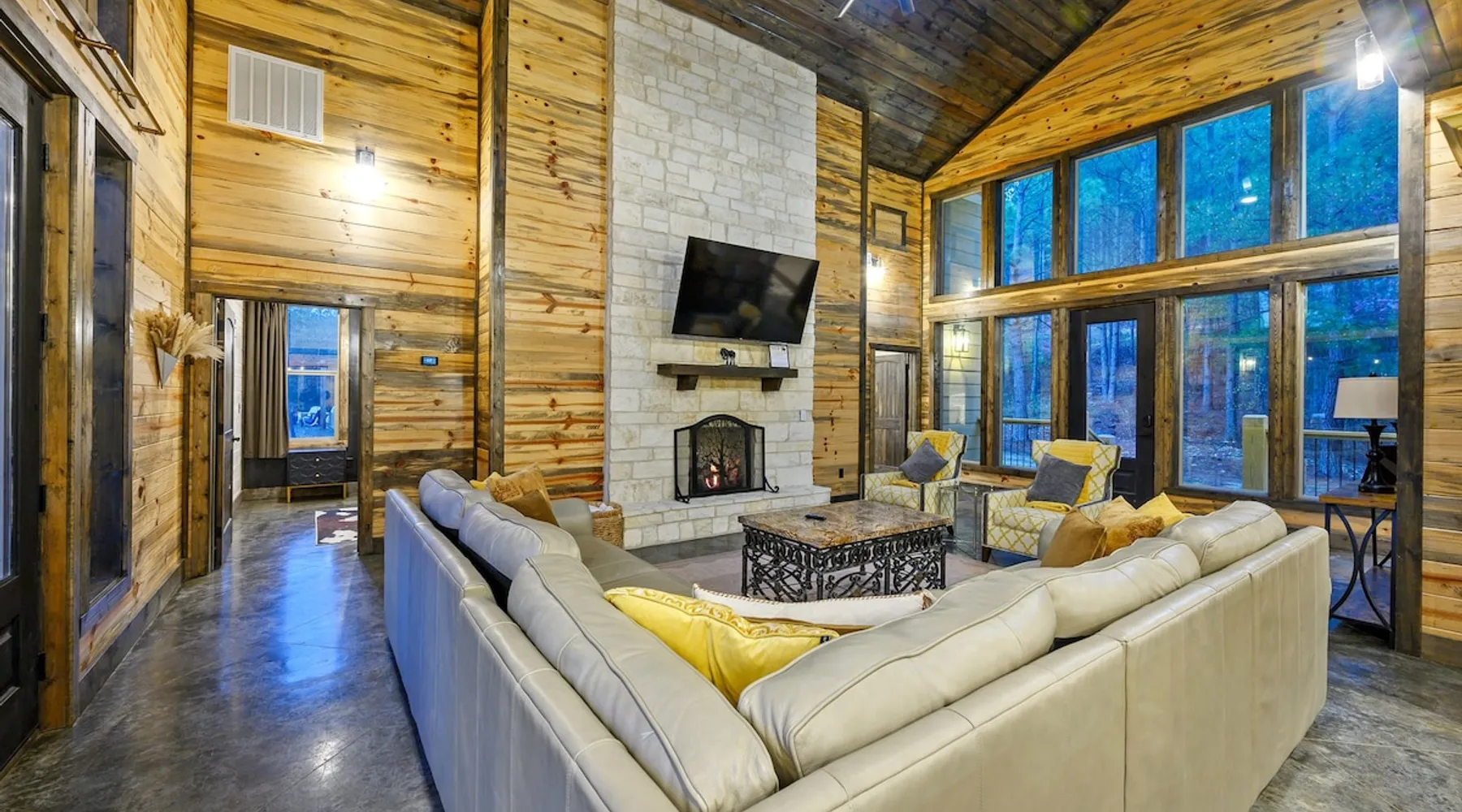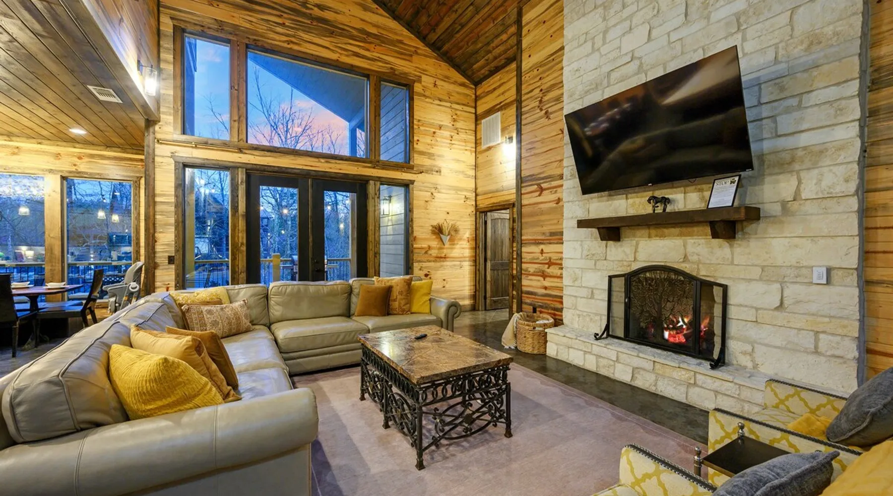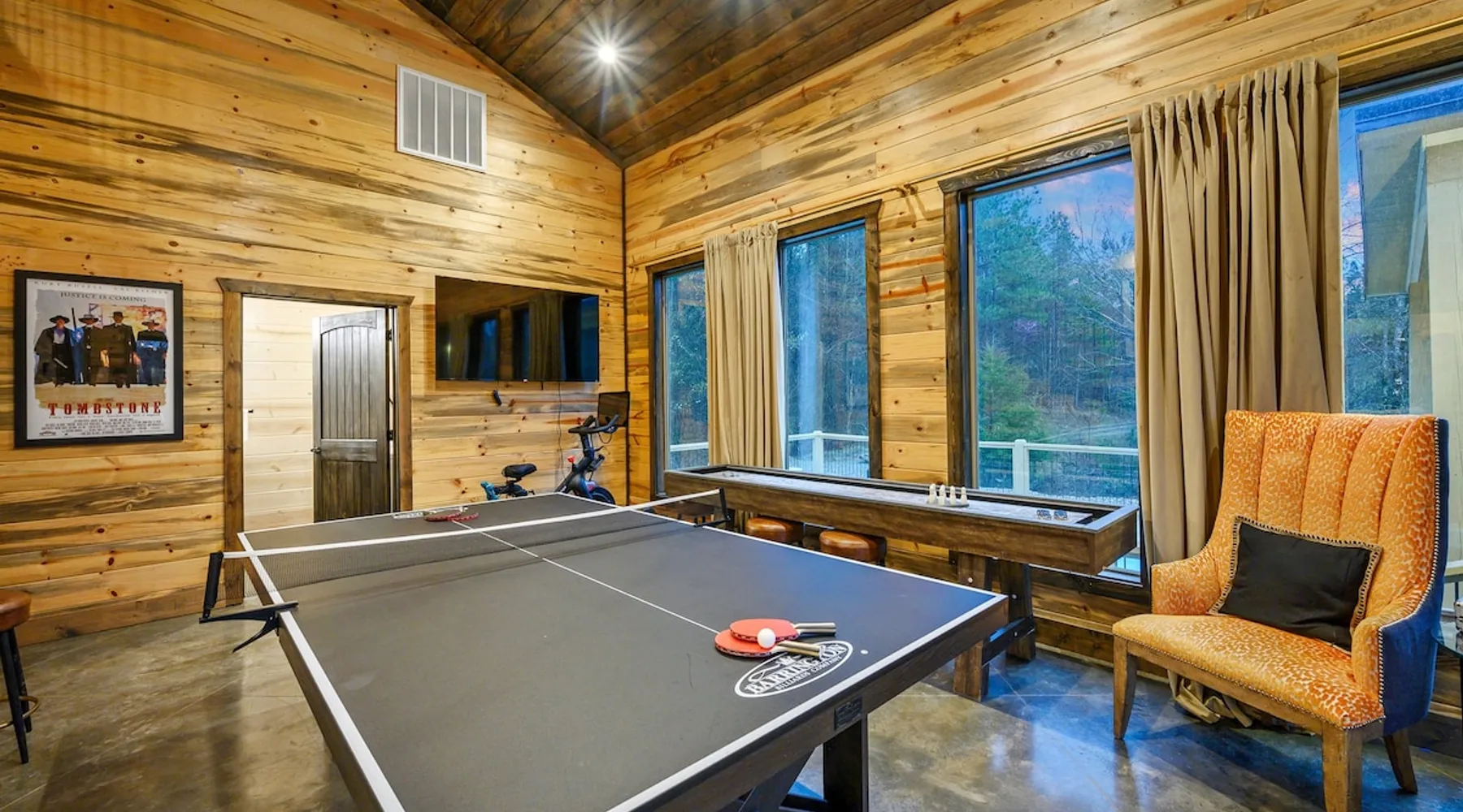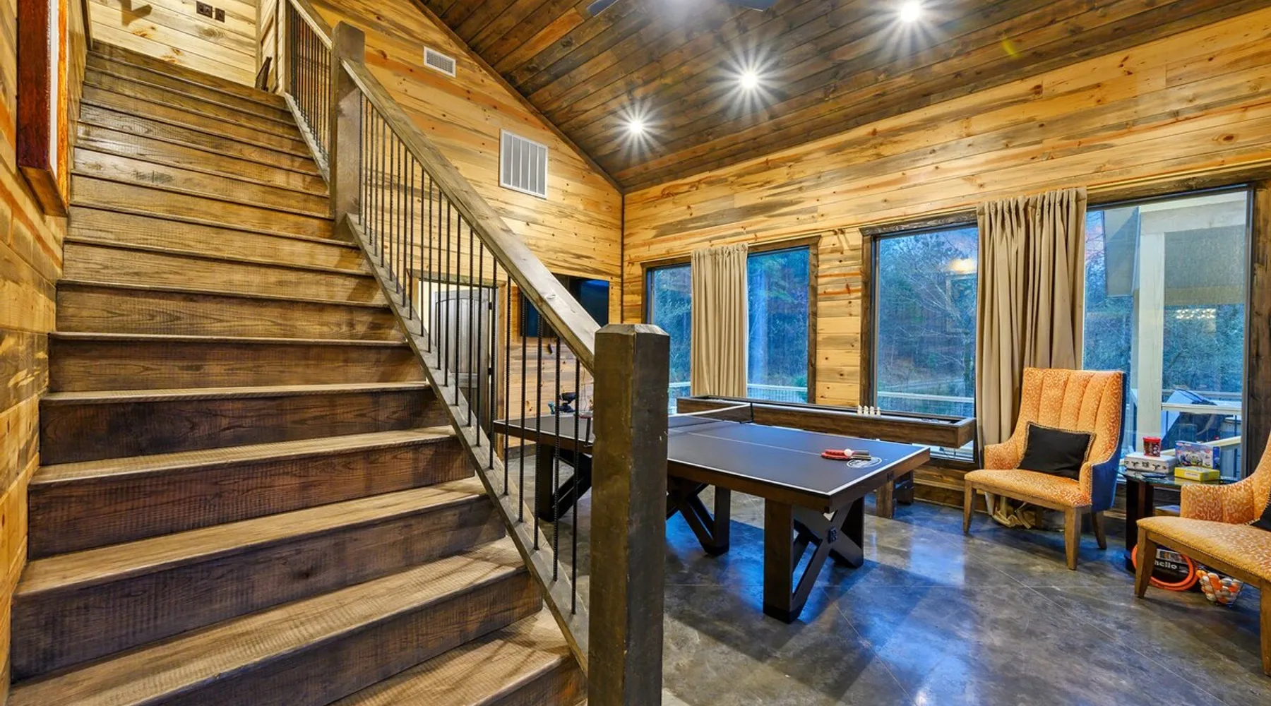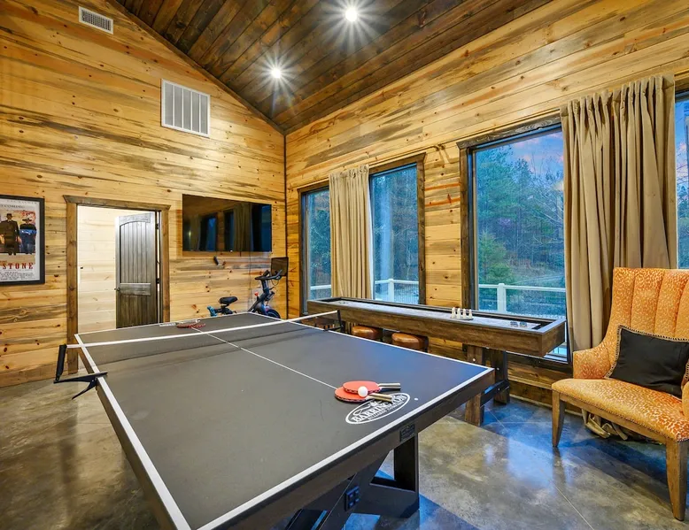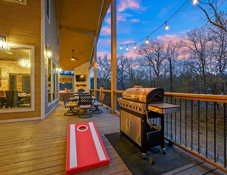 🏡 Pent Haus on the Creek Sleeps 20 | 5 Bedrooms (4 Kings + 1 Bunk Room) | 4.5 Bathrooms Pet Friendly | Pool | Game Room | Peloton | Outdoor Oasis Welcome to Pent Haus on the Creek, where luxury meets adventure in the heart of Hochatown. Whether you're soaking in the hot tub, breaking a sweat on the Peloton, or splashing in the pool (available year-round for a fee), this retreat is your go-to for making memories that are anything but ordinary. The space 🛋️ Living Room Large leather sectional & 2 accent chairs Gas fireplace for cozy nights Big-screen TV for movie marathons Throw blankets for extra comfort 🍽️ Kitchen & Dining Fully stocked kitchen with full-size appliances Keurig K-Cup + standard coffee maker Kitchen island seating for 12 Dining table seats 10 Perfect for meals, games, & laughter 🛏️ Bedrooms & Bathrooms 4 King Master Suites Two are located on the main floor and two on the second floor Each with a foot bench, nightstands, big-screen TV 3 Ensuite bathrooms: Double vanities + walk-in showers Upstairs master shares 4th bathroom with bunkroom Bunk Room 2 sets of triple-stacked full beds (sleeps 12) Large Connect Four game, bean bags, arcade console Big-screen TV = endless fun Half Bathroom Conveniently located for common area use 🎮 Game Room & Fitness Space Shuffleboard & ping pong table Peloton bike for fitness lovers Big-screen TV + board games 2 accent chairs for spectators or bookworms 🌳 Outdoor Living Heated pool Fee applies: $99/day for first 3 nights, $25/day after 48-hour notice required for heating, and must be heated for the full stay Outdoor seating + dining for 10 Gas fireplace & big-screen outdoor TV Hot tub for 6 Gas grill Firepit with seating Gaga ball pit, tetherball, playset, cornhole, & darts Year-round running creek for serene ambiance 🐾 PET FRIENDLY Up to 2 dogs allowed $125 per pet ⚡ EV Charging EV outlet available (guests to bring their own charger) 🔥 Firewood Provided 📌 General Info Full-size washer/dryer + iron & ironing board Free Wi-Fi Surveillance: Exterior cameras face entrances only, monitored at check-in for occupancy compliance Gas fireplaces available seasonally (October–May 15) Refund policy: 6% processing fee on refunds. Max occupancy: 20 guests – NO EXCEPTIONS Guest access Entire cabin is available for guest Other things to note FEATURES : • Sleeps up to 20 guests (4 king beds and 6 full bunk beds. Sleeps 14 adults -OR- 8 adults and 12 children) •Smart TV's with direct TV in all bedrooms and bunk room • Washer & dryer • Gas fireplaces on outdoor deck and in living room • Smooth top range in kitchen • Entertaining areas including a fire pit overlooking the creek • Beautiful creek situated below deck • Large outdoor hot tub drained and sanitized after each guest visit • Outdoor kitchen including gas grill • Outdoor cameras for added safety A starter supply of coffee/filters, paper towels, toilet paper, dish soap, dishwasher tablets, trash bags, bath/ hot tub towels, and laundry soap are provided, but guest may need to bring additional supplies. • FIREWORKS in the area are not allowed. • SMOKING is not allowed indoor MAXIMUM OCCUPANCY: 20 GUESTS (Please don't plan on adding other guests. Our septic tank can not accommodate this and a subs **PET FRIENDLY** - 2 dogs MAX - $125 per pet - MUST clean up after your pet. - Local Tour Guide located in each cabin It is located near all the best restaurants, activities, and park amenities. It is just a short drive to Broken Bow Lake, Beavers Bend State Park, popular hiking trails, restaurants, breweries, wineries, and downtown Hochatown, and access to all the outdoors activities you want – boating, hiking, fly-fishing, kayaking, zip-lining, ATV trails, horseback riding, Cedar Creek Golf Course, Choctaw Landing Casino, mini-golf, helicopter rides, mining for gold, train rides, go-carts, and a great petting zoo. Don’t forget these items when you come to visit: • Rain gear and light jackets (Our average rainfall is 55″-60″ each year). • We have beautiful scenic trails; good hiking boots are a must. • Water shoes for our vast shorelines and streams. • Insect repellent, sunblock, and other first-aid supplies. • Coffee and filters – enjoy this while sitting on the deck in the early morning. • Condiments --A starter supply of coffee/filters, salt/pepper, paper towels, toilet paper, bath soap, dish soap, dishwasher tablets, trash bags, and laundry soap is provided. Still, guests may need to bring additional supplies. If we are missing something or you have a question we haven't answered, please feel free to reach out to us directly at Bravo Cabin Rentals and we will personally respond as soon as possible. We look forward to making your next vacation in Broken Bow/Hochatown one you won’t forget!