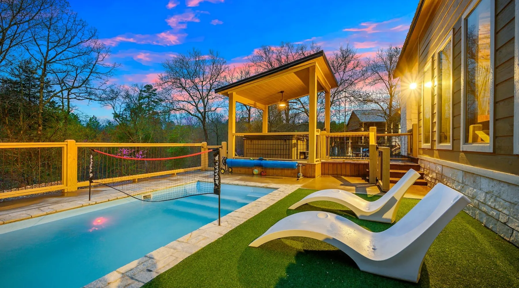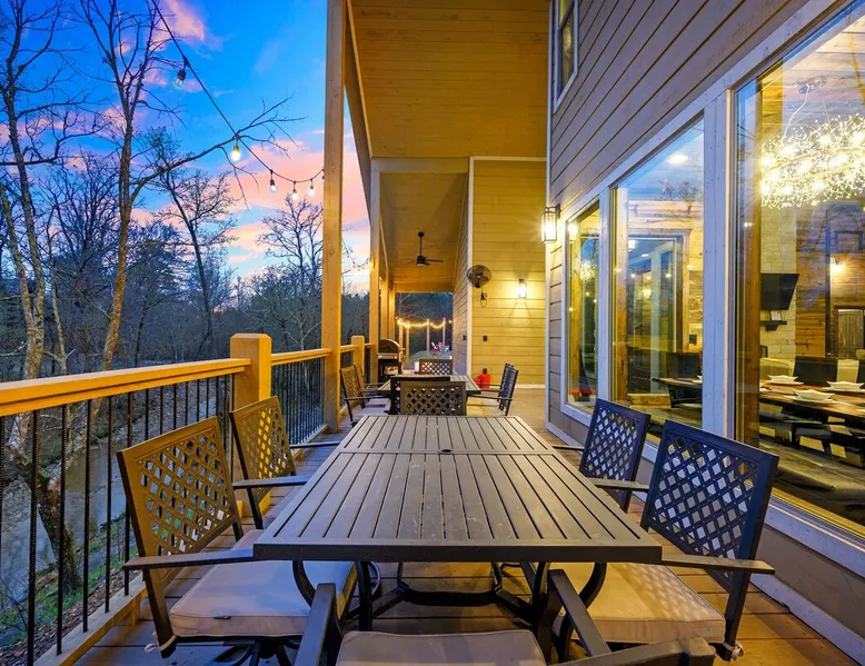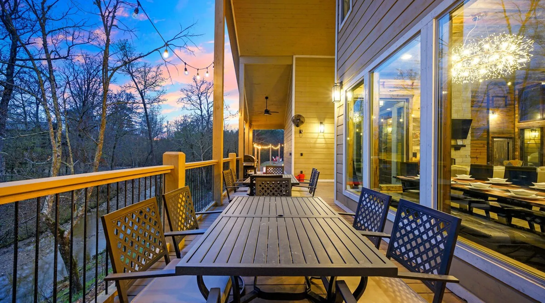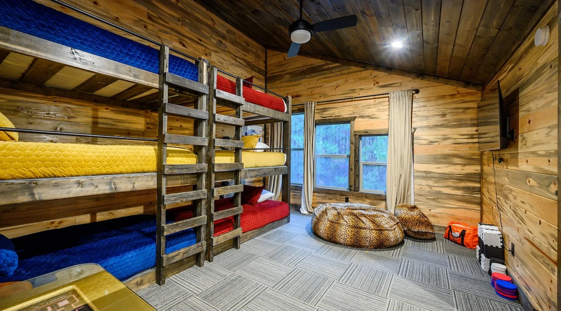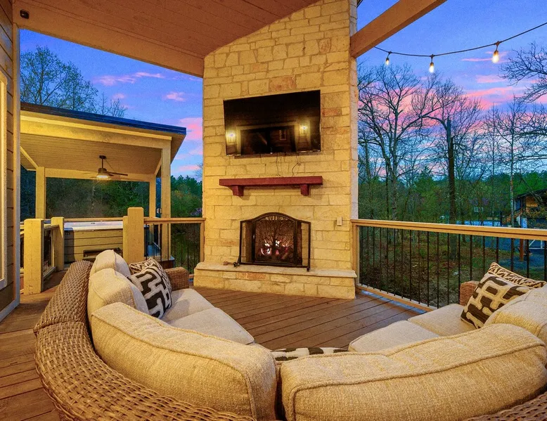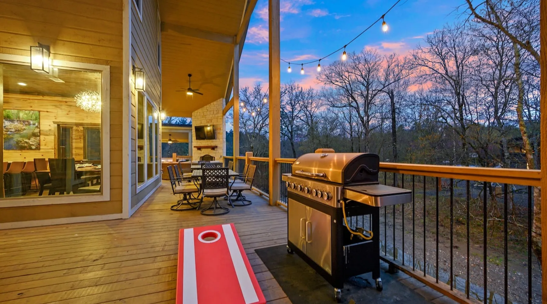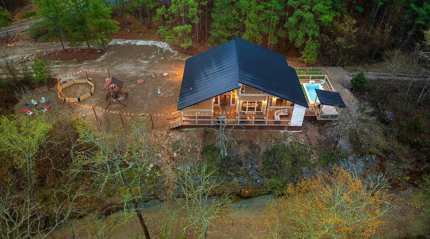 🏡 Pent Haus on the Creek Sleeps 20 | 5 Bedrooms (4 Kings + 1 Bunk Room) | 4.5 Bathrooms Pet Friendly | Pool | Game Room | Peloton | Outdoor Oasis Welcome to Pent Haus on the Creek, where luxury meets adventure in the heart of Hochatown. Whether you're soaking in the hot tub, breaking a sweat on the Peloton, or splashing in the pool (available year-round for a fee), this retreat is your go-to for making memories that are anything but ordinary. The space 🛋️ Living Room Large leather sectional & 2 accent chairs Gas fireplace for cozy nights Big-screen TV for movie marathons Throw blankets for extra comfort 🍽️ Kitchen & Dining Fully stocked kitchen with full-size appliances Keurig K-Cup + standard coffee maker Kitchen island seating for 12 Dining table seats 10 Perfect for meals, games, & laughter 🛏️ Bedrooms & Bathrooms 4 King Master Suites Two are located on the main floor and two on the second floor Each with a foot bench, nightstands, big-screen TV 3 Ensuite bathrooms: Double vanities + walk-in showers Upstairs master shares 4th bathroom with bunkroom Bunk Room 2 sets of triple-stacked full beds (sleeps 12) Large Connect Four game, bean bags, arcade console Big-screen TV = endless fun Half Bathroom Conveniently located for common area use 🎮 Game Room & Fitness Space Shuffleboard & ping pong table Peloton bike for fitness lovers Big-screen TV + board games 2 accent chairs for spectators or bookworms 🌳 Outdoor Living Heated pool Fee applies: $99/day for first 3 nights, $25/day after 48-hour notice required for heating, and must be heated for the full stay Outdoor seating + dining for 10 Gas fireplace & big-screen outdoor TV Hot tub for 6 Gas grill Firepit with seating Gaga ball pit, tetherball, playset, cornhole, & darts Year-round running creek for serene ambiance 🐾 PET FRIENDLY Up to 2 dogs allowed $125 per pet ⚡ EV Charging EV outlet available (guests to bring their own charger) 🔥 Firewood Provided 📌 General Info Full-size washer/dryer + iron & ironing board Free Wi-Fi Surveillance: Exterior cameras face entrances only, monitored at check-in for occupancy compliance Gas fireplaces available seasonally (October–May 15) Refund policy: 6% processing fee on refunds. Max occupancy: 20 guests – NO EXCEPTIONS Guest access Entire cabin is available for guest Other things to note FEATURES : • Sleeps up to 20 guests (4 king beds and 6 full bunk beds. Sleeps 14 adults -OR- 8 adults and 12 children) •Smart TV's with direct TV in all bedrooms and bunk room • Washer & dryer • Gas fireplaces on outdoor deck and in living room • Smooth top range in kitchen • Entertaining areas including a fire pit overlooking the creek • Beautiful creek situated below deck • Large outdoor hot tub drained and sanitized after each guest visit • Outdoor kitchen including gas grill • Outdoor cameras for added safety A starter supply of coffee/filters, paper towels, toilet paper, dish soap, dishwasher tablets, trash bags, bath/ hot tub towels, and laundry soap are provided, but guest may need to bring additional supplies. • FIREWORKS in the area are not allowed. • SMOKING is not allowed indoor MAXIMUM OCCUPANCY: 20 GUESTS (Please don't plan on adding other guests. Our septic tank can not accommodate this and a subs **PET FRIENDLY** - 2 dogs MAX - $125 per pet - MUST clean up after your pet. - Local Tour Guide located in each cabin It is located near all the best restaurants, activities, and park amenities. It is just a short drive to Broken Bow Lake, Beavers Bend State Park, popular hiking trails, restaurants, breweries, wineries, and downtown Hochatown, and access to all the outdoors activities you want – boating, hiking, fly-fishing, kayaking, zip-lining, ATV trails, horseback riding, Cedar Creek Golf Course, Choctaw Landing Casino, mini-golf, helicopter rides, mining for gold, train rides, go-carts, and a great petting zoo. Don’t forget these items when you come to visit: • Rain gear and light jackets (Our average rainfall is 55″-60″ each year). • We have beautiful scenic trails; good hiking boots are a must. • Water shoes for our vast shorelines and streams. • Insect repellent, sunblock, and other first-aid supplies. • Coffee and filters – enjoy this while sitting on the deck in the early morning. • Condiments --A starter supply of coffee/filters, salt/pepper, paper towels, toilet paper, bath soap, dish soap, dishwasher tablets, trash bags, and laundry soap is provided. Still, guests may need to bring additional supplies. If we are missing something or you have a question we haven't answered, please feel free to reach out to us directly at Bravo Cabin Rentals and we will personally respond as soon as possible. We look forward to making your next vacation in Broken Bow/Hochatown one you won’t forget!