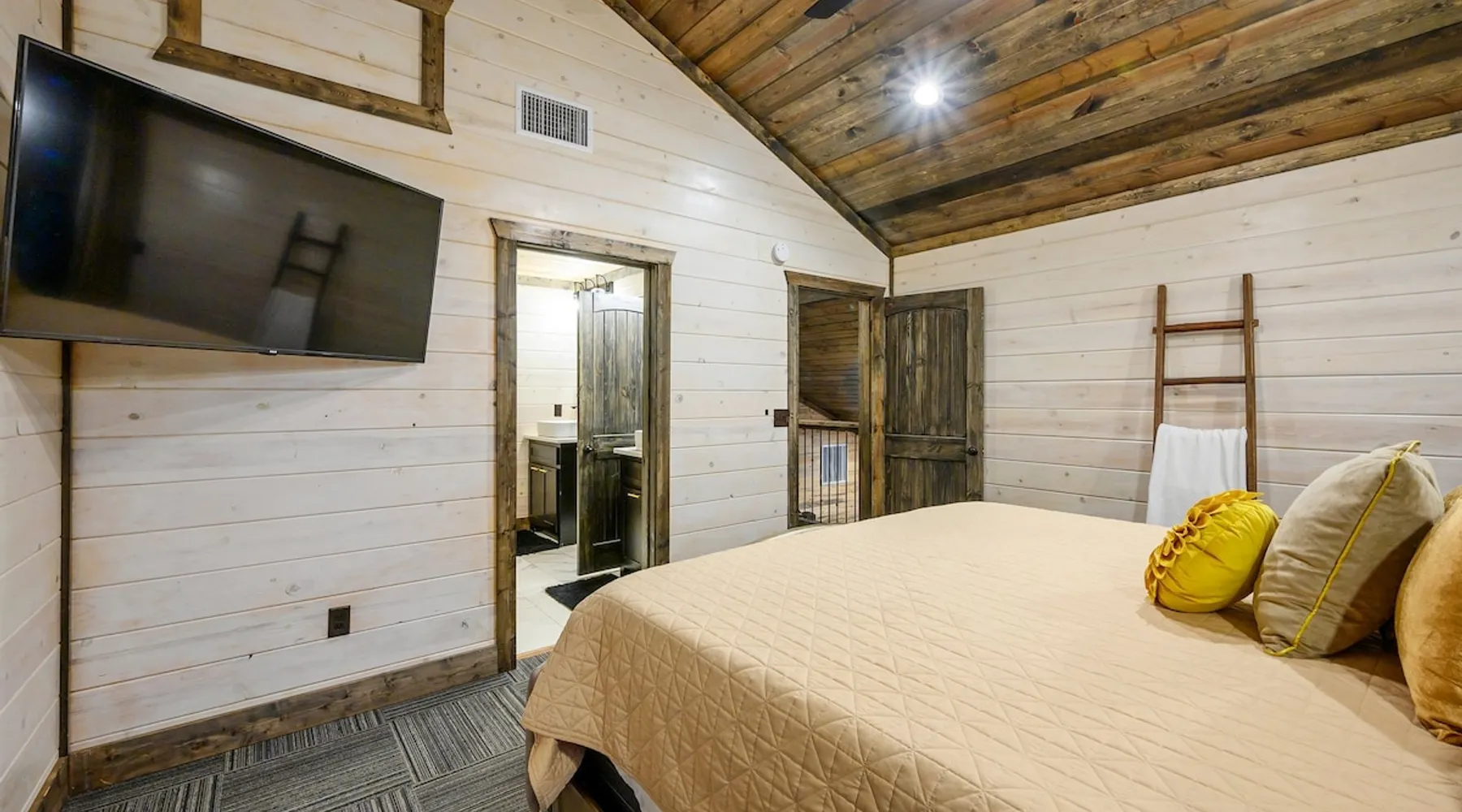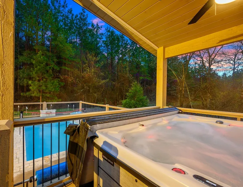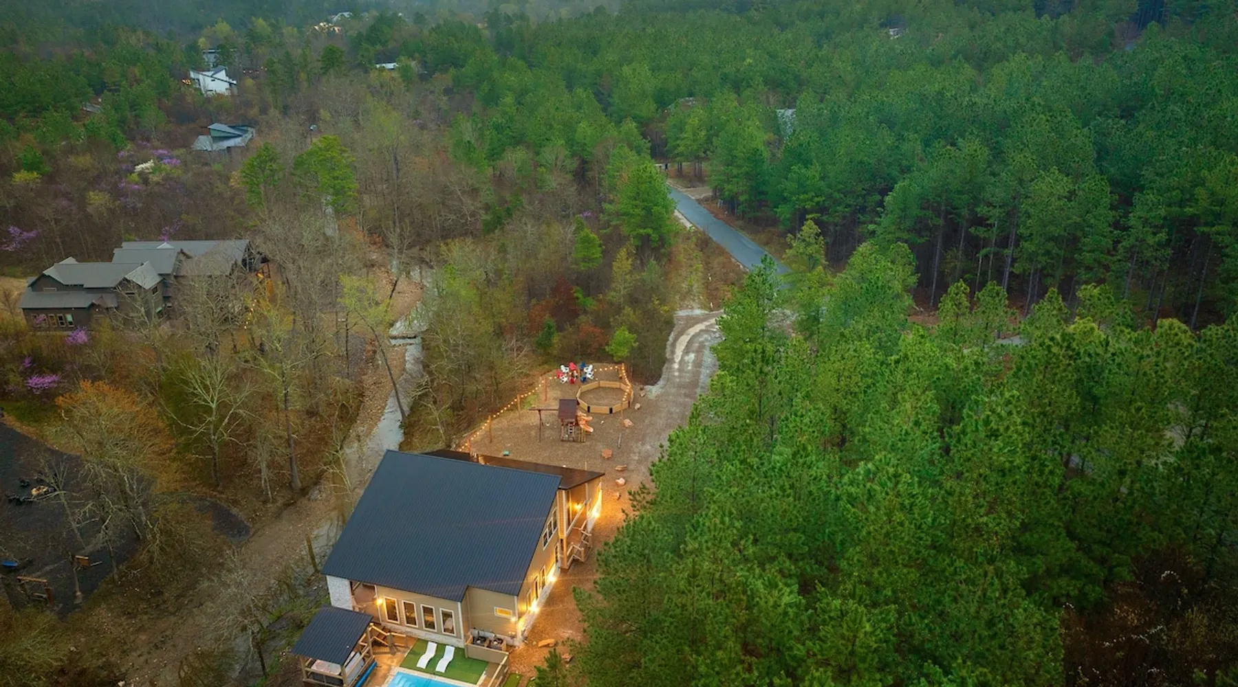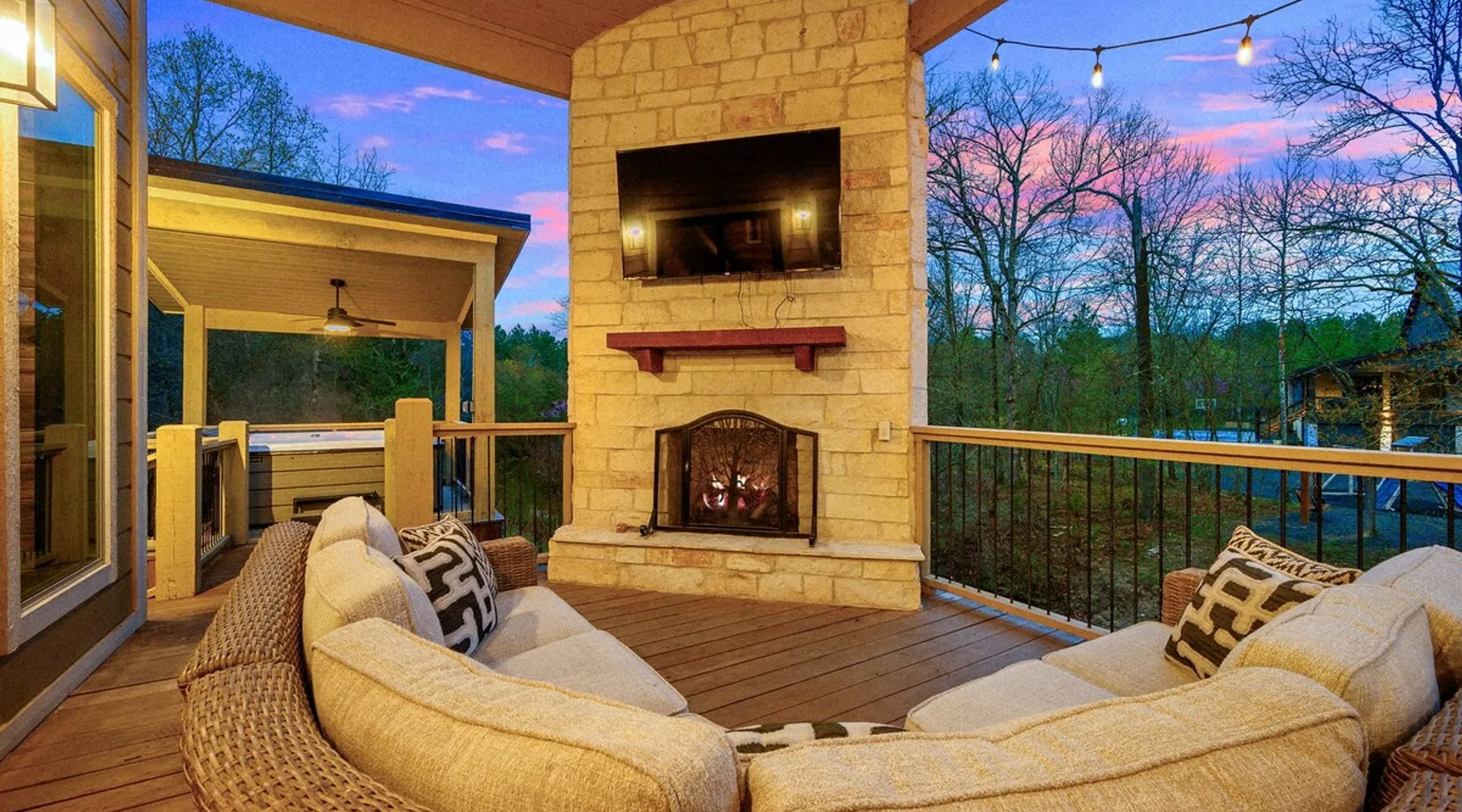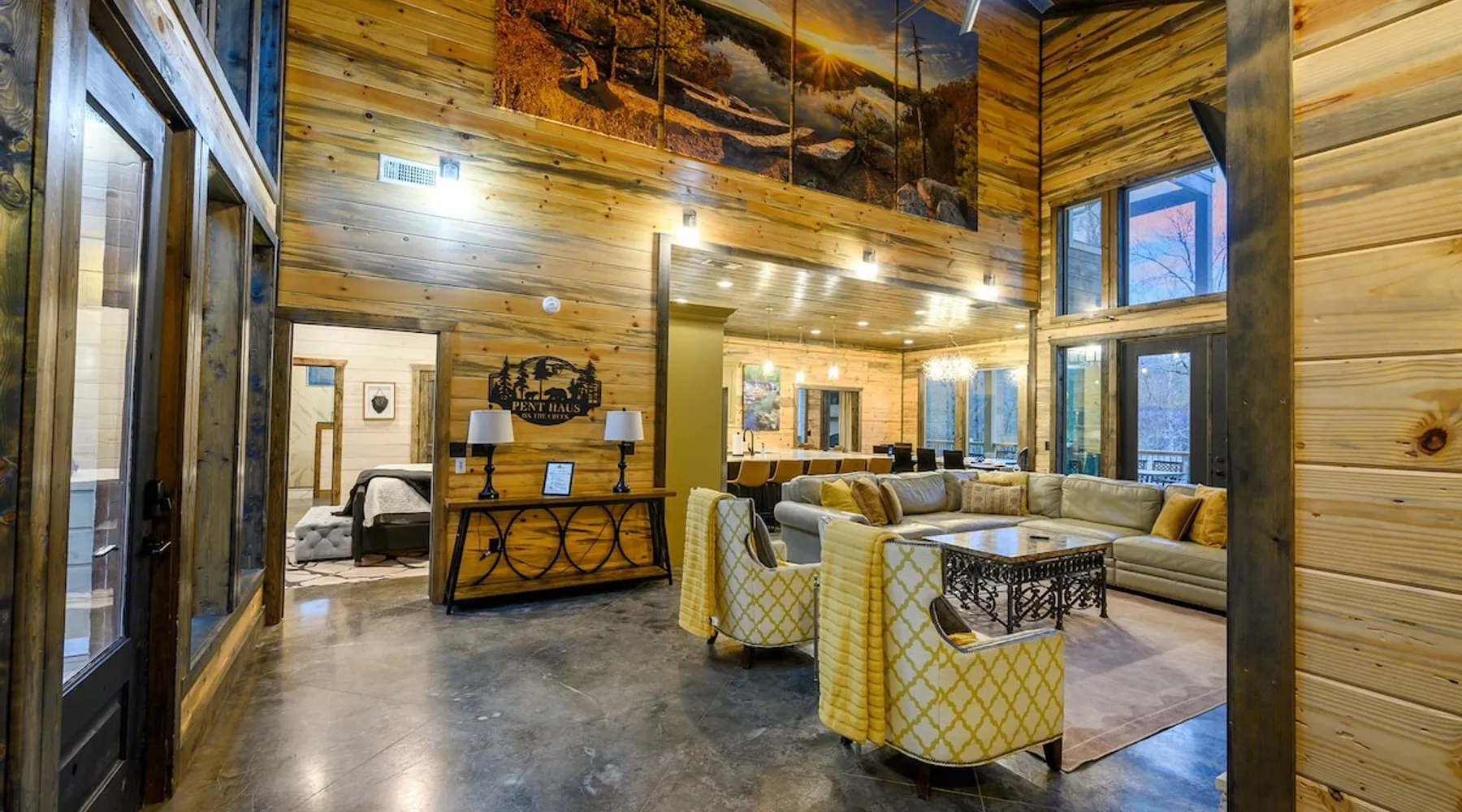 🏡 Pent Haus on the Creek Sleeps 20 | 5 Bedrooms (4 Kings + 1 Bunk Room) | 4.5 Bathrooms Pet Friendly | Pool | Game Room | Peloton | Outdoor Oasis Welcome to Pent Haus on the Creek, where luxury meets adventure in the heart of Hochatown. Whether you're soaking in the hot tub, breaking a sweat on the Peloton, or splashing in the pool (available year-round for a fee), this retreat is your go-to for making memories that are anything but ordinary. The space 🛋️ Living Room Large leather sectional & 2 accent chairs Gas fireplace for cozy nights Big-screen TV for movie marathons Throw blankets for extra comfort 🍽️ Kitchen & Dining Fully stocked kitchen with full-size appliances Keurig K-Cup + standard coffee maker Kitchen island seating for 12 Dining table seats 10 Perfect for meals, games, & laughter 🛏️ Bedrooms & Bathrooms 4 King Master Suites Two are located on the main floor and two on the second floor Each with a foot bench, nightstands, big-screen TV 3 Ensuite bathrooms: Double vanities + walk-in showers Upstairs master shares 4th bathroom with bunkroom Bunk Room 2 sets of triple-stacked full beds (sleeps 12) Large Connect Four game, bean bags, arcade console Big-screen TV = endless fun Half Bathroom Conveniently located for common area use 🎮 Game Room & Fitness Space Shuffleboard & ping pong table Peloton bike for fitness lovers Big-screen TV + board games 2 accent chairs for spectators or bookworms 🌳 Outdoor Living Heated pool Fee applies: $99/day for first 3 nights, $25/day after 48-hour notice required for heating, and must be heated for the full stay Outdoor seating + dining for 10 Gas fireplace & big-screen outdoor TV Hot tub for 6 Gas grill Firepit with seating Gaga ball pit, tetherball, playset, cornhole, & darts Year-round running creek for serene ambiance 🐾 PET FRIENDLY Up to 2 dogs allowed $125 per pet ⚡ EV Charging EV outlet available (guests to bring their own charger) 🔥 Firewood Provided 📌 General Info Full-size washer/dryer + iron & ironing board Free Wi-Fi Surveillance: Exterior cameras face entrances only, monitored at check-in for occupancy compliance Gas fireplaces available seasonally (October–May 15) Refund policy: 6% processing fee on refunds. Max occupancy: 20 guests – NO EXCEPTIONS Guest access Entire cabin is available for guest Other things to note FEATURES : • Sleeps up to 20 guests (4 king beds and 6 full bunk beds. Sleeps 14 adults -OR- 8 adults and 12 children) •Smart TV's with direct TV in all bedrooms and bunk room • Washer & dryer • Gas fireplaces on outdoor deck and in living room • Smooth top range in kitchen • Entertaining areas including a fire pit overlooking the creek • Beautiful creek situated below deck • Large outdoor hot tub drained and sanitized after each guest visit • Outdoor kitchen including gas grill • Outdoor cameras for added safety A starter supply of coffee/filters, paper towels, toilet paper, dish soap, dishwasher tablets, trash bags, bath/ hot tub towels, and laundry soap are provided, but guest may need to bring additional supplies. • FIREWORKS in the area are not allowed. • SMOKING is not allowed indoor MAXIMUM OCCUPANCY: 20 GUESTS (Please don't plan on adding other guests. Our septic tank can not accommodate this and a subs **PET FRIENDLY** - 2 dogs MAX - $125 per pet - MUST clean up after your pet. - Local Tour Guide located in each cabin It is located near all the best restaurants, activities, and park amenities. It is just a short drive to Broken Bow Lake, Beavers Bend State Park, popular hiking trails, restaurants, breweries, wineries, and downtown Hochatown, and access to all the outdoors activities you want – boating, hiking, fly-fishing, kayaking, zip-lining, ATV trails, horseback riding, Cedar Creek Golf Course, Choctaw Landing Casino, mini-golf, helicopter rides, mining for gold, train rides, go-carts, and a great petting zoo. Don’t forget these items when you come to visit: • Rain gear and light jackets (Our average rainfall is 55″-60″ each year). • We have beautiful scenic trails; good hiking boots are a must. • Water shoes for our vast shorelines and streams. • Insect repellent, sunblock, and other first-aid supplies. • Coffee and filters – enjoy this while sitting on the deck in the early morning. • Condiments --A starter supply of coffee/filters, salt/pepper, paper towels, toilet paper, bath soap, dish soap, dishwasher tablets, trash bags, and laundry soap is provided. Still, guests may need to bring additional supplies. If we are missing something or you have a question we haven't answered, please feel free to reach out to us directly at Bravo Cabin Rentals and we will personally respond as soon as possible. We look forward to making your next vacation in Broken Bow/Hochatown one you won’t forget!