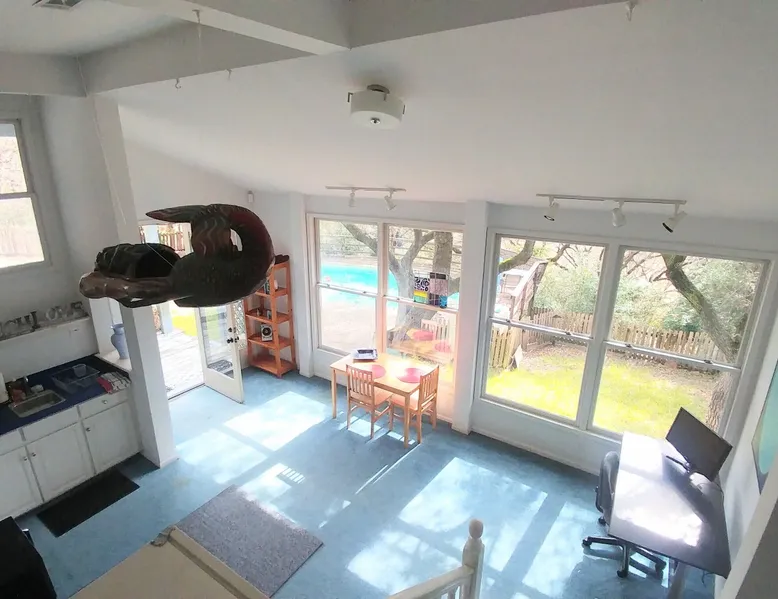 31 days or longer stays. Furnished, all bills paid including high speed internet. Spacious studio perfect for ONE person to work from home, transition to Austin, or corporate relocation. Vaulted ceiling, lots of natural light, wonderful views through large windows, work table for laptop (monitor provided), full kitchenette, 54" TV set up with Roku to stream your favorites, full bathroom and lots of built in storage. The studio backs up to a greenbelt and is very quiet and private, like living in a nature preserve. You will see deer and squirrels everyday, bunnies, armadillos and an occasional fox. The apartment is below our house with a separate gate and entrance. There are steps and a stairway that separate your studio from the street. You share the extensive backyard and pool with us. We are low keyed, quiet types, working remotely and have a friendly inside dog who visits the yard. The neighborhood is very safe and great for walking or biking. There are several nature trails nearby including Great Hills Park and Bull Creek Park. Shopping complexes at the Arboretum, Domain and 183 are just a few blocks away. Conveniently located near large employers like Apple, VRBO and Indeed. No smoking, no pets, or parties. Interested in a longer stay? Please contact us to match up. We will respond quickly.