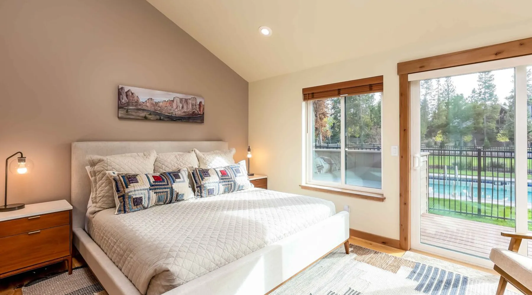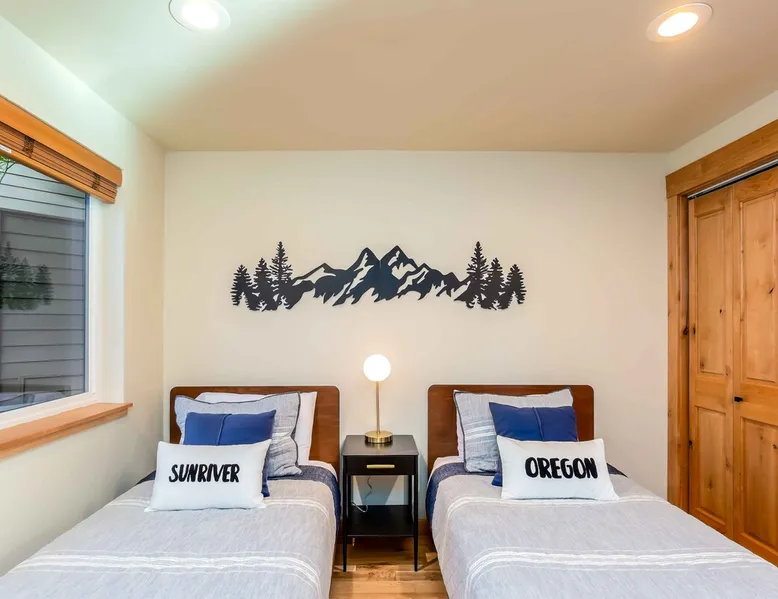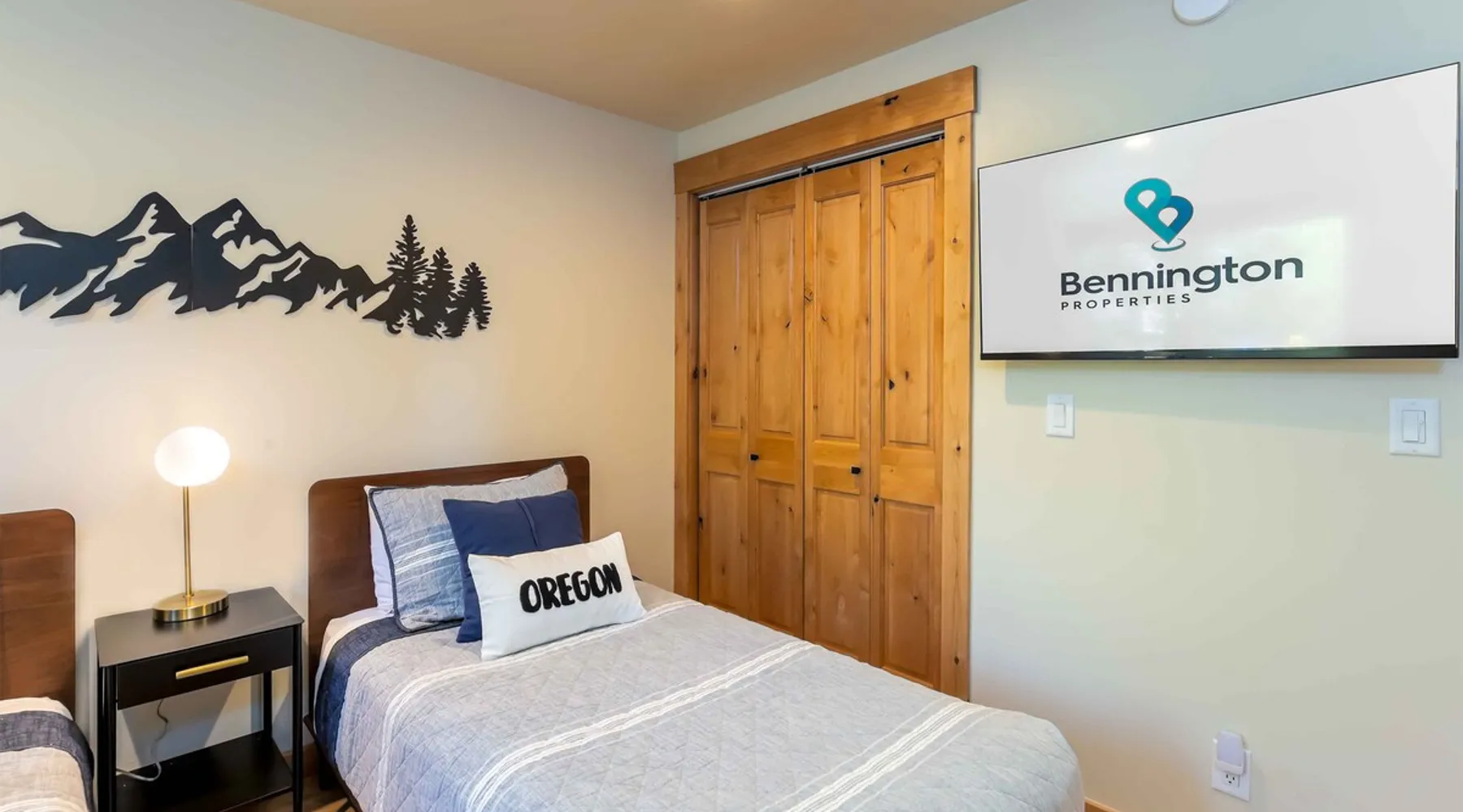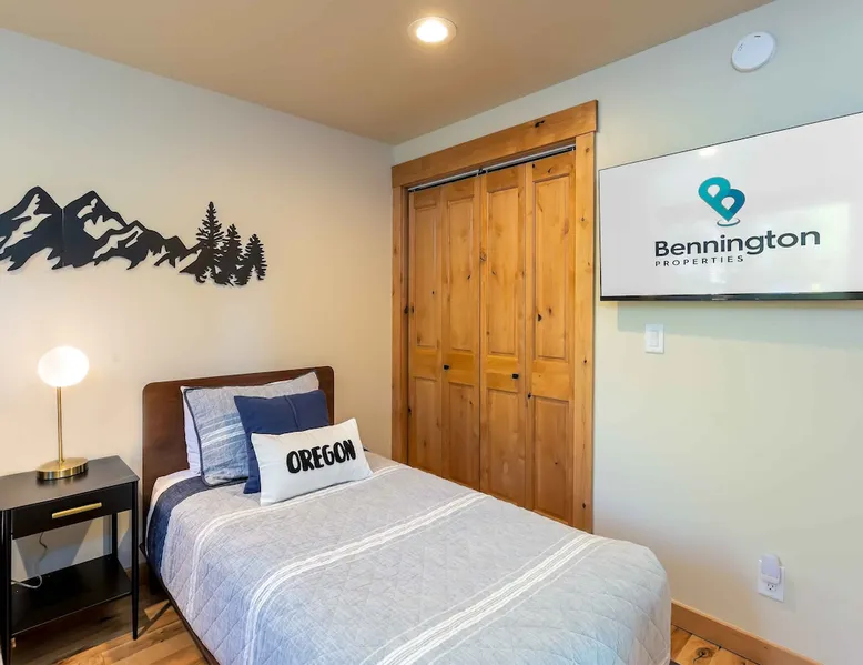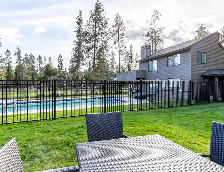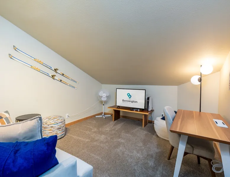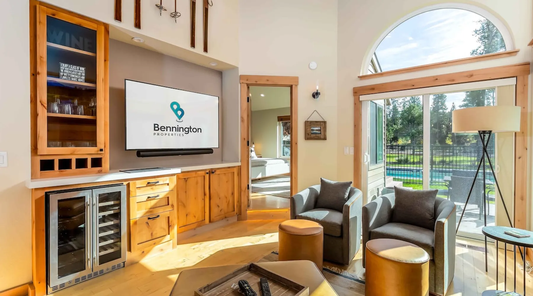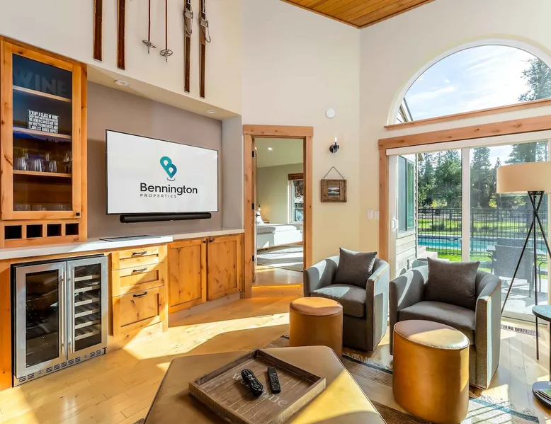 Nestled in the beautiful Sunriver, Oregon, this charming condo offers a comfortable and convenient retreat for your vacation. With a variety of sleeping arrangements including a king bedroom, queen bedroom, and two twins, this home is perfect for families or groups of friends. Enjoy your favorite shows as you unwind in front of the fireplace after a day of exploring the area. The space Looking for a Fairway Village Condo? This is one of the largest units in Fairway Village with over 1500 Sq. Ft of living space. This thoughtfully decorated condo gives a sense of charm from the moment you step on to the porch, with cozy seating to welcome you. As you enter the home you'll notice the vaulted ceilings, natural light and charming art in the great room layout. The living room has a new gas fireplace, wine fridge and large TV and is adjacent to the dining area and kitchen where you'll enjoy stainless steel appliances, and all the tools you'll need to whip up a gourmet masterpiece. The spacious ensuite bedroom is on the first floor with large bathroom, tile counter tops, tile shower and access out to the hot tub and swimming pool from this bedroom. A second bedroom featuring two twin beds and work station, completes this level Head upstairs to find he second ensuite bedroom with queen sized bed and attached full bathroom. When you're looking for a spot to chill after a long day of adventuring in Sunriver, check out the bonus room with a workstation, large tv, PlayStation and sleeper sofa. All bedrooms have smart TVs for your streaming apps. This home has a single car garage with sauna and, a great outdoor living space with a new concrete patio overlooking the swimming pool. Also available for you to enjoy are six adult cruiser-style bikes. Planning a family reunion or group get together? Reserve this home along with Fairway Village 3, Fairway Village 15 and Fairway Village 27. Other things to note AGE RESTRICTIONS: Guests must be 23 years or older to rent Bennington homes and the person reserving must occupy the home the whole reservation.