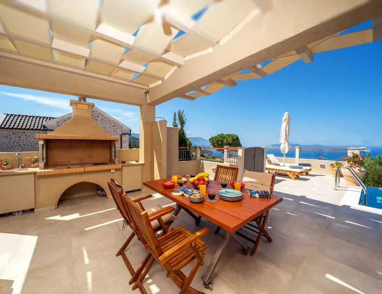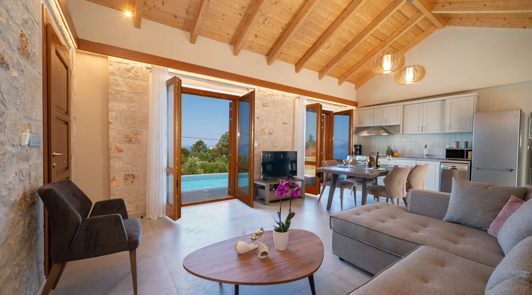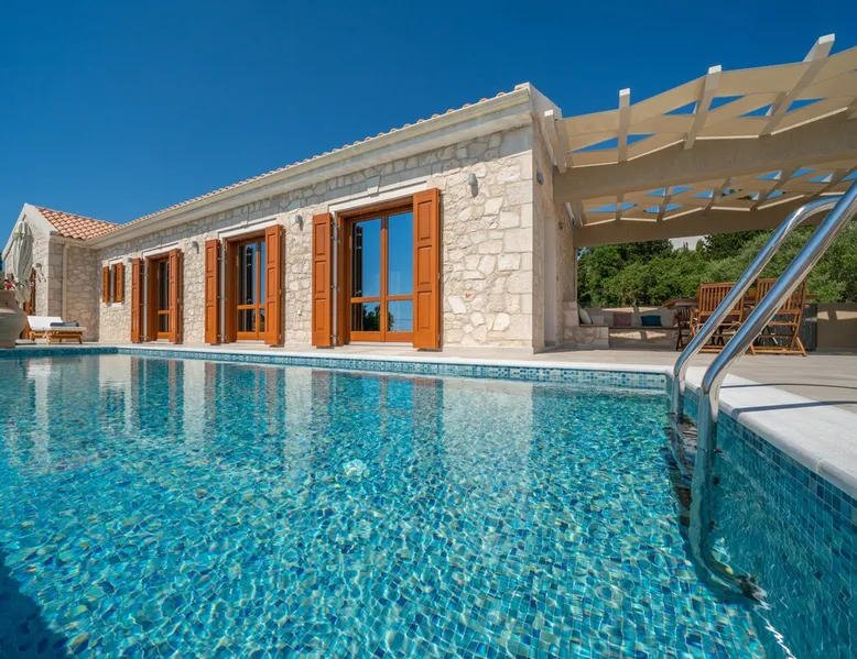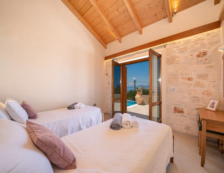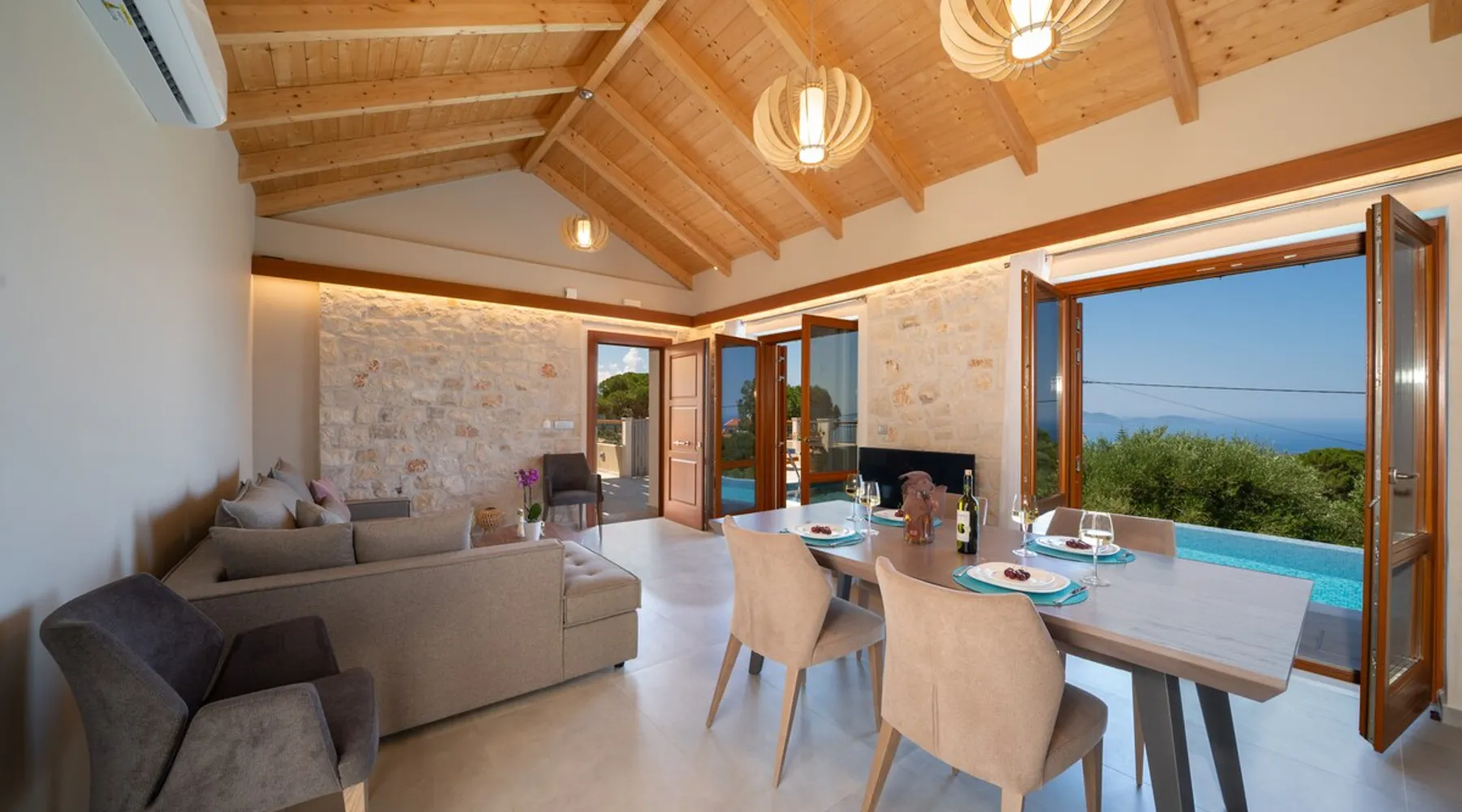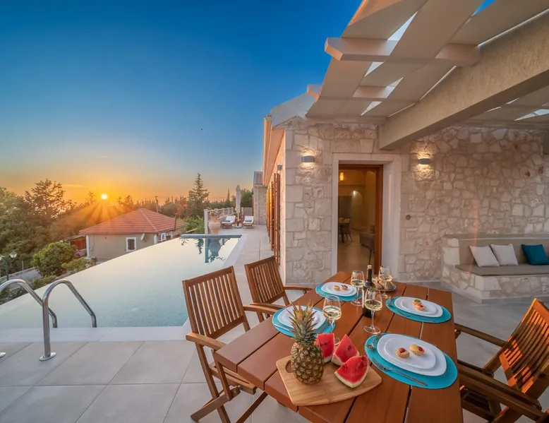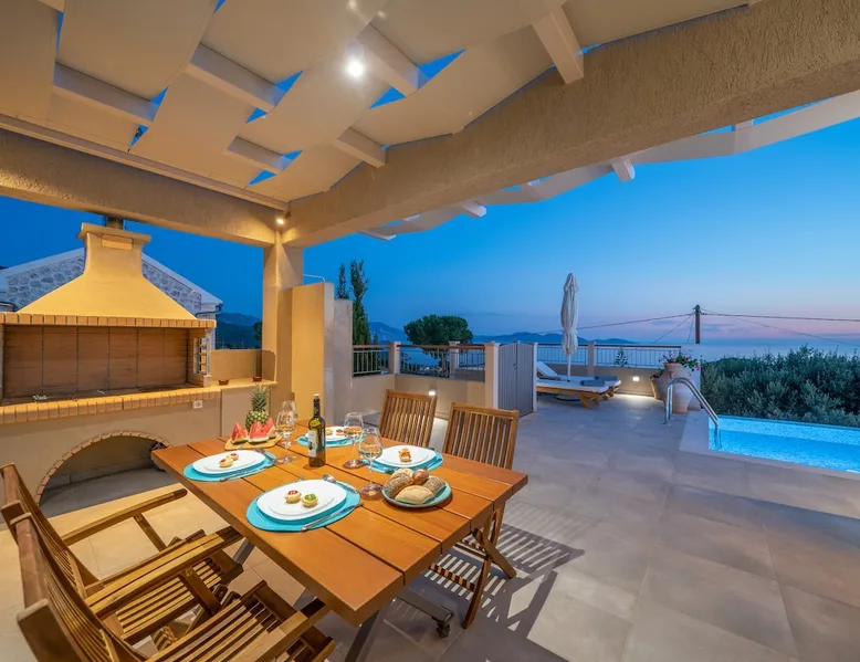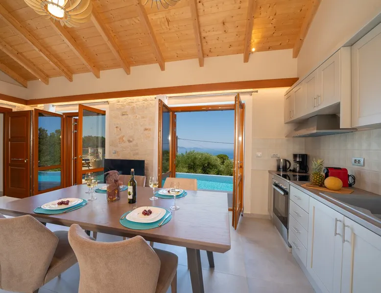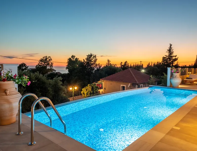 Pithari Sunset Villa is located on the edge of Tzaramelata, an unspoilt hamlet with beaches, services and beautiful walking trails on the doorstep. Boasting stunning panoramic views from the beautiful terrace and infinity pool, this two bedroomed luxurious villa is close to Fiskardo, with it's picturesque harbour and plethora of restaurants, activities and amenities. The space Pithari Sunset Villa is located on the edge of Tzaramelata, an unspoilt hamlet with beaches, services and beautiful walking trails on the doorstep. Boasting stunning panoramic views from the beautiful terrace and infinity pool, this two bedroomed luxurious villa is close to Fiskardo, with it's picturesque harbour and plethora of restaurants, activities and amenities. Carefully designed, using traditional style and materials, the villa offers spacious, comfortable and well-equipped accommodation, ideal for a small family or friends. The sleek terrace looks out across the valley to the sea beyond, with the sparkling pool set front & centre. Comfortable sun loungers await, ready to sink into with a good book & a cold drink, or just to snooze in the sun (or the shade of the parasol, if you prefer!). Outside dining is a must, and this is made easy at Pithari Sunset Villa, with double doors leading from the living space to the dining terrace, shaded and complete with large purpose built BBQ, built-in stone bench seating and table & chairs for 4. Tasteful decor and comfortable beds in the double and twin bedrooms make for a great night’s sleep, and the double doors to the terrace make waking up early for an al fresco breakfast very appealing! Bathrobes & slippers are supplied in both of the room’s spacious en-suite showers, and the washing machine is housed in one bathroom. The villa is equipped for 4, but a 5th person can be accommodated on the comfortable sofa-bed. Delicious food is within walking distance in Kokkino Chorio at the Rancho Ionio, with its traditional oven. Maganos village is just 1.5km away and boasts a couple of tavernas & cafes, as well as mini markets who will deliver to the villa. The gorgeous beaches of Alaties and Agios Jerusalem, both with a taverna, are only 3 kms away. For the more adventurous types, there are plenty of choices - perhaps go kayaking, hire a yacht for the day, take to the many hiking trails in the region, hop on a ferry to the mythical Ithaca island or join a boat trip departing from the cosmopolitan port of Fiskardo, just 7km away. This is a great location in the laid-back northern part of Kefalonia. Whether you wish to explore the region or just laze around the villa with a good book, Pithari Sunset Villa is a wonderful villa to unwind and relax in the beautiful surroundings. Outside Pithari Sunset Villa Infinity Swimming Pool - 3m x 5m, depth 0.90m x 1.50m tiled, ladder entry and glass barrier. Poolside Sea View Terrace - Sun beds with cushions, parasols, and lovely sea views. Covered Poolside Sea View Terrace - Built-in outdoor sofa with cushions, dining table with chairs and large Bbq with sink, plus outdoor shower. Lower Parking - Steps lead to the parking area inside the grounds of the villa. Gates to rear with a large parking area. Inside Pithari Sunset Villa Ground floor Open Plan Living - Kitchen area - L shaped Sofa-bed, Smart 42” Tv with satellite & Netflix, balcony doors open to sea view pool terrace and WiFi. Air Con Unit. Dining area - Table with chairs plus balcony doors with sea view/pool terrace view. Kitchen area - Double sink, dishwasher, 4 ring ceramic hob and electric oven, microwave, Nespresso & filter coffee machine plus large fridge freezer. Double bedroom, en suite shower room - 1 Queen sized bed, built-in wardrobe & drawers, dressing table with mirror. French doors to the sea view terrace with table and chairs. En suite shower cubicle, wash basin with mirror, W. c and washing machine. Air Con unit. Twin bedroom, en suite shower room. - 2 Twin beds, built-in wardrobe & drawers, dressing table with mirror. French doors to sea view terrace. En suite shower cubicle, wash basin with mirror, W. c. Air Con unit. 5th person will be accommodated on the comfortable sofa-bed. Housekeeping: Your Villa will be prepared for you on arrival with fresh bath and hand towels and all beds made up. For stays of 7 nights or more - house towels will be changed every 3 - 4 days. For stays of 14 nights or more - bed linen will be changed every 7 days. Pool/beach towels - one per person for the duration of your stay. Parking - Inside the gated grounds of the villa at the rear of the villa. Other things to note Included Services: - Swimming pool: Services available according to season Opening date: 01/05. Closing date: 31/10. - Welcome Bag (Greece) - tree-nation, 2x trees planted - Pool/Beach Towels - Bed linen: Change each 4 days - Towels: Change each 3 days Optional Services: - Cot/Crib: Price: Included in the booking. - Baby High Chair: Price: Included in the booking. - Second Cot : Price: EUR 30.00 per booking. - Second High Chair: Price: EUR 30.00 per booking. Registration details 1247704