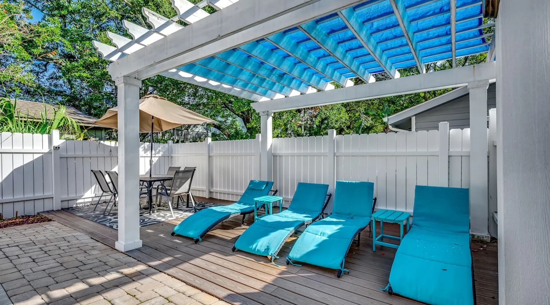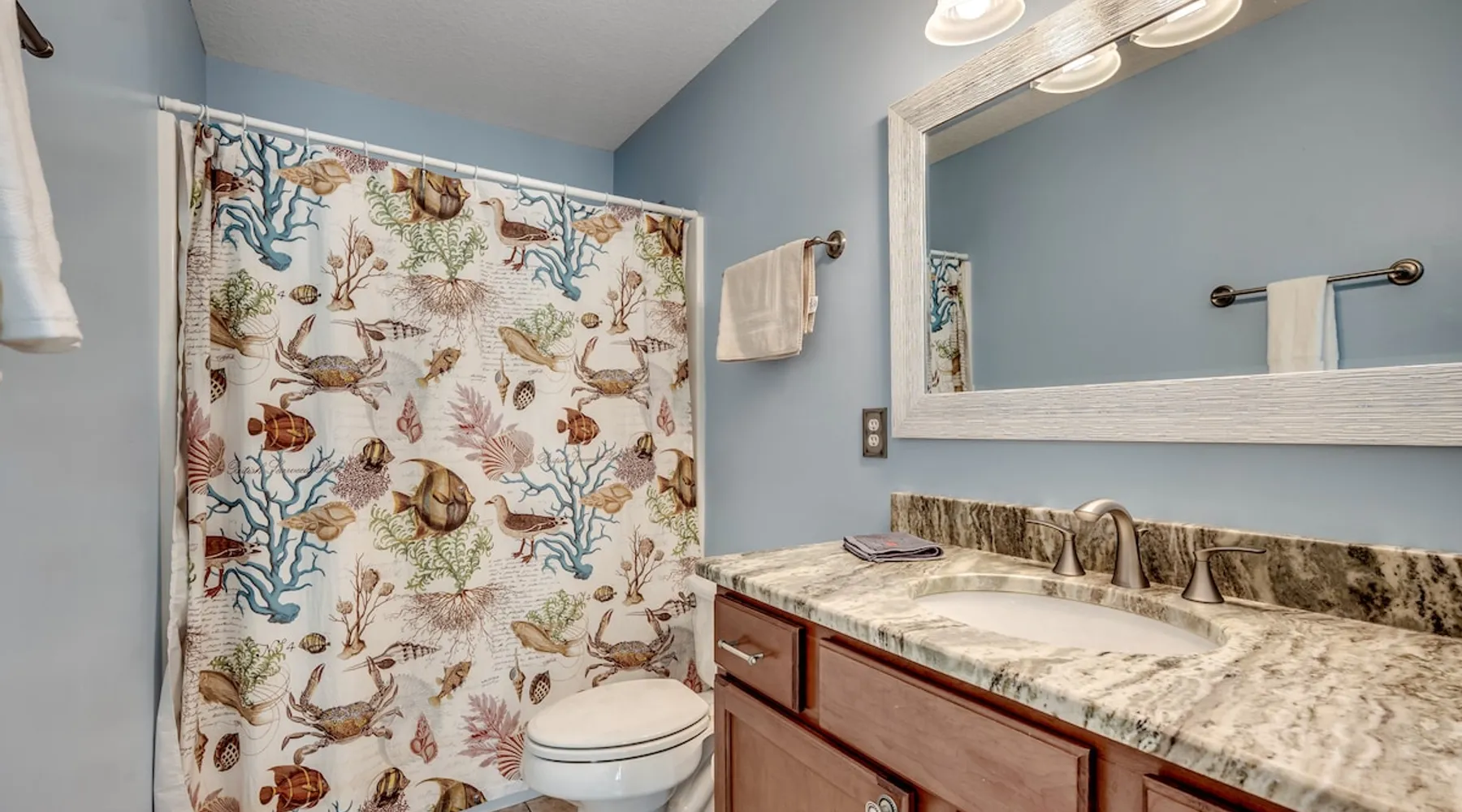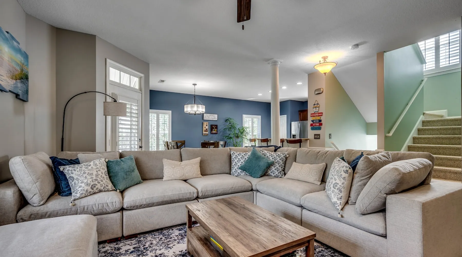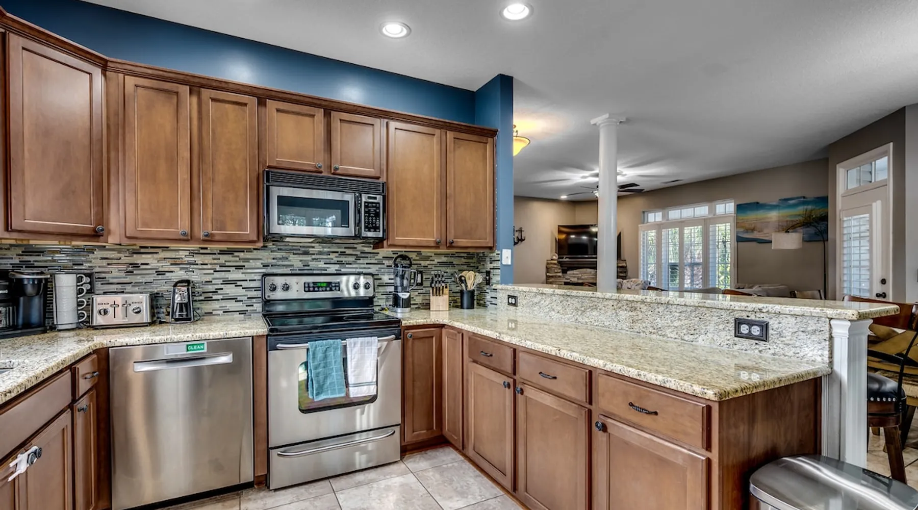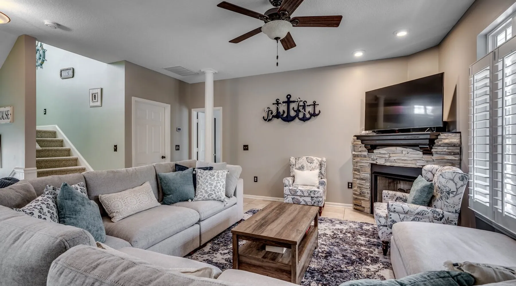 🐠Total House-5 BR, All BRs have En-suite Baths & Smart TVs, Slps 8 Adults 4 Kids 🐠3 min walk to bch 🏄 🐠Ideal house for families and extended families 🐠Beach Games & Beach Chairs Umbrella Incl 🐠Huge HEATABLE & COOLABLE Private Pool 24'x13' with Shower 🐠Complimentary 4 Seat Golf Cart 🐠1st floor BR & Ensuite Bath 🐠Enormous Screened Porch 🐠3 min drive to SS Pier w/tons of restaurants /bars/ice cream 🐠>20 mins to just about everything MB Offers but quieter! The space MORE ABOUT THE SPACE: LIVING AREAS 🛁 Enjoy relaxed quality time in the open living room, with gas fireplace outfitted with tiled floors and tropical-themed decor. A huge sectional couch and 55" Samsung Smart TV 📺 — for access to your Netflix, Hulu, HBO, etc. accounts. There is also live TV Access with YouTubeTV. Walk from the living room directly out onto the plush screened in front porch to enjoy coffee or a glass of wine without worry of insect interference! KITCHEN & DINING Overlooking the dining and living area, a stylish kitchen boasts stainless steel appliances and all that you could want in order to wow your guests with your chef skills! In the mornings, sip coffee at a roomy breakfast bar that seats four along with the huge solid wood dining table that seats 8. You can also step out onto the screened in front porch to the 4 seat table and soft seating and have a relaxing breakfast or twilight dinner. BEDROOMS & BATHS All five bedrooms feature EN-SUITE UPDATED bathrooms and Smart-TVs! All bedrooms (except bunk room) have ceiling fans. Upstairs, the spacious master bedroom boasts a king bed, an updated en-suite bathroom with a beautiful walk-in tiled shower and granite vanity. On the entry/main level, there is a bedroom with a queen bed, en-suite bathroom with double sinks and a small private balcony. The remaining bedrooms are upstairs. One Queen Room, Two King Rooms, and a bunk room of 4 single beds in the bunk room. Again, all bedrooms have en-suite bathrooms EXTRA AMENITIES & MORE DETAILS Be sure to check-out our digital GUIDEBOOK upon booking where you can always see check-in and check-out info, house manual, things to do, added services, and even your own concierge service! Plan your vacation right from your fingertips! Some of the many guest amenities include complimentary FAST Wi-Fi, cable TV, a washer/dryer, Gas Grill, Pool/Beach Toys, 4 Beach Chairs and an umbrella, and driveway parking for 6 small-medium size vehicles or 4-5 pickups/SUVS (parked in tandem) and use of the on-site golf cart (with golf cart agreement). Added extras include, board games, as well as a Pack 'n Play, and a highchair. There are also outdoor games provided. OUTDOOR AREAS Spend lazy afternoons around your completely private, huge (24ftx13ft), HEATABLE & COOLABLE pool and deck with lounge chairs and dining table. There is also an outdoor private shower for your convenience. There is a massive screened-in deck in the front with furniture for lounging and dining. Guest access ACCESS INFORMATION: Guests have access to the entire property as advertised. Private pool access for Shore Nuff only. Keyless door lock with access code sent with check-in instructions at least 3 days prior to arrival. Other things to note THE FINER DETAILS OF YOUR STAY: House is Hosted by Booking5StarStays It is expected that the guest will return the property and all that is included, in the same condition in which it is received besides needing a regular cleaning and linen service. Excessive cleaning and damages will result in extra fees. **Scroll down for a note on stays 29 nights or longer *Our cleaning fee includes: Standard cleaning upon departure from regular use up to 14 day stay, all bed linens with the beds made upon arrival, bath towels, STARTER PACK of paper products/dish soaps/sponges/kitchen towels, basic cooking staples, and outdoor cleaning *Separate Rental Agreement Required after booking *Government ID (Drivers License or equivalent) must be submitted after booking. * IF YOU PAY BY CREDIT CARD WITH V-R-B-O PLEASE ADVISE YOUR BANK AHEAD OF BOOKING TO FLAG 5 STAR STAYS (PROPERTY HOST) AS SAFE FOR LARGER TRANSACTIONS TO AVOID DECLINED TRANSACTIONS. 5 STAR STAYS IS THE MERCHANT OF RECORD. *We HIGHLY recommend travel insurance for your stay to cover a variety of cancellation reasons AS WE DO NOT REFUND OUTSIDE OF THE CANCELLATION WINDOW. WE DO OFFER THIS AS AN ADDED ACCOMMODATION FOR AN EXTRA FEE THROUGH INSURE STAYS AND NATIONWIDE INSURANCE after booking. Please inquire. *Pool HEATING and COOLING is not automatically included and is optional. Pool temperature modification is $125 extra for each week or portion of each week thereof and must be requested (typically) at least 3 days in advance. It is recommended if you plan on using the pool in the cooler months or in the prime heat of summer to maximize enjoyment. *While the property is child friendly the property is not necessarily child or baby proofed. Parents are expected to provide any child/baby proofing desired. Parental supervision is required. *Parking for 4 Large Vehicles or 5-6 Small Vehicles-Grass and Street Parking Not Permitted *While the property is pet friendly there are some guidelines for pets: 1. Maximum of 2 pets 60lbs and under only, no aggressive breeds allowed 2. Pets must be fully house trained (incontinence, behavioral) and crated when left alone, you provide the crate 3. Pets must be treated for fleas within two weeks of stay and be vaccinated for Rabies 4. Pet Fee of $20 per pet, per day is non-refundable and is NOT an 'extra cleaning fee'. (this fee is flexible for stays longer than 13 nights... please inquire) You remove all pet hair, waste before departing. NOTE: This fee is included in your rate with Airbnb and VRBO IF YOU INDICATE YOU HAVE A PET IN THE PROCESS OF BOOKING. This is not included in other platforms or our direct booking site and will be billed after booking. 5. Pets are not allowed on furniture or beds, bring a bed or blank