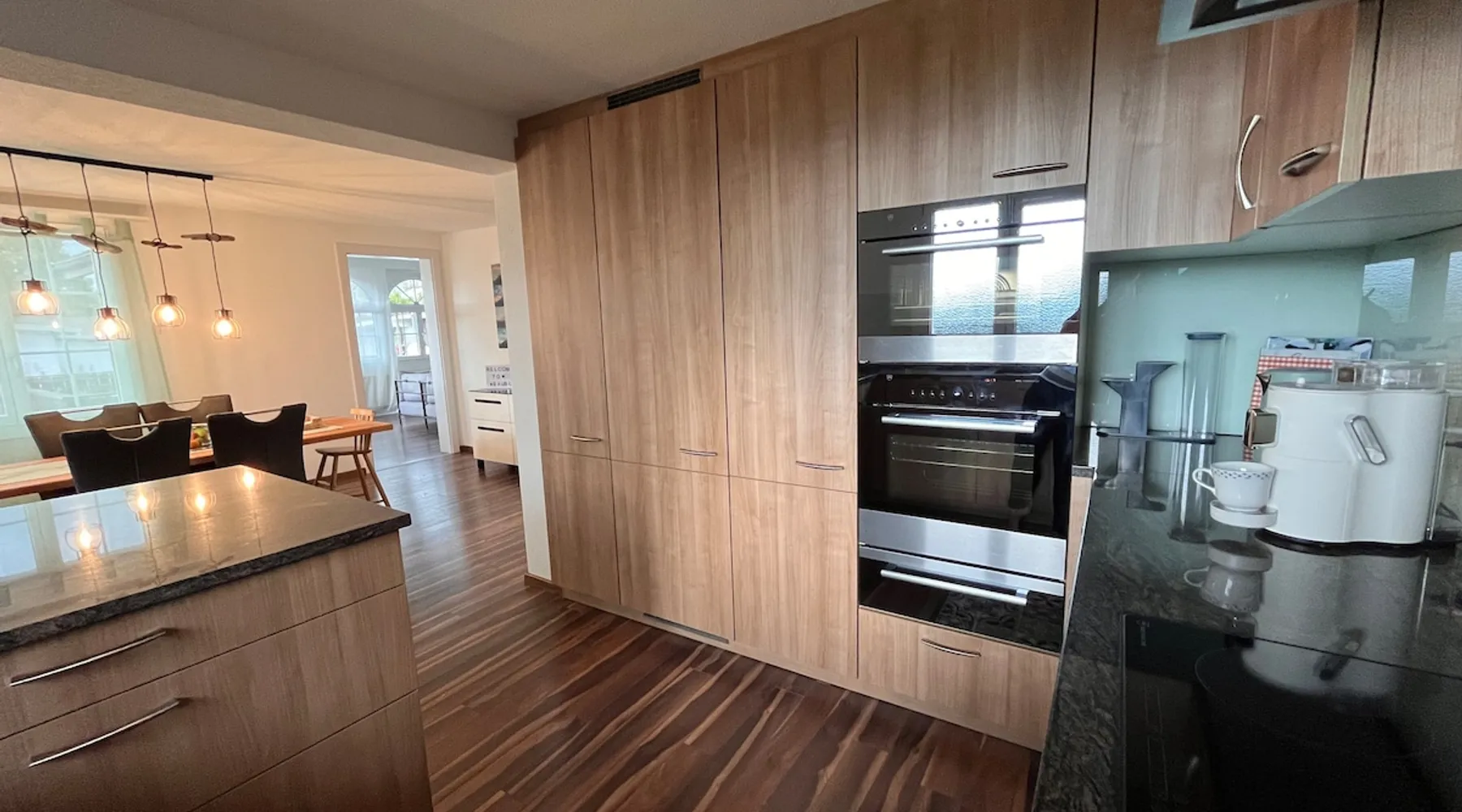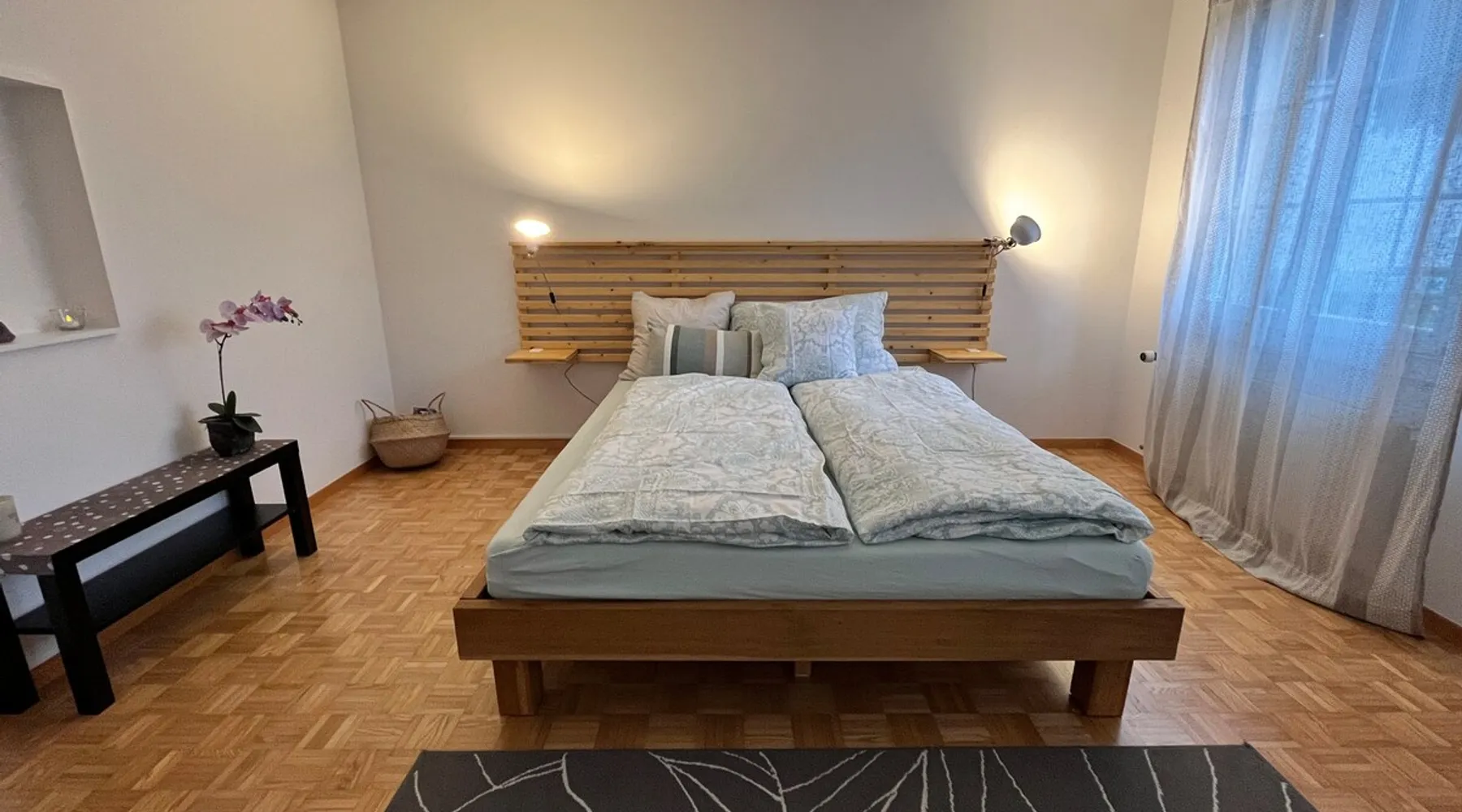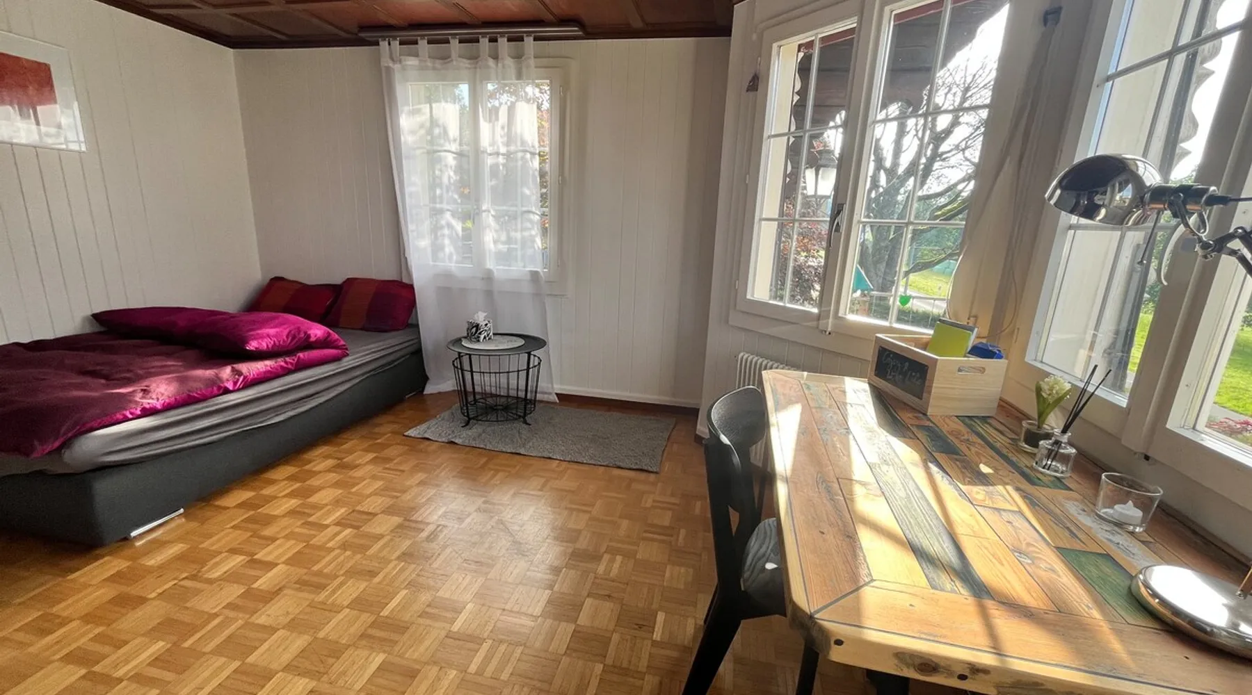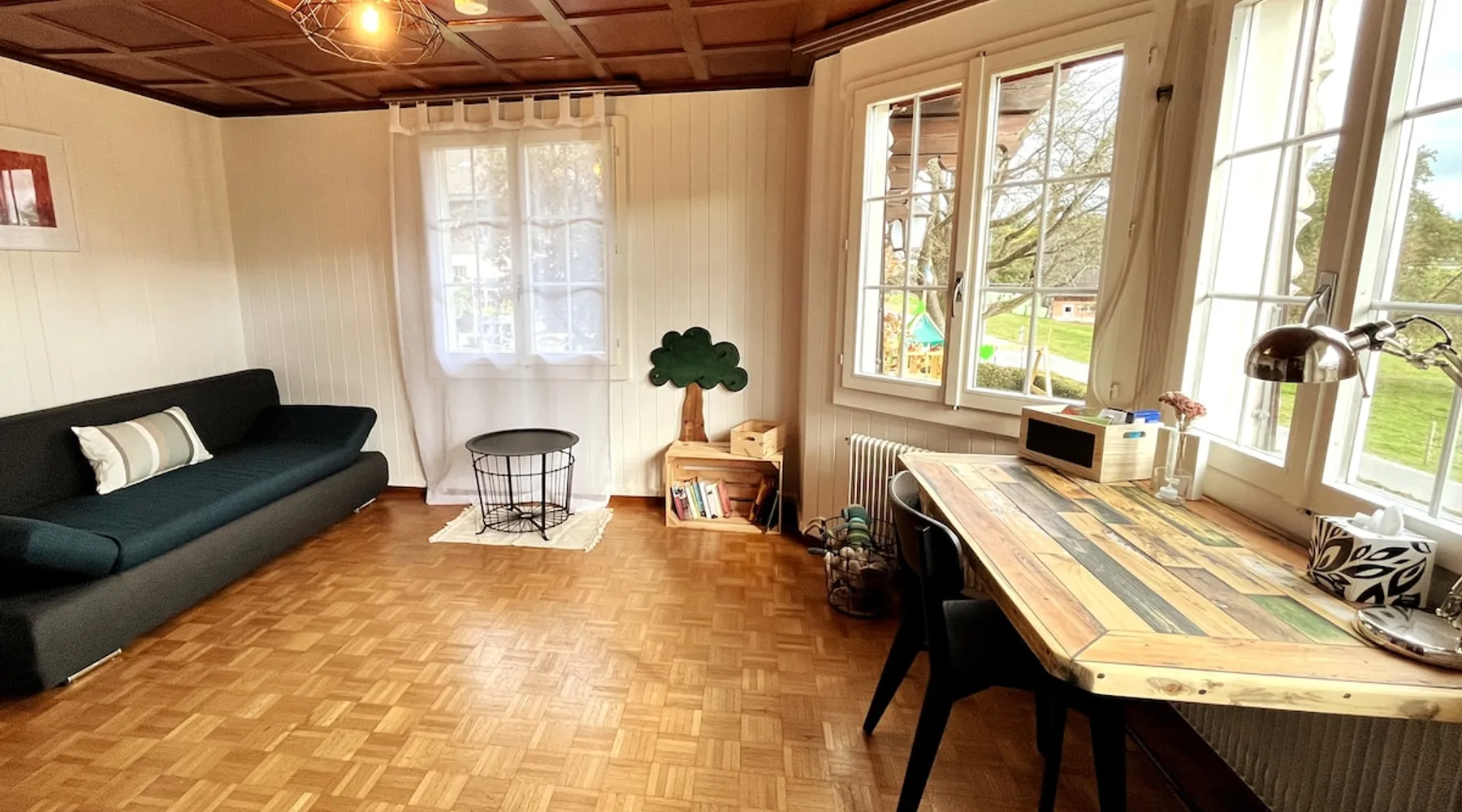 Our apartment on the upper ground floor of our chalet in the Lucerne Seetal offers plenty of space, relaxation and peace with the best view of the Alps, making it ideal for families, friends or business travelers. Look forward to a homely charm, modern amenities and friendly hosts (family.) The spacious kitchen-diner, the cozy living room and a bright, spacious bathroom are just as impressive as the central location with quick connections to Lucerne, Zurich and the surrounding Alpine region. The space Our recently (2023) renovated and newly furnished apartment on the upper ground floor of our family home has 1 large (master) bedroom with lots of storage space/built-in closets and a bay window room (in rustic original condition) with a sofa bed (145x195) and a small work desk. A highlight of the apartment is the open space, fully equipped kitchen with modern appliances (i.e steamer, induction stove) and dining area. The spacious bathroom with plenty of natural light impresses with a large shower, bathtub and double sink. In the elegant, light-filled living room and on the adjacent terrace with garden furniture, cozy moments of relaxation (including sunset) are guaranteed. Guest access The large children's playground (climbing tower with slide and swings) on the hosts property can be used and the vegetable garden next door invites you to harvest depending on the season. A classic BBQ smoker or outdoor grill station is available and can be booked with a pitmaster if required and desired. Other things to note The apartment is about 12 minutes (900m) walk from public transport (Ballwil train station). The entrance to the house is only accessible via stairs and is therefore not or only partially suitable for people with walking difficulties. We are a pet-free and non-smoking household and would like our guests to do the same indoors. The laundry room with washing machine and dryer can be used after consulting the owner's family.