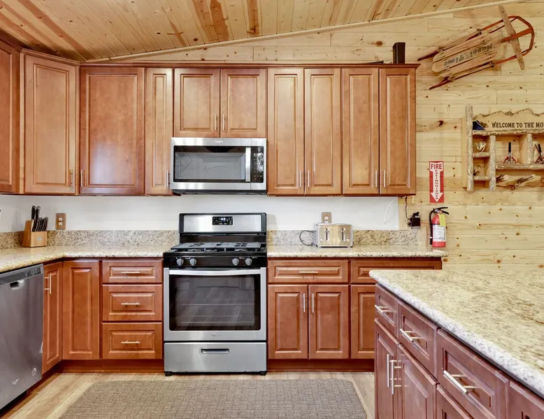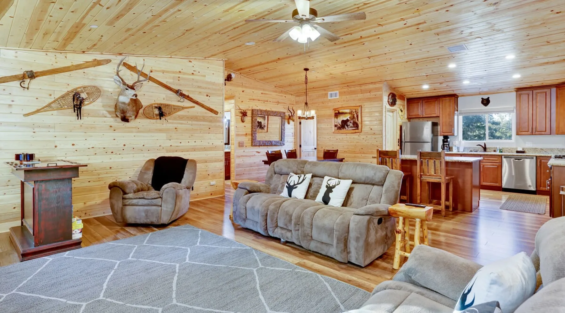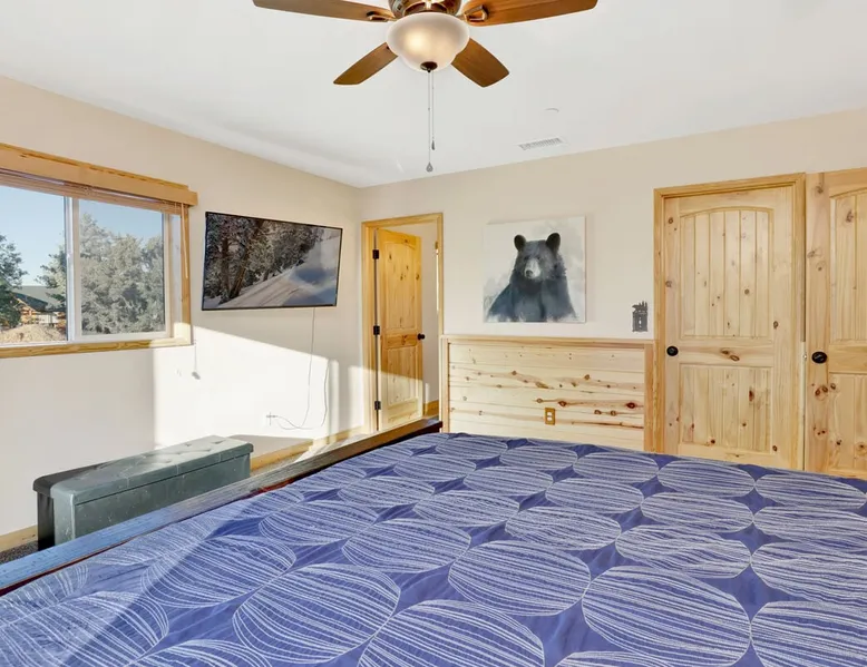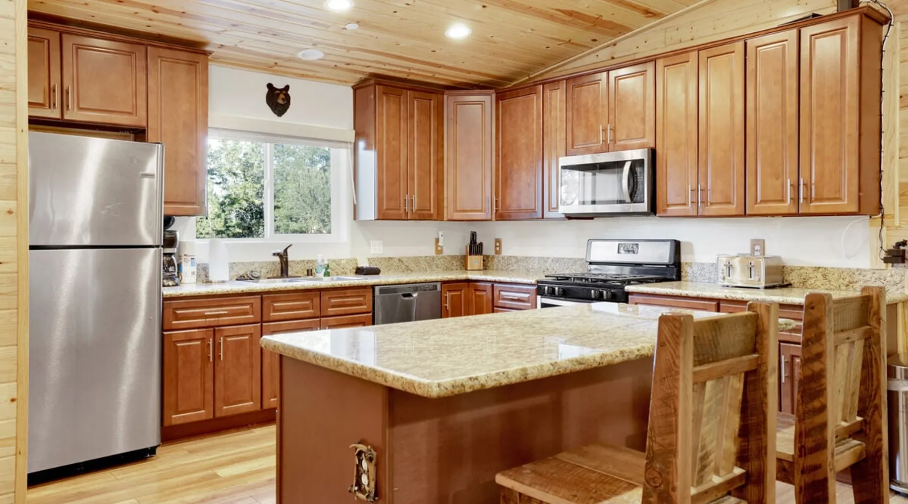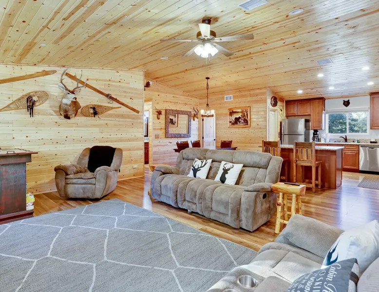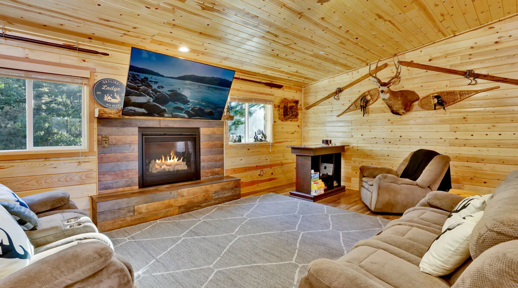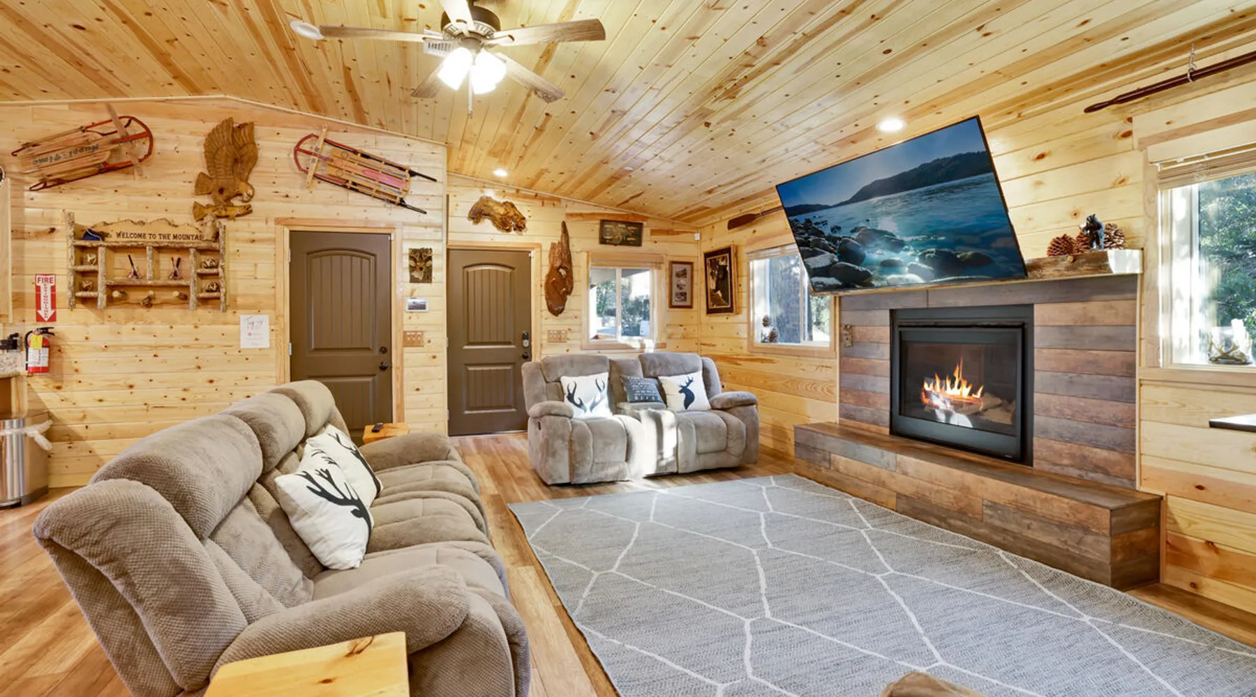 Welcome to Skyline Lodge! Your home away from home awaits you here in this beautiful single level newly constructed mountain log cabin chalet. Relax under soaring pine trees and shooting stars anytime of the year from our furnished upper Moonridge retreat. Hop in the car and you are within a short ten minute car ride to local ski resorts, golf, and the Alpine Zoo, this is an unbeatable year round central location for any season. Elevate your next getaway with friends or family here! The space Skyline Lodge | Impeccable Central Log Cabin Chalet Welcome to Skyline Lodge! Your home away from home awaits you here in this beautiful single level newly constructed mountain log cabin chalet. Relax under soaring pine trees and shooting stars anytime of the year from our furnished upper Moonridge retreat. Hop in the car and you are within a short ten minute car ride to local ski resorts, golf, and the Alpine Zoo, this is an unbeatable year round central location for any season. Elevate your next getaway with friends or family vacation to new heights here at Skyline Lodge! Enter your chalet where you are greeted with pine accent walls and cathedral ceilings which pairs with gorgeous hardwood floors throughout- you will truly feel as if you have your own mountain lodge to yourselves here. Snuggle up on the cozy couch or sitting chairs and warm your toes together in front of the toasty gas faux log fireplace as you watch the snow falling outside or enjoy a movie on the massive mounted Streaming TV. The open floor plan and fun game table keeps the whole group connected as you enjoy your time together under the stars. The chef of your party will adore the newly built and fully equipped kitchen boasting all that you need to whip up your slope side snacks or home cooked holiday meals right here at the cabin including oak cabinets stocked with cookware and utensils, stainless steel appliances, and a dishwasher for a breezy cleanup afterwards. Plenty of comfortable seating is available for your group to enjoy the fruits of your labor together while the breakfast island offers additional counter and prep space for any meal. Being a single level chalet you will have quick and convenient access to the laundry room with a washer and dryer available, both equipped and modern bathrooms, and your three spacious sleeping quarters, each is made up for your arrival with warm linens, blankets, pillows, and fresh bath towels for your vacation stay. The primary suite offers great window views, deck access, and a beautiful private bath featuring dual sinks for those busy mornings. Step outside to enjoy the great outdoors which surrounds this home in peace and relaxation as you soak up the rays out on the spacious sun deck complete with ample outdoor patio furnishings and a propane BBQ to grill up your freshly caught dinner from the lake. Located in central upper Moonridge your group is just ten minutes from local activities including the ski resorts, Village shops, and lake activities- don't miss your chance to experience this incredible home away from home today! Sleeping Arrangements: Bedroom 1: King Bed, Streaming TV, Deck Access, Private Full Bath Bedroom 2: King Bed Bedroom 3: Full/Twin Bunk + Twin/Twin Bunk Bathroom Arrangements: Private Full Bath- Bedroom 1 Hallway Full Bath -Sleeps 8 -2 Cars Driveway, 1 Car Garage -1 Pet Welcome w/ Additional Fee -1,678 Total Square Feet Other things to note Big Bear Vacations & Cabins House Rules and Policy Information *Please read all rules and policies completely- Your booking/request to book constitutes your understanding and agreement of the below Policies & Information* **Reservation Holder Must Be 21+** **Electronic Rental Agreement & Good Neighbor Policy Required** **Guests must provide ID for Cabin Access** Our Big Bear Vacations team is looking forward to hosting you here in the mountains! We are your longest standing local vacation experts with years of dedicated experience and knowledge brought forth within our exceptional customer service and support staff to ensure a 5 star experience for every guest. Our team offers 24/7 support along with local on site offices and experience packages. Big Bear GOOD NEIGHBOR POLICY is enforced at all times during your stay and includes removing trash from the property to local trash sites, washing dishes to alleviate wild animals being attracted to neighborhoods. NO PARTIES OR EVENTS, No Over Occupancy, No Loud Music, and No Street Parking is allowed in Big Bear homes at any time. This policy along with a rental agreement will be emailed to you immediately after booking and is REQUIRED by the City of Big Bear Lake for all rentals in Big Bear. If found in violation of these policies guests will be visited by staff and Code Enforcement officers who may or may not issue fines or evictions to the violating party members. No Smoking is allowed in any Big Bear homes. Check-in time is 4:00 pm Check-out time is 10:00 am There is no early arrival or later departure availability during peak season and holidays. Contact our office the morning of arrival or departure to confirm early arrival or later departure availability for your stay. (Fee Applies) Winter Snow & Parking- During winter months the driveways, steps, porches, decks, and other outdoor areas at your property may not be accessible due to snow or ice. Our teams are on fixed routes for snow and work alongside city and county resources to clear roads, driveways, walkways etc. Guests should be prepared in winter months to shovel themselves in or out of the property and off of the street in these snowstorm events. As there is no street parking allowed in Big Bear it is extremely important that guests make every attempt to get vehicles off the street for the snowplows. California Law requires that vehicles traveling to Big Bear from November thru April have snow chains in their vehicles however we also recommend proper footwear, an emergency kit, and an extra snow shovel. Pet Policy- P