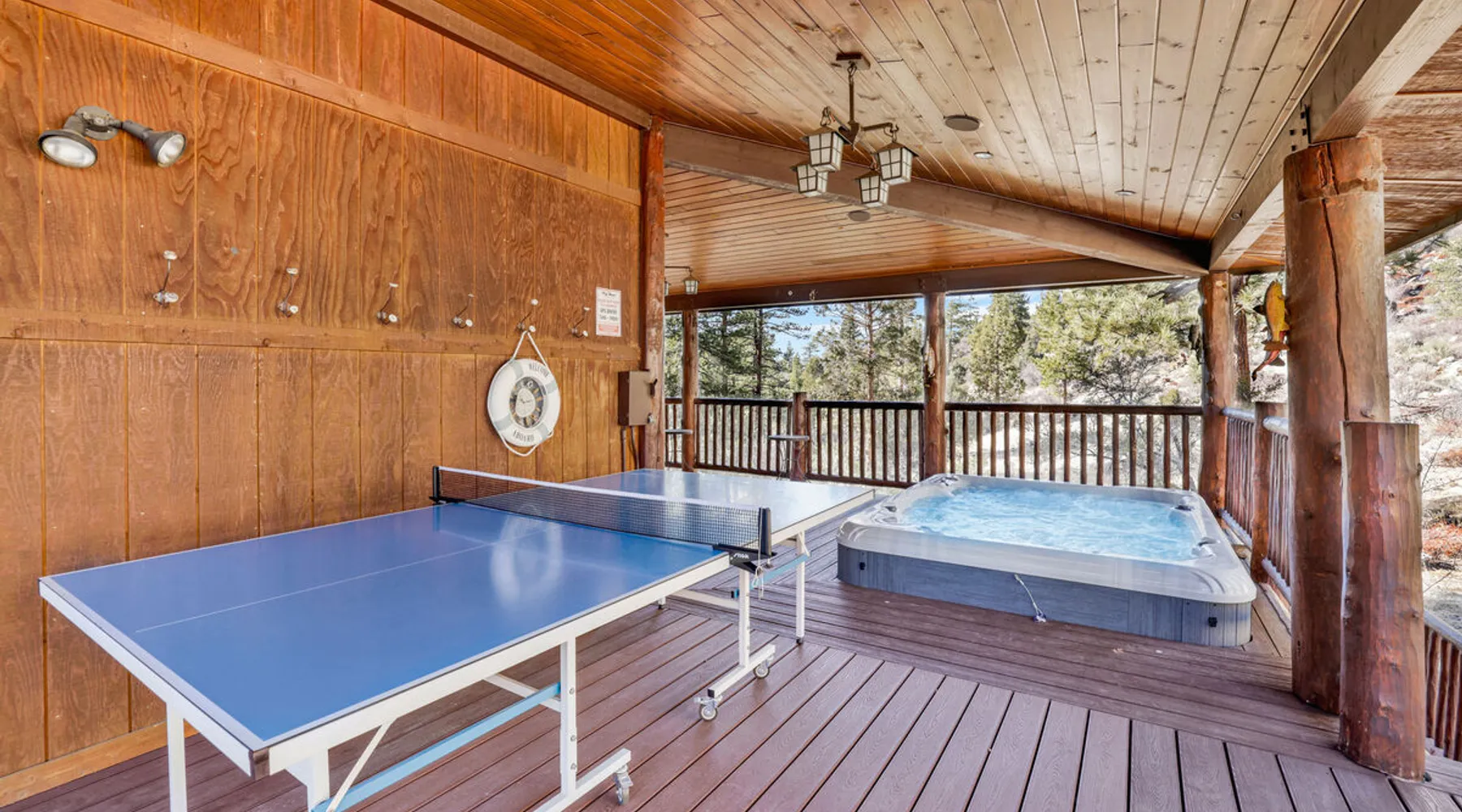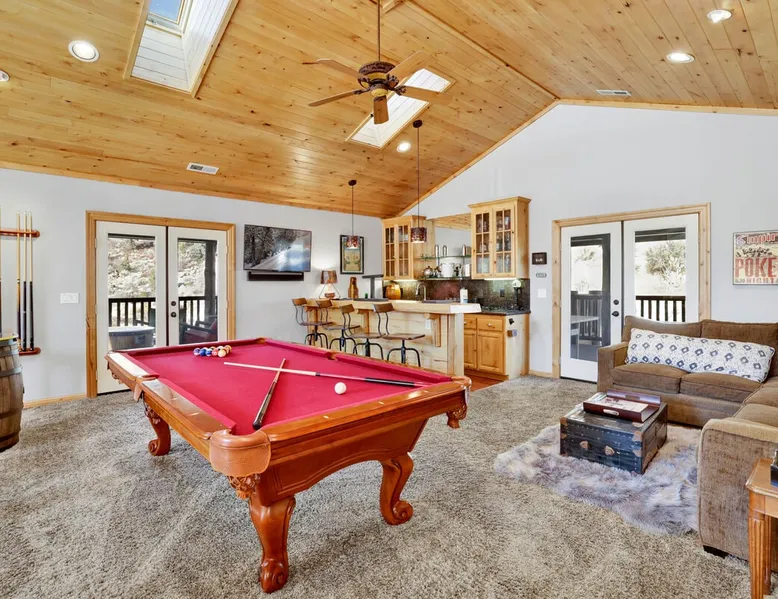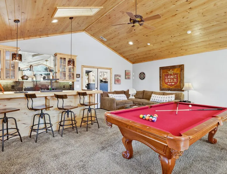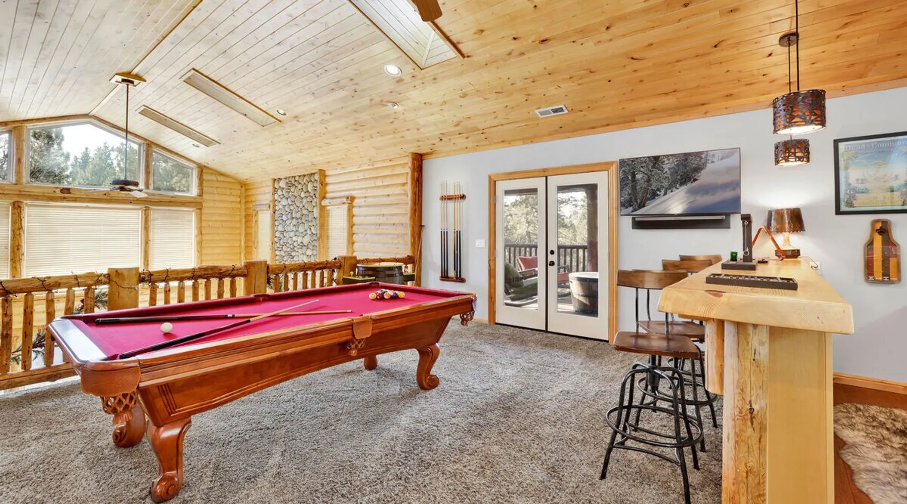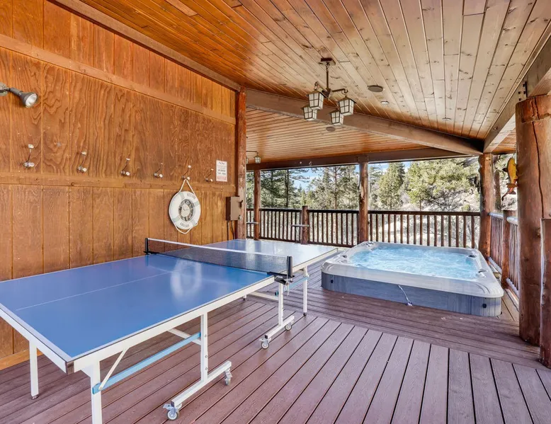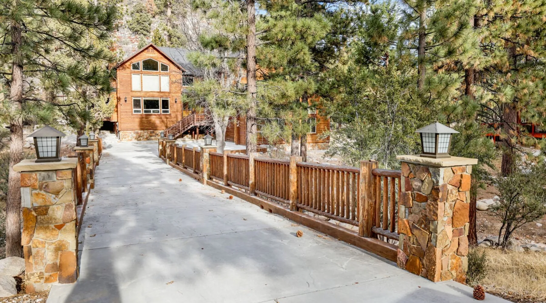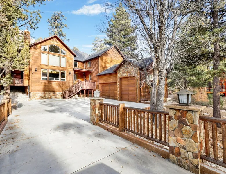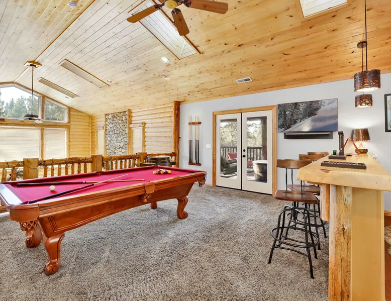 Our luxury log cabin is a haven for those seeking an unforgettable mountain escape. It seamlessly combines the charm of a classic log cabin with modern amenities, creating an oasis of relaxation and entertainment. Whether you're celebrating with family and friends or simply indulging in a serene getaway, this cabin promises an experience like no other. Book your stay today and start creating cherished memories in this mountain paradise. The space Gold Rush Lodge Big Bear | Hot Tub | Games Welcome to Gold Rush Lodge, an enchanting retreat where the allure of rustic elegance harmonizes effortlessly with contemporary comfort. Nestled in the heart of the mountains, this extraordinary 6-bedroom haven is meticulously designed to deliver an unforgettable experience for those in search of the perfect fusion of relaxation and entertainment. Approach the residence via a unique driveway doubling as a picturesque bridge, guiding you to the grand entrance of our opulent log cabin. The exterior proudly displays the timeless craftsmanship of a classic log cabin, while the interior beckons you into a realm of luxury and amusement. Featuring six meticulously appointed bedrooms, there is abundant space for everyone in your party. Each room seamlessly blends comfort and style, promising a tranquil night's sleep amidst the mountain's breathtaking beauty. The whimsical bunk room, offering direct access to the outdoor spa, invites both the young and the young at heart to unwind. Complete with a ping pong table, it ensures continuous entertainment for all ages. The focal point of Gold Rush Lodge is its welcoming living room, anchored by a majestic fireplace radiating warmth and charm. Immerse yourself in your favorite shows and movies on the surround sound TV, or simply bask in the glow of the crackling fire. The cabin's game room is a true delight, boasting a handsomely adorned bear-themed bar, a pool table, and a dartboard, providing limitless options for enjoyment and relaxation. For the culinary enthusiasts, the well-appointed kitchen is a chef's haven, equipped with modern appliances and everything necessary to craft gourmet meals. Whether you're whipping up culinary masterpieces or brewing a cup of coffee, the exquisite log dining table sets the perfect stage. Step outside and embrace the natural beauty that envelops Gold Rush Lodge. Whether you're indulging in the spa, challenging companions to a ping pong match, or simply lounging on the deck, the serene mountain environment seamlessly becomes an integral part of your experience. Our luxury log cabin guarantees an unforgettable mountain escape, skillfully blending the charm of a traditional log cabin with modern amenities. Whether you're celebrating with family and friends or seeking a tranquil getaway, Gold Rush Lodge offers an unparalleled experience. Secure your stay today and embark on a journey to create cherished memories in this mountain paradise. Sleeping Arrangements: Bedroom 1: King Bed, Streaming TV/Cable, Gas Fireplace, Deck Access, Private Full Bath- Downstairs Entry Level Bedroom 2: Queen Bed- Downstairs Entry Level Bedroom 3: Queen Bed- Downstairs Entry Level Bedroom 4: Queen Bed- Upstairs 2nd level, Private 3/4 bath Bedroom 5: Queen Bed- Upstairs 2nd Level, Private 3/4 bath Bedroom 6: Full/Full Bunk + Two Twin/Twin Bunks, Streaming TV, Deck Access, Private 3/4 Bath- Upstairs 2nd Level Bathroom Arrangements: Private Full Bath- Bedroom 1- Downstairs Entry Level Half Bath- Downstairs Entry Level Full Bath- Downstairs Entry Level Full Bath w/ Soaker Tub- Upstairs 2nd Level Full Bath- Upstairs 2nd level Private 3/4 Bath- (Shower Only)- Bedroom 6- Upstairs 2nd Level -Sleeps 16 Max | 12 Adults & 4 Children -5 Cars Driveway Parking -NO PETS ALLOWED- Fines Imposed For Pets Found On Premises -4,493 Total Square Feet City Permit #:VRR-2023-2330 Registration Details 2023-2330