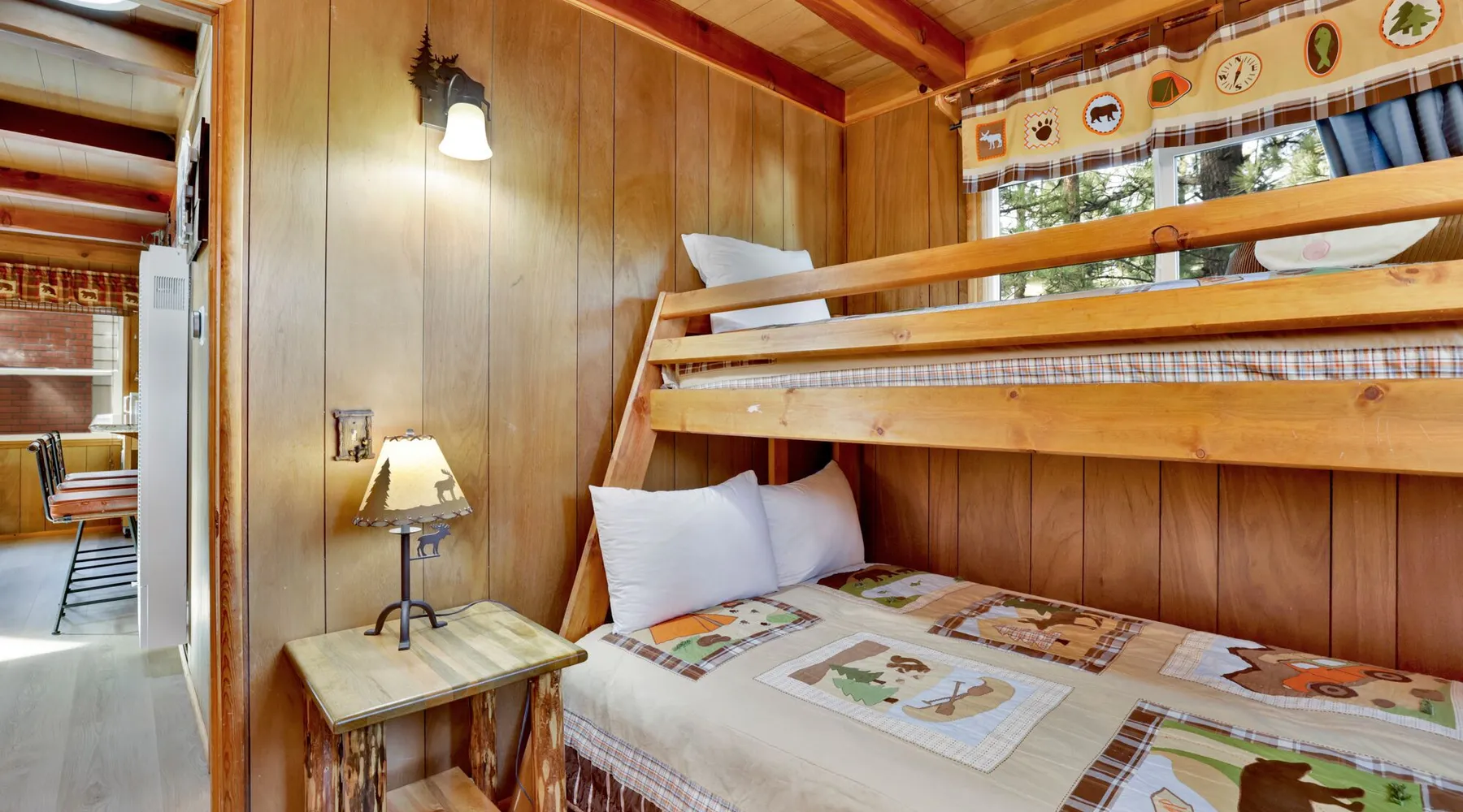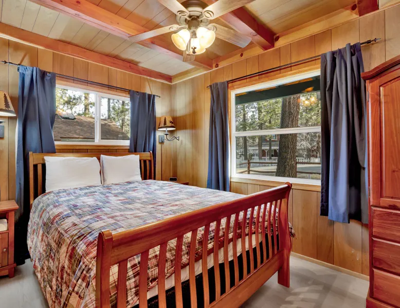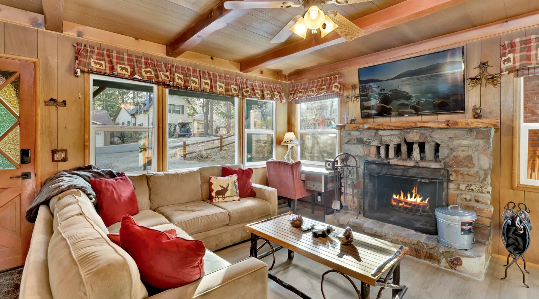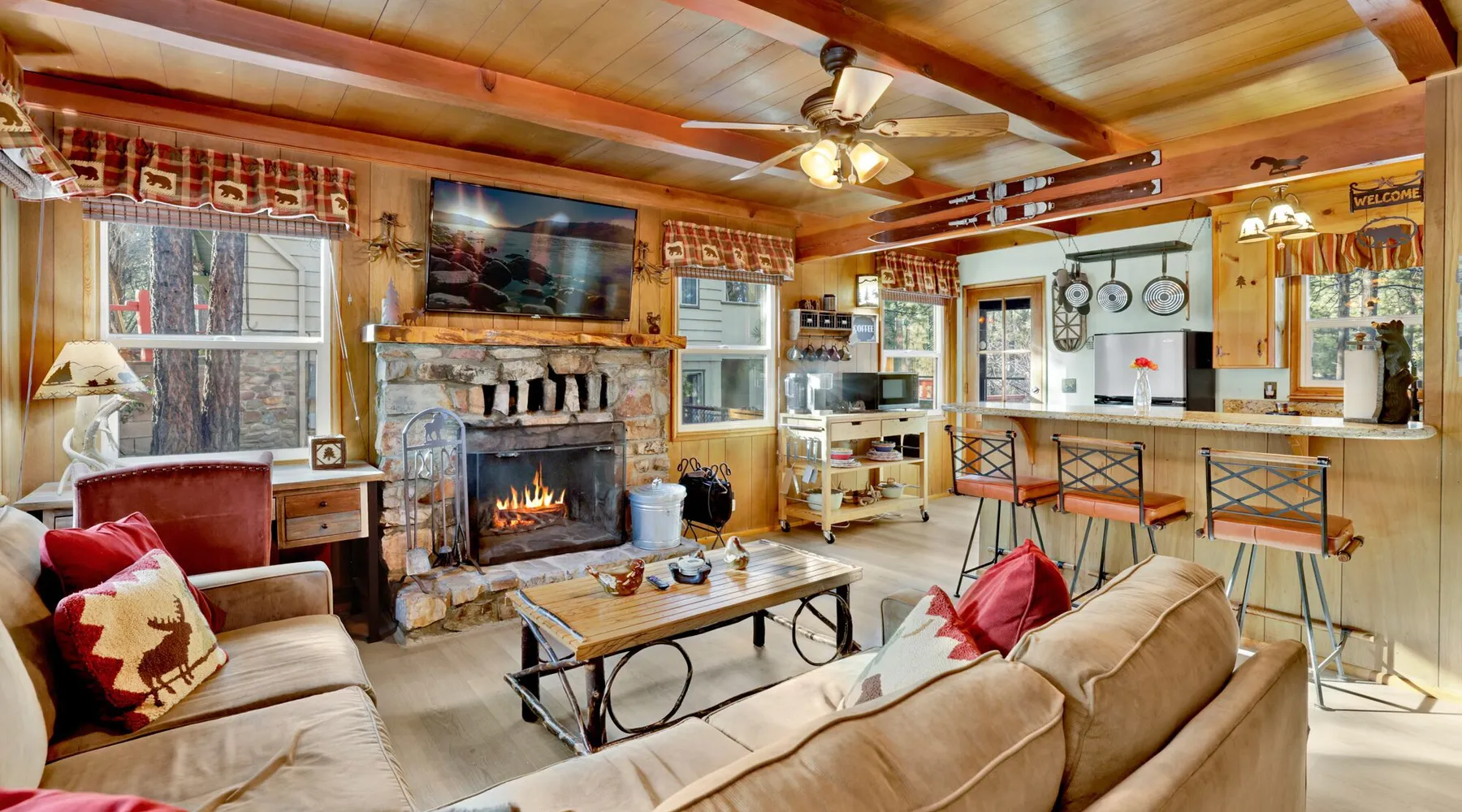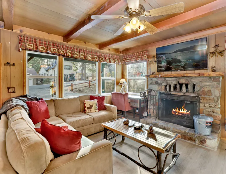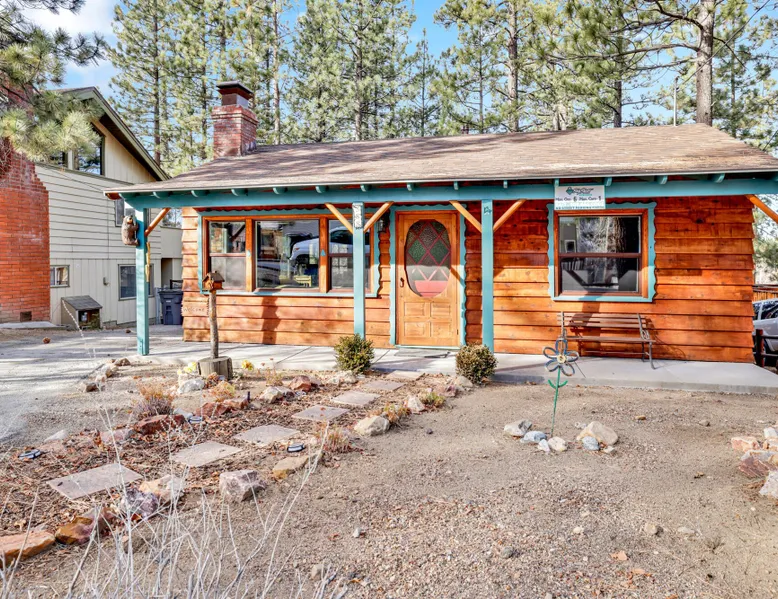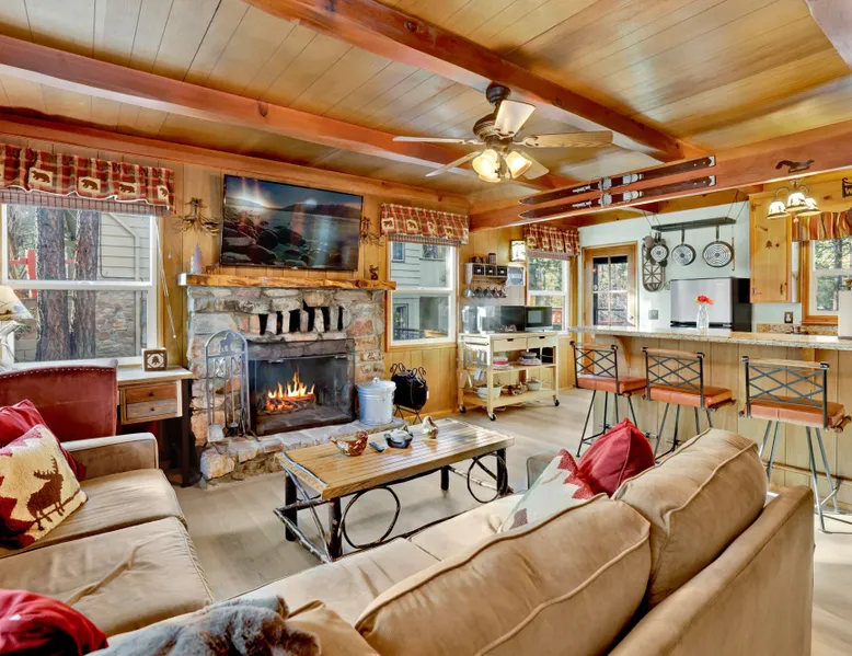 Kozy Cabin Big Bear | Walk to Village & Lake Cabin Nestled amidst the serene beauty of the mountains, Kozy Cabin offers you the perfect escape from the hustle and bustle of everyday life. This charming single level Sierra-style vintage cottage promises a cozy mountain cabin feel that will soothe your soul and provide a memorable getaway. Centrally located within a short walk to local activities and the lake you have the best of Big Bear right at your fingertips from this base camp cottage. Come see for yourselves! As you step inside your Kozy Cabin you'll be greeted with a warm and inviting interior, exposed wooden beams, and a toasty wood-burning fireplace where you can snuggle up together and warm your toes as you watch the snow falling from the big open windows. The ambiance is quintessentially rustic, allowing you to unwind and disconnect from the chaos of the modern world while enjoying a spacious open floor plan which leads seamlessly into the equipped chef's kitchen. Cookware and utensils along with general appliances and an adorable breakfast bar ensure that you have all that you need to whip up your home cooked holiday meals and slope side snacks for your adventures out on the mountain. Enjoy a great night of rest within two thoughtfully decorated bedrooms each offering charming furnishings, cozy bedding, and ample natural lighting from the big open windows which adds to the cabin's inviting atmosphere. Head out back to enjoy your natural surroundings including the spacious sun deck and forested back yard. You will love sipping your first cup of coffee in the mornings among the birds here or grilling up your freshly caught dinner from the lake on the BBQ as you unwind in the evenings. Located within a short walk to the shoreline, Village shops, or the ski resort this incredible location can't be beat no matter the season you choose to visit Big Bear. Come experience your new home away from home in the mountains today! Sleeping Arrangements: Bedroom 1: Queen Bed Bedroom 2: Full/Twin Bunk Set Bathroom Arrangements: Hallway Full Bath -Sleeps 3 -2 Cars Driveway Parking -2 Pets Welcome w/ Additional Fee -638 Total Square Feet City Permit #: VRR-2024-2172