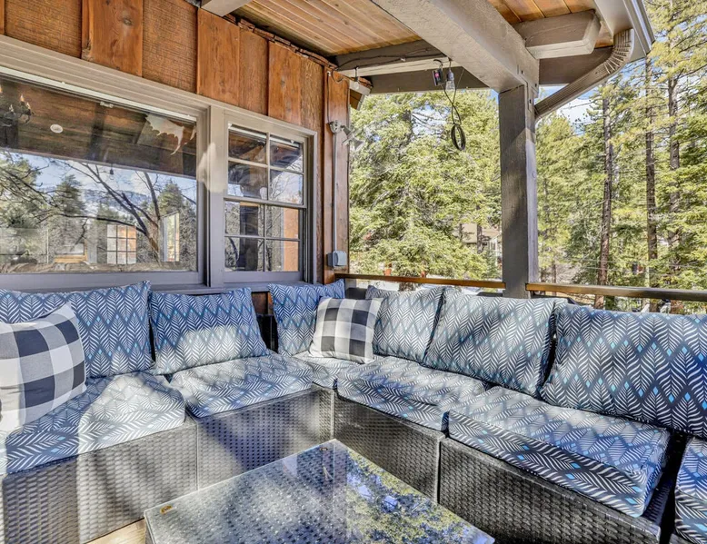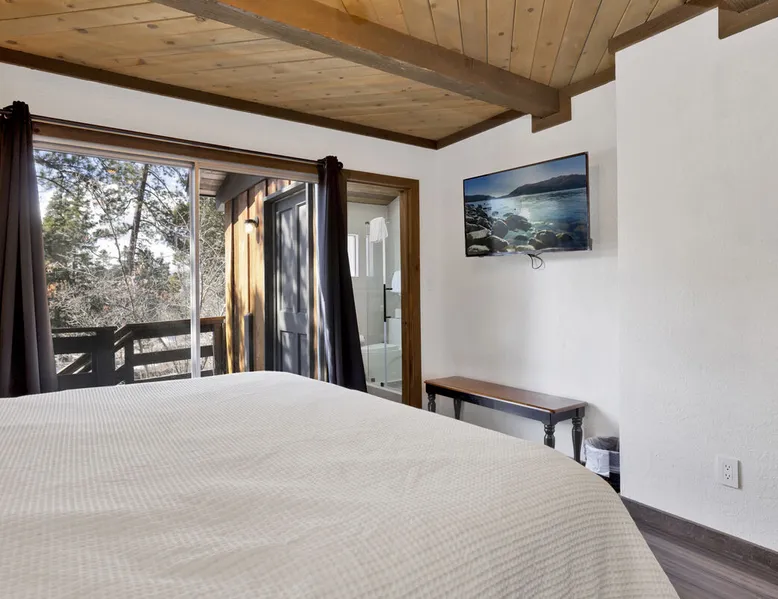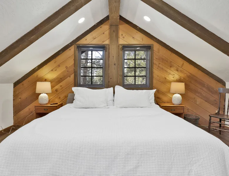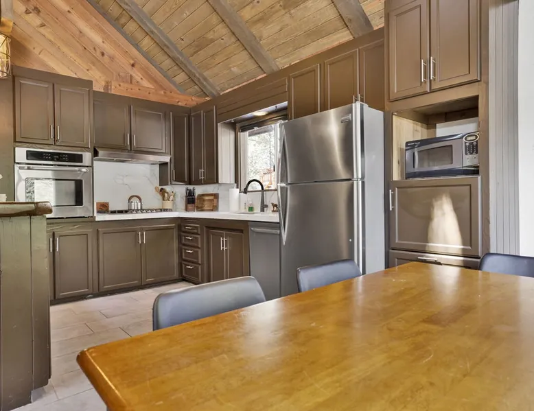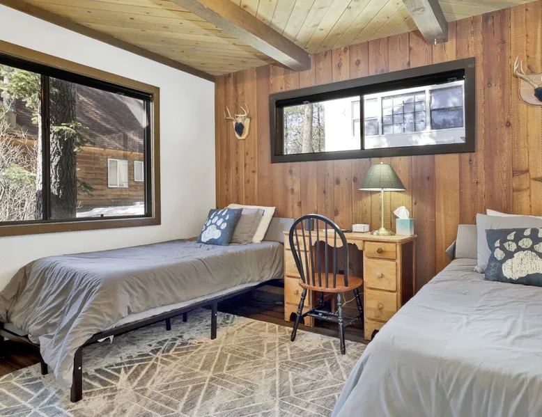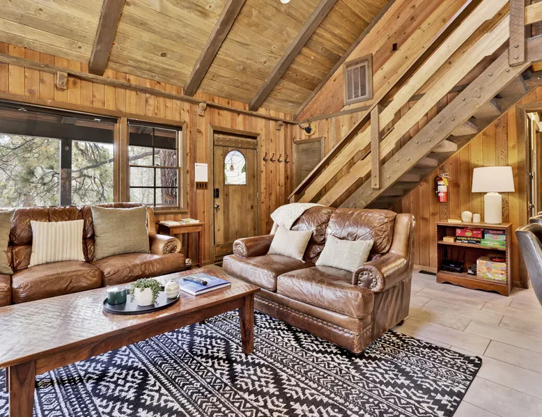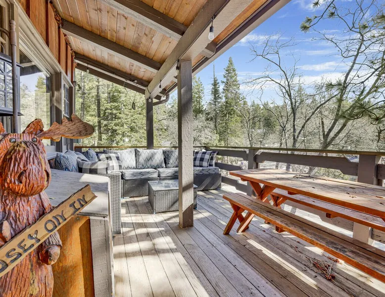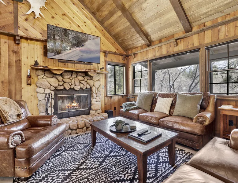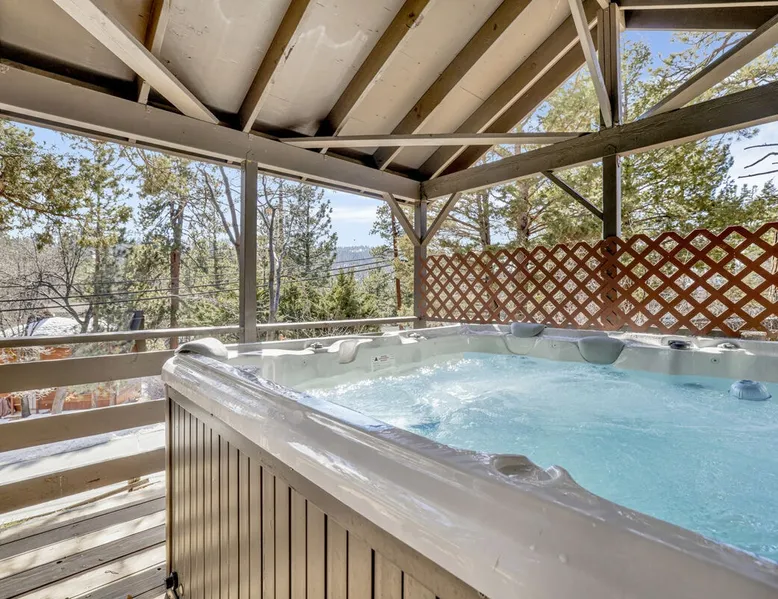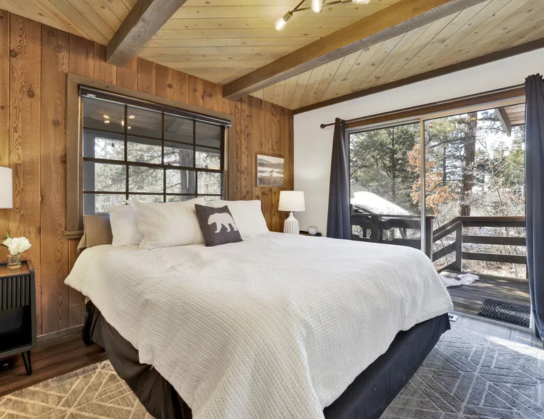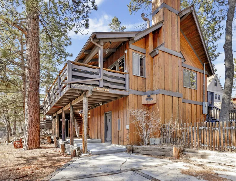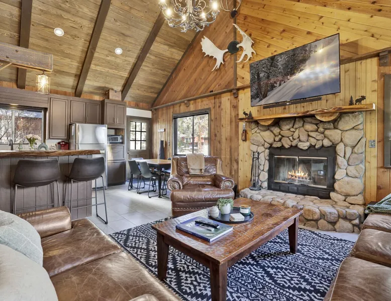 Moose Mountain Manor Retreat w/ Hot Tub A classic cabin in the woods, Moose Mountain Manor welcomes you to an unforgettable retreat in Big Bear. Located on a quiet yet central corner lot you are surrounded with soaring pine trees and incredible modern details like the stone fireplace, vaulted wood ceilings, and a spacious sun deck that makes you feel like you are in the trees. Come experience your next getaway to Big Bear here in this relaxing retreat. The space With all the outdoor activities of Big Bear available, you’ll certainly enjoy moments of indoor relaxation as well. Enter inside your chalet which perfectly blends rustic modern touches with classic cabin design. The main living area is sure to hold some of your trip’s best quality time with leather furnishings sat around a toasty fireplace, you will love warming your toes together as you watch the snow falling and pop on a movie on the mounted flat screen Streaming TV. The open floorplan is perfect for entertaining a group as it flows seamlessly into the spacious chef's kitchen with a full suite of appliances available. Cooking, visiting, eating, and lounging happens all at once and all together with breakfast barstools and the cute dining table adding plenty of sitting room for the whole group. Beautifully remodeled bedrooms and bathrooms provide the perfect amount of privacy and charm for any group no matter the occasion for your visit and are made up for your arrival with warm linens, blankets, pillows, and fresh bath towels for your group. Boasting not one but two primary suites with private baths as well as a spacious designer's delight guest bath that is full of well-appointed amenities and decor. Head outside to enjoy the spacious covered deck which offers panoramic slope views, outdoor patio furnishings, and a propane BBQ for you to grill up your freshly caught dinner from the lake. Head down the deck to your own private hot tub perfectly placed for privacy and comfort within a covered gazebo area- you will love soaking your muscles here after a great day of adventures out on the mountain. Moose Mountain Manor is a true gem of a destination for a group of friends, family vacation, or getaway with the girls- come experience the ultimate Big Bear vacation here for yourself today! Sleeping Arrangements: Bedroom 1: King Bed- Downstairs Entry Level Access to deck Bedroom 2: Two Twin Beds- Downstairs Entry Level Bedroom 3: King Bed, Streaming TV- Upstairs 2nd Level Bathroom Arrangements: Hallway Full Bath w/ Soaking Tub- Bedroom 2- Downstairs Entry Level Private 3/4 Bath- Bedroom 1- Downstairs Entry Level Private 3/4 Bath- Bedroom 3- Upstairs 2nd Level -Sleeps 6 -3 Car Driveway Parking -2 Pets Welcome w/ Additional Fees -1,206 Square Feet City Permit #: VRR- 2024-0423 Registration Details 2024-0423