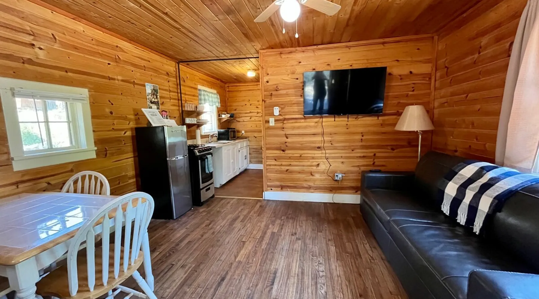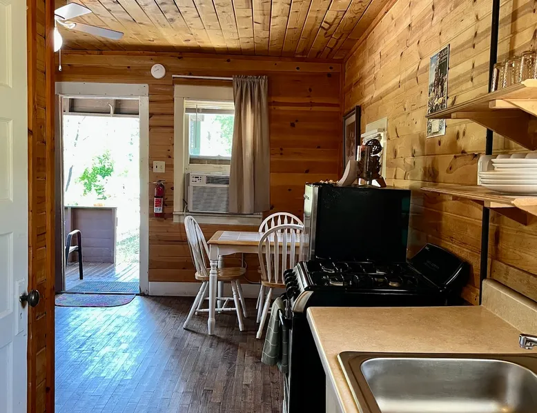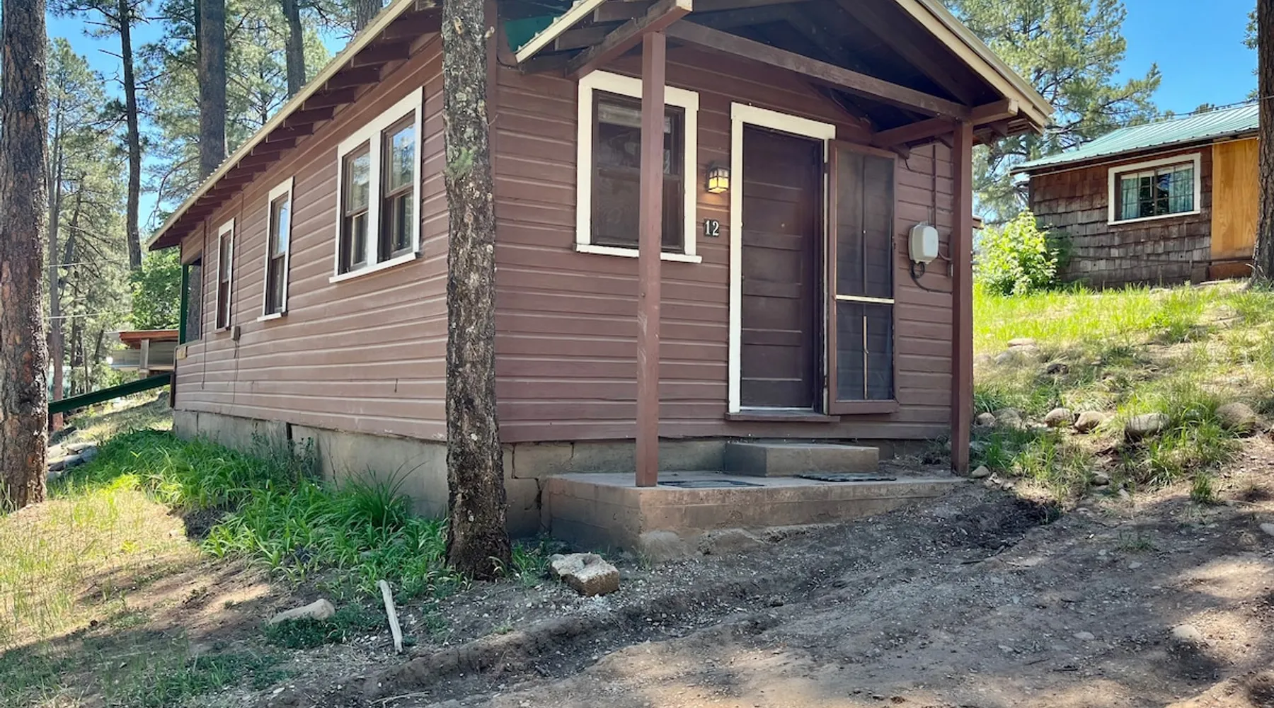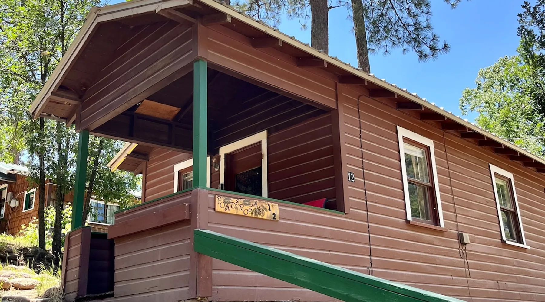 Casey's is on Ruidoso's main street, one block from the river and steps away from the Village's best restaurants, shops and cafes. Our cozy, rustic cabins have been the “Heart of Midtown” since their construction in the 1940s. The cabins vary in size from single bedrooms to large cabins that accommodate up to ten, making Casey's the perfect spot for individuals, couples or large groups looking to rent multiple cabins together at one convenient site. The space Butterfly is one of our top cabins, tucked away for privacy at the back of the property on Rio Street and Grindstone Road. It comes with a full kitchen, a queen bed, and an updated bathroom with a new toilet and shower. In the living room, there's a sofa that turns into a full-sized bed. The cabin has two entrances, one in the front and one in the back, so if both the bed and sofa are in use, each guest will have their own entrance. Although the view of the Ruidoso River from the two small porches is mostly blocked, you'll still feel the calming river atmosphere in this cozy rustic cabin, and you might even spot deer and elk. There's private parking right in front of the cabin. You'll have the entire cabin to yourself, and there's a shared yard out front where you can enjoy watching the seasonal parades on Sudderth Street.
