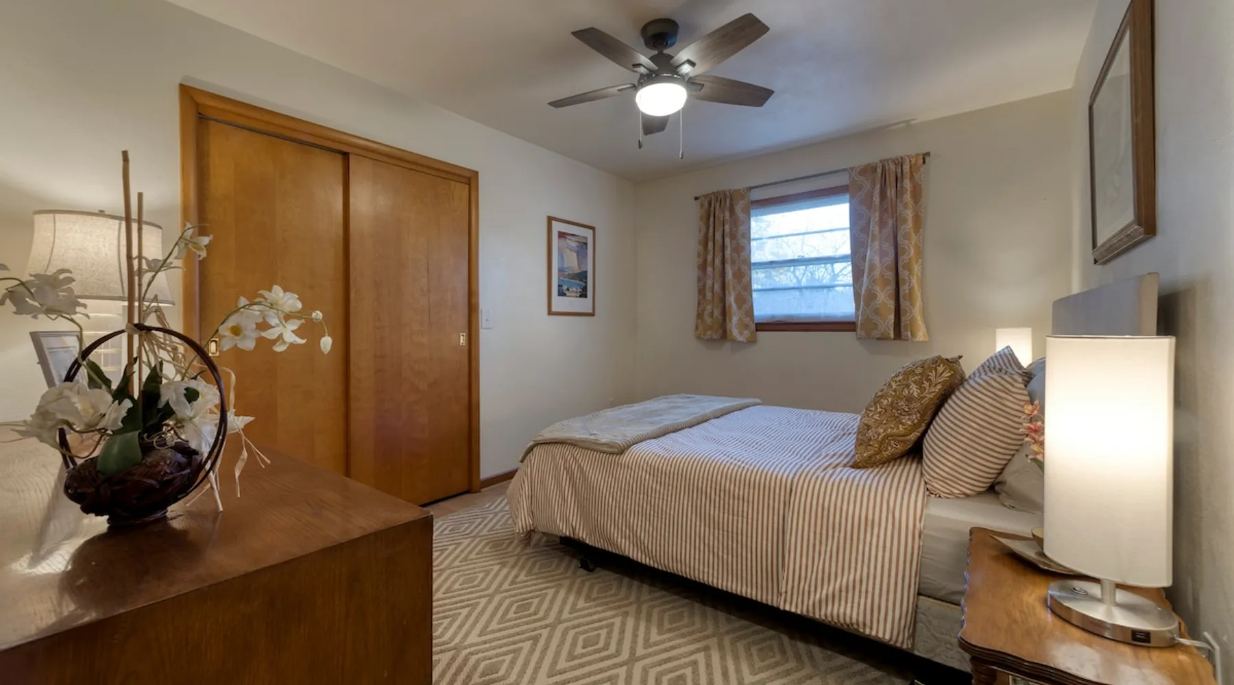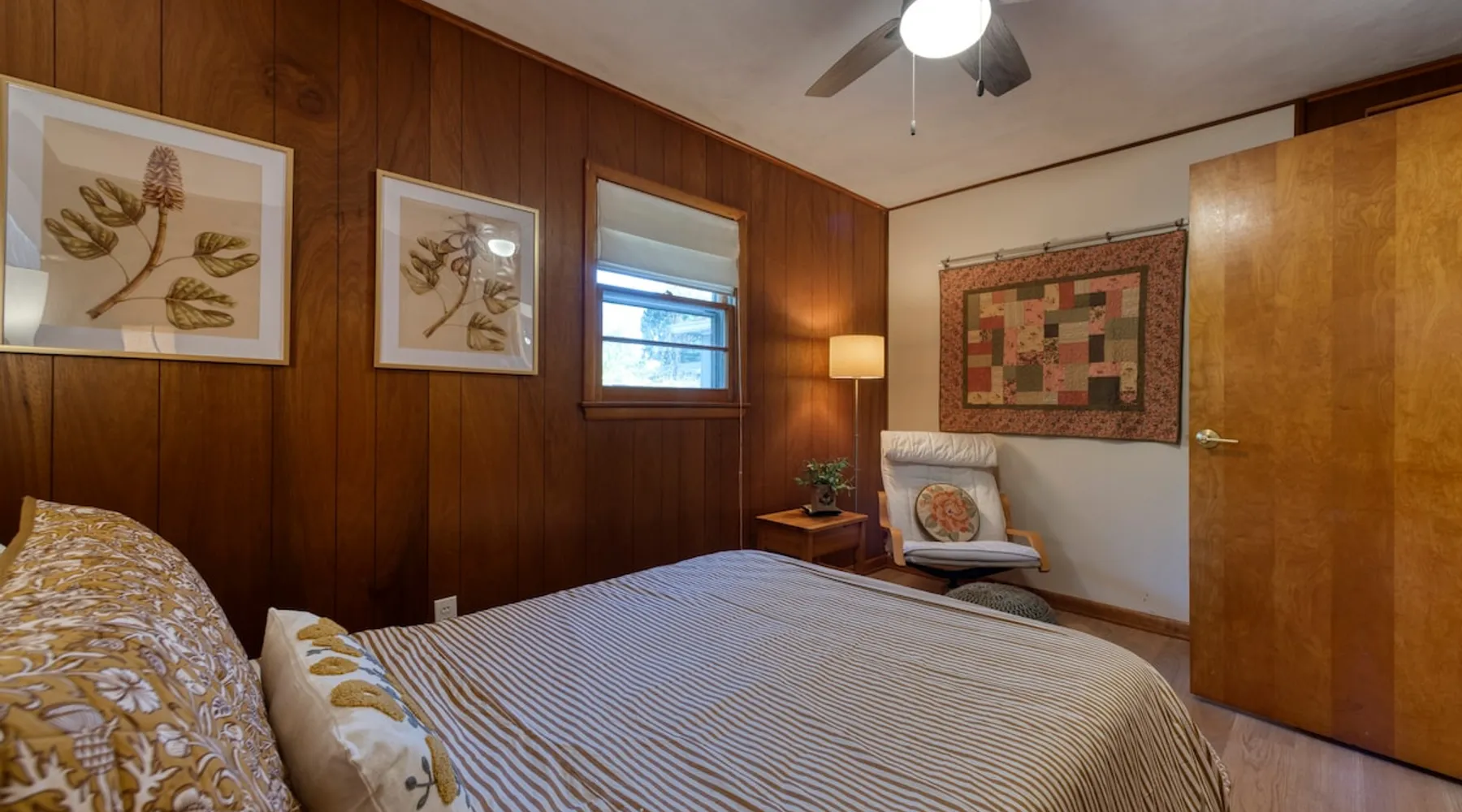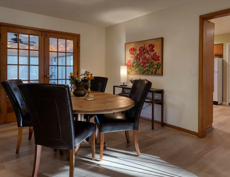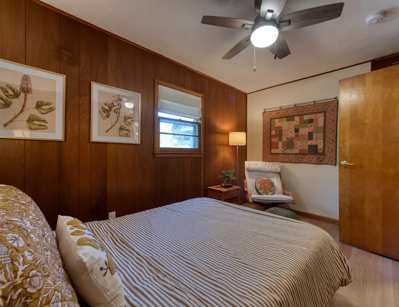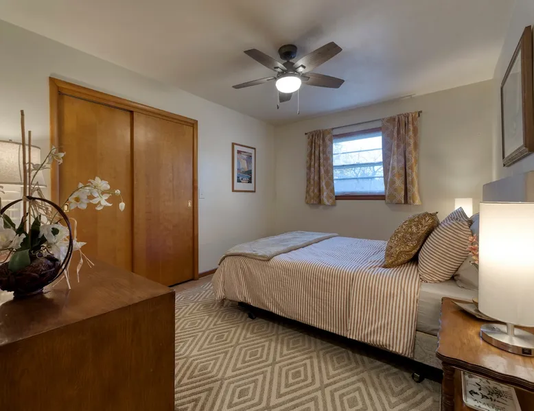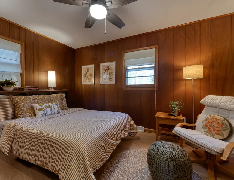 The Craig House's closeness to Indiana University, IU Health Hospital, and Meadowood Retirement Community and its accessibility features mean that no one needs to miss out on important events. A well-appointed ranch, it accommodates up to six Guests, including any that rely on a walker or wheelchair. Vintage furniture, artwork, and a quiet neighborhood create a comfortable retreat. It has high speed internet, a washer/dryer, a private driveway. Its proximity to everything makes it an ideal spot! The space Walk to IU sports events and save parking fees. Private driveway parks up to 4 vehicles. ADA compliant ramp from the driveway to the front deck. No-step entry. Living room is accessible by ramp or step. Main bedroom is wheelchair accessible with a 22" high queen bed. Blue bedroom is walker accessible with a 24" high queen bed. Paneled bedroom is walker accessible with a 23" high full bed. Bathroom is fully wheelchair accessible. Dining room seats six. Kitchen is well-equipped and features a complete laundry. Sunroom has three walls of louvered glass windows and vintage rattan furniture. Outdoor seating on the front deck. Guest access Indiana University athletic facilities are a 15-minute walk or 5-minute drive. Indiana University sororities and fraternities on David Baker Avenue are a 10-minute walk or a 3-minute drive. The Indiana University Auditorium and Memorial Union are a 35-minute walk or a 10-minute drive. The IU Health Hospital Bloomington is a 25-minute walk or a 4-minute drive. Meadowood Retirement Community is a 10-minute walk through the Griffy Lake Nature Preserve or a 3-minute drive. Other things to note At the end of the lane, Guests can enter the Griffy Lake Nature Preserve and meet up with the new 4.5 mile South Shore Loop Trail. Head east to arrive at the Griffy Lake Accessible Fishing Pier on the causeway. Head west and follow the trail cross the top of the Griffy Lake dam. Hosts Lauren and Peter Cowan bought the house from Wayne Craig, their neighbor and longtime resident of this close-knit neighborhood. Friendly and courtly, Wayne always had time to chat, especially when walking his dog. Wayne was a career staff member at Indiana University. In 1994 he was awarded the Thomas Hart Benton Mural Medallion for distinguished service and retired three years later as Director of University Ceremonies. As the owners of Agewise Design LLC, Lauren and Peter recognized the need for accessible short-term housing in Bloomington. They created the Craig House as a tribute to Wayne.