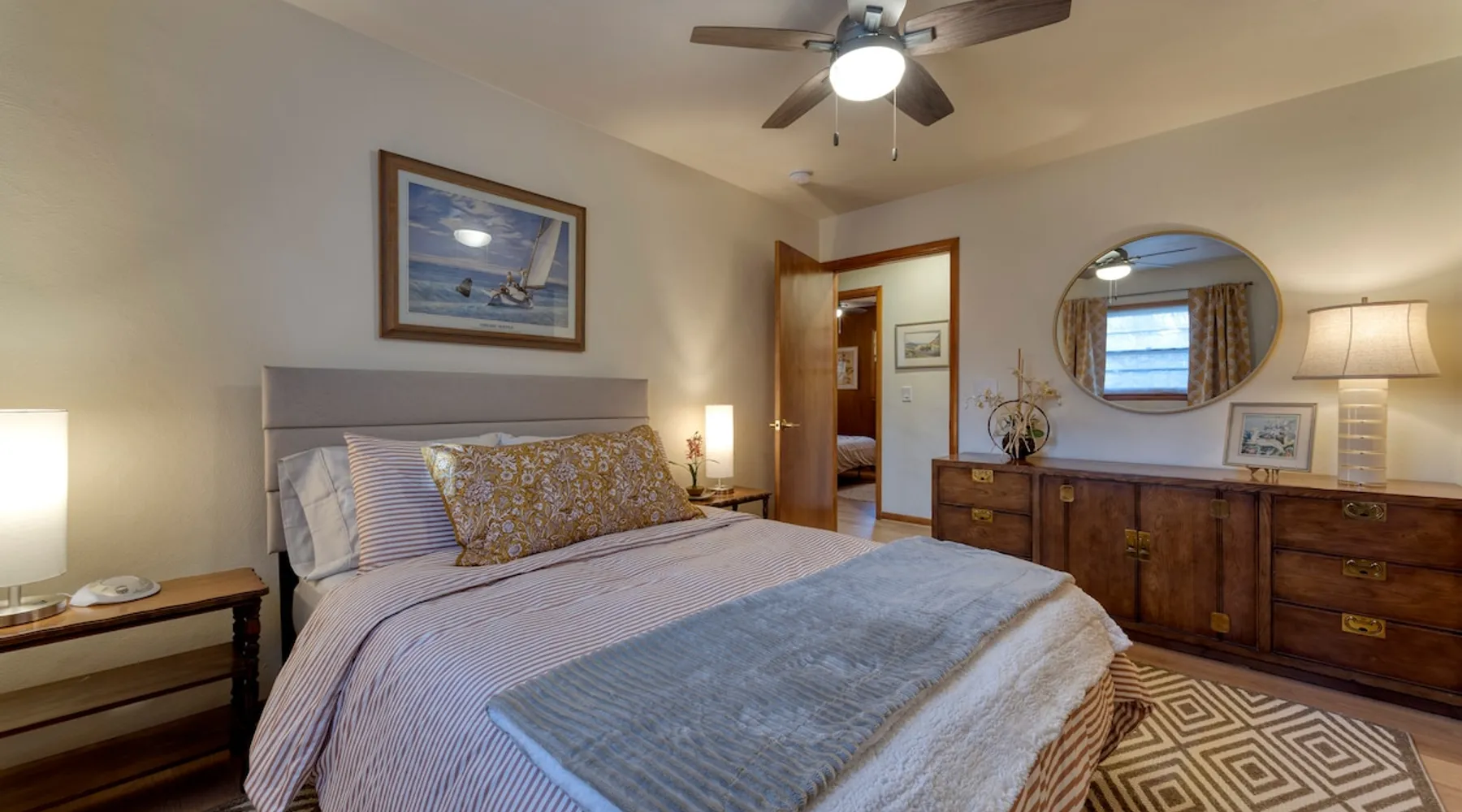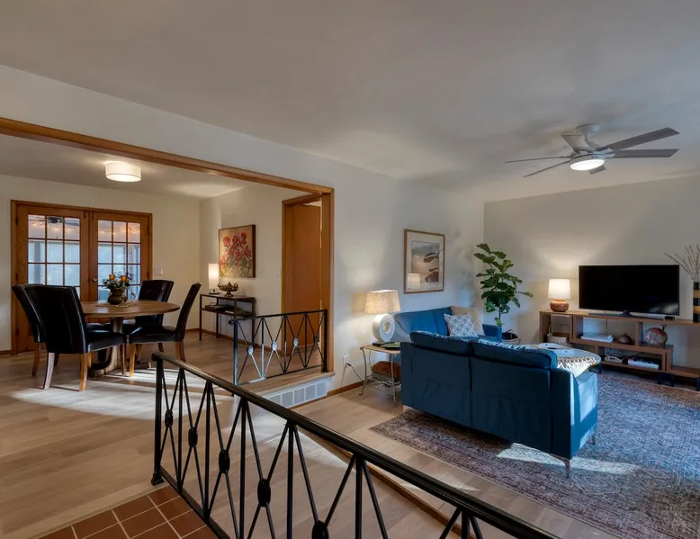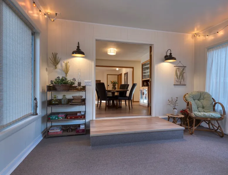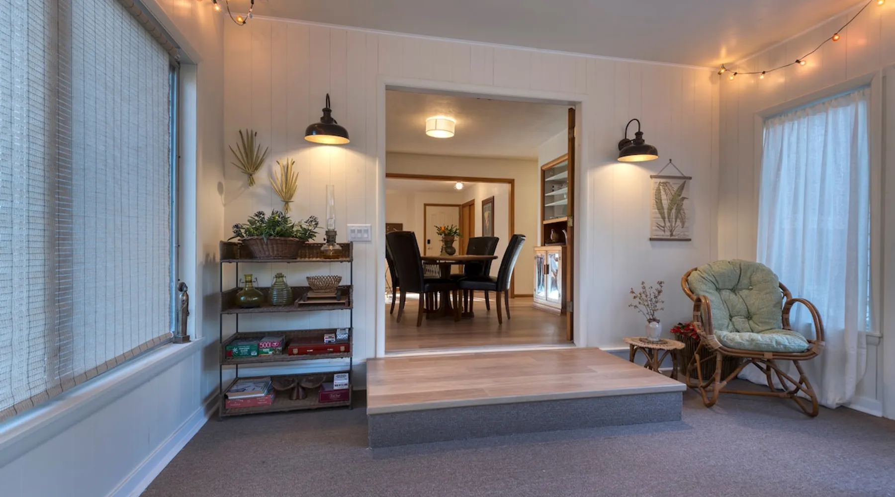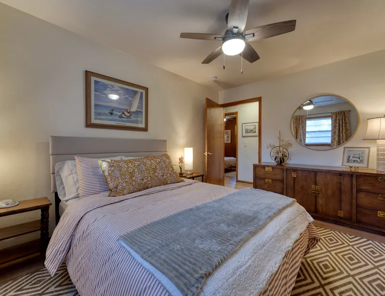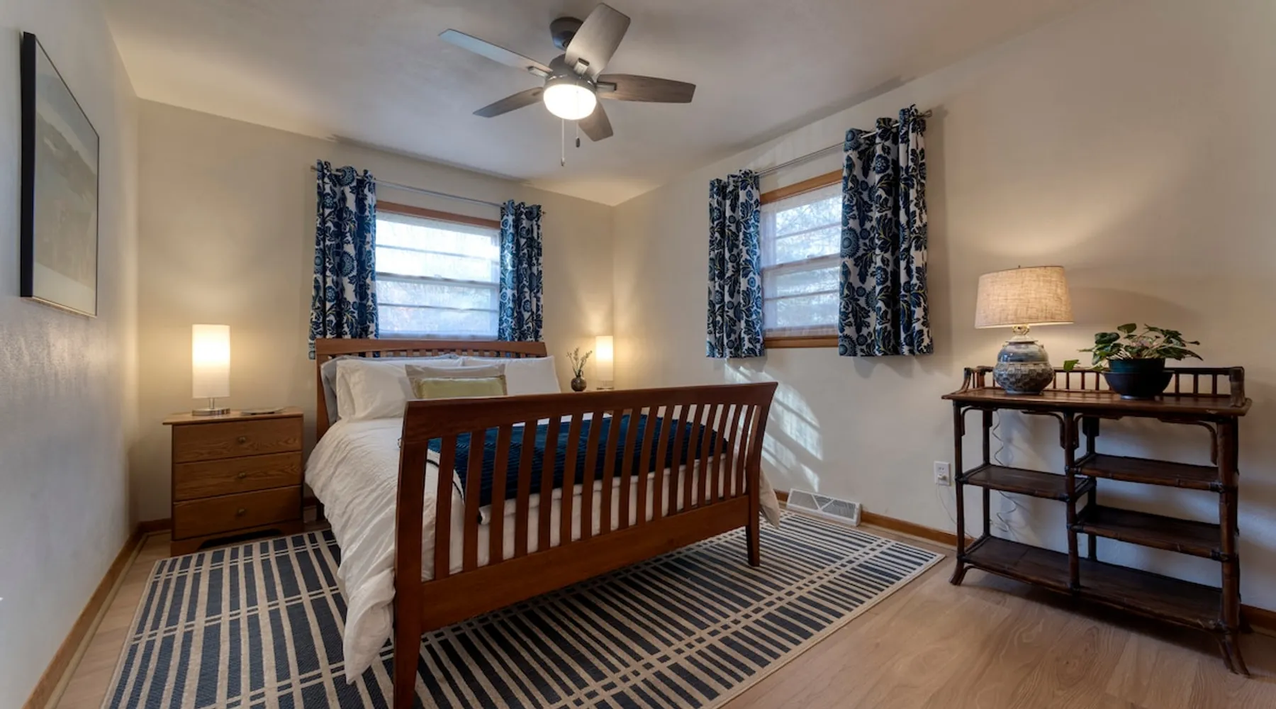 The Craig House's closeness to Indiana University, IU Health Hospital, and Meadowood Retirement Community and its accessibility features mean that no one needs to miss out on important events. A well-appointed ranch, it accommodates up to six Guests, including any that rely on a walker or wheelchair. Vintage furniture, artwork, and a quiet neighborhood create a comfortable retreat. It has high speed internet, a washer/dryer, a private driveway. Its proximity to everything makes it an ideal spot! The space Walk to IU sports events and save parking fees. Private driveway parks up to 4 vehicles. ADA compliant ramp from the driveway to the front deck. No-step entry. Living room is accessible by ramp or step. Main bedroom is wheelchair accessible with a 22" high queen bed. Blue bedroom is walker accessible with a 24" high queen bed. Paneled bedroom is walker accessible with a 23" high full bed. Bathroom is fully wheelchair accessible. Dining room seats six. Kitchen is well-equipped and features a complete laundry. Sunroom has three walls of louvered glass windows and vintage rattan furniture. Outdoor seating on the front deck. Guest access Indiana University athletic facilities are a 15-minute walk or 5-minute drive. Indiana University sororities and fraternities on David Baker Avenue are a 10-minute walk or a 3-minute drive. The Indiana University Auditorium and Memorial Union are a 35-minute walk or a 10-minute drive. The IU Health Hospital Bloomington is a 25-minute walk or a 4-minute drive. Meadowood Retirement Community is a 10-minute walk through the Griffy Lake Nature Preserve or a 3-minute drive. Other things to note At the end of the lane, Guests can enter the Griffy Lake Nature Preserve and meet up with the new 4.5 mile South Shore Loop Trail. Head east to arrive at the Griffy Lake Accessible Fishing Pier on the causeway. Head west and follow the trail cross the top of the Griffy Lake dam. Hosts Lauren and Peter Cowan bought the house from Wayne Craig, their neighbor and longtime resident of this close-knit neighborhood. Friendly and courtly, Wayne always had time to chat, especially when walking his dog. Wayne was a career staff member at Indiana University. In 1994 he was awarded the Thomas Hart Benton Mural Medallion for distinguished service and retired three years later as Director of University Ceremonies. As the owners of Agewise Design LLC, Lauren and Peter recognized the need for accessible short-term housing in Bloomington. They created the Craig House as a tribute to Wayne.