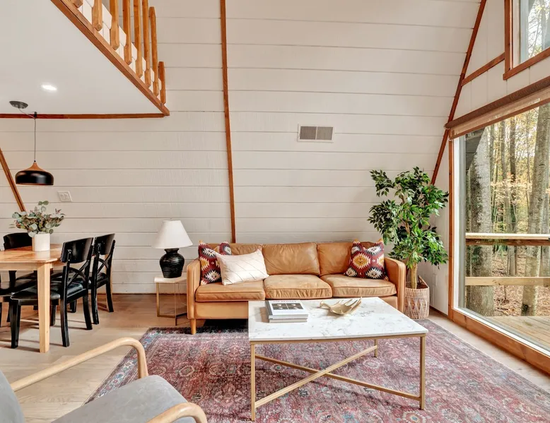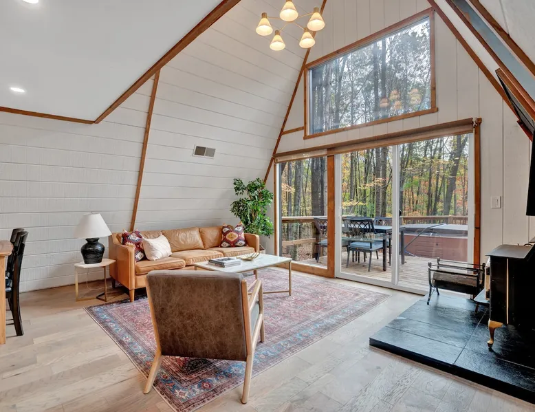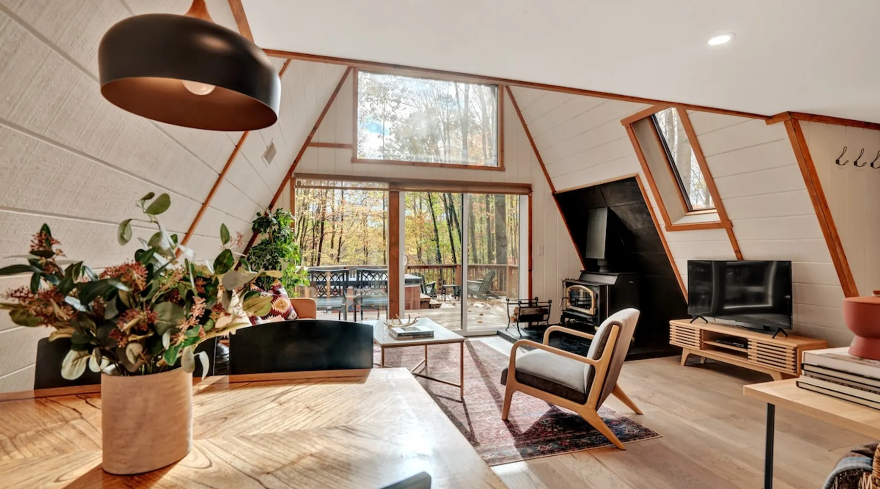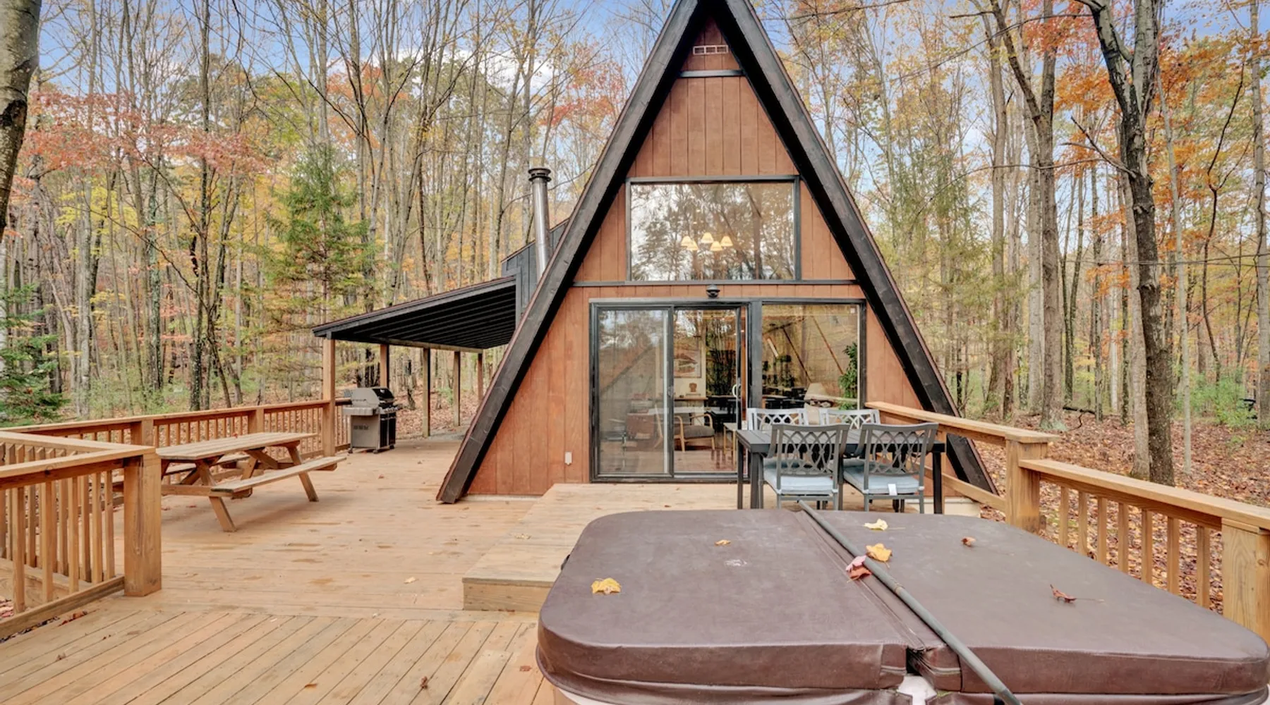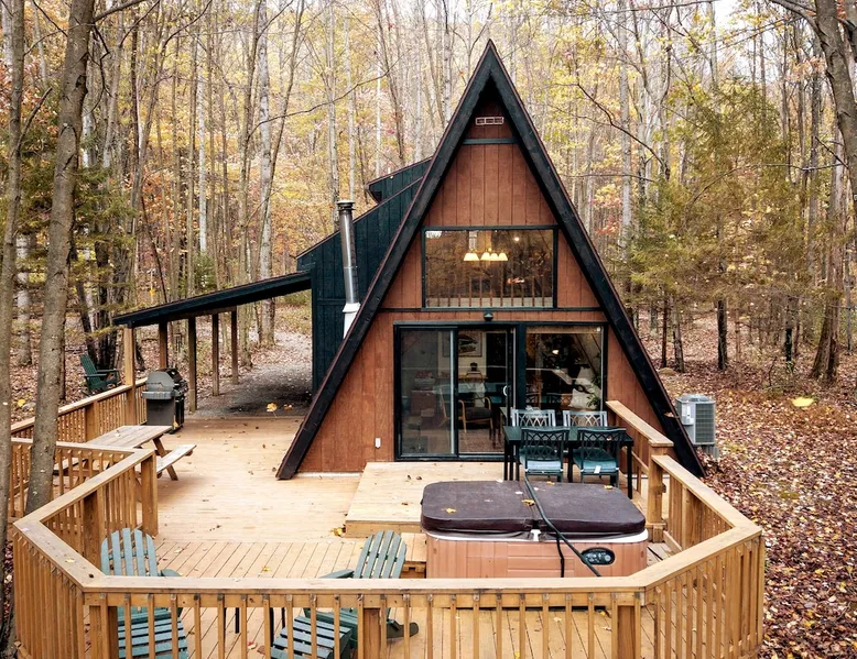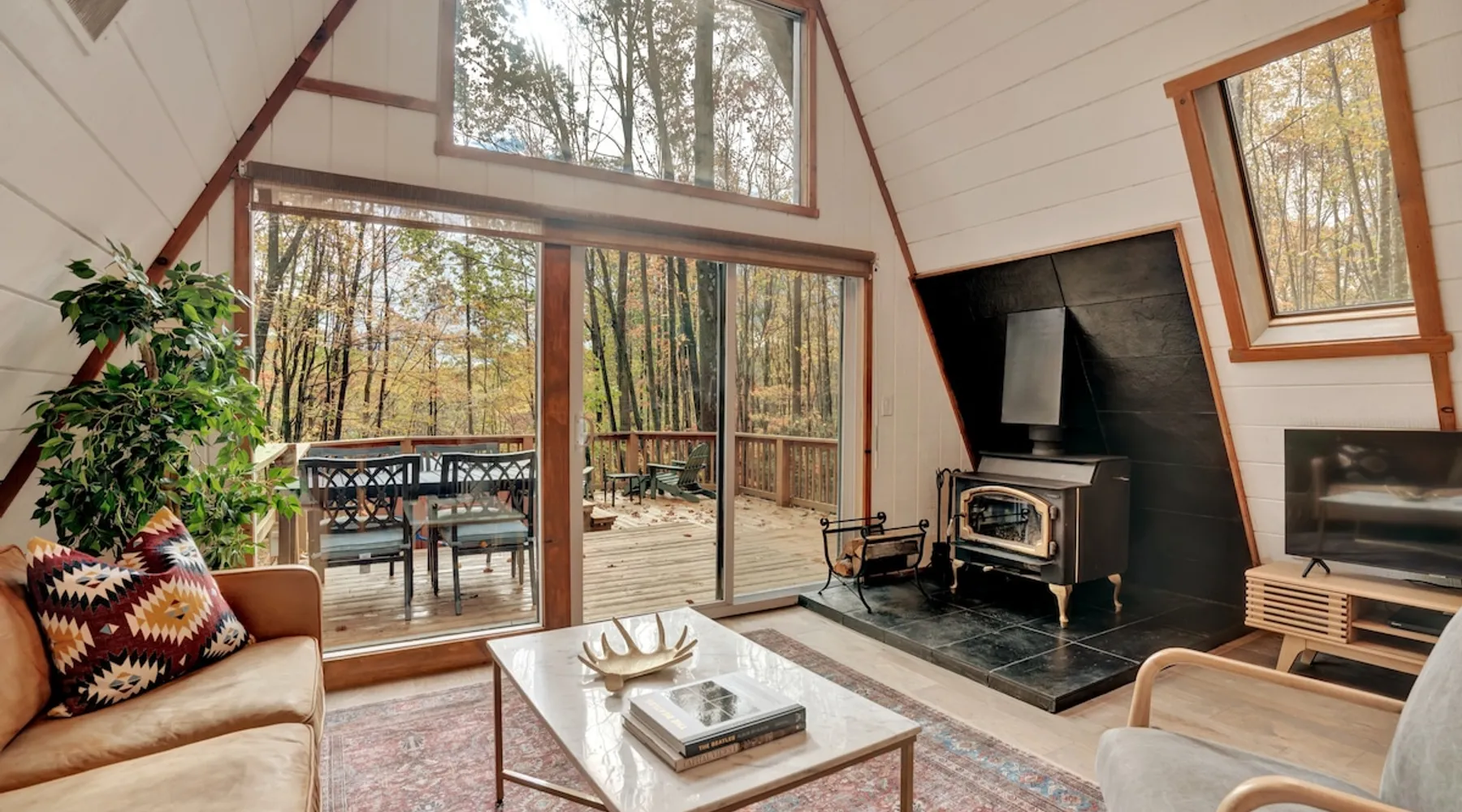 Welcome to @dreamtimestays A-Frame. A fantastic, owner renovated & designed, two-bedroom, two-bathroom A-frame cabin tucked away in a semi-secluded area, close to Berkeley Springs, WV. The cabin and the entire community it's part of are surrounded by tall trees on the mountainside. Quick access to nearby trails, mins to Berkeley Springs Brewing Co. Cold Run Valley Winery, and Cacapon Resort State Park. Find yourself in the town center with highly rated local restaurants & cafés. The space AMENITIES YOU WILL LOVE The Top Wish-listed Dreamtime A-Frame Cabin is fully equipped to be your home-away-from-home with a touch of luxury. The kitchen is furnished with stainless steel appliances, quartz countertops, and all you need for coffee & tea each morning! Enjoy your meals together around the dining table, or take it to the deck for an epic BBQ next to your private picnic table. This modern A-frame Cabin includes a flatscreen TV with Roku streaming apps (require guest login), Roku live TV, and WiFi. (A note about WiFi: due to the remote location of the cabin in West Virginia's mountainous terrain, we offer WiFi through a hotspot which may be spotty at times.). Gather around the wood fireplace/stove next to a massive glass door and windows with a picturesque view. Bedrooms include a master with a king bed and one queen bedroom (for a total of four). With two full bathrooms, there is plenty of space for everyone to keep up with daily routines. FAQs: Q: Do you have a fire pit? A: We don't have a fire pit due to the fire risk in the area, but check out the pictures of our living room with the wood stove. Q: Can we bring a 5th person? A: We're unfortunately strict about the number of guests due to many reasons, such as the living space, and other reasons, such as putting too much pressure on the infrastructure. Q: Should we bring our firewood? Do you charge for it? A: We stock plenty of firewood during the winter and cooler times of the year from October to April, and you will have access to the entire stack during your stay. Guest access Keyless Entry. We will message your unique entry code 3 days before arrival, along with our house manual and our recommendations for local eateries, hiking, kayaking, and so on. Other things to note Wi-fi is provided via a hotspot due to the remote location of our cabin; it provides plenty of speed for audio/video calls, video streaming, and so on, but it may be spotty sometimes. We're a pet-friendly property and can accommodate a dog up to 50 lbs (see our house rules for further info). Please ensure your pet is added to your booking.