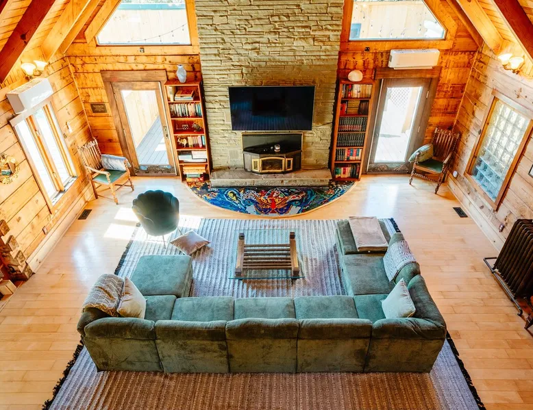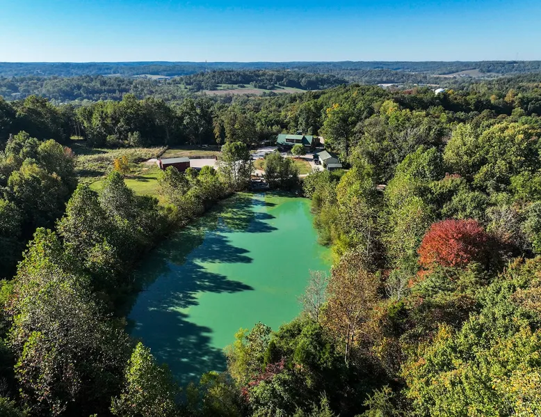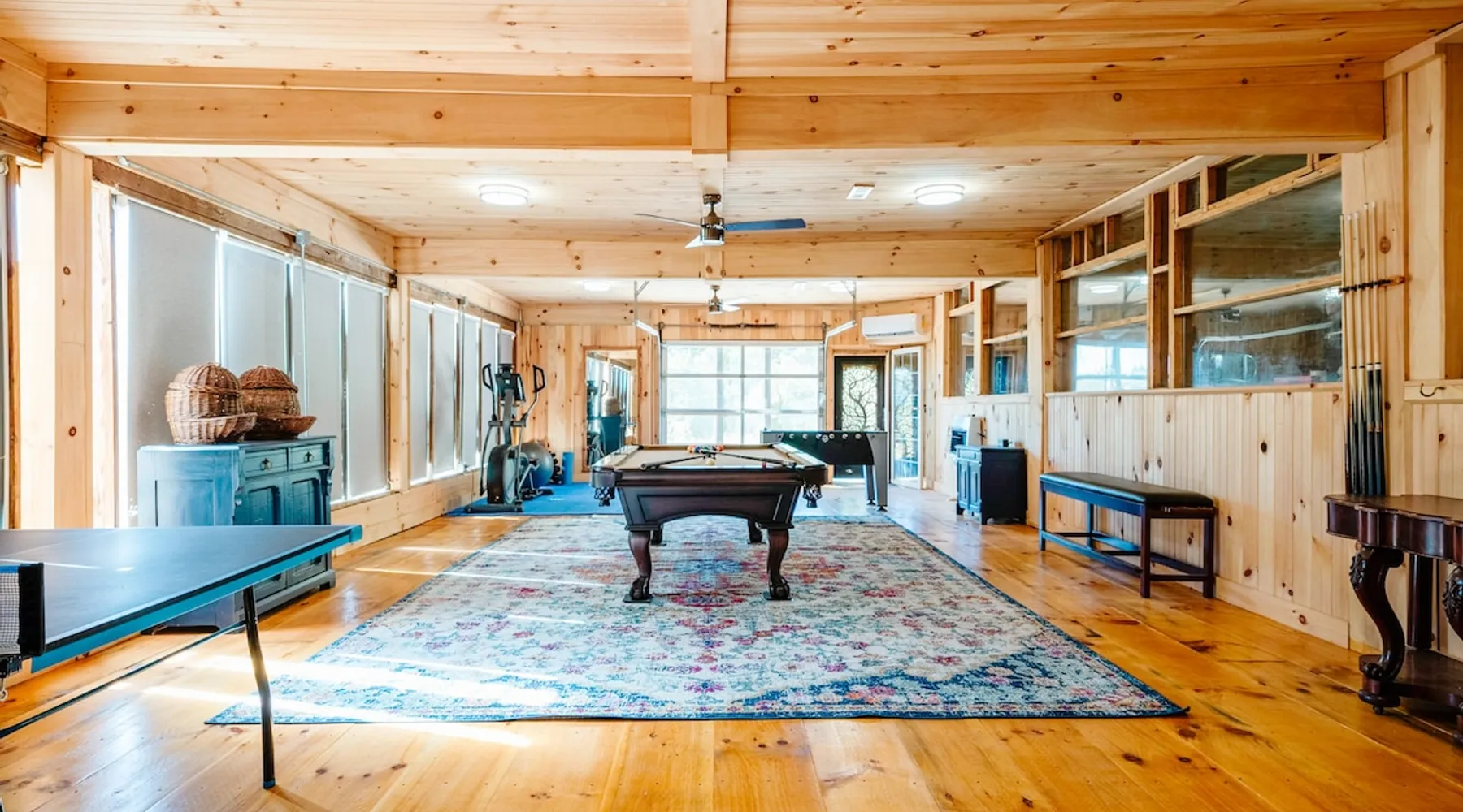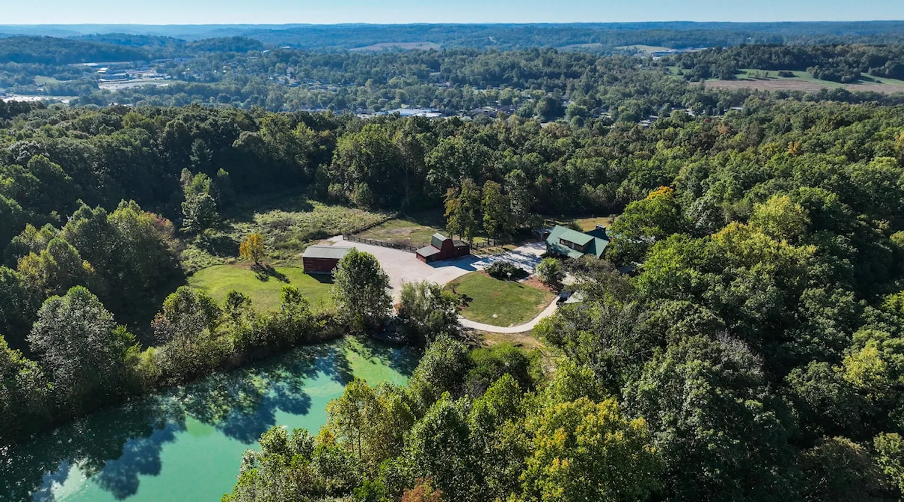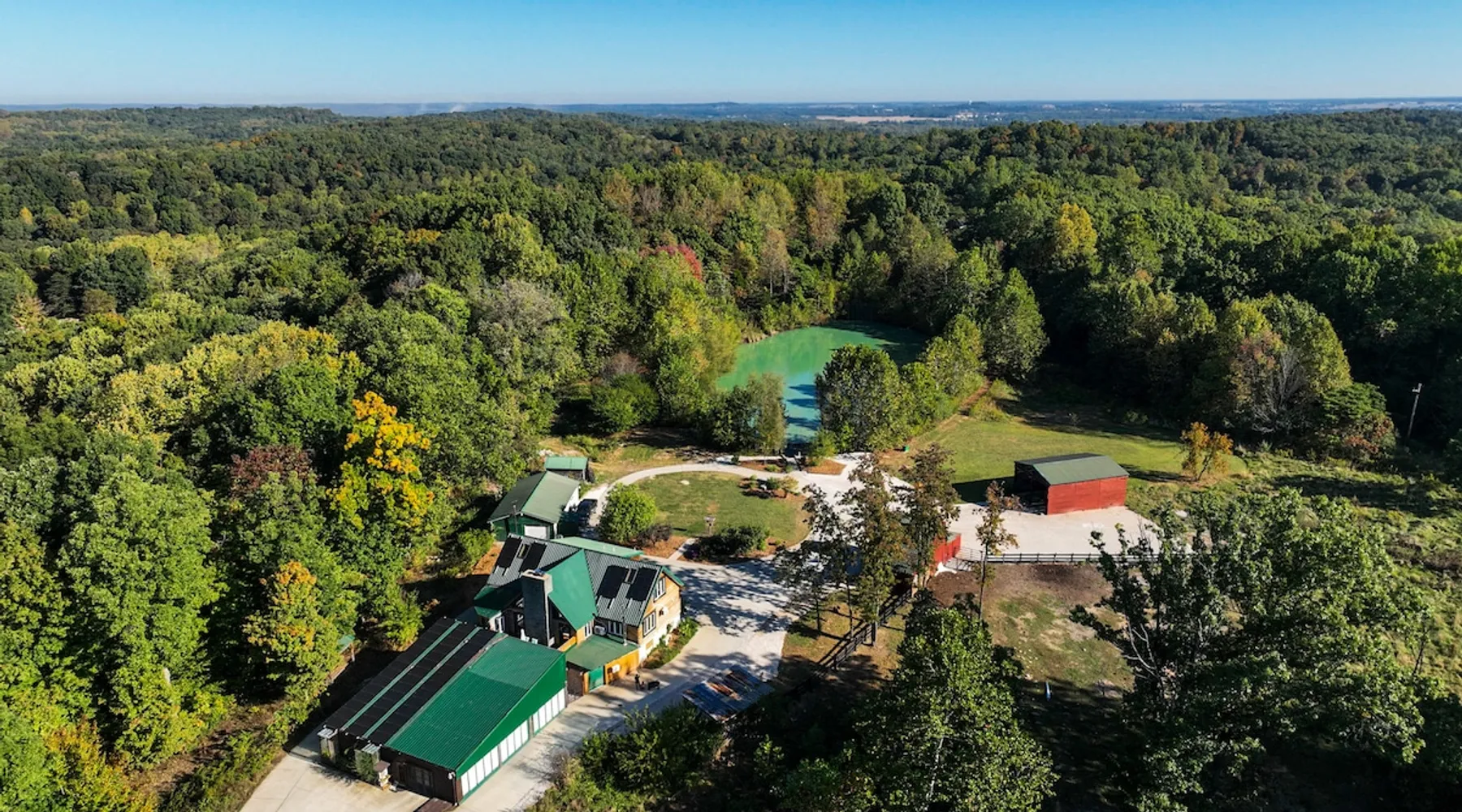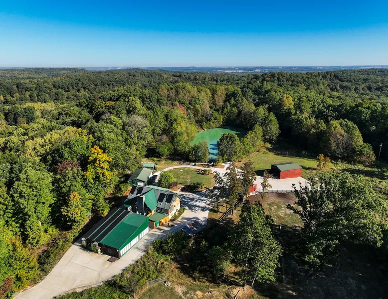 Majestic timber home on 20 private acres with swimming pond, heated indoor pool, hot tub, rec room with pool table, ping pong, foosball and free weights, extensive gardens and walking paths on property. Cows, sheep, goats & donkeys in fully fenced pasture land/barnyard. Sleeps 12+ 8 min to Paoli Peaks 15 minutes to French Lick 35 minutes to Patoka Lake (boating, fishing, hiking) One hour to Bloomington One hour to Louisville (SDF airport) The space •Huge main living room with 26ft vaulted ceilings, extra large super comfy couch, 70-inch TV. •Second living room with book shelves, games, 55-inch TV. •Fully equipped kitchen with drip coffee and pour over, complementary coffee beans, oatmeal and snacks. Electric range, oven, microwave, dishwasher, toaster, full-size refrigerator and mini-fridge. •Second fully equipped kitchen with French-door refrigerator, microwave, oven/stove, dishwasher, toaster, drip coffee maker. •Formal dining room with eight-seat dining table. •Second indoor dining area with seating for four. •Outdoor dining area with seating for six. •Large jacuzzi tub in upstairs bathroom. • Additional seating area/reading nook or optional nursery space • Kids play spaces upstairs with mini couches, toy chests and stuffed animals. •Rec room with pool table, ping pong, foosball, elliptical machine, free weights, 65-inch TV. •40ft indoor heated swimming pool. 4ft depth across. •Walking trail around lake Guest access Guests have access to all parts of the property except for barns, workshop and barnyard. Other things to note This property has a small menagerie of retired animal friends, including donkeys, cows, sheep and goats. They love compliments, and being serenaded. No fishing allowed in the lake. It is stocked with only koi and rescued turtles.