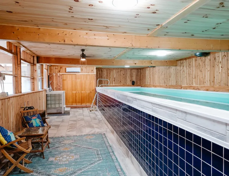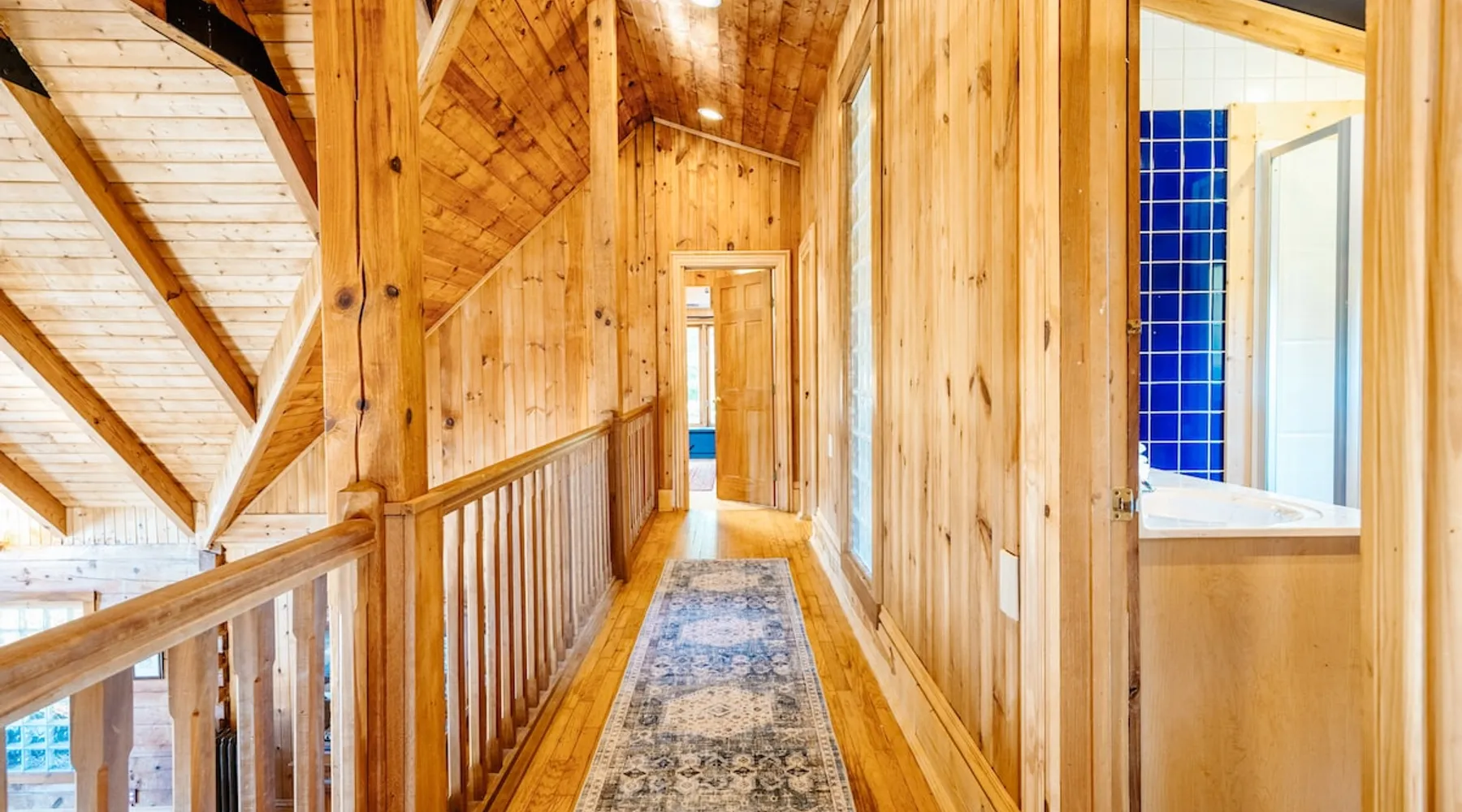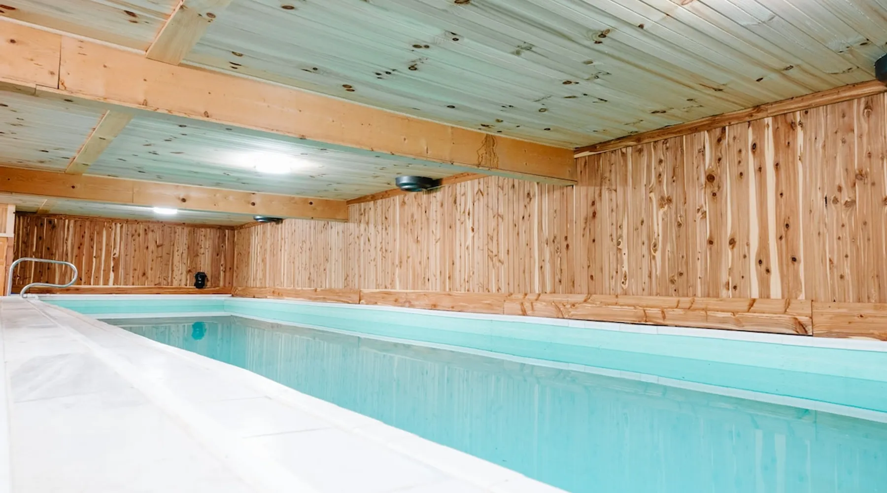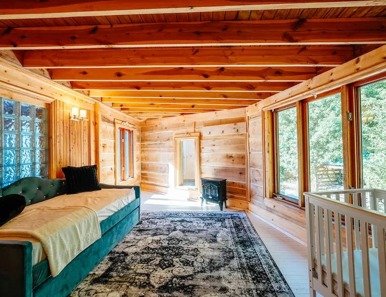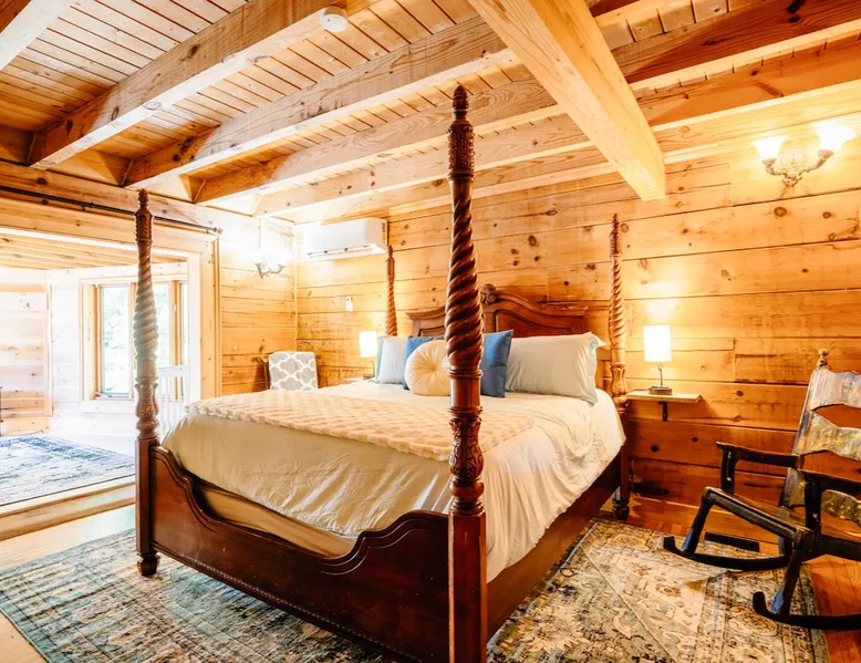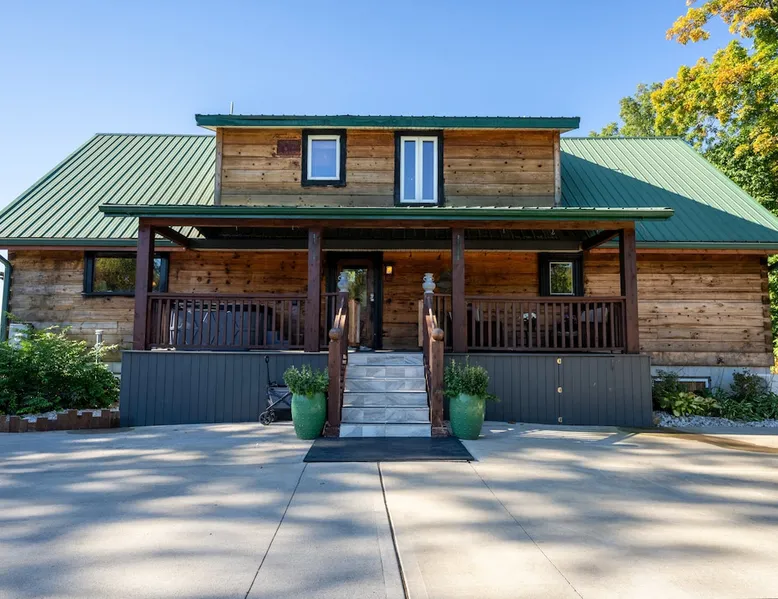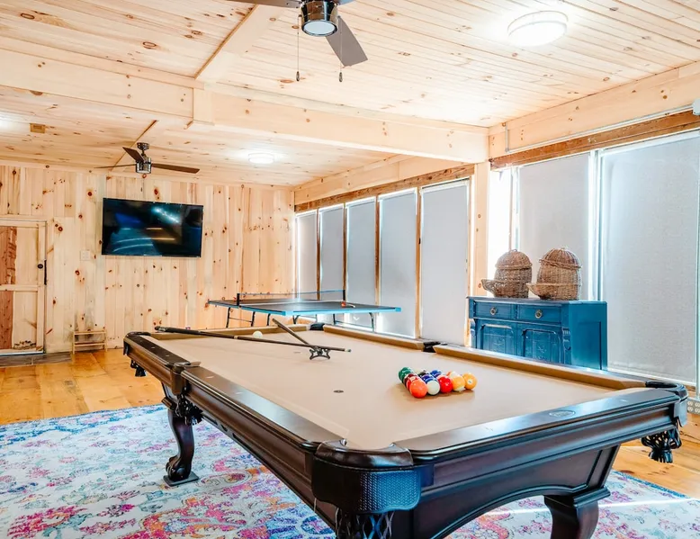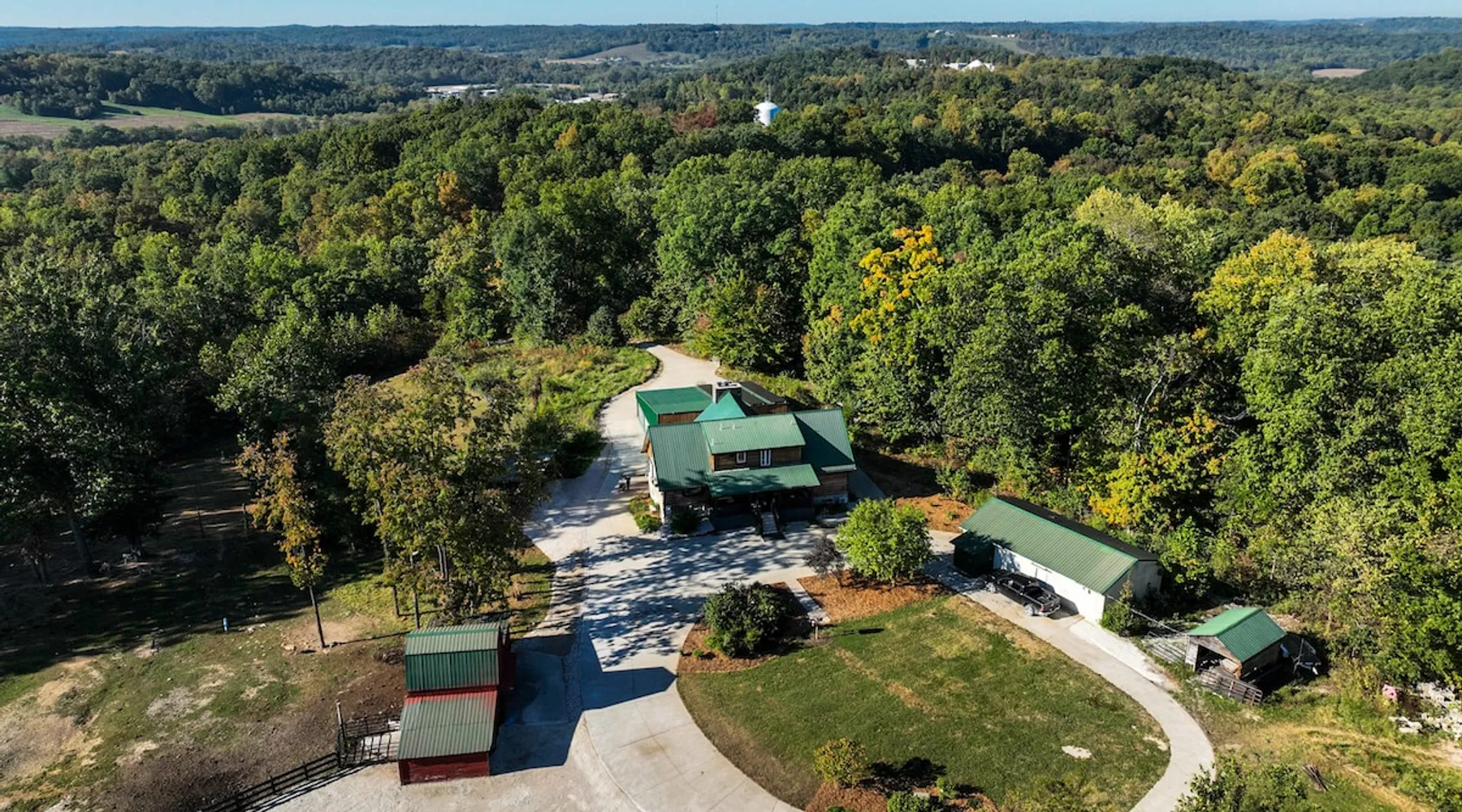Majestic timber home on 20 private acres with swimming pond, heated indoor pool, hot tub, rec room with pool table, ping pong, foosball and free weights, extensive gardens and walking paths on property. Cows, sheep, goats & donkeys in fully fenced pasture land/barnyard. Sleeps 12+ 8 min to Paoli Peaks 15 minutes to French Lick 35 minutes to Patoka Lake (boating, fishing, hiking) One hour to Bloomington One hour to Louisville (SDF airport) The space •Huge main living room with 26ft vaulted ceilings, extra large super comfy couch, 70-inch TV. •Second living room with book shelves, games, 55-inch TV. •Fully equipped kitchen with drip coffee and pour over, complementary coffee beans, oatmeal and snacks. Electric range, oven, microwave, dishwasher, toaster, full-size refrigerator and mini-fridge. •Second fully equipped kitchen with French-door refrigerator, microwave, oven/stove, dishwasher, toaster, drip coffee maker. •Formal dining room with eight-seat dining table. •Second indoor dining area with seating for four. •Outdoor dining area with seating for six. •Large jacuzzi tub in upstairs bathroom. • Additional seating area/reading nook or optional nursery space • Kids play spaces upstairs with mini couches, toy chests and stuffed animals. •Rec room with pool table, ping pong, foosball, elliptical machine, free weights, 65-inch TV. •40ft indoor heated swimming pool. 4ft depth across. •Walking trail around lake Guest access Guests have access to all parts of the property except for barns, workshop and barnyard. Other things to note This property has a small menagerie of retired animal friends, including donkeys, cows, sheep and goats. They love compliments, and being serenaded. No fishing allowed in the lake. It is stocked with only koi and rescued turtles.