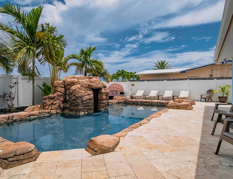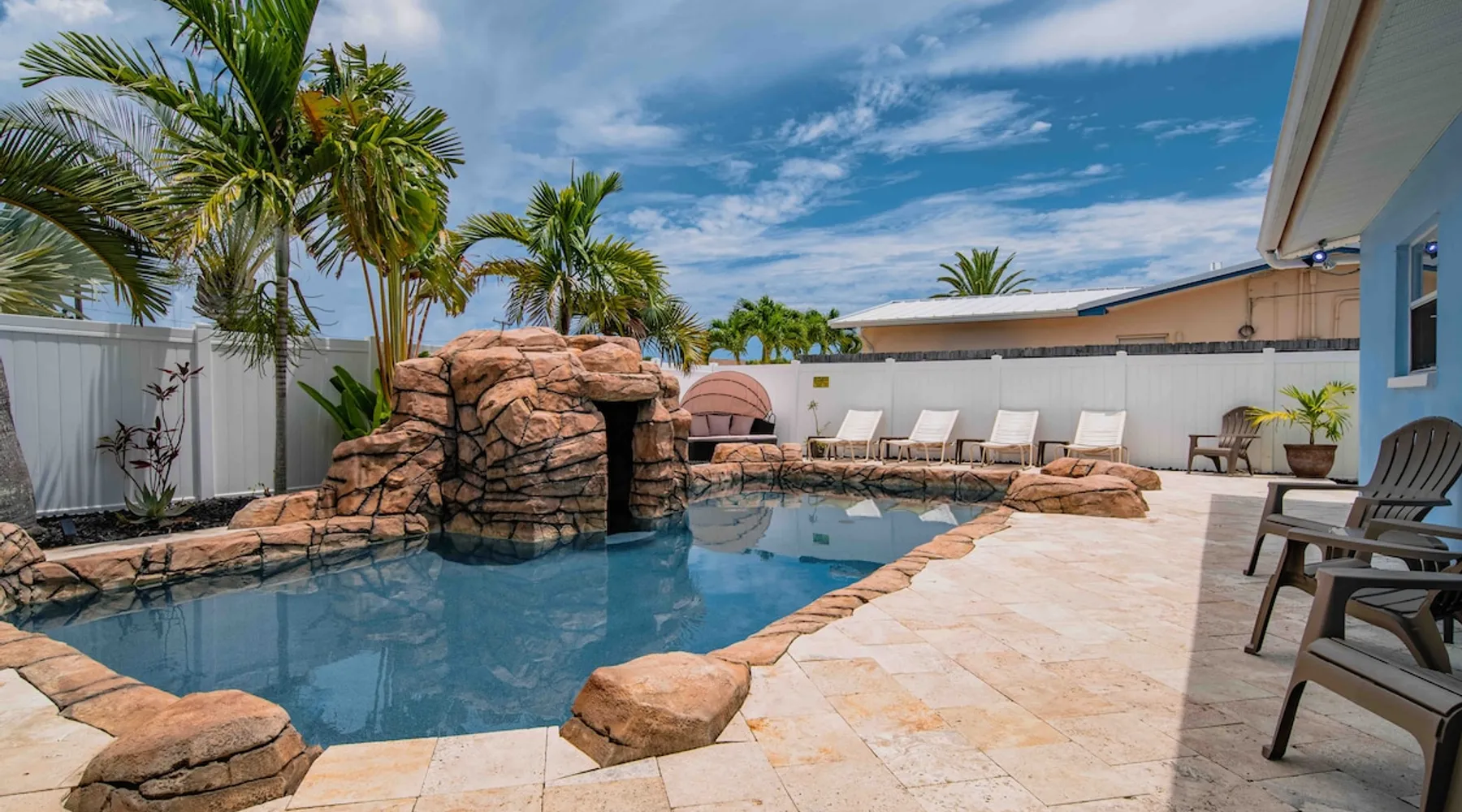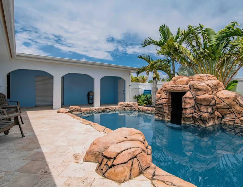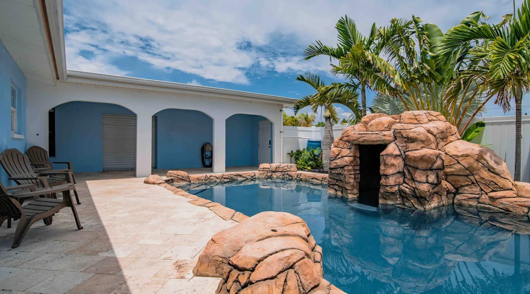 Welcome to my 5 bedroom beachside home with beautiful pool/swim-in-grotto. The home is on a barrier island, with a 10 minute walk to the beach. The space has a fully equipped kitchen, BBQ grill for entertaining along with plenty of indoor and outdoor seating. There is a international airport 20 minutes away, Disney is about an hour and Kennedy space center is a 45 minute drive. Book you unforgettable vacation at the Beachside Grotto! The space 5 bedrooms 1-10 guests