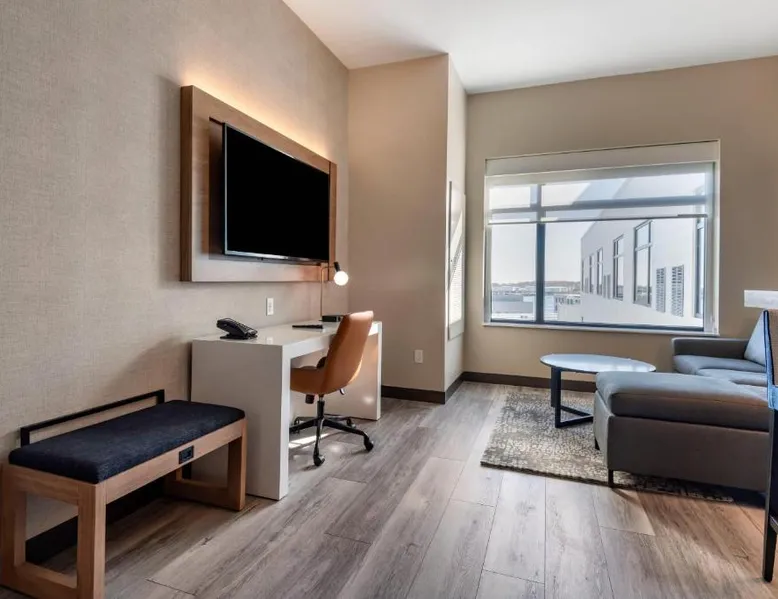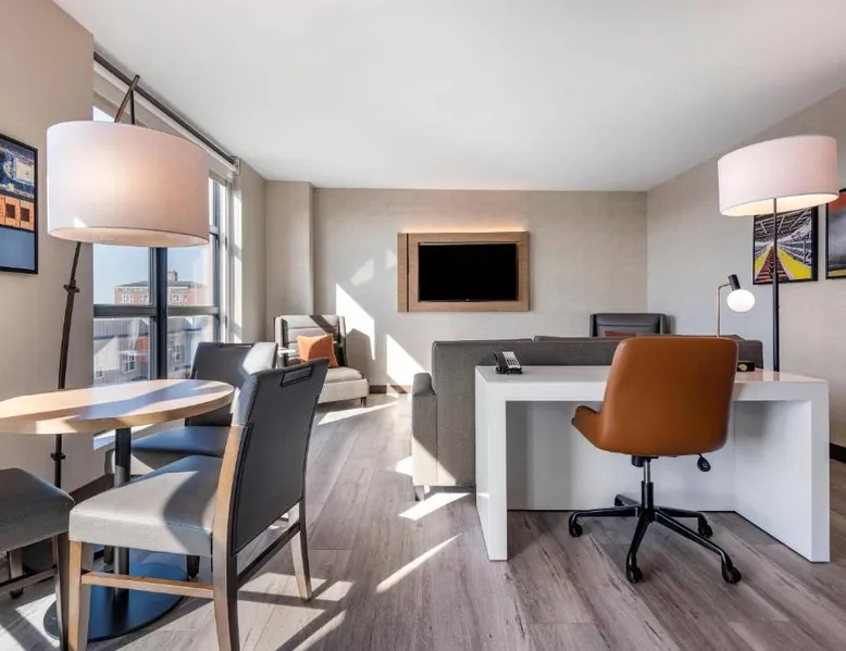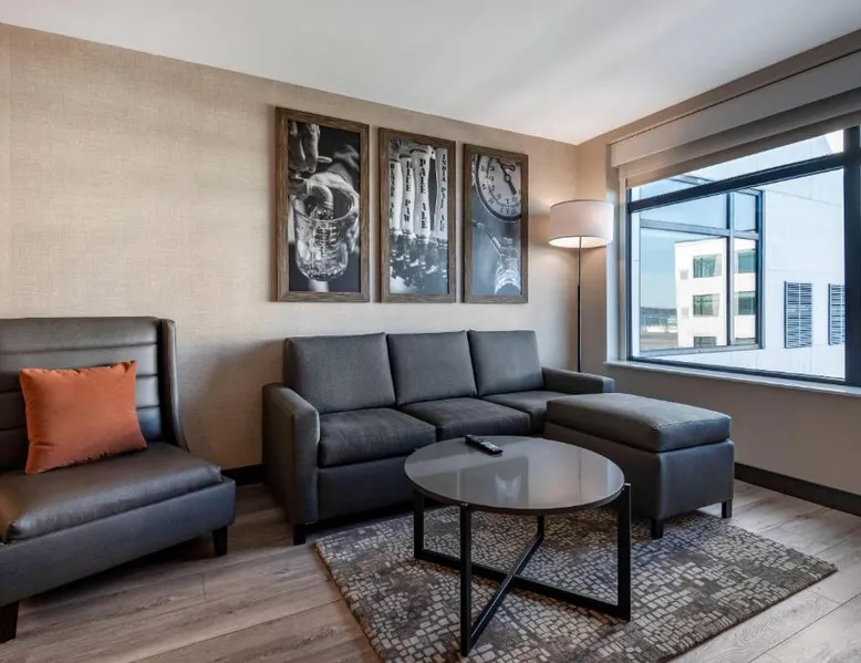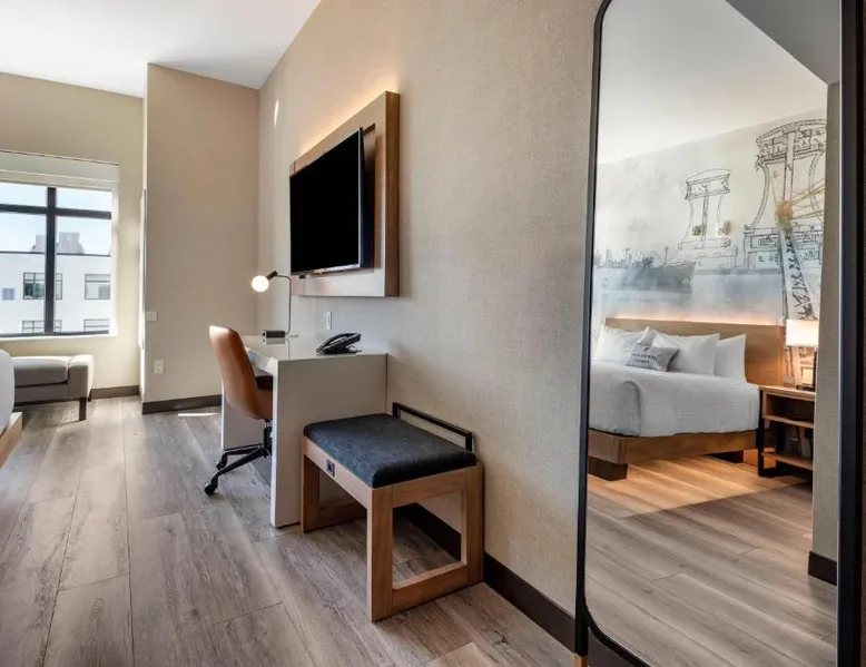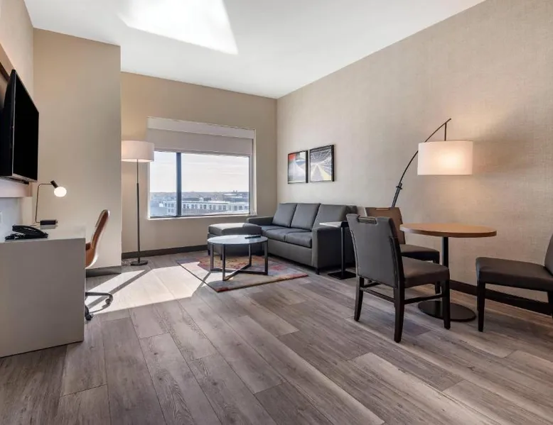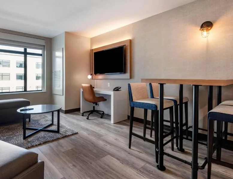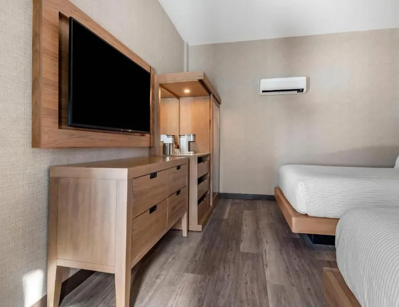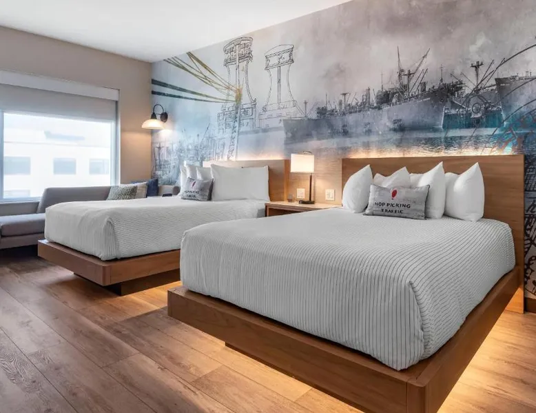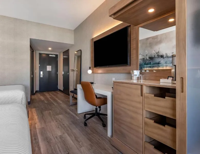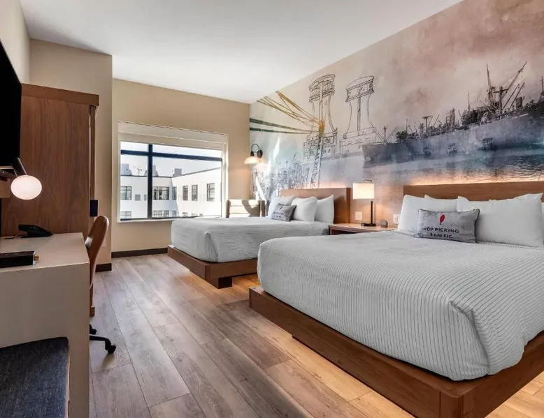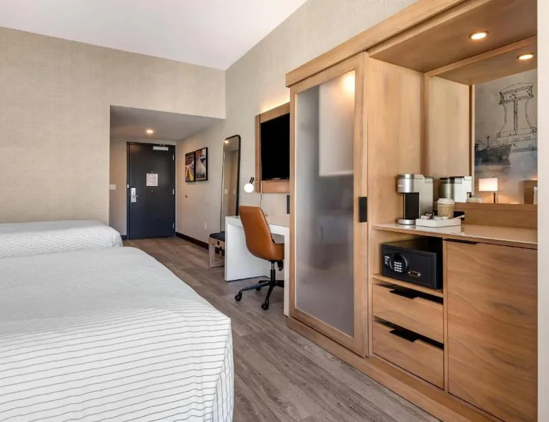 Comfortable Accommodations: Cambria Hotel Portland Downtown Old Port in Portland offers comfortable rooms with free WiFi, private check-in and check-out, and amenities such as a fitness center, terrace, restaurant, bar, and lounge. Dining Experience: The family-friendly restaurant serves American cuisine with lunch, dinner, and cocktails in a traditional and modern ambiance. Guests can also enjoy outdoor seating and a bar. Convenient Location: Located 3.1 mi from Portland International Jetport, the hotel is near attractions like East End Beach (15-minute walk), Portland Observatory (2297 feet), and Portland Museum Of Art (0.8 mi). An ice-skating rink is also nearby. Guest Satisfaction: Highly rated for room comfort, cleanliness, and convenient location. This quadruple room provides a tea and coffee maker and a TV. The unit offers 2 beds.