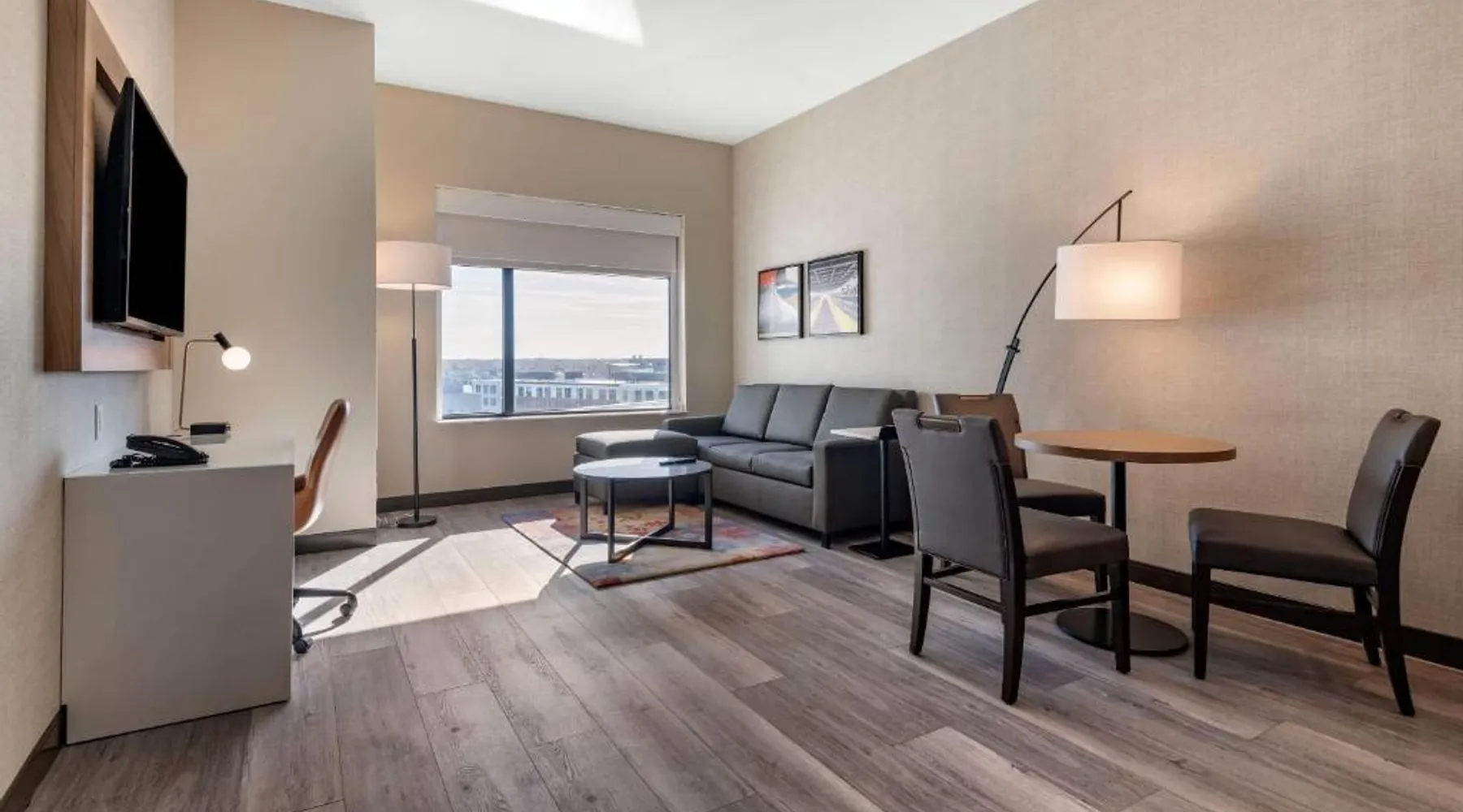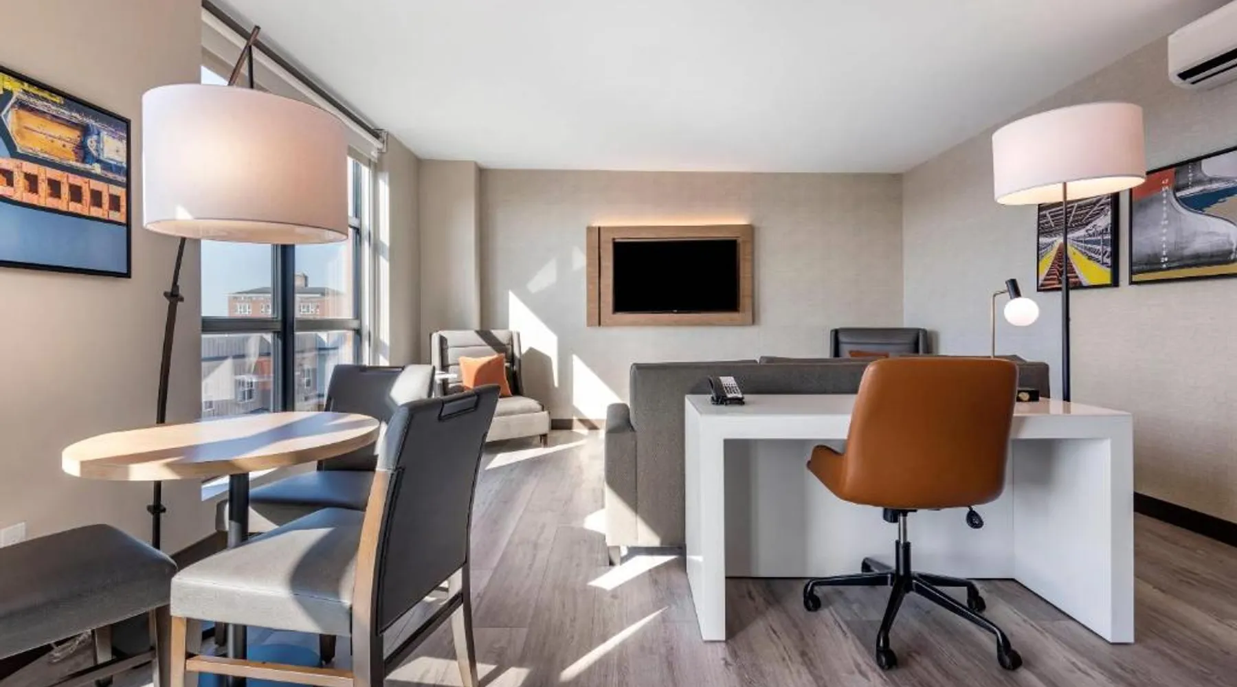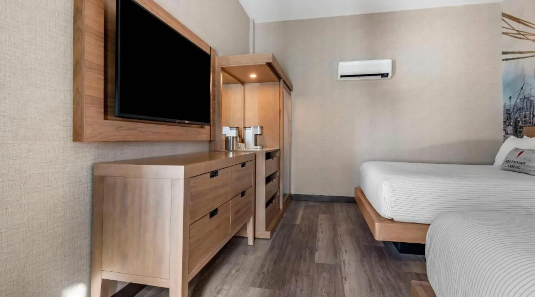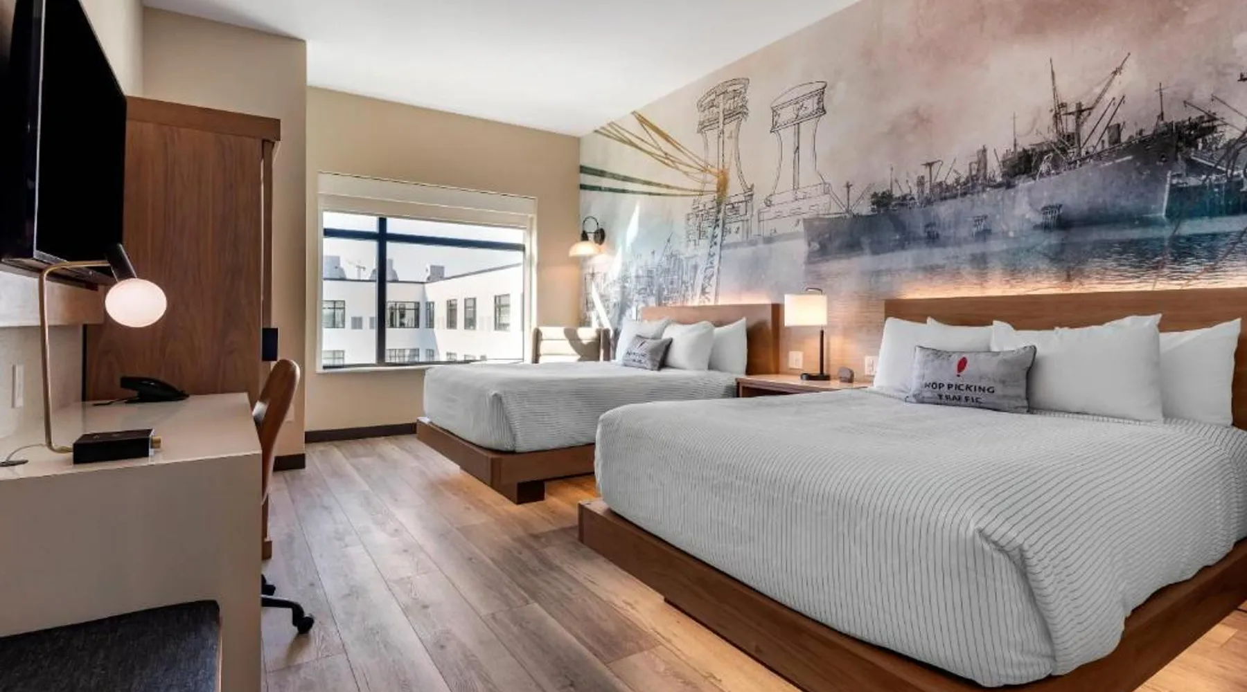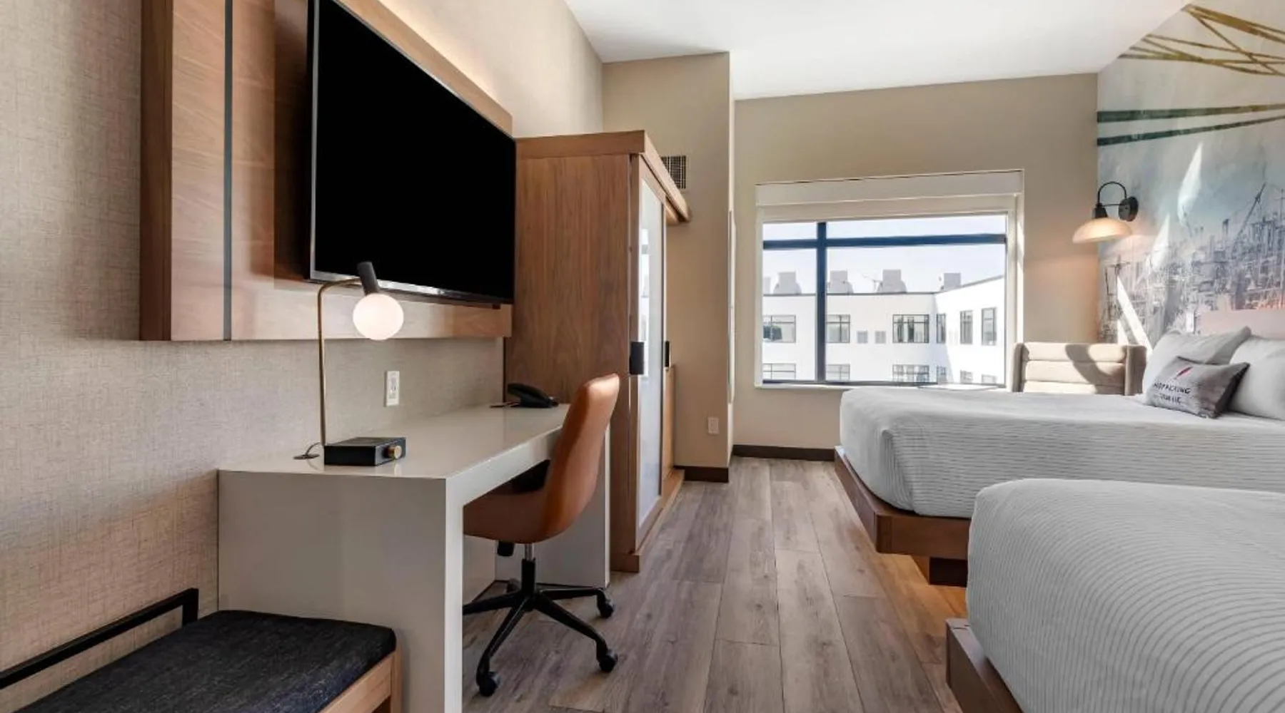 Comfortable Accommodations: Cambria Hotel Portland Downtown Old Port in Portland offers comfortable rooms with free WiFi, private check-in and check-out, and amenities such as a fitness center, terrace, restaurant, bar, and lounge. Dining Experience: The family-friendly restaurant serves American cuisine with lunch, dinner, and cocktails in a traditional and modern ambiance. Guests can also enjoy outdoor seating and a bar. Convenient Location: Located 3.1 mi from Portland International Jetport, the hotel is near attractions like East End Beach (15-minute walk), Portland Observatory (2297 feet), and Portland Museum Of Art (0.8 mi). An ice-skating rink is also nearby. Guest Satisfaction: Highly rated for room comfort, cleanliness, and convenient location. This quadruple room provides a tea and coffee maker and a TV. The unit offers 2 beds.