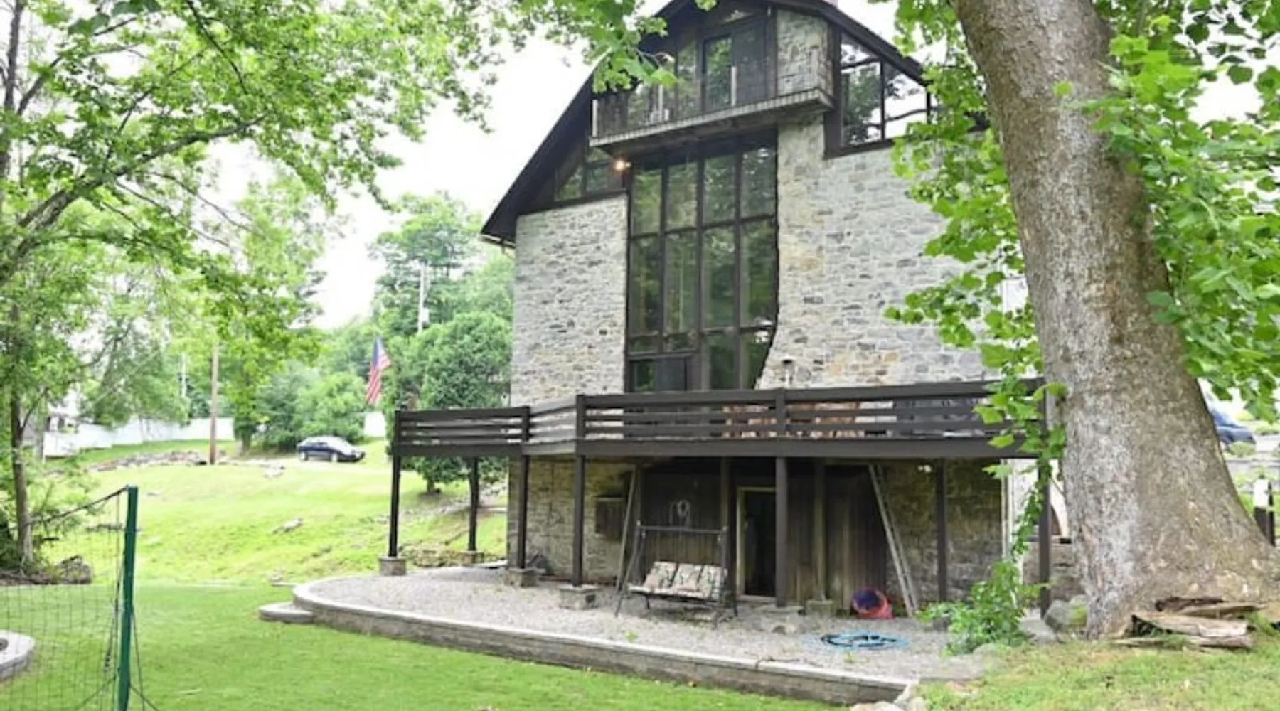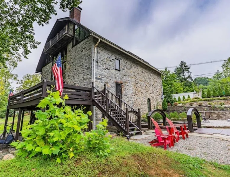 Nestled in the charming village of Beattystown, New Jersey, this historic stone mill estate offers a one-of-a-kind vacation experience. Built in 1750 and renovated by a Yale-trained architectural designer, this 6,000 square foot home features exposed hand-hewn beams, thick plank steps, and an entire wall of glass with a view of the millrace flowing beneath the living room. The soaring space includes four bedrooms, 2.5 bathrooms, two stone fireplaces, and a pub for entertaining. The property is situated on a scenic plot of land with a view of the Musconetcong River, providing a tranquil retreat for your stay.