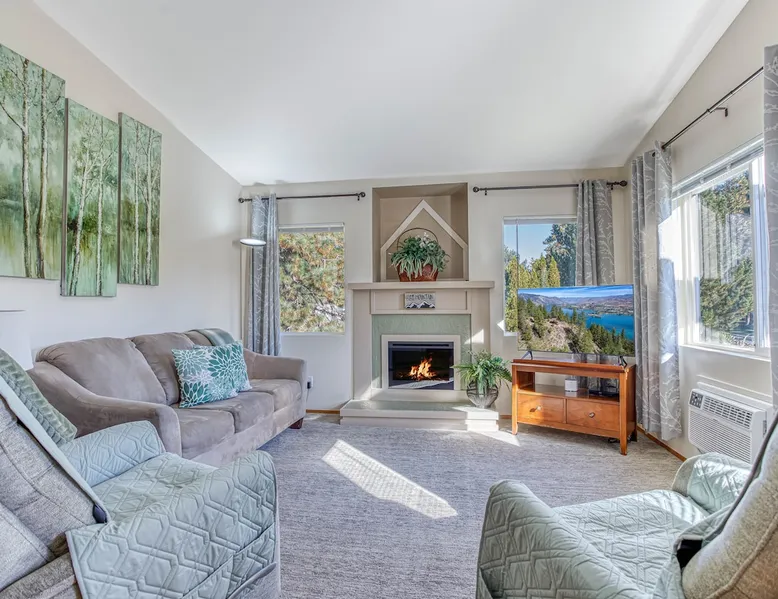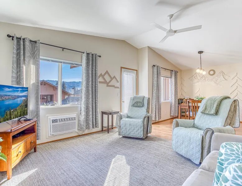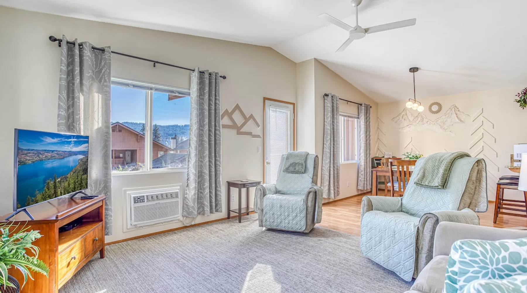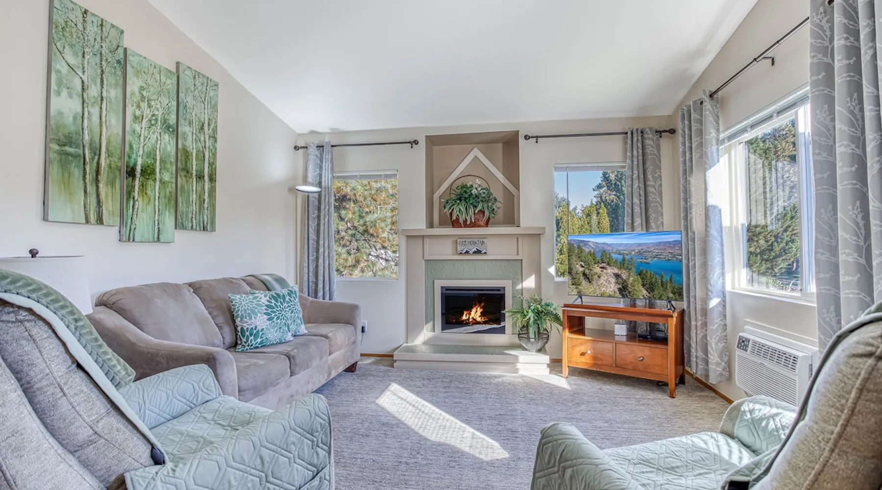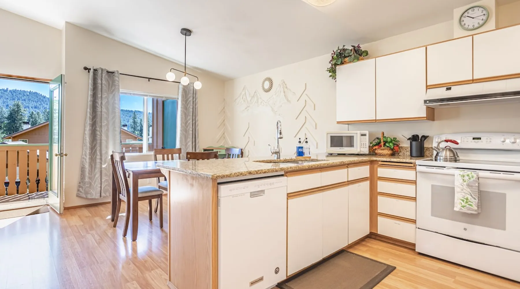 •Master: Queen Bed w/Private Bath •2nd Bedroom: Queen bed •2nd Bath in Hallway •Living Room: Sofa, Twin Recliners •SmartTV (no regular cable, Apps only) •Electric Fireplace Alpine Paradise Condo is a peaceful 2nd floor condo that offers tranquility in its corner location away from road traffic. Besides its serene location, it offers a bright, cheerful & airy feel with its expansive view of the mountains, whispering pines & everything you need for a relaxing Bavarian getaway. Continue Reading ↓ The space •Fully Stocked Kitchen (cook full meals) •In-unit Washer/Dryer w/detergent + softener •Heat, A/C & fans •Comfy sofa, twin recliners, Smart TV & electric fireplace. •Blinds and room-darkening drapes •Heat Thermostats in each room •So Much More! Relax and unwind on the private balcony where you can enjoy the breathtaking mountain view’s while savoring a glass of Leavenworth’s finest wine paired with delicious local cheese. •Free Parking: Your stay includes one covered parking spot. Additional vehicles can park in any uncovered parking spot. •Save the driving and parking fees with a 15-20 minute stroll to downtown Leavenworth either along the road or through nearby Enchantment Park where beautiful nature trails along the Wenatchee River lead you to downtown. • Stroll to shops, the gazebo, wine tastings, German restaurants and all the festivities! •Note: This condo does *not* permit any pets in order to maintain cleanliness for guests with allergies. Fines apply. •A Welcome Binder is provided, with great information for your stay including the Wi-fi password, maps, restaurants and more! •For exceptional customer service and any inquiries, feel free to reach out. Our communication has garnered repeated 5-star ratings. We welcome you to our Alpine Paradise Condo. Book your stay with us! QUESTIONS? Your questions are important to us and answered really fast! We're here to serve you & to make your stay incredibly memorable! Kristiina Miller, Property Manager iloveleavenworth Guest access The entire condo is yours! Enjoy! Other things to note Please note, this condo does *not* permit pets to maintain cleanliness for guests with allergies. Breaking this policy will result in fines. Smart TV does *not* have cable channels. Please come equipped with your apps to login and enjoy your programs. Our condo is located walking distance to the new Leavenworth Alpine Roller Coaster. Purchase your tickets ahead of time to guarantee your spot.
