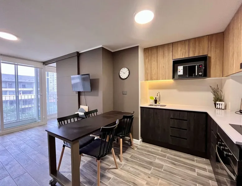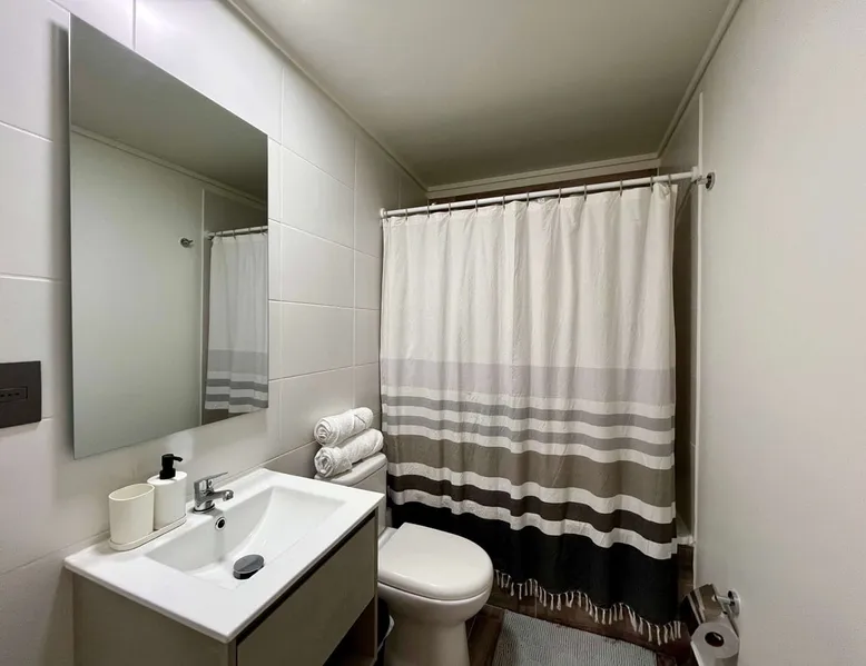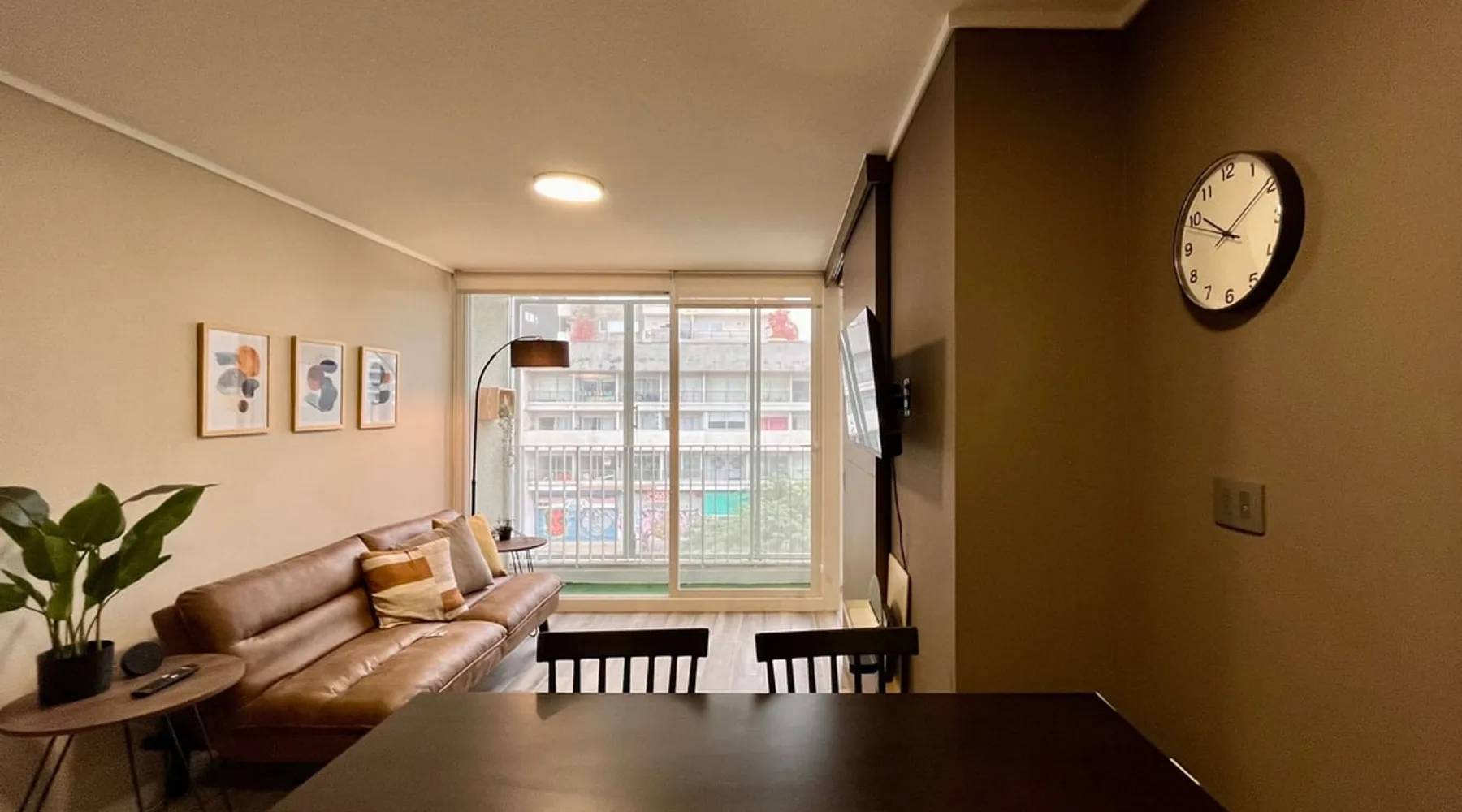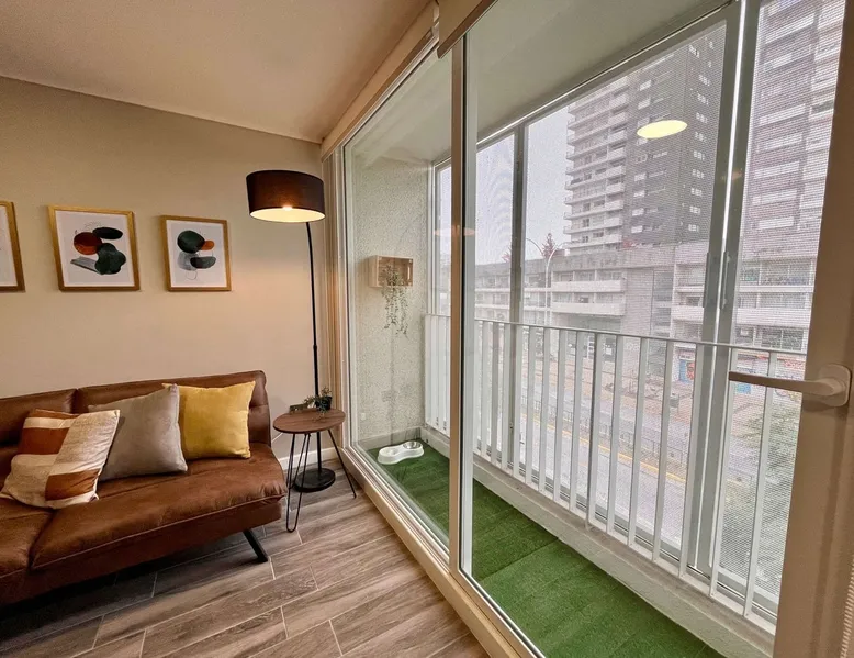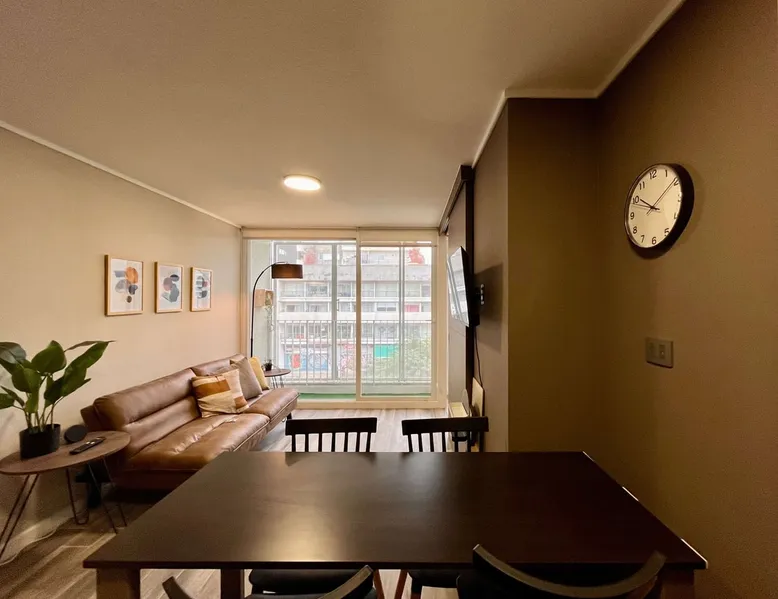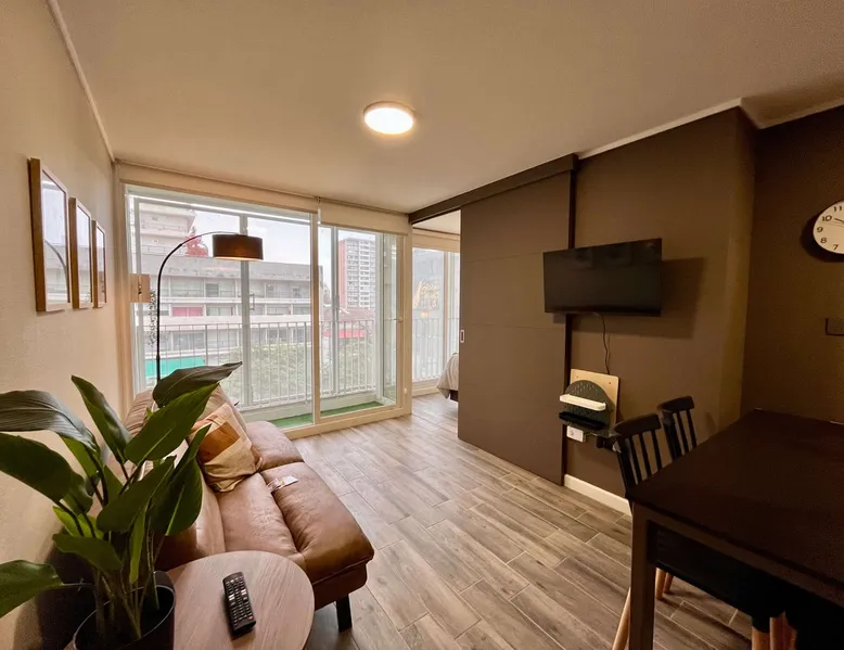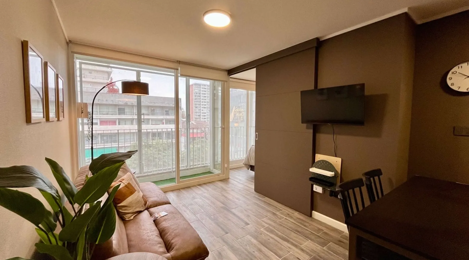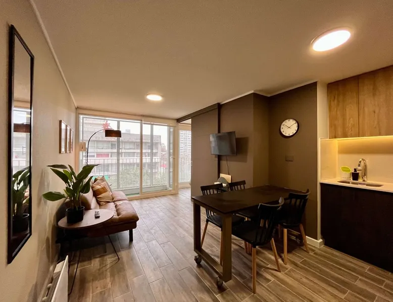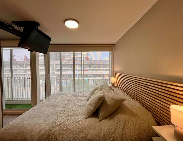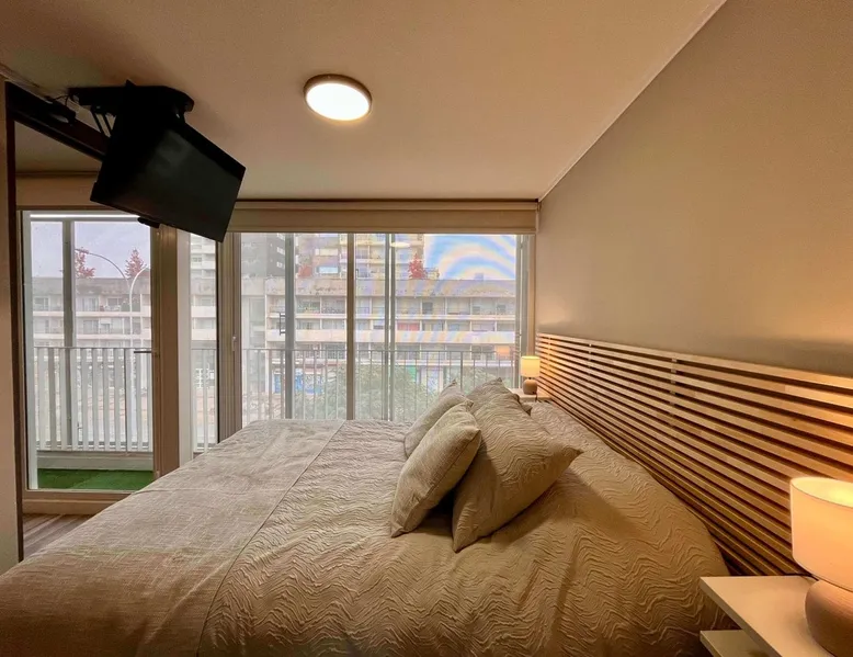Charming and modern apartment just two blocks from the Ñuñoa metro (Line 3 and 6), two blocks from the metro Monseñor Eyzaguirre (Linea 3) and a 15min walk from the National Stadium. The space Master bedroom with double bed and indoor bathroom that provides privacy and convenience. It has 32'Smart TV with motorized base from the roof. Open kitchen, equipped with everything you need. And cozy living room with comfortable sofa bed to enjoy a movie night on the 32'Smart TV. In addition, you have free and safe parking, and your small pets are welcome! Other things to note The building has a pet bathing station, bikes, co-work room, and a beautiful terrace that you can enjoy. No parties, disturbing noises, or bringing visitors for condominium provisions and rules.