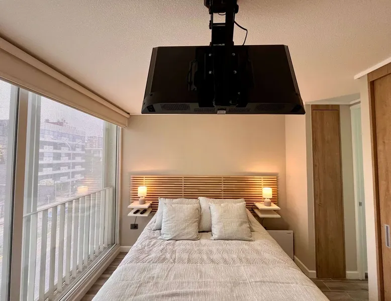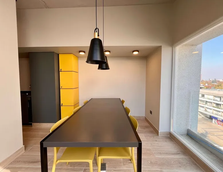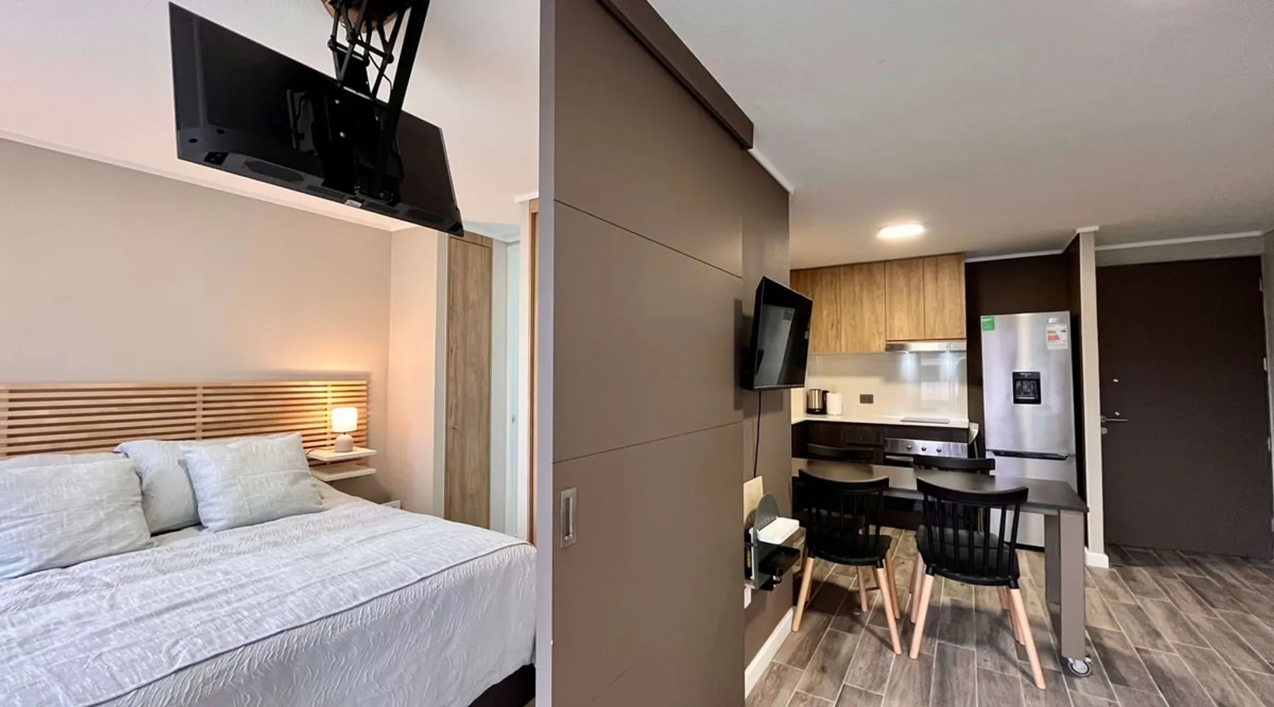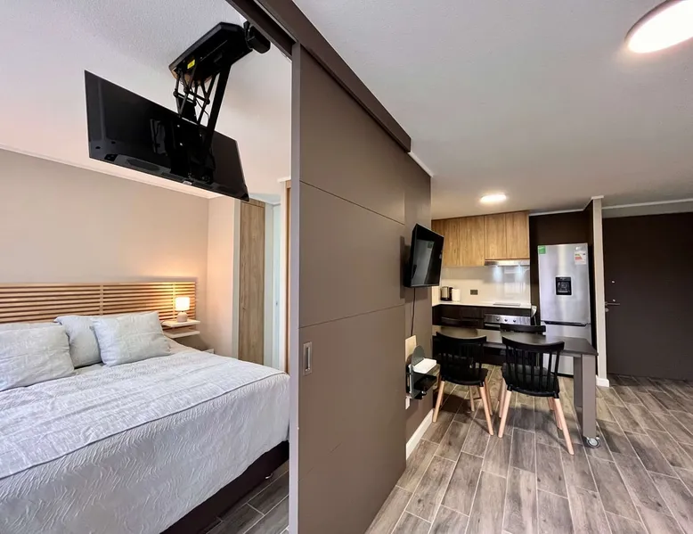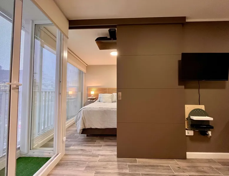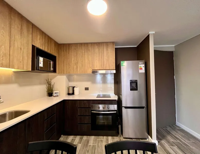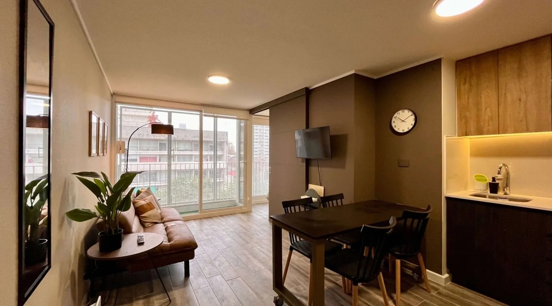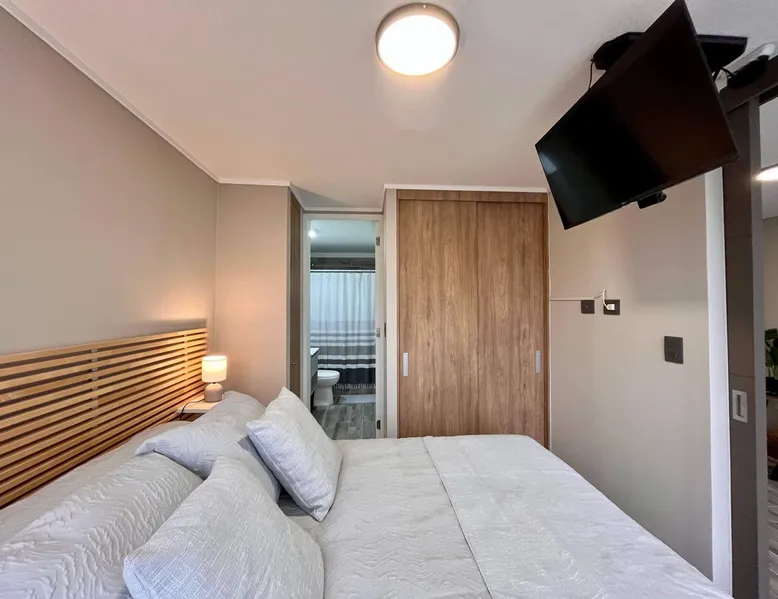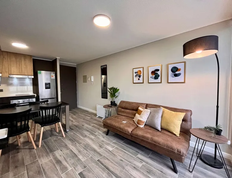 Charming and modern apartment just two blocks from the Ñuñoa metro (Line 3 and 6), two blocks from the metro Monseñor Eyzaguirre (Linea 3) and a 15min walk from the National Stadium. The space Master bedroom with double bed and indoor bathroom that provides privacy and convenience. It has 32'Smart TV with motorized base from the roof. Open kitchen, equipped with everything you need. And cozy living room with comfortable sofa bed to enjoy a movie night on the 32'Smart TV. In addition, you have free and safe parking, and your small pets are welcome! Other things to note The building has a pet bathing station, bikes, co-work room, and a beautiful terrace that you can enjoy. No parties, disturbing noises, or bringing visitors for condominium provisions and rules.