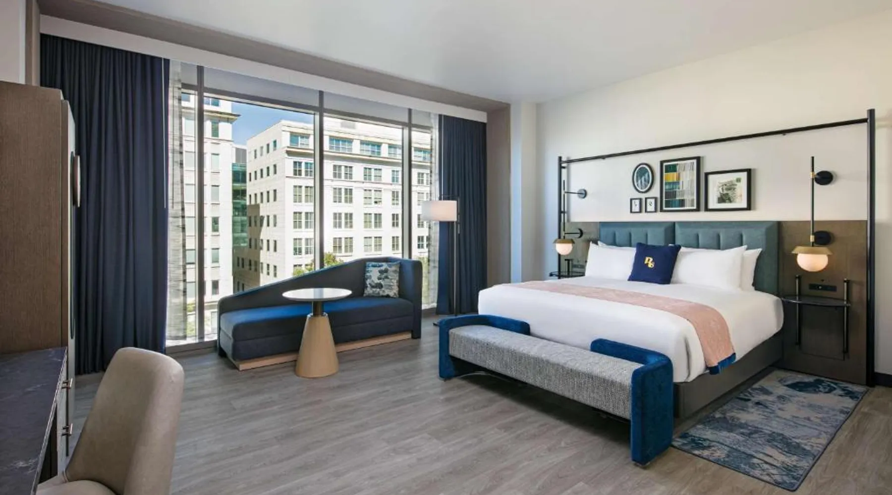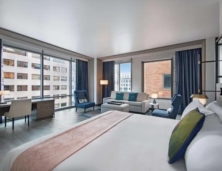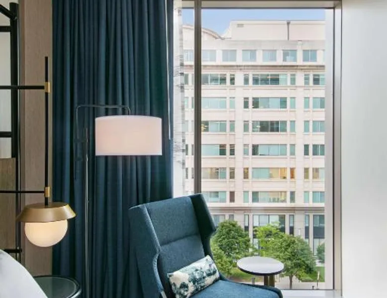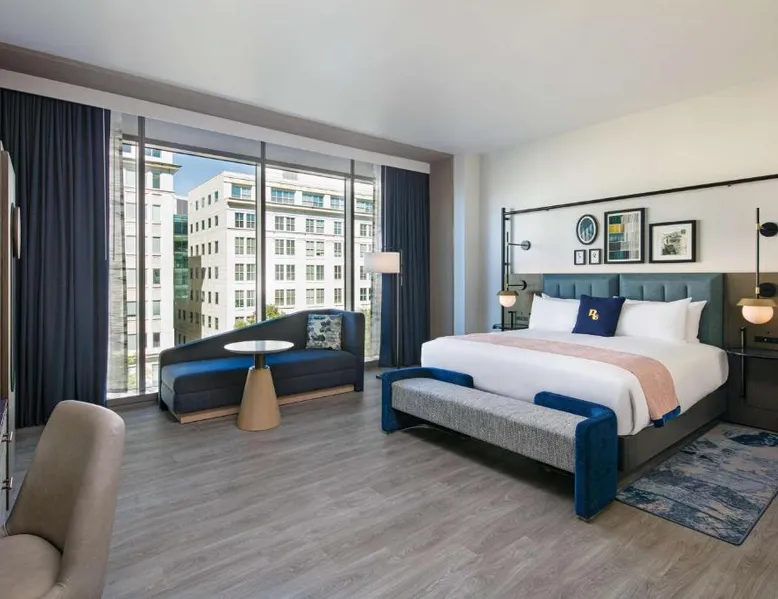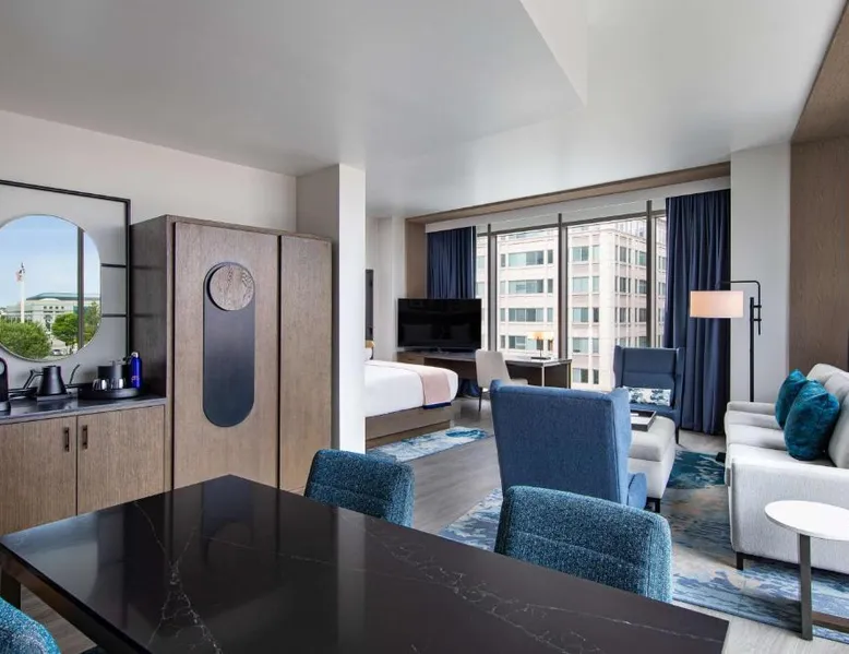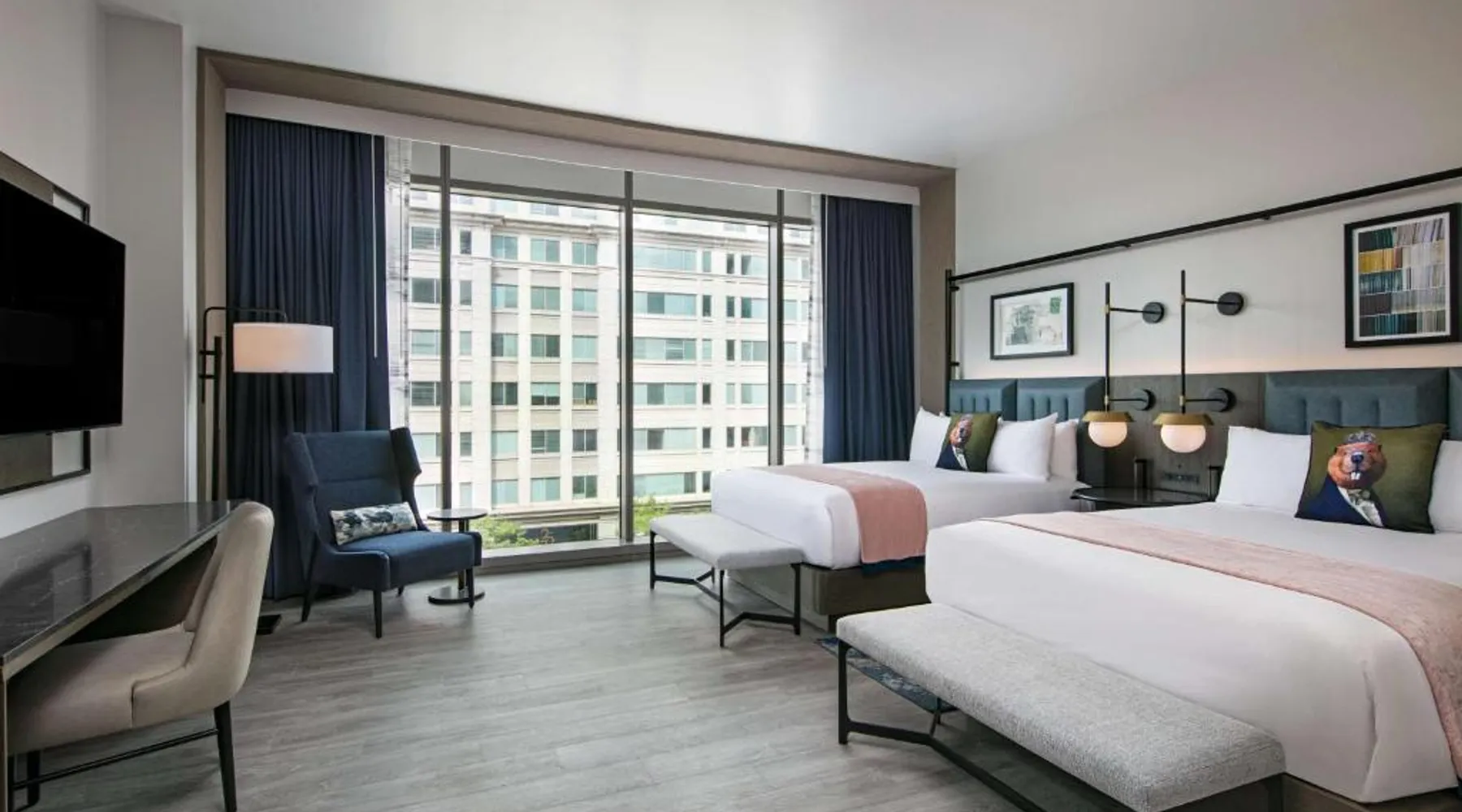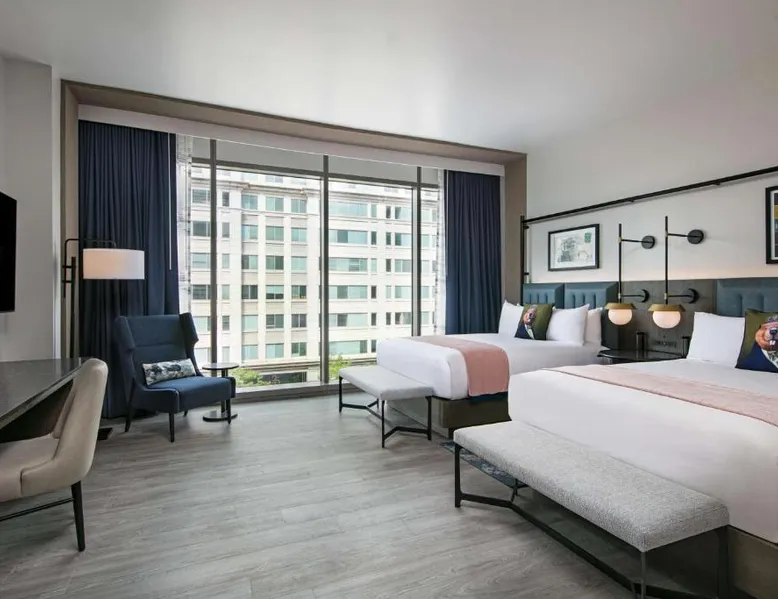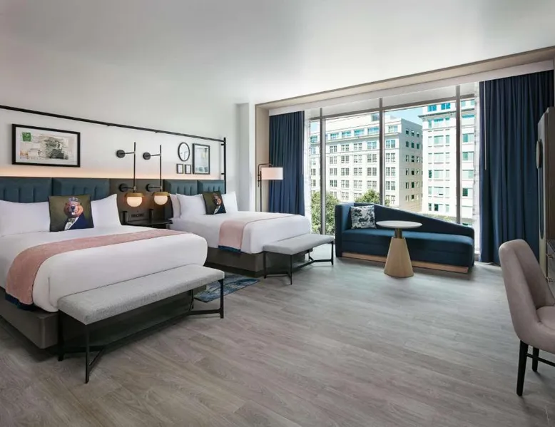 Elegant Accommodations: Rooms feature air-conditioning, private bathrooms, and modern amenities such as free WiFi, flat-screen TVs, and work desks. Additional comforts include bathrobes, tea and coffee makers, and hypoallergenic bedding. Dining and Leisure: The modern restaurant serves French cuisine, complemented by a bar offering a variety of beverages. Guests can also enjoy the fitness center, relax in the lounge, and take advantage of the 24-hour front desk and concierge service. Prime Location: Located in Washington, the hotel is a short walk from Union Station and the National Postal Museum. Nearby attractions include the National Japanese American Memorial and the Old Town Trolley Tours. An ice-skating rink is also available in the surroundings. Exceptional Service: Highly rated for its convenient location, attentive staff, and impeccable room cleanliness, the hotel ensures a comfortable and memorable stay. The quadruple room offers a tea and coffee maker. The unit offers 2 beds.
