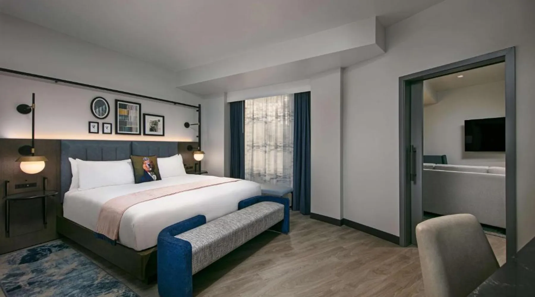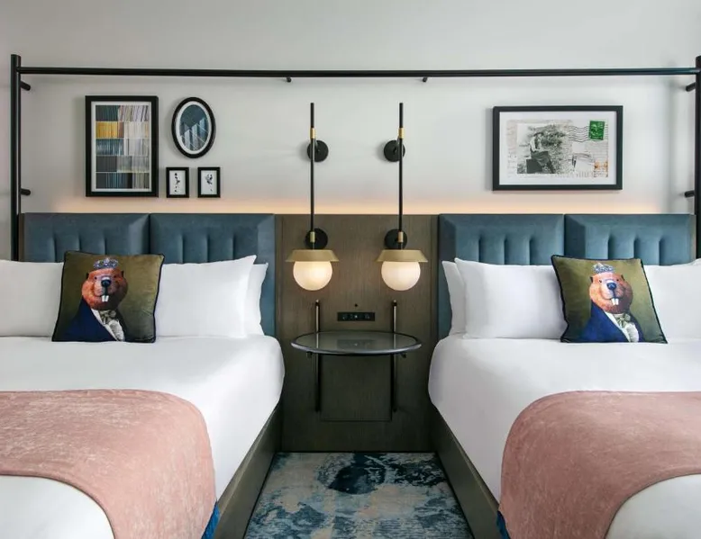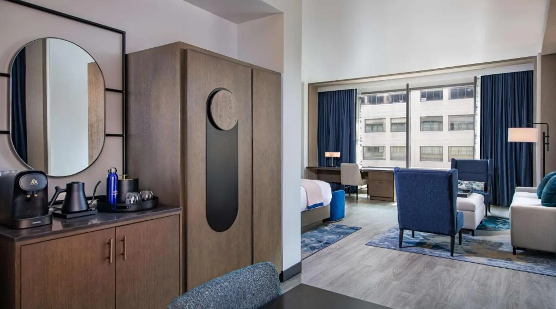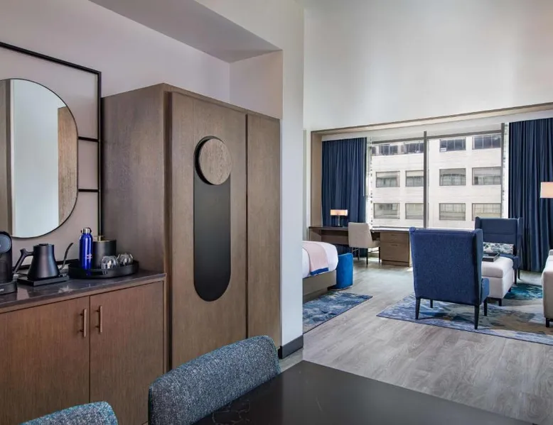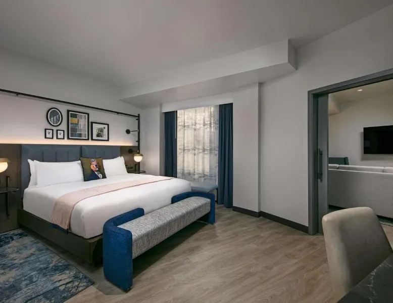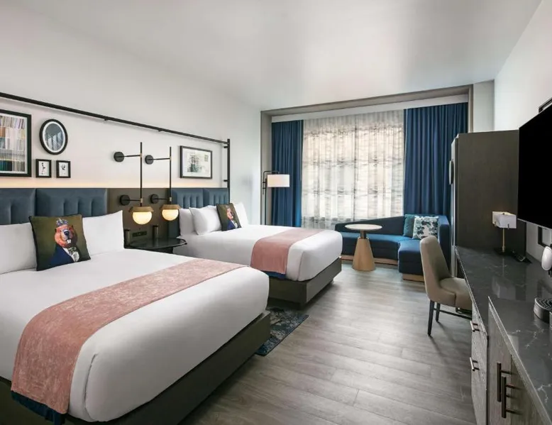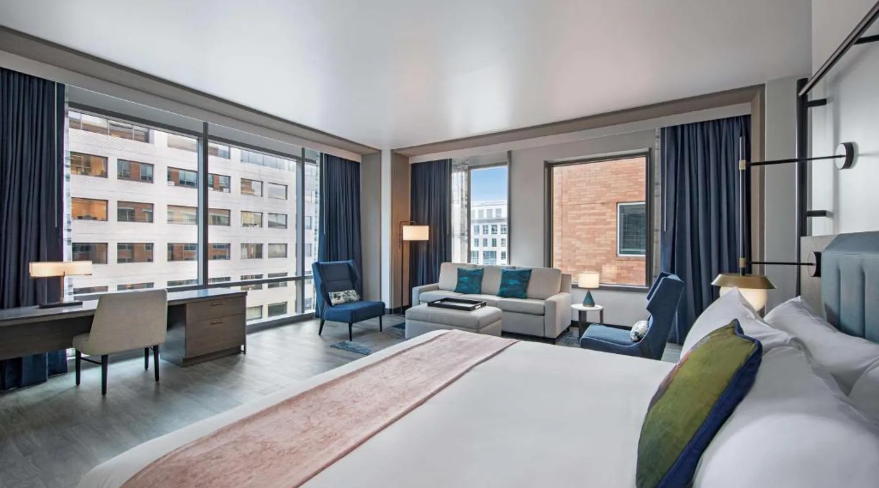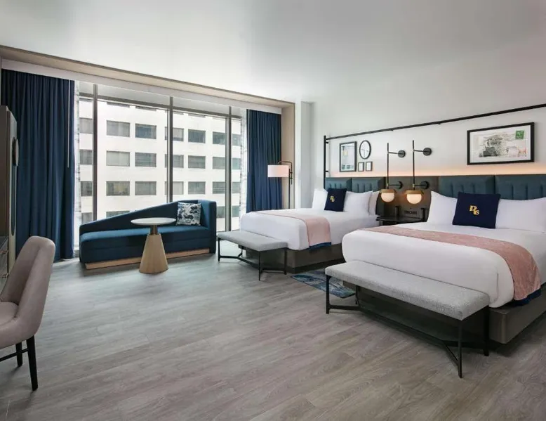 Elegant Accommodations: Rooms feature air-conditioning, private bathrooms, and modern amenities such as free WiFi, flat-screen TVs, and work desks. Additional comforts include bathrobes, tea and coffee makers, and hypoallergenic bedding. Dining and Leisure: The modern restaurant serves French cuisine, complemented by a bar offering a variety of beverages. Guests can also enjoy the fitness center, relax in the lounge, and take advantage of the 24-hour front desk and concierge service. Prime Location: Located in Washington, the hotel is a short walk from Union Station and the National Postal Museum. Nearby attractions include the National Japanese American Memorial and the Old Town Trolley Tours. An ice-skating rink is also available in the surroundings. Exceptional Service: Highly rated for its convenient location, attentive staff, and impeccable room cleanliness, the hotel ensures a comfortable and memorable stay. The quadruple room offers a tea and coffee maker. The unit offers 2 beds.