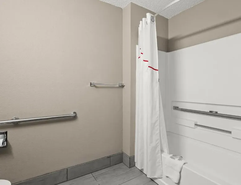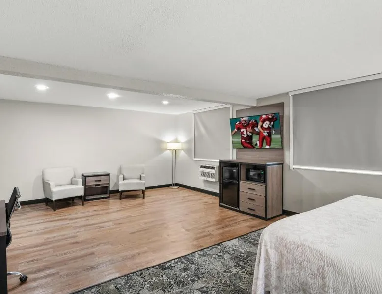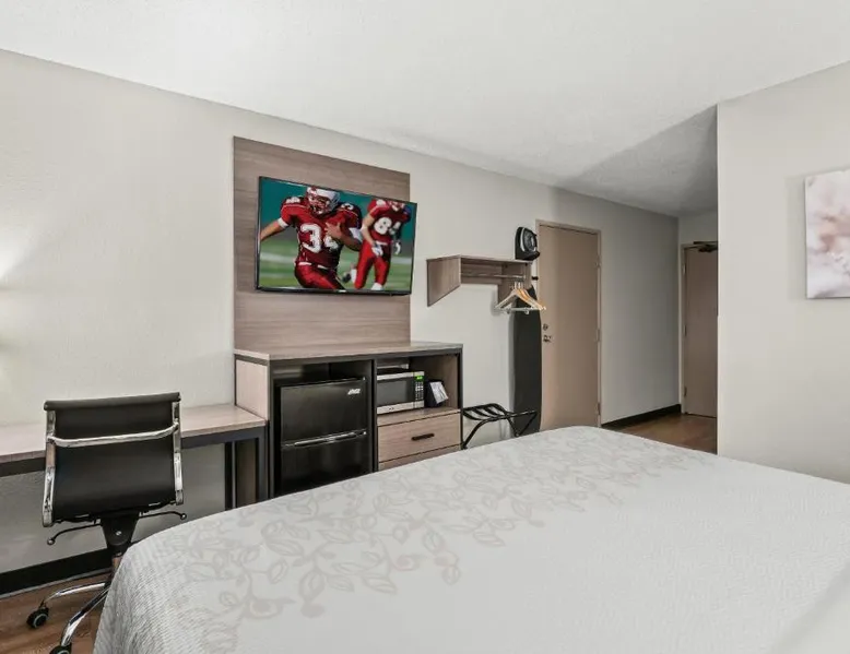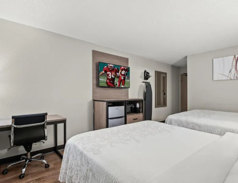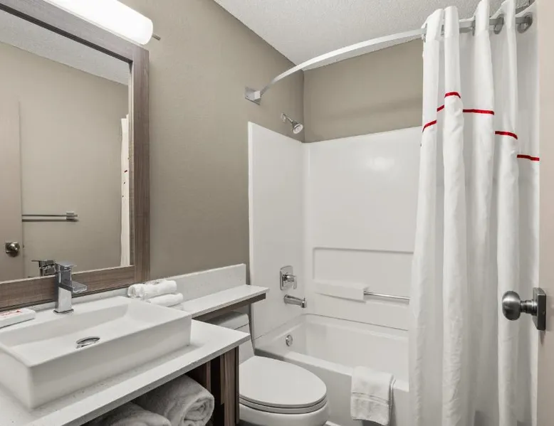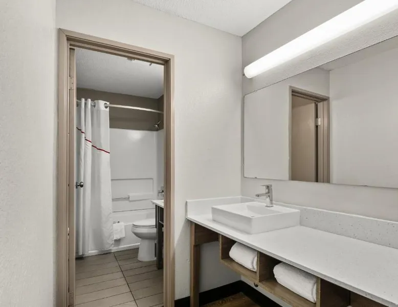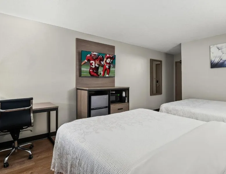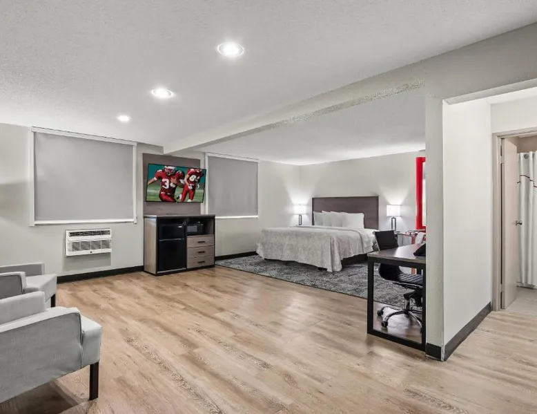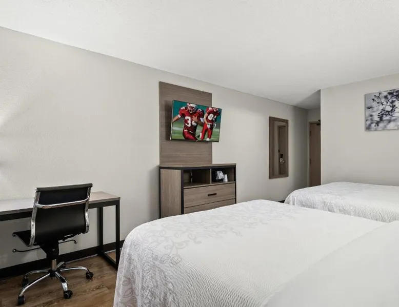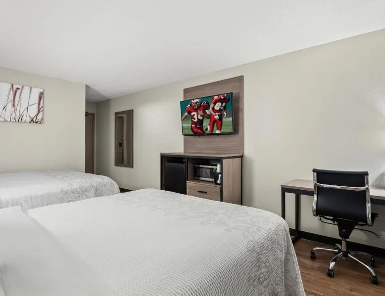 Comfortable Accommodations: Red Roof PLUS Belleville in Belleville offers family rooms with air-conditioning, private bathrooms, and free WiFi. Each room includes a bath, shower, TV, and free toiletries. Convenient Facilities: Guests benefit from a elevator, 24-hour front desk, and free on-site parking. Additional amenities include a spa bath, tea and coffee maker, hairdryer, refrigerator, work desk, and seating area. Prime Location: Located 8.1 mi from Detroit Metro Airport, the hotel is near attractions such as Eastern Michigan University (9.9 mi) and the Ann Arbor Hands-On Museum (17 mi). The spacious double room offers air conditioning, heating, as well as a private bathroom featuring a bath and a shower. The unit offers 1 bed.