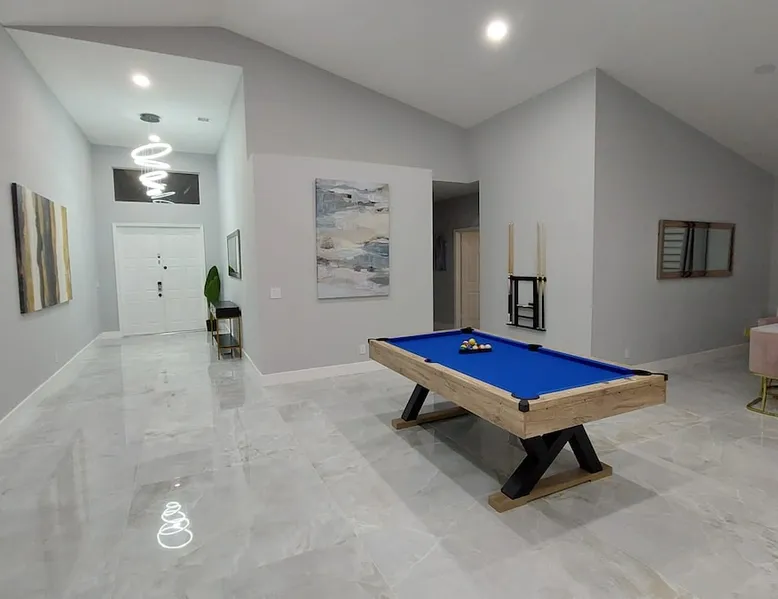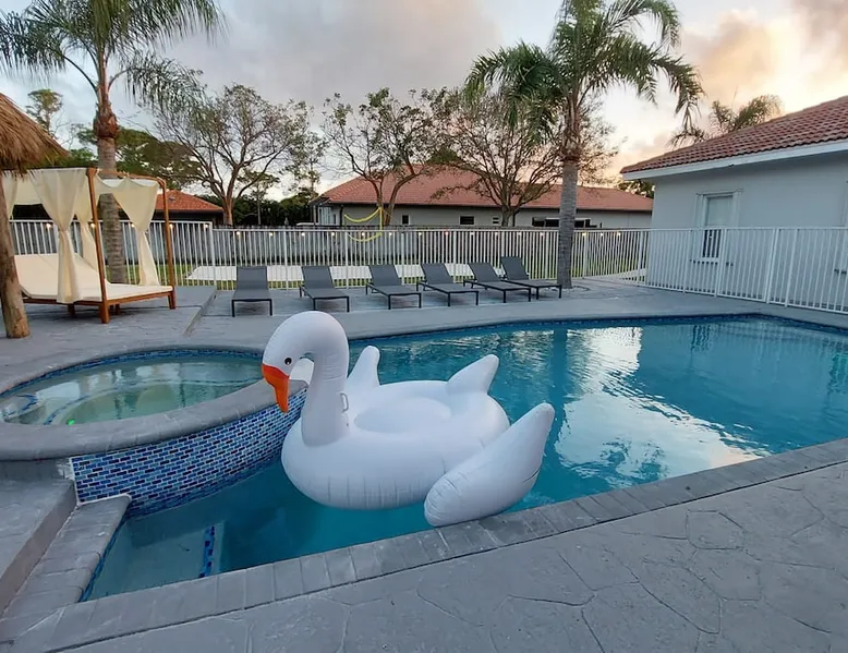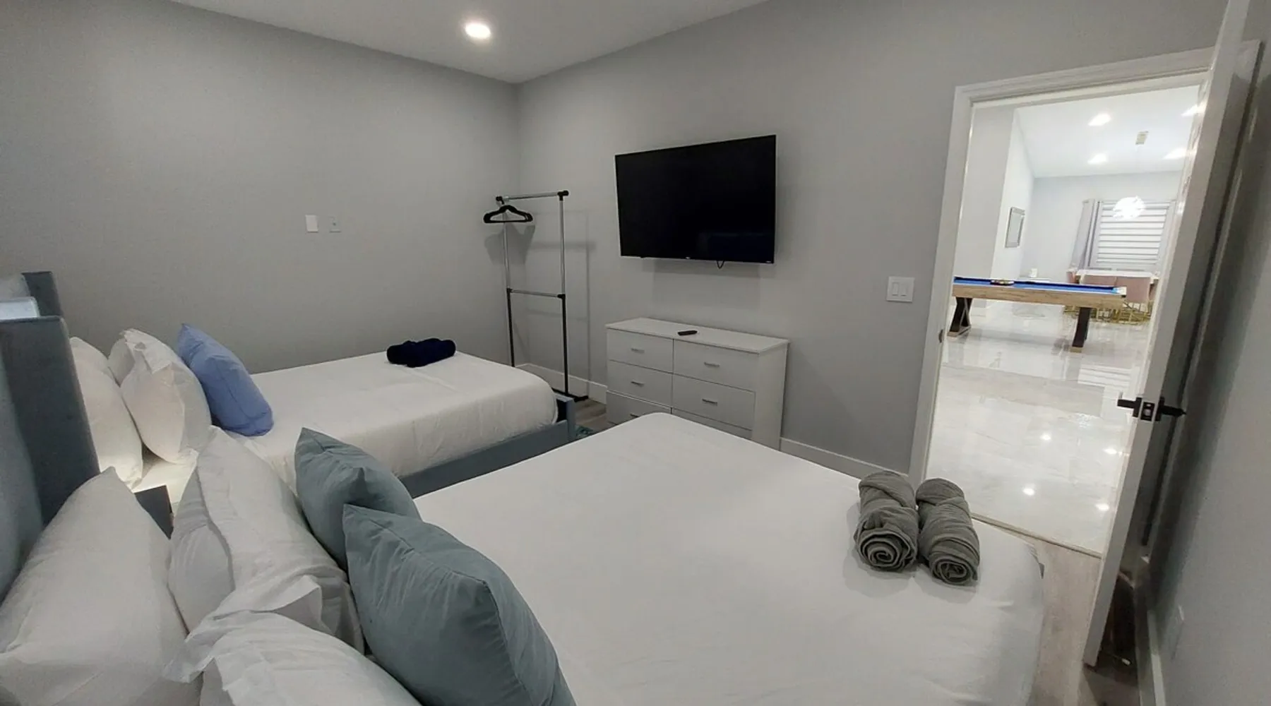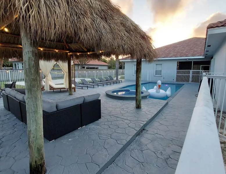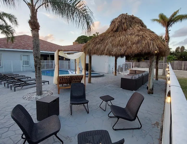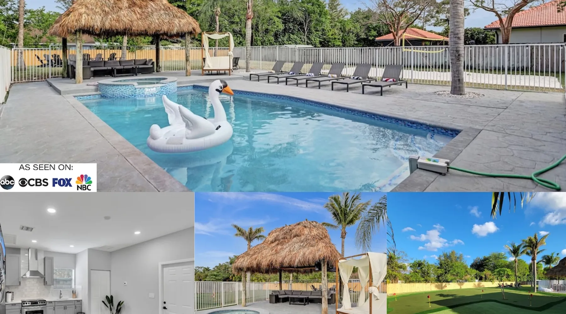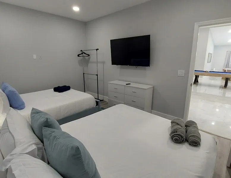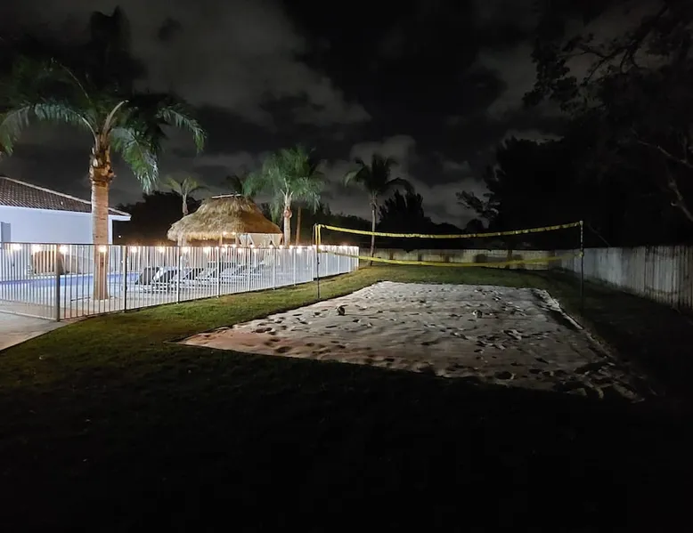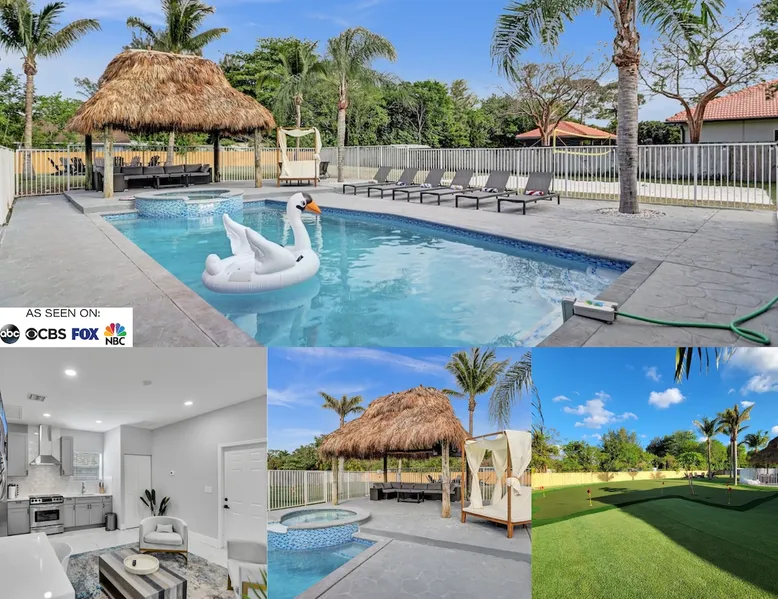 🏡 One-of-a-kind 7000 SQFT villa compound just 1 mile from Boca Raton and 10 minutes to the beach. 🛏️ Features 9 bedrooms, 5 bathrooms, 13 beds, 2 living rooms, and a massive master suite. 🎬 Enjoy a private movie theatre, beach volleyball, and South Florida’s largest 9-hole putting green. 🌴 Lounge in the Tiki Hut with TV, gather by the fire pit, and dive into the brand-new heated pool and Jacuzzi. 🍽️ Includes 2 full kitchens and a separate in-law wing with its own living space. The space Brand New Modern Pool with a Massive Deck and Tanning Ledge, Jacuzzi, Premium Towels, and Linen. Both kitchens are stocked with everything you need, a Full house generator, BBQ Grill, and Outdoor Dining Area. Loungers in the pool and outside the Pool Huge Backyard for enjoying family time together. 5 minute walk to Boca Raton 3 Minute walk to Chabad of Coconut Creek The space HEATED POOL IS INCLUDED IN THE PRICE! The luxurious home is professionally designed by the prominent ShuChai Interior Design Firm to provide a comfortable getaway to all visitors for a perfect stay. Its contemporary setting and outstanding facilities will offer the levels of relaxation and convenience you are looking for in a vacation home. The inviting indoors offers a mix of modern amenities and beautiful furnishing enriched by an abundance of natural light accenting the elegant floors and tastefully picked décor. Every inch of space is well-utilized, which is best visible from the fully equipped kitchen that opens to the entertaining living room and the inviting dining area. Nine highly comfortable bedrooms will provide all the relaxation you need after a long day of South Florida adventures. But wait! The best is yet to come. The fabulous backyard with its large swimming pool, and outdoor dining area under the outdoor canopy and Tiki Hut offers a place where you can soak up the sun, relax, and have hours of fun! ★ LIVING ROOM ★ The living room is perfect for enjoying fun and memorable moments after an eventful day. Find your place on the comfy sofa, grab some snacks and drinks, and enjoy watching your favorite movie. ✔ Comfortable Double Sofa with Pillows ✔ Smart TV with Netflix, and all other smart Apps ✔ Chic Sofa Chairs ✔ Stylish Coffee Tables ✔ Billiard Table It’s not all fun and relaxation in the living room! We have prepared a private workspace where you can set up your laptop and attend an important meeting or a remote learning session. ✔ Office Desk with a Lamp ★ KITCHEN & DINING ★ Want to feel like a MasterChef? Come to the fully equipped kitchen and use its many state-of-the-art cooking appliances, spacious quartz countertops, and ample cabinetry to create tasty homemade meals worthy of the most praised restaurants. ✔ Microwave ✔ Stove ✔ Oven ✔ Refrigerator/Freezer ✔ Ice Maker ✔ Dishwasher ✔ Keurig Coffee Maker ✔ Hot Water Kettle ✔ Blender ✔ Toaster ✔ Glasses ✔ Silverware ✔ Pots & Pans Have a few drinks on the kitchen island while the food is getting ready. Once it's done, serve it on the inviting dining table and enjoy gourmet meals with your friends and family. ✔ Dining Table with Seating for 8 ✔ Kitchen Island with Seating for 5 ★ SLEEPING ARRANGEMENTS - 9 BEDROOMS ★ Retreat to these comfortable bedrooms, designed and furnished to provide you with all the rest needed after a day of adventuring throughout Florida. ♛ Bedroom 1: King-Size Bed ♛ Bedroom 2: King-Size Bed ♛ Bedroom 3: King-Size Bed ♛ Bedroom 4: King-Size Bed ♛ Bedroom 5: King-Size Bed ♛ Bedroom 6: King-Size Bed ♛ Bedroom 7: 2 Queen-Size Bed ♛ Bedroom 8: 2 Queen-Size Bed ♛ Bedroom 9: 1 Bunkbed and pull-out room All bedrooms offer a similar set of amenities: ✔ Premium Pillows, Linens, and Sheets ✔ Smart TVs ✔ Closets with Hangers and Shelves ✔ Dressers with Spacious Drawers ✔ Full-Size Mirrors ✔ Night Stands with Reading Lamps with enabled USB ports for easy charging access ★ BATHROOMS ★ 5 Full bathrooms are stocked with essential toiletries and fresh towels for maximum comfort and convenience. ✔ Spacious Soaking Bathtub ✔ Walk-In Shower ✔ Mirror ✔ Toilet ✔ Towels ✔ Hair Dryer ✔ Essential Toiletries ★ BACKYARD ★ The spacious pool backyard offers a fairy tale outdoor setting. Here you will be able to soak up the sun, catch a breath of fresh air, and unwind in complete privacy under the canopy, surrounded by comfortable amenities for both children and adults. ✔ Swimming Pool with Sun Lounges (Pool Heating included in price) Pool Safety Rules (Strictly Enforced): 👉 The pool safety fence will remain up. 👉 Children under 18 must be supervised by an adult at all times when in or around the pool. 👉 There is no lifeguard on duty – guests use the pool entirely at their own risk. ✔ Jacuzzi ✔ Outdoor Tiki Hut with TV ✔ Lounge Seating Area ✔ Ping Pong Table ✔ Fire Pit ✔ Volleyball ✔ Mini-Golf ✔ Outdoor Dining Area Look no further than our luxurious home for your memorable Pompano Beach, FL visit. We look forward to you experiencing its complete comfort and coziness. 🚗 Important Parking Rule: The property allows a maximum of 4 cars only on-site. Additional vehicles must be parked off-site in designated public parking areas. This rule is strictly enforced, and by booking, you agree to comply. Guest access The home is exclusively yours, without interruption for the duration of your stay, so relax, unwind, and make yourself at home. Other than the already mentioned amenities, our home also comes with: ✔ High-Speed Wi-Fi ✔ Air Conditioning ✔ Heating ✔ Washer/Dryer ✔ Iron/Board ✔ Free Private Parking Other things to note ★ COVID-19 SANITIZATION ★ The Heath, safety, and well-being of our guests are of utmost importance. For this reason, we use a thorough 50-point cleaning process after each check-out. ★ NO SMOKING INSIDE ★ Please refrain from smoking inside the home! It is prohibited. Any smoking e