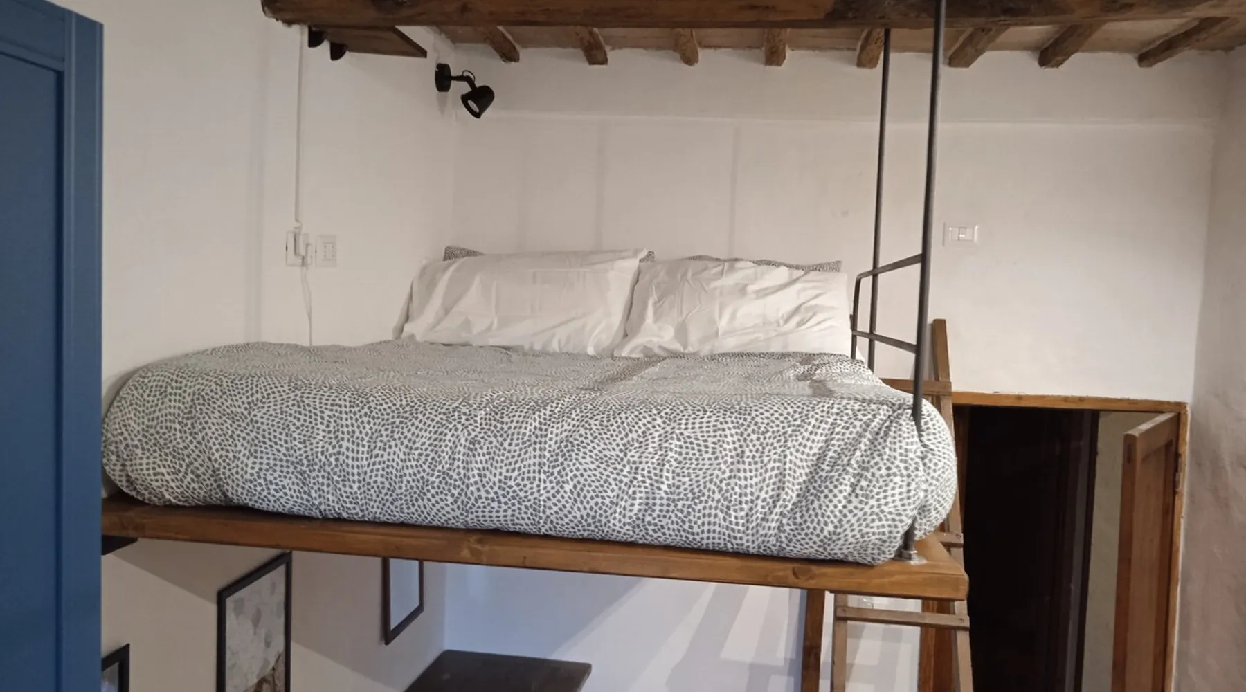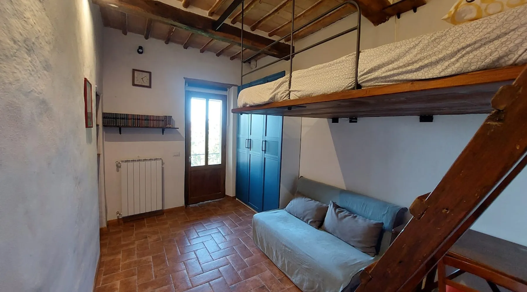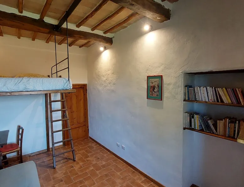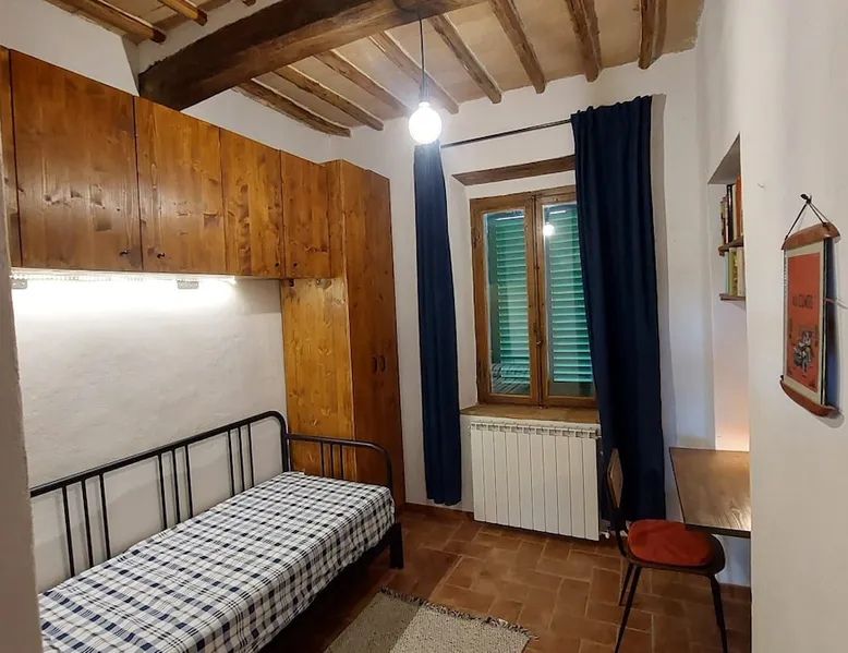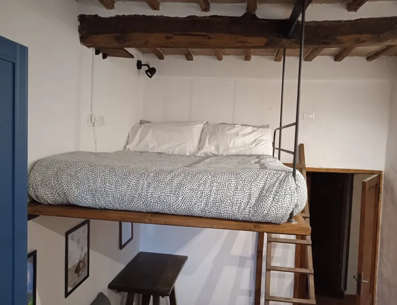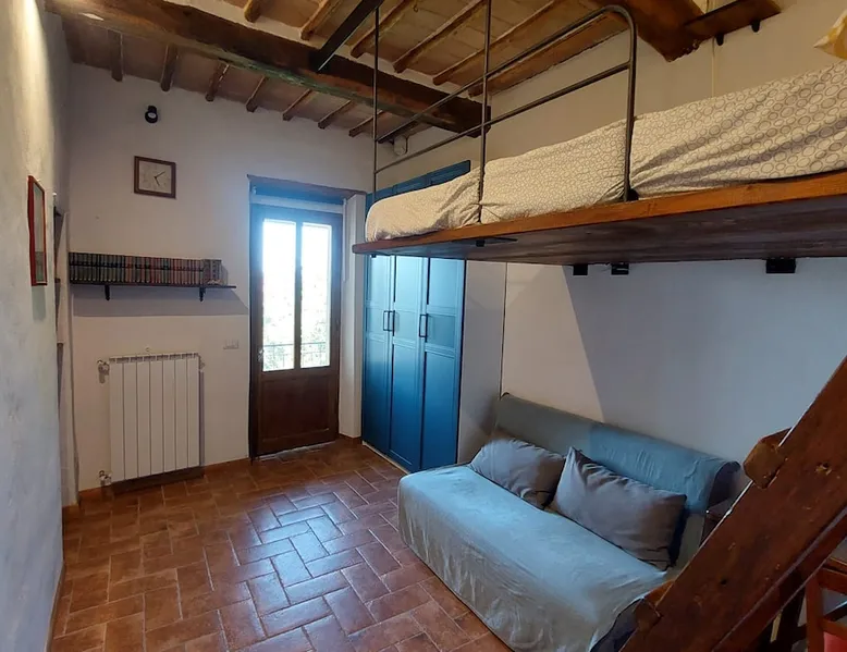 The apartment is located on the first floor of an early 20th century building, in the historic center of the municipality of Monticiano. The entrance opens onto a room with a small kitchen. In the apartment there are two small bedrooms. In the first bedroom, the queen-size bed (1.40x2.00 m) is hanging off the ground approximately 1.70 m high. The second bedroom has a single bed equipped with a pull-out extension that allows it to be transformed into a double bed. Other things to note The double bed is hung from the ceiling, which is accessed via a small staircase. For this reason, the double room is not suitable for elderly people or people with disabilities Registration details IT052018C2LWI26Q4J