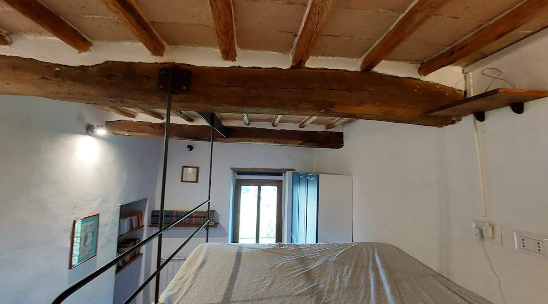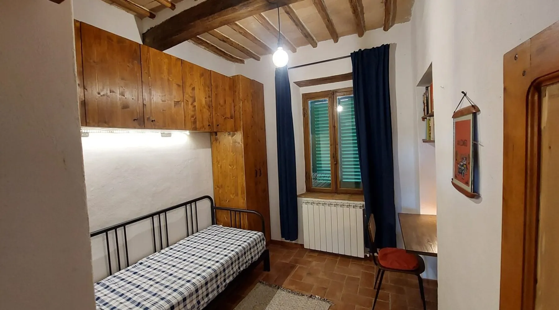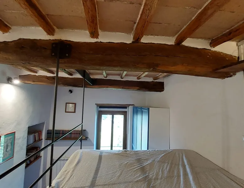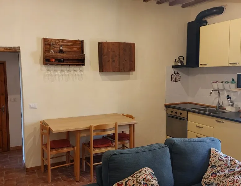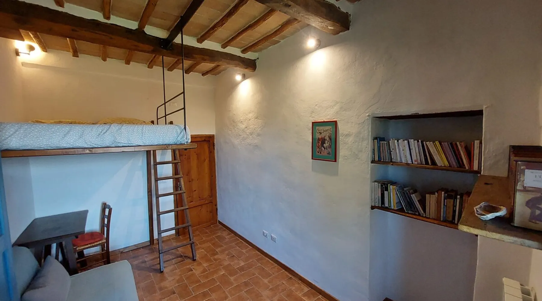 The apartment is located on the first floor of an early 20th century building, in the historic center of the municipality of Monticiano. The entrance opens onto a room with a small kitchen. In the apartment there are two small bedrooms. In the first bedroom, the queen-size bed (1.40x2.00 m) is hanging off the ground approximately 1.70 m high. The second bedroom has a single bed equipped with a pull-out extension that allows it to be transformed into a double bed. Other things to note The double bed is hung from the ceiling, which is accessed via a small staircase. For this reason, the double room is not suitable for elderly people or people with disabilities Registration details IT052018C2LWI26Q4J